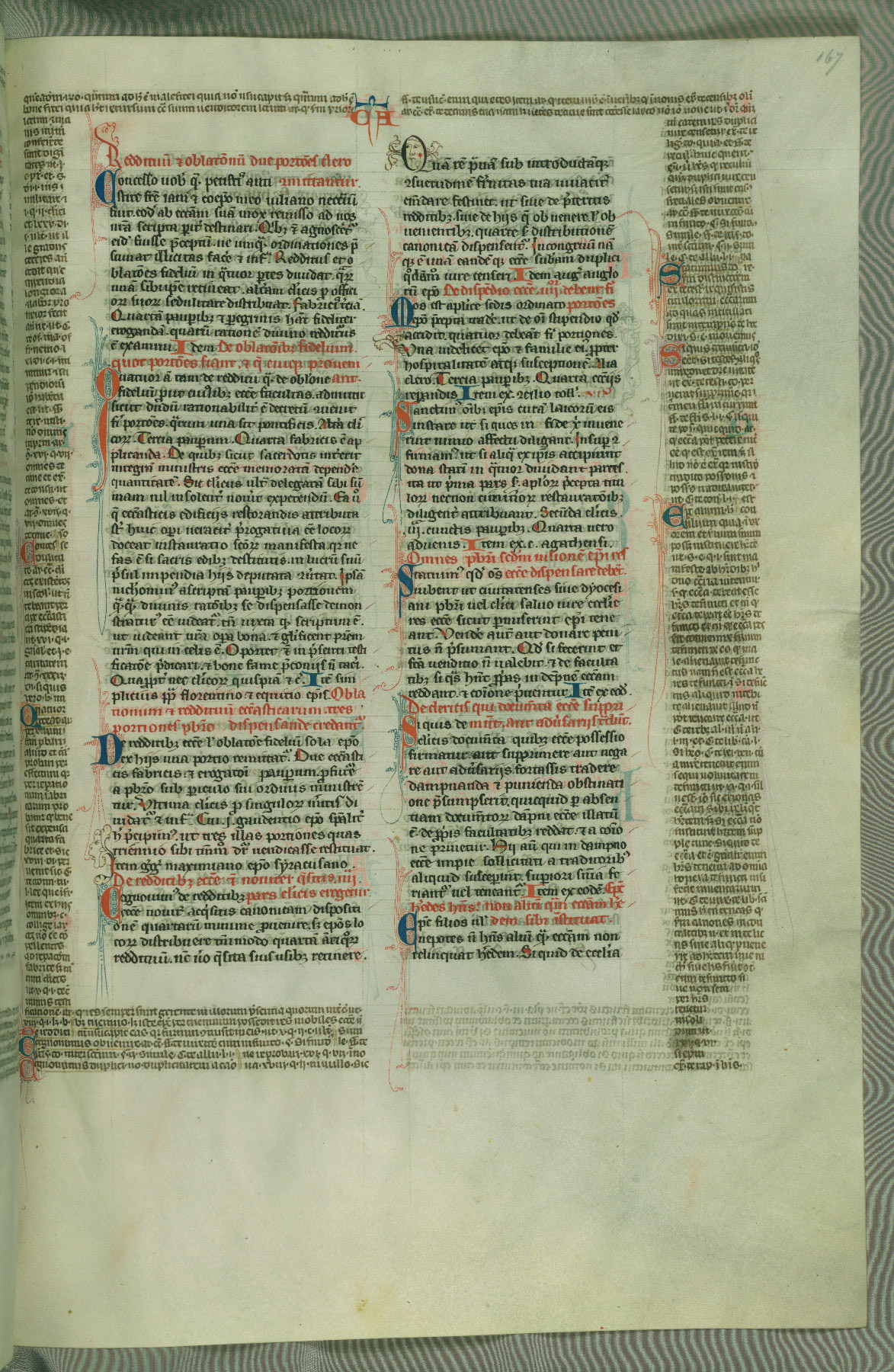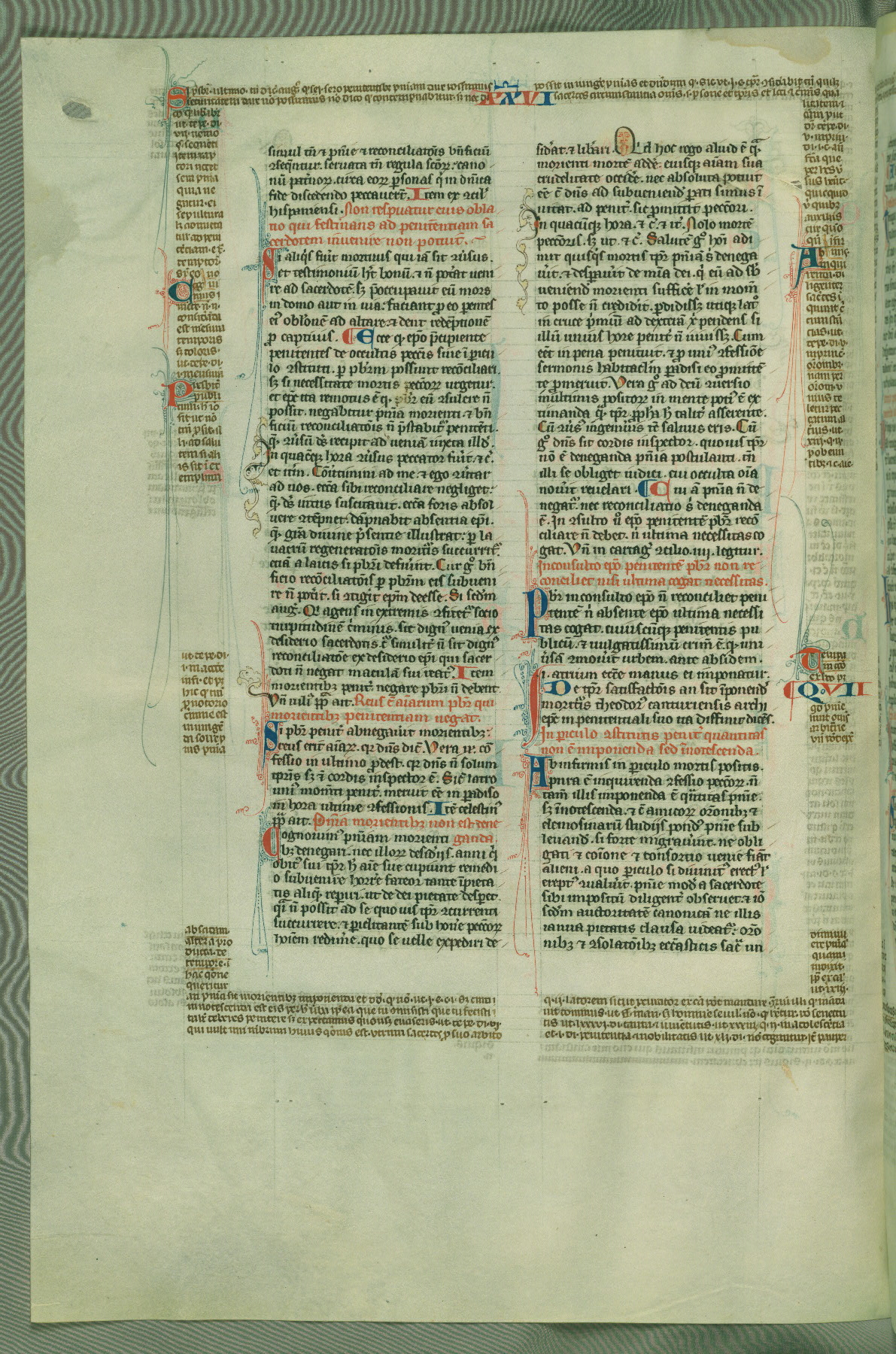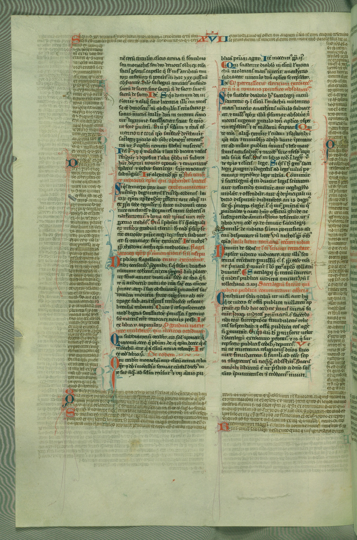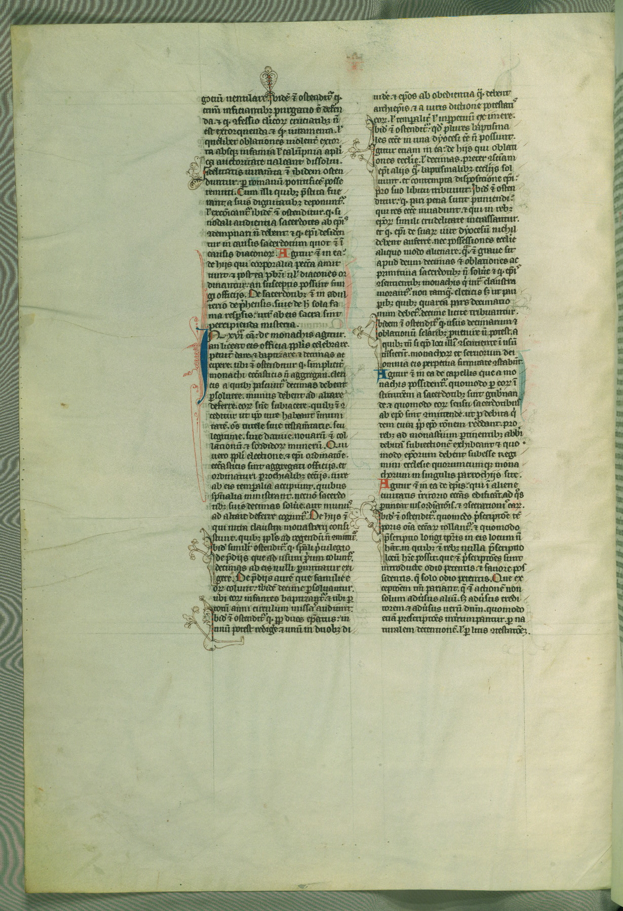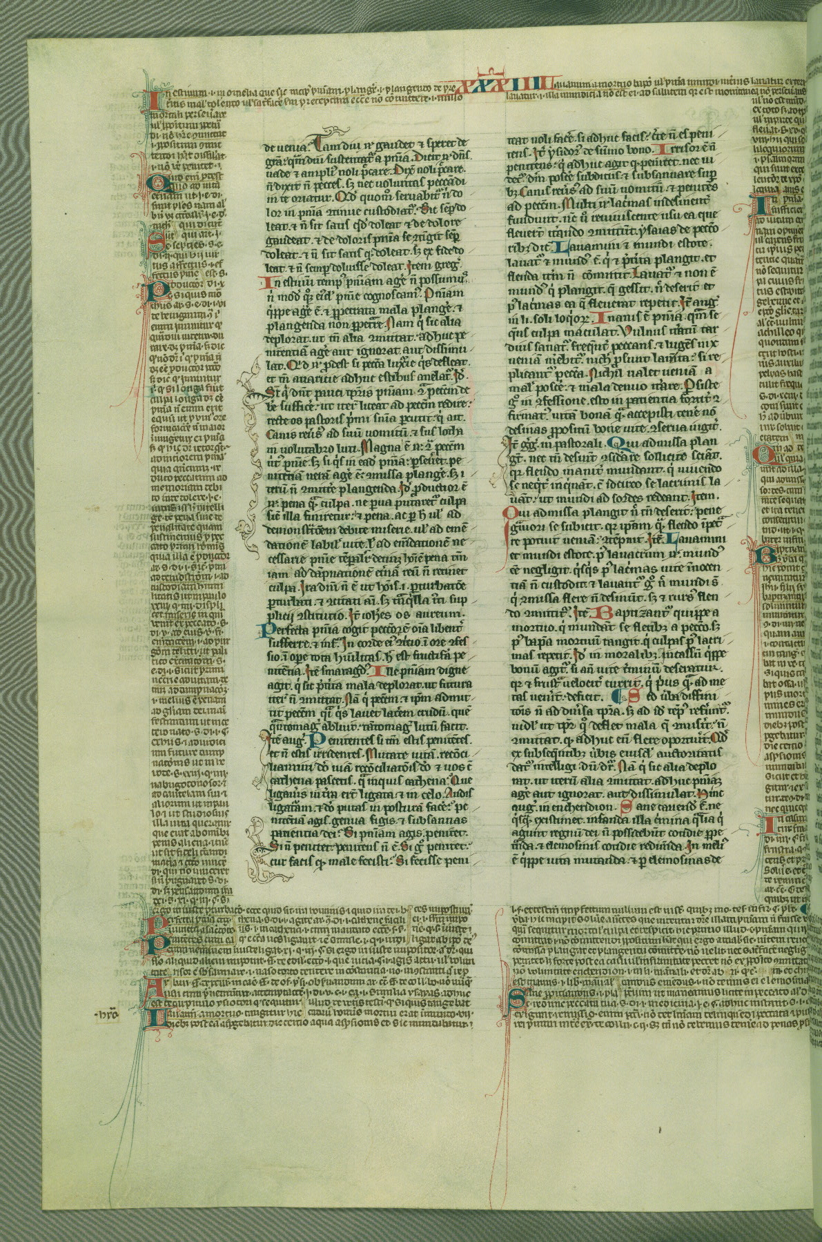This deluxe version of Gratian's Decretum was created ca. 1280-90, most likely in Hainaut. The lively decoration of the manuscript indicates a marked taste for narrative, and there are thirty-seven historiated initials. The gloss work was completed by Bartholomew of Brescia. At first, Paris would seem to be the most likely place of origin, given that it was the leading center for the study of canon law. However, this particular manuscript exhibits scribal features that suggest its place of origin as being the Cistercian abbey of Cambron in Hainaut. Furthermore, Abbot Baudouin de Bousso, whose tenure at the abbey was from 1283 to 1293, was schooled in theology at the University of Paris, and he would eventually endorse the production of many fine manuscripts while at Cambron. In fact, the catalyst for this endeavor seems to have been the Beaupré Antiphonary (W.759-761), which was was created at Cambron during the 1280s. Stylistic features of W.133 seem to have connections with the Beaupré Antiphonary. For example, Cistercian monks are shown in three extant illuminations throughout three of the antiphonary volumes; these monks are pictured in brown habits similar to the type worn by clerics in W.133. The reliance upon Cistercian precedents for textual and design features associates W.133 with the Cistercian abbey at Cambron. However, more remains to be confirmed by further inspection of the output of the scriptorium at Cambron.