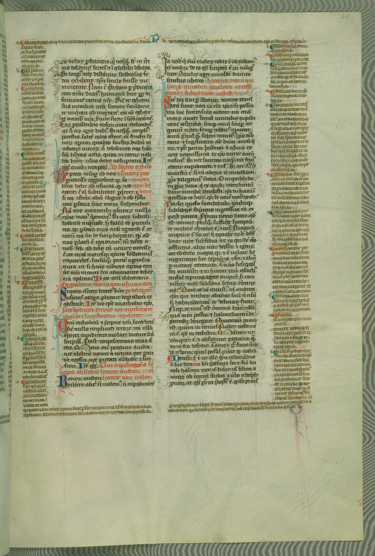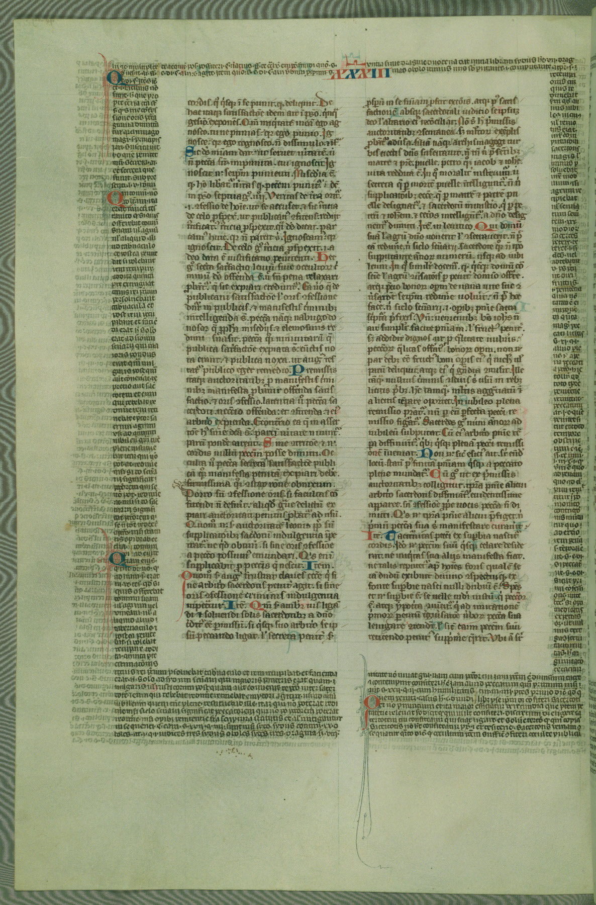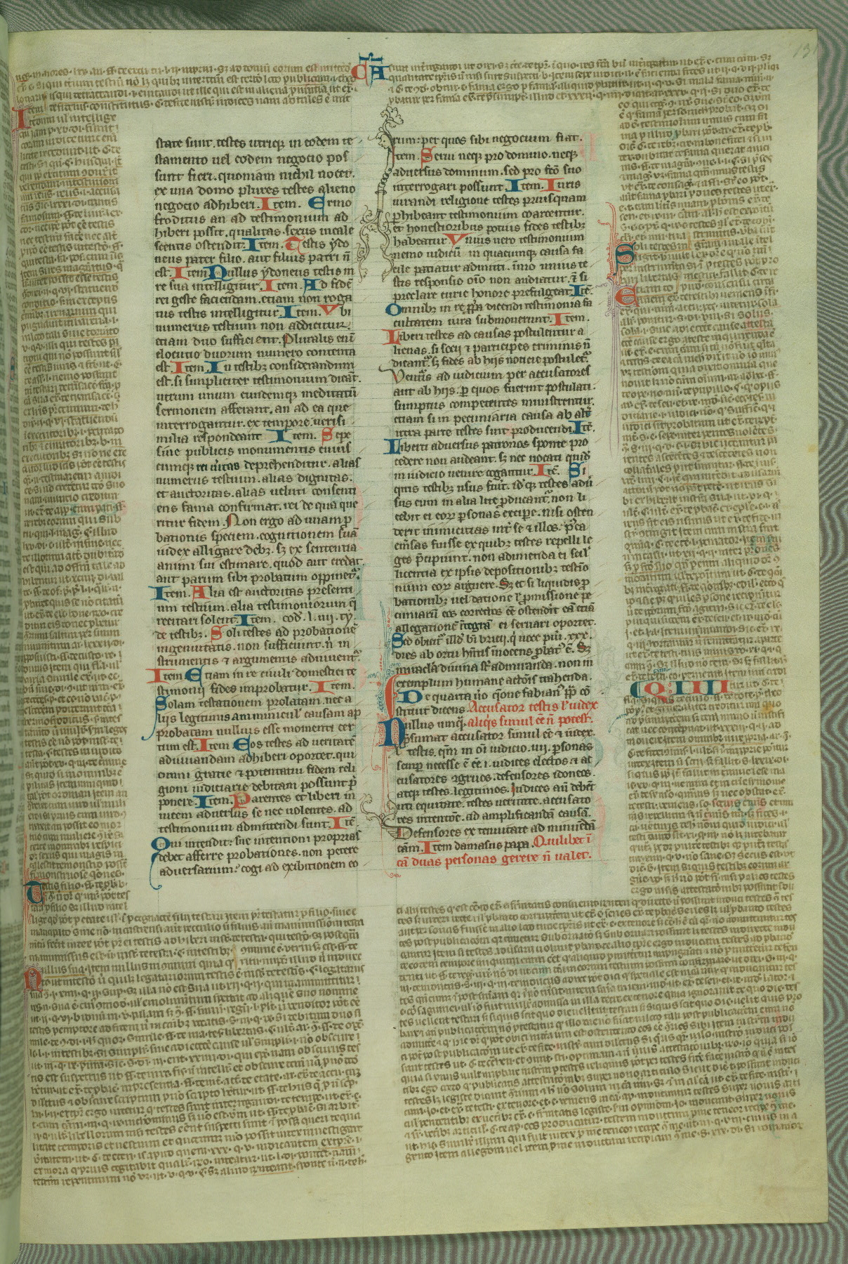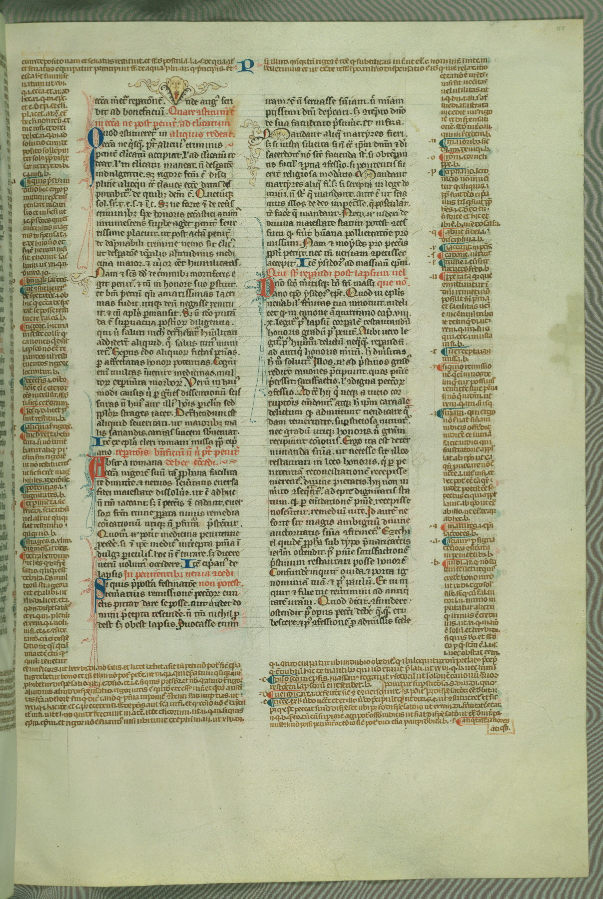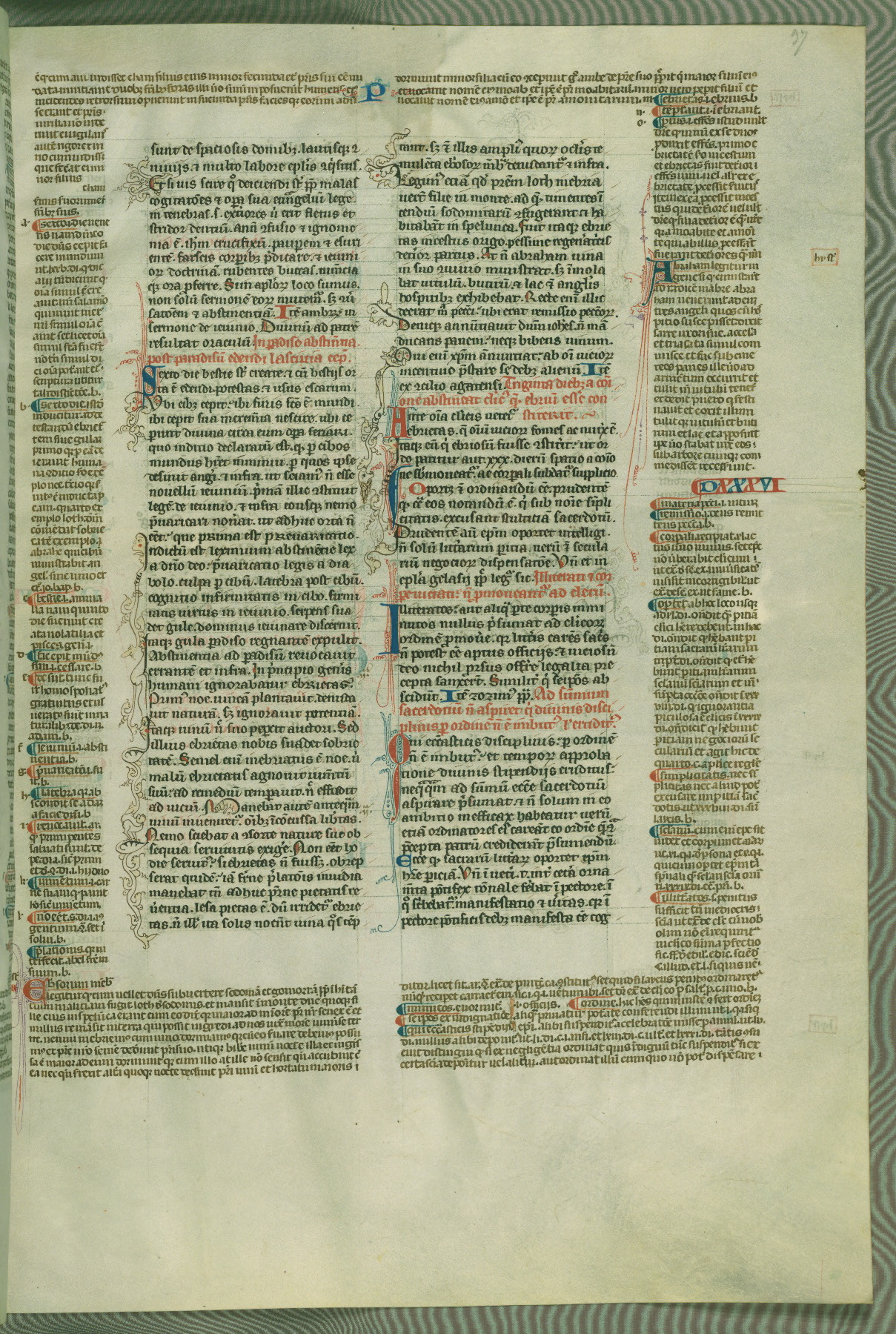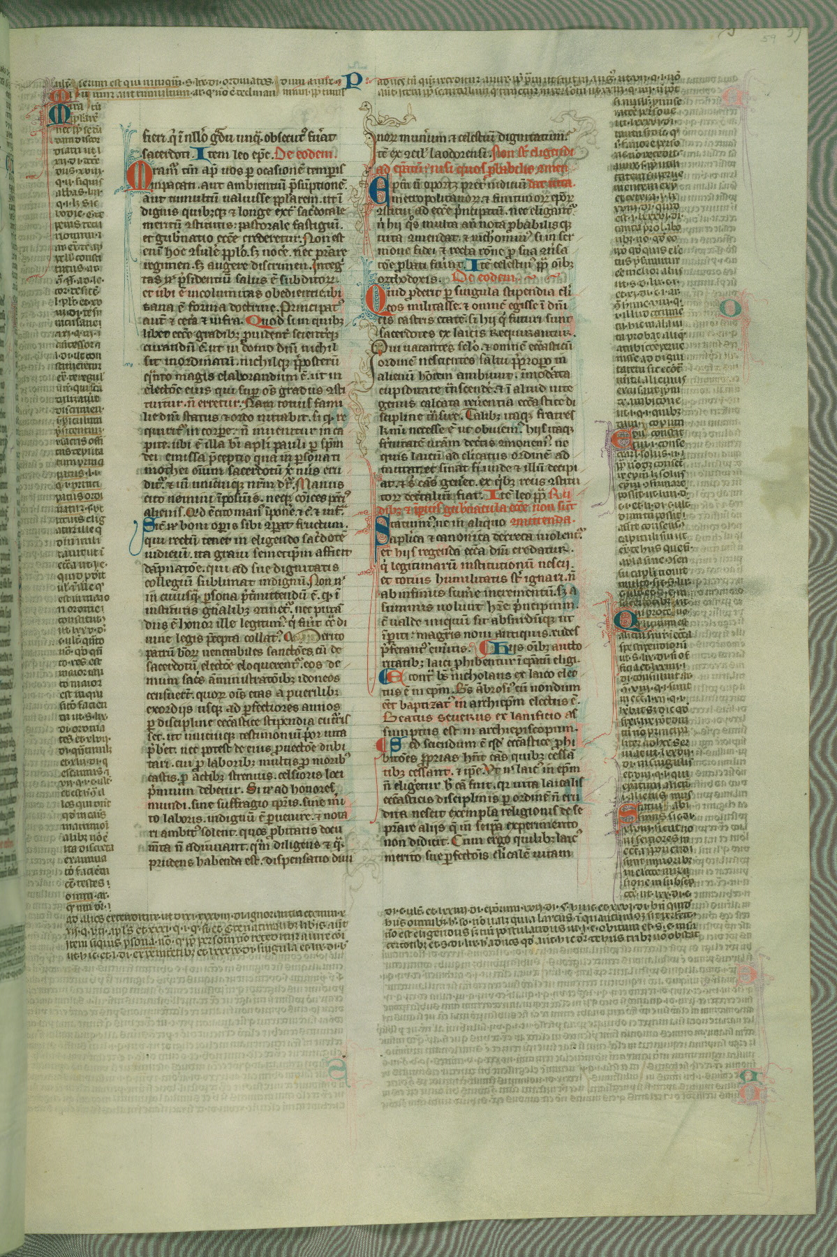 This deluxe version of Gratian's Decretum was created ca. 1280-90, most likely in Hainaut. The lively decoration of the manuscript indicates a marked taste for narrative, and there are thirty-seven historiated initials. The gloss work was completed by Bartholomew of Brescia. At first, Paris would seem to be the most likely place of origin, given that it was the leading center for the study of canon law. However, this particular manuscript exhibits scribal features that suggest its place of origin as being the Cistercian abbey of Cambron in Hainaut. Furthermore, Abbot Baudouin de Bousso, whose tenure at the abbey was from 1283 to 1293, was schooled in theology at the University of Paris, and he would eventually endorse the production of many fine manuscripts while at Cambron. In fact, the catalyst for this endeavor seems to have been the Beaupré Antiphonary (W.759-761), which was was created at Cambron during the 1280s. Stylistic features of W.133 seem to have connections with the Beaupré Antiphonary. For example, Cistercian monks are shown in three extant illuminations throughout three of the antiphonary volumes; these monks are pictured in brown habits similar to the type worn by clerics in W.133. The reliance upon Cistercian precedents for textual and design features associates W.133 with the Cistercian abbey at Cambron. However, more remains to be confirmed by further inspection of the output of the scriptorium at Cambron.