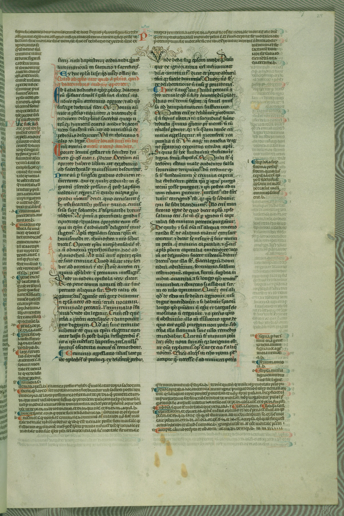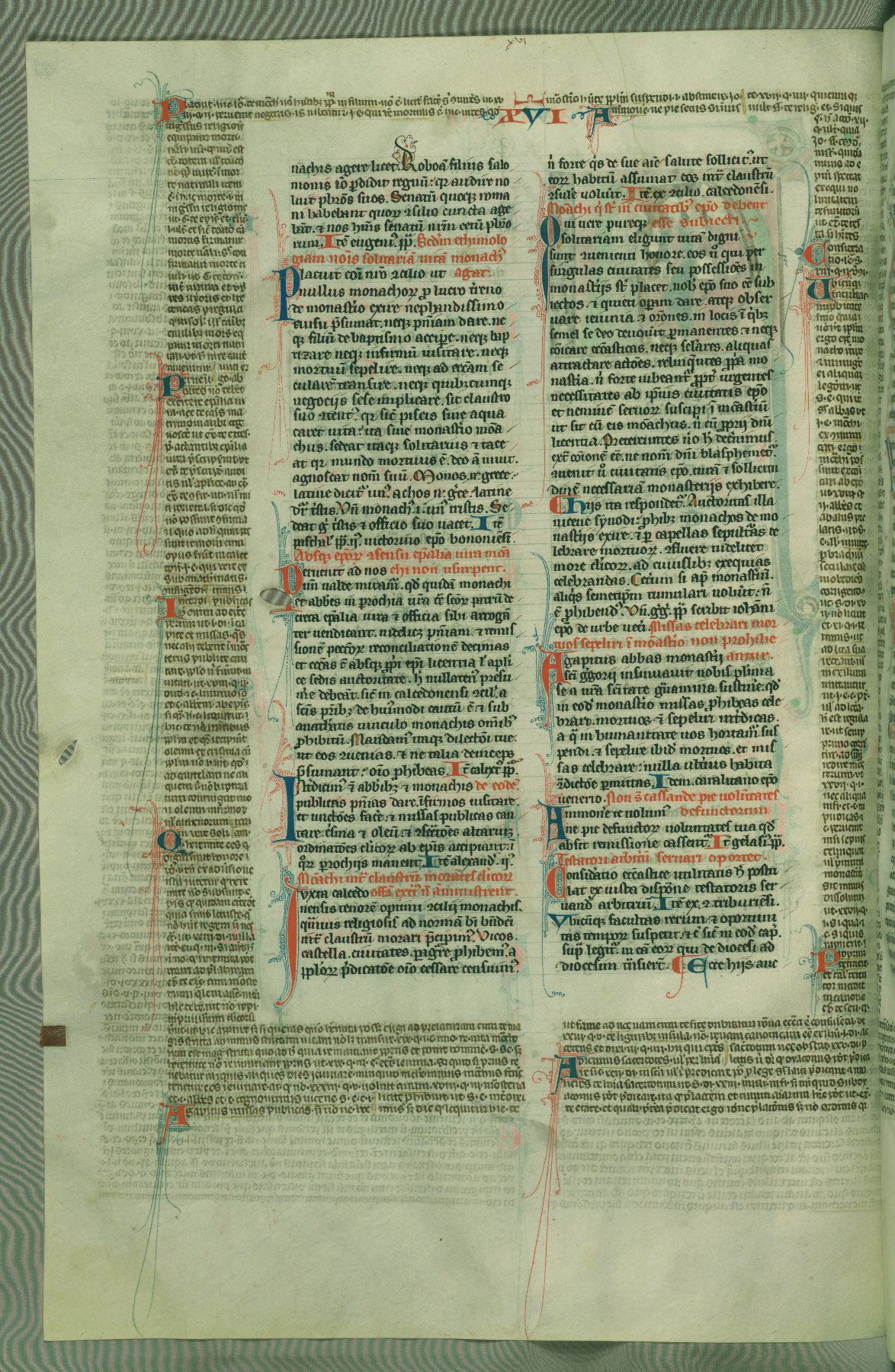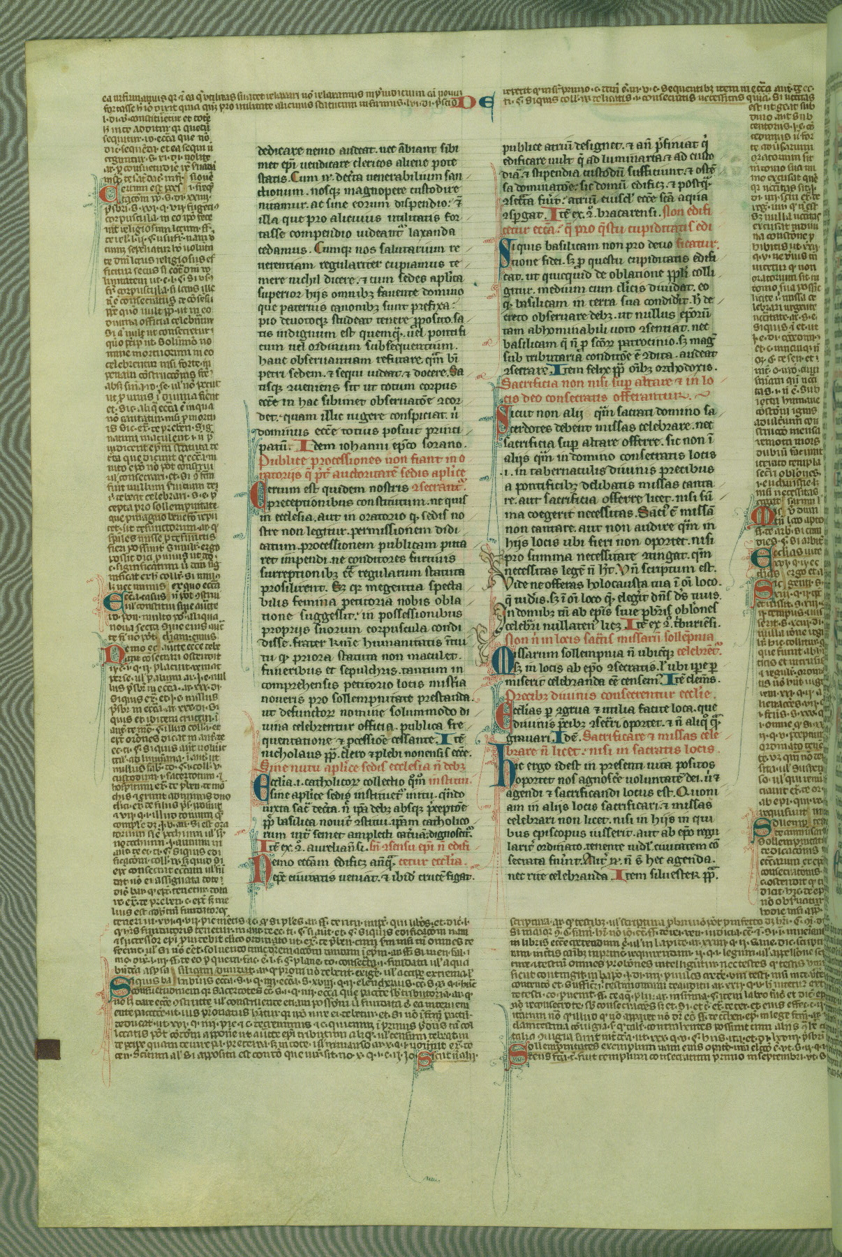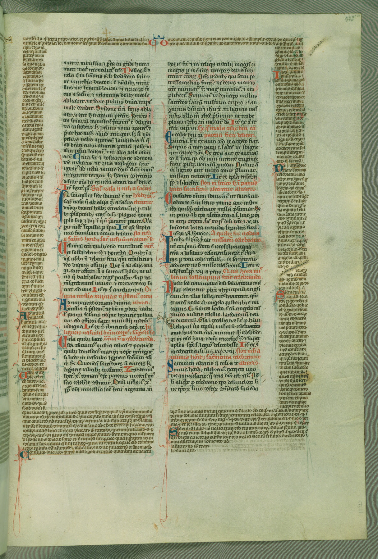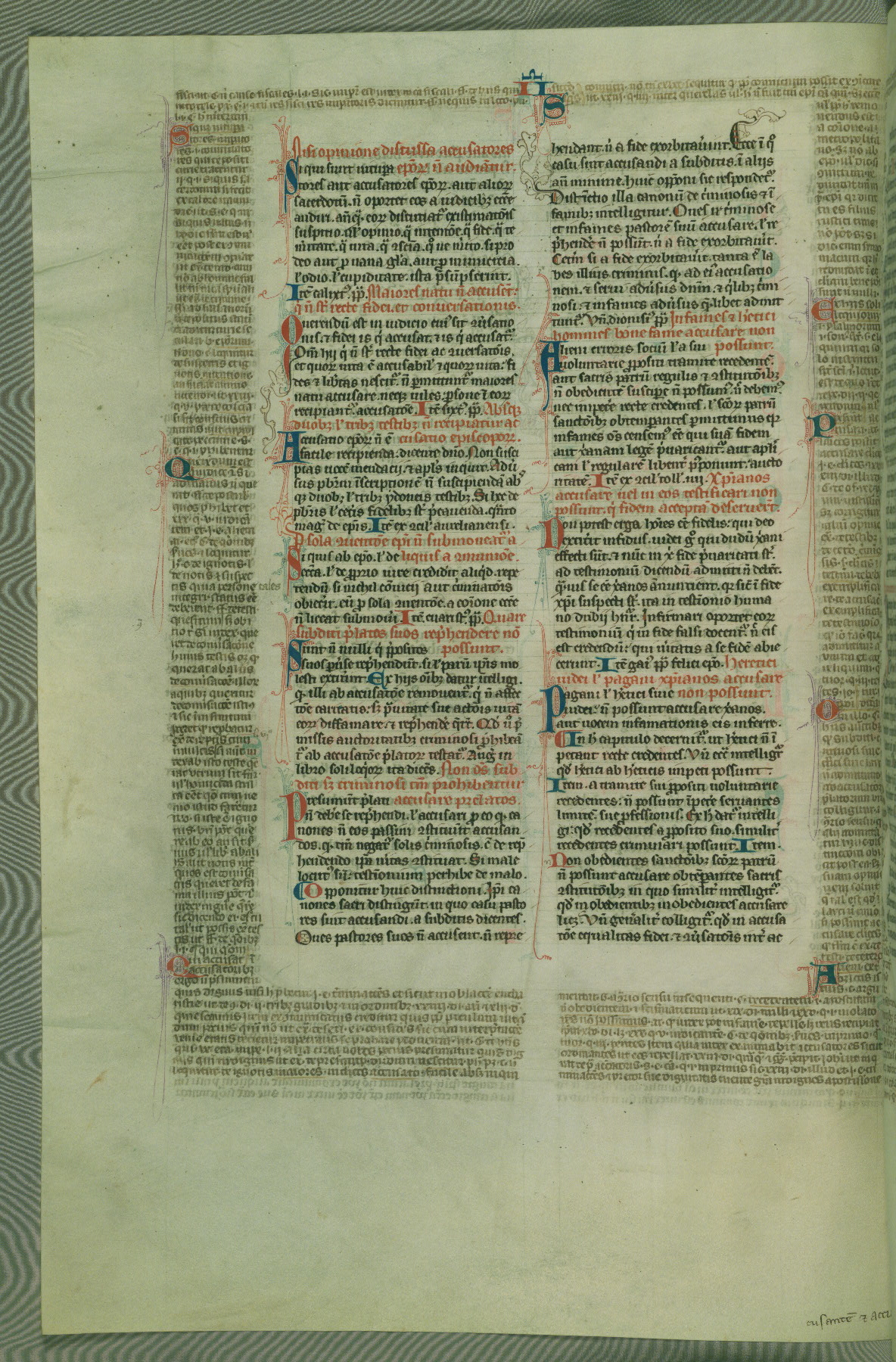 This deluxe version of Gratian's Decretum was created ca. 1280-90, most likely in Hainaut. The lively decoration of the manuscript indicates a marked taste for narrative, and there are thirty-seven historiated initials. The gloss work was completed by Bartholomew of Brescia. At first, Paris would seem to be the most likely place of origin, given that it was the leading center for the study of canon law. However, this particular manuscript exhibits scribal features that suggest its place of origin as being the Cistercian abbey of Cambron in Hainaut. Furthermore, Abbot Baudouin de Bousso, whose tenure at the abbey was from 1283 to 1293, was schooled in theology at the University of Paris, and he would eventually endorse the production of many fine manuscripts while at Cambron. In fact, the catalyst for this endeavor seems to have been the Beaupré Antiphonary (W.759-761), which was was created at Cambron during the 1280s. Stylistic features of W.133 seem to have connections with the Beaupré Antiphonary. For example, Cistercian monks are shown in three extant illuminations throughout three of the antiphonary volumes; these monks are pictured in brown habits similar to the type worn by clerics in W.133. The reliance upon Cistercian precedents for textual and design features associates W.133 with the Cistercian abbey at Cambron. However, more remains to be confirmed by further inspection of the output of the scriptorium at Cambron.