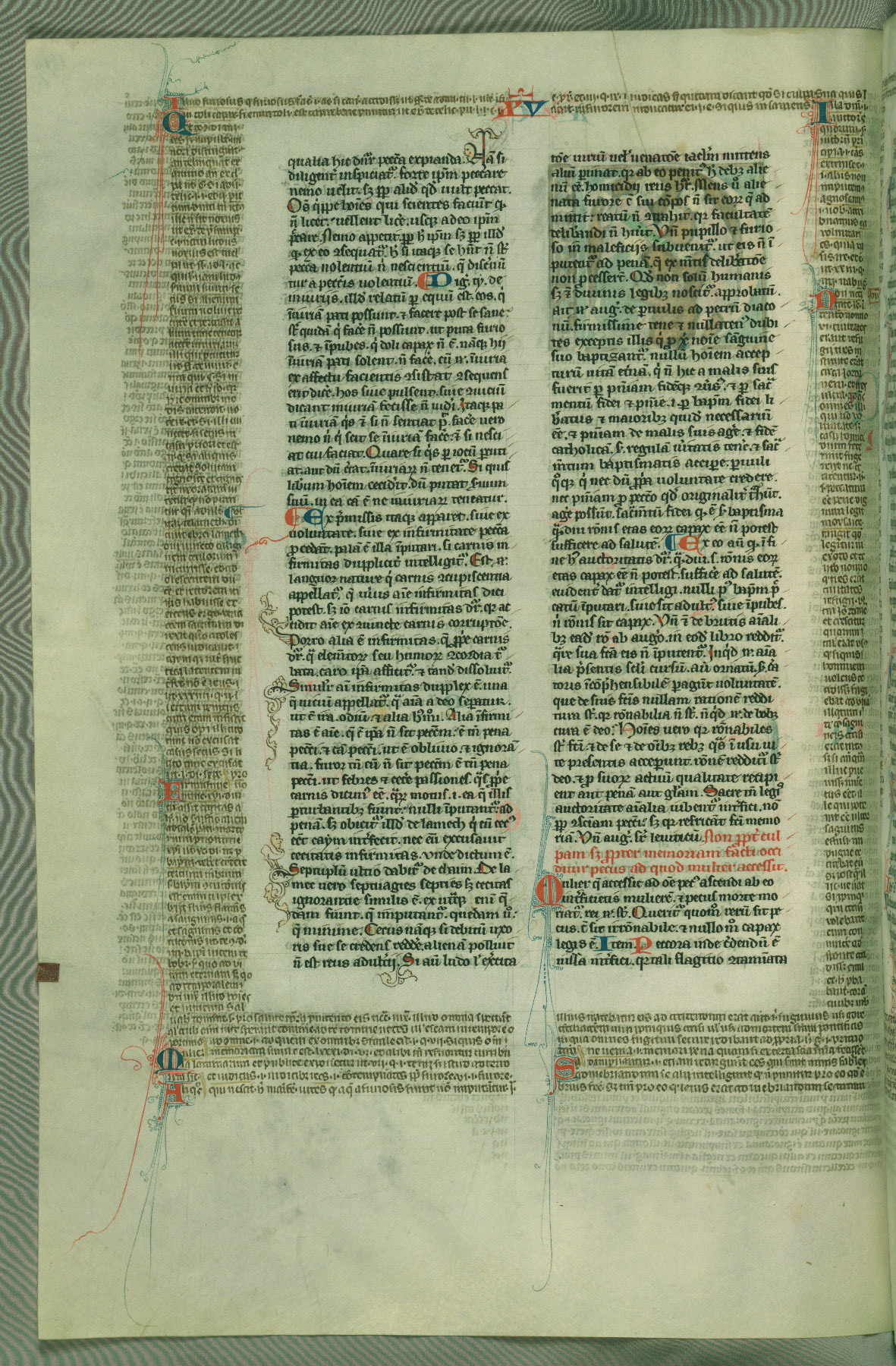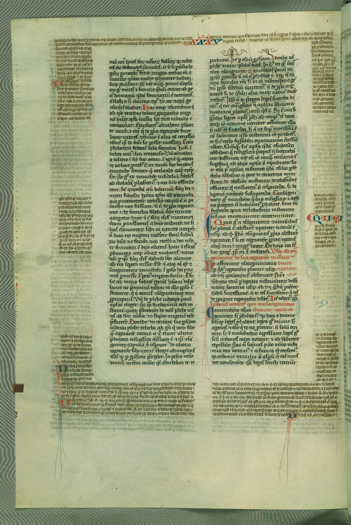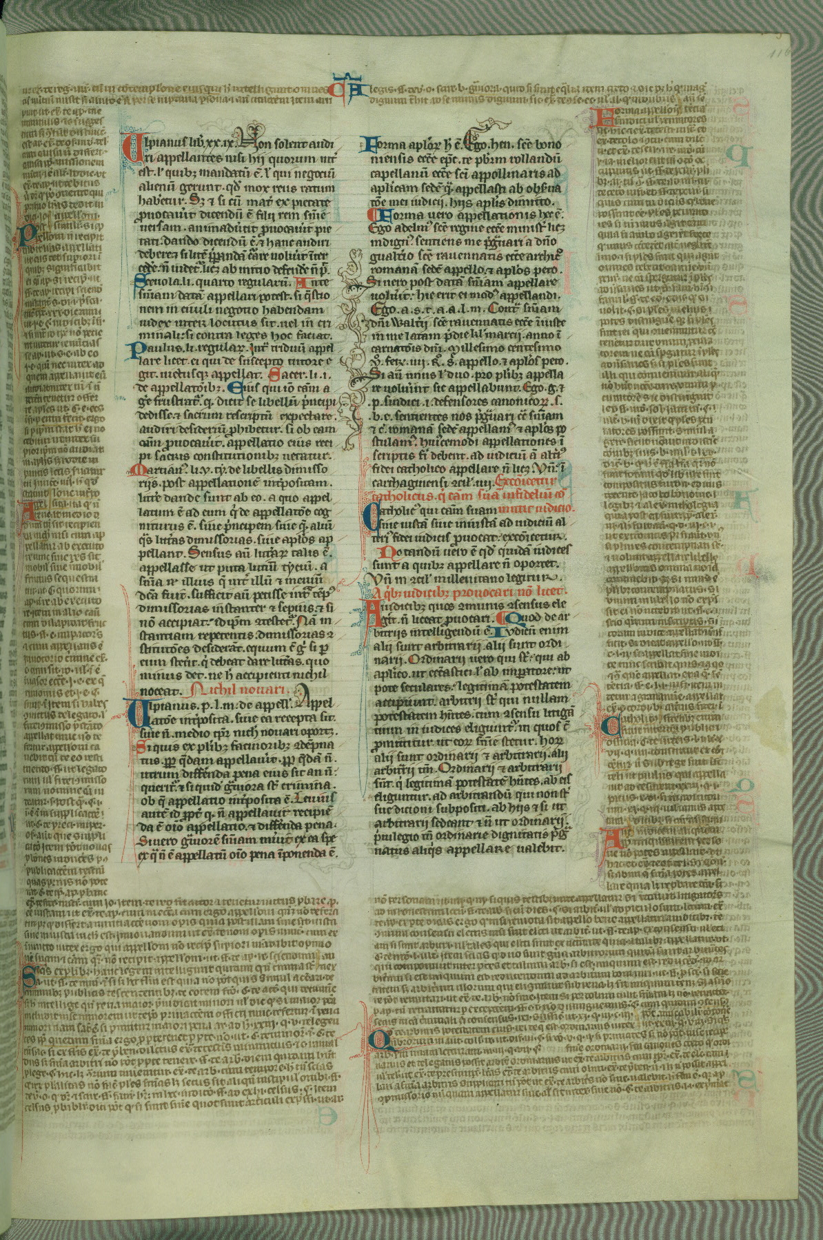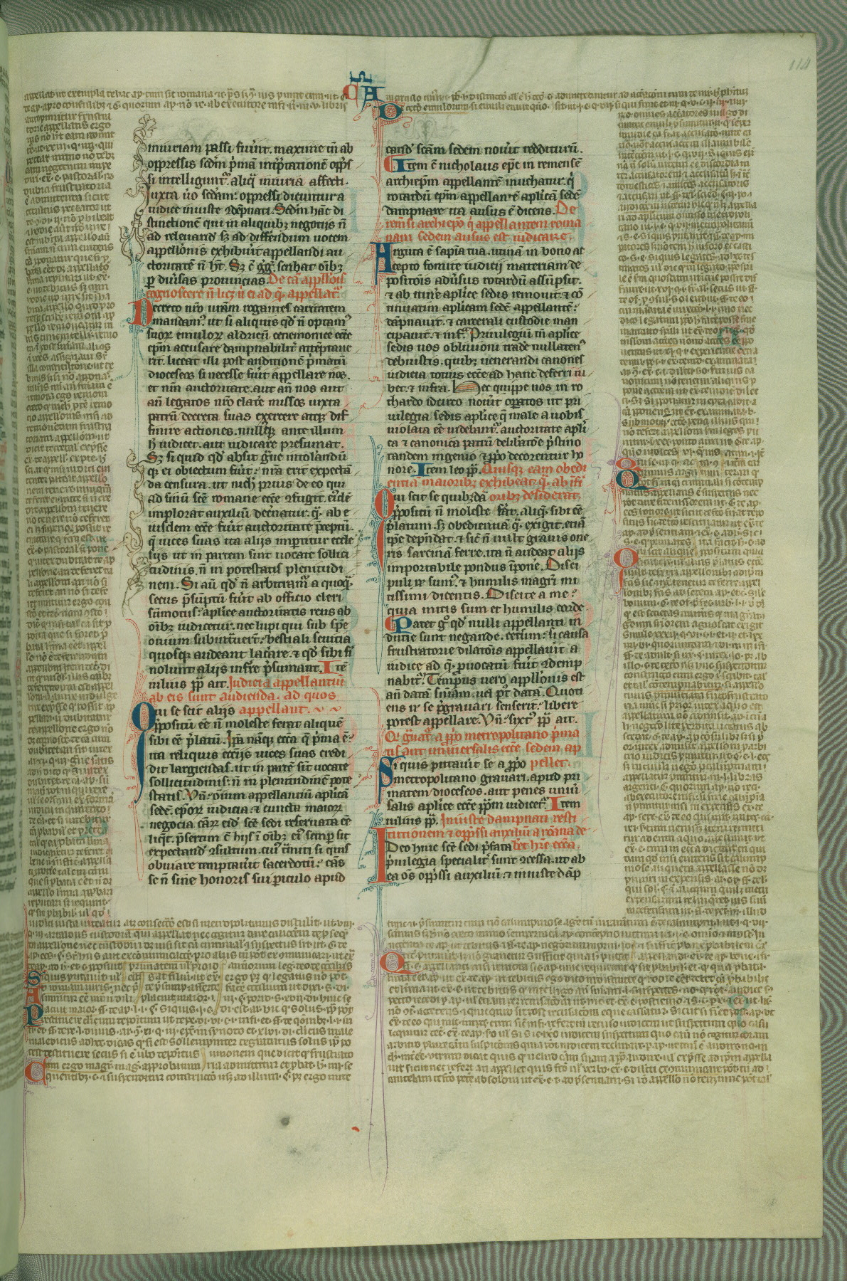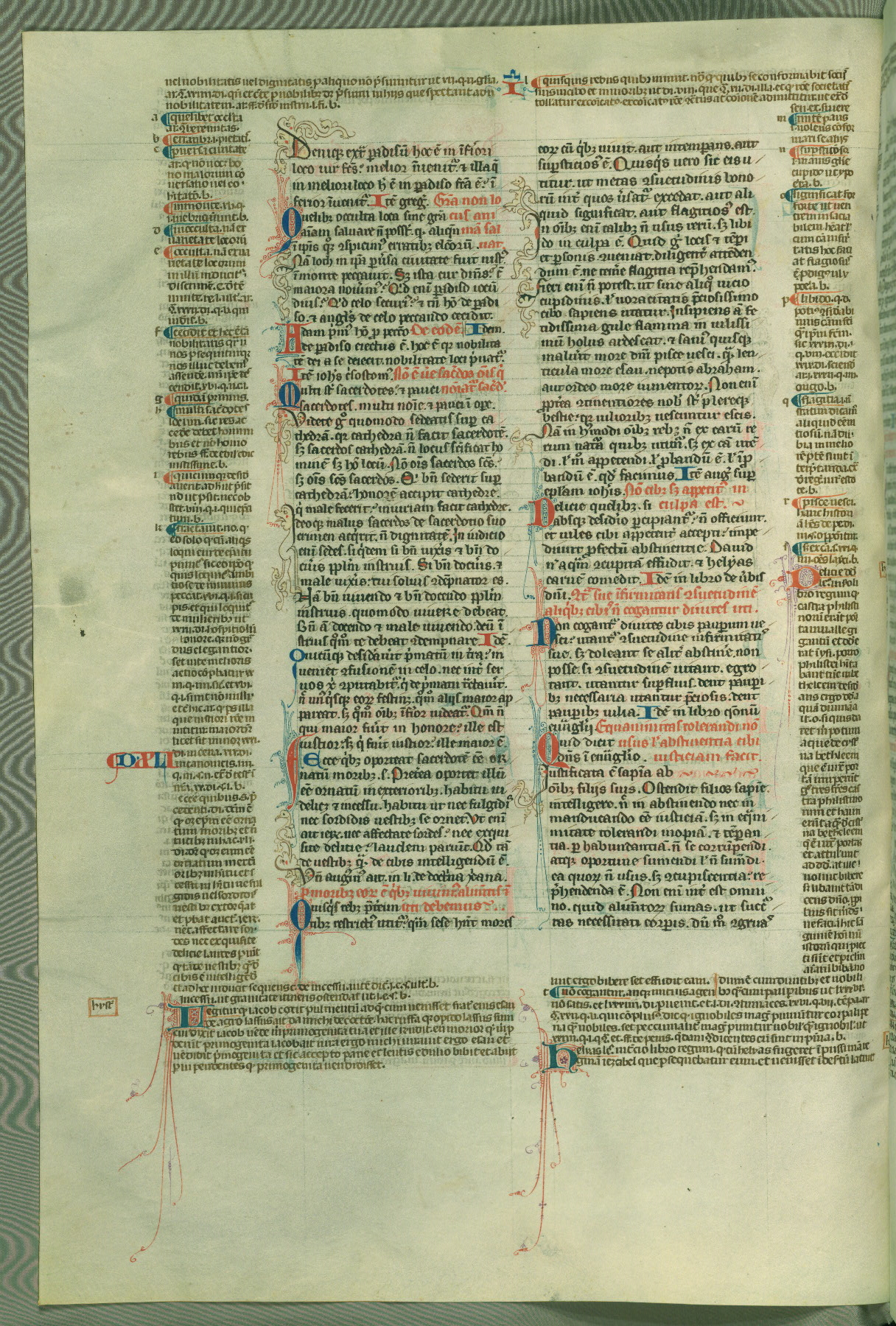 This deluxe version of Gratian's Decretum was created ca. 1280-90, most likely in Hainaut. The lively decoration of the manuscript indicates a marked taste for narrative, and there are thirty-seven historiated initials. The gloss work was completed by Bartholomew of Brescia. At first, Paris would seem to be the most likely place of origin, given that it was the leading center for the study of canon law. However, this particular manuscript exhibits scribal features that suggest its place of origin as being the Cistercian abbey of Cambron in Hainaut. Furthermore, Abbot Baudouin de Bousso, whose tenure at the abbey was from 1283 to 1293, was schooled in theology at the University of Paris, and he would eventually endorse the production of many fine manuscripts while at Cambron. In fact, the catalyst for this endeavor seems to have been the Beaupré Antiphonary (W.759-761), which was was created at Cambron during the 1280s. Stylistic features of W.133 seem to have connections with the Beaupré Antiphonary. For example, Cistercian monks are shown in three extant illuminations throughout three of the antiphonary volumes; these monks are pictured in brown habits similar to the type worn by clerics in W.133. The reliance upon Cistercian precedents for textual and design features associates W.133 with the Cistercian abbey at Cambron. However, more remains to be confirmed by further inspection of the output of the scriptorium at Cambron.