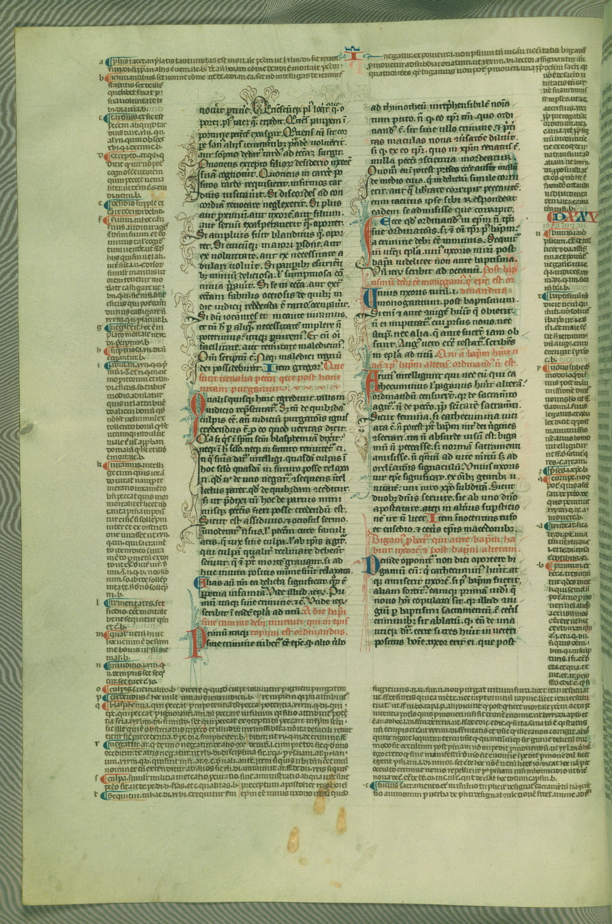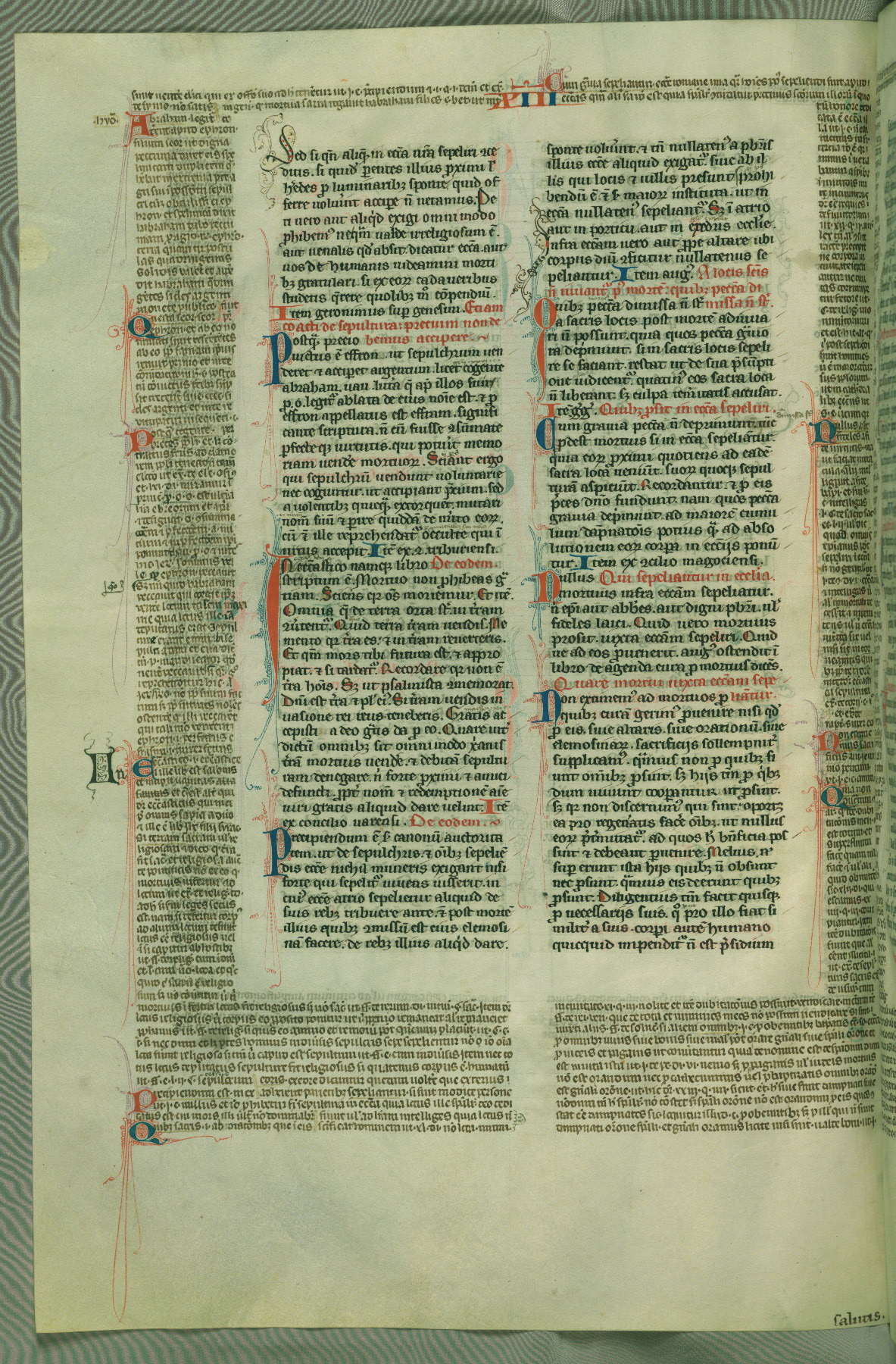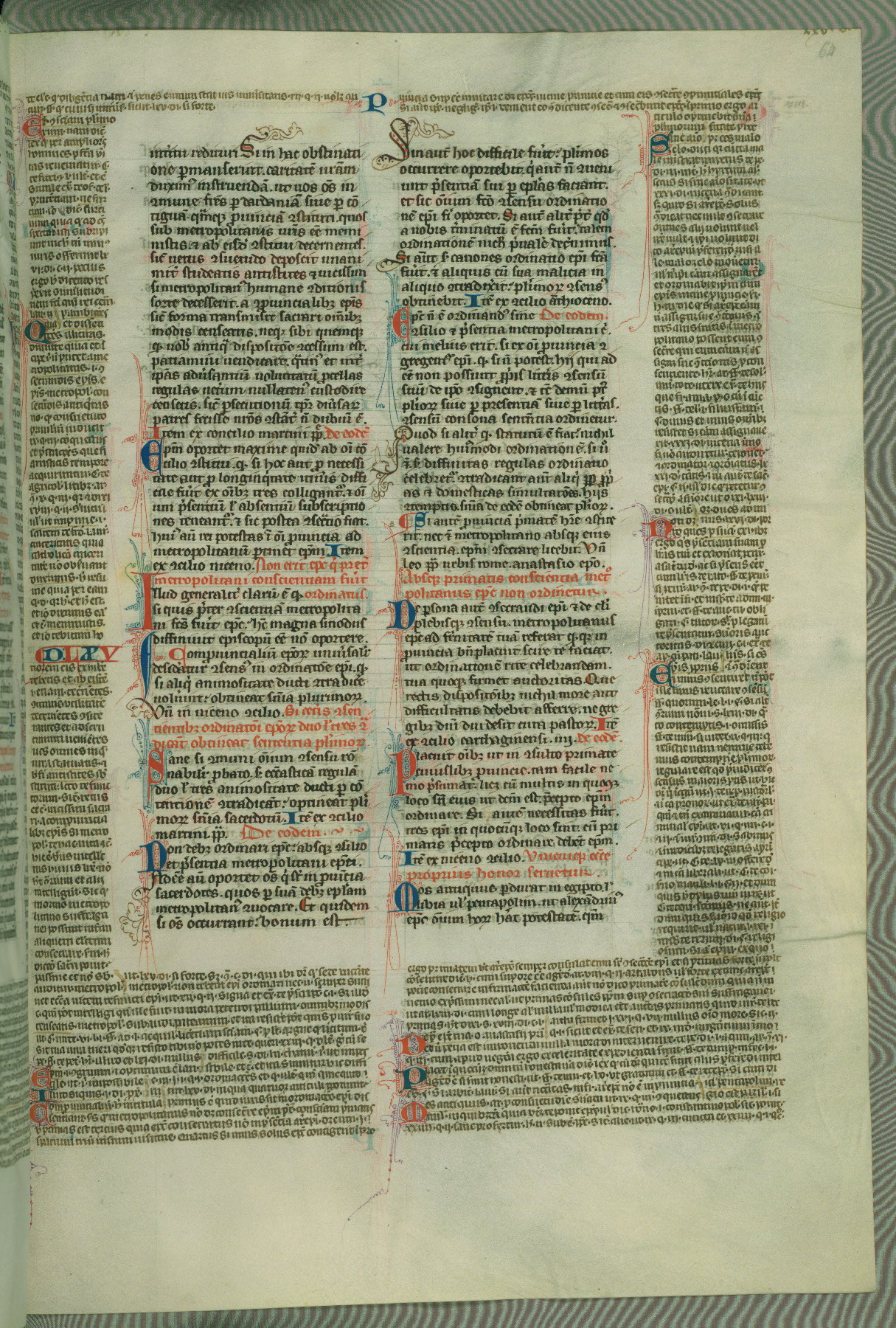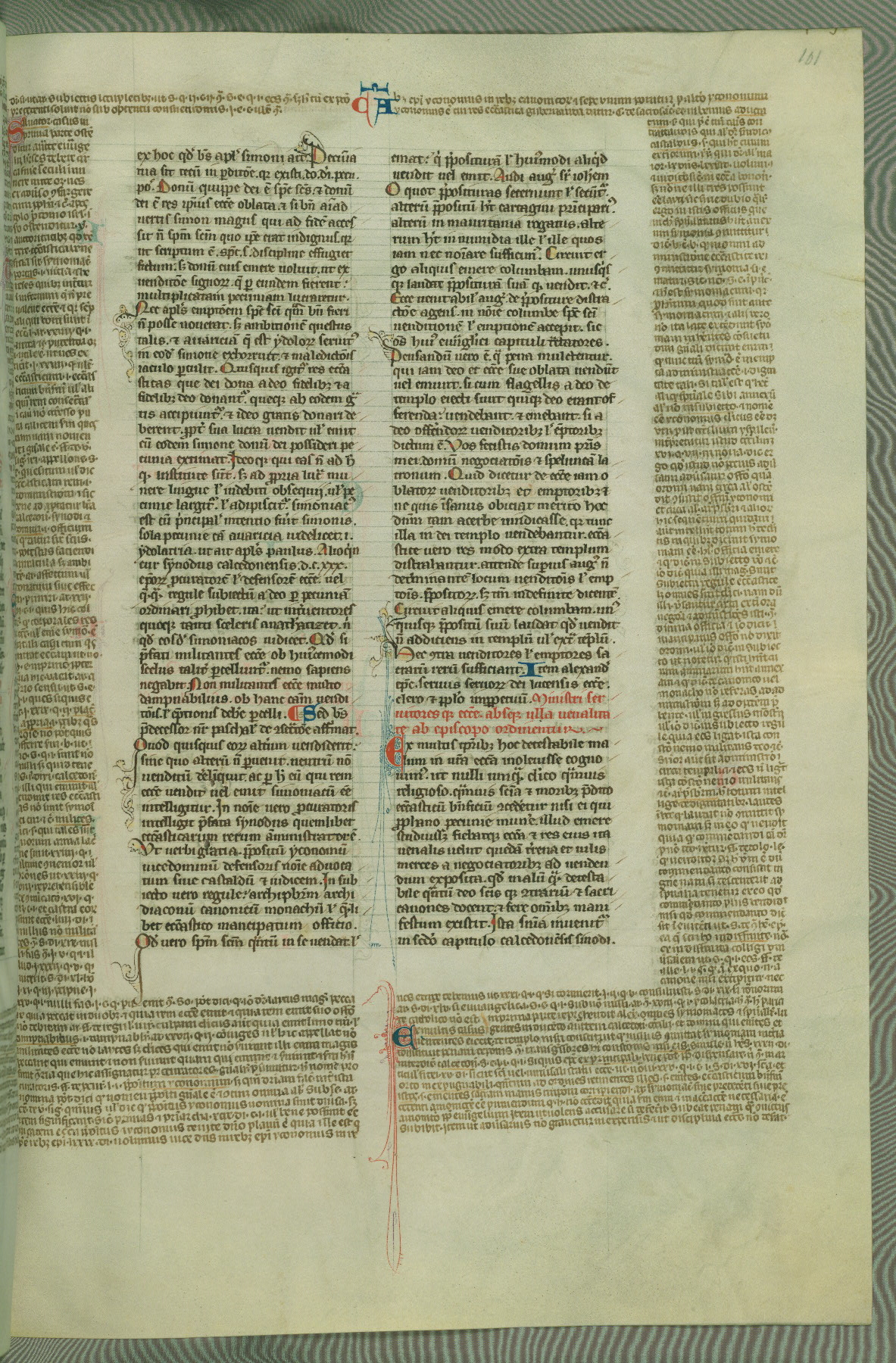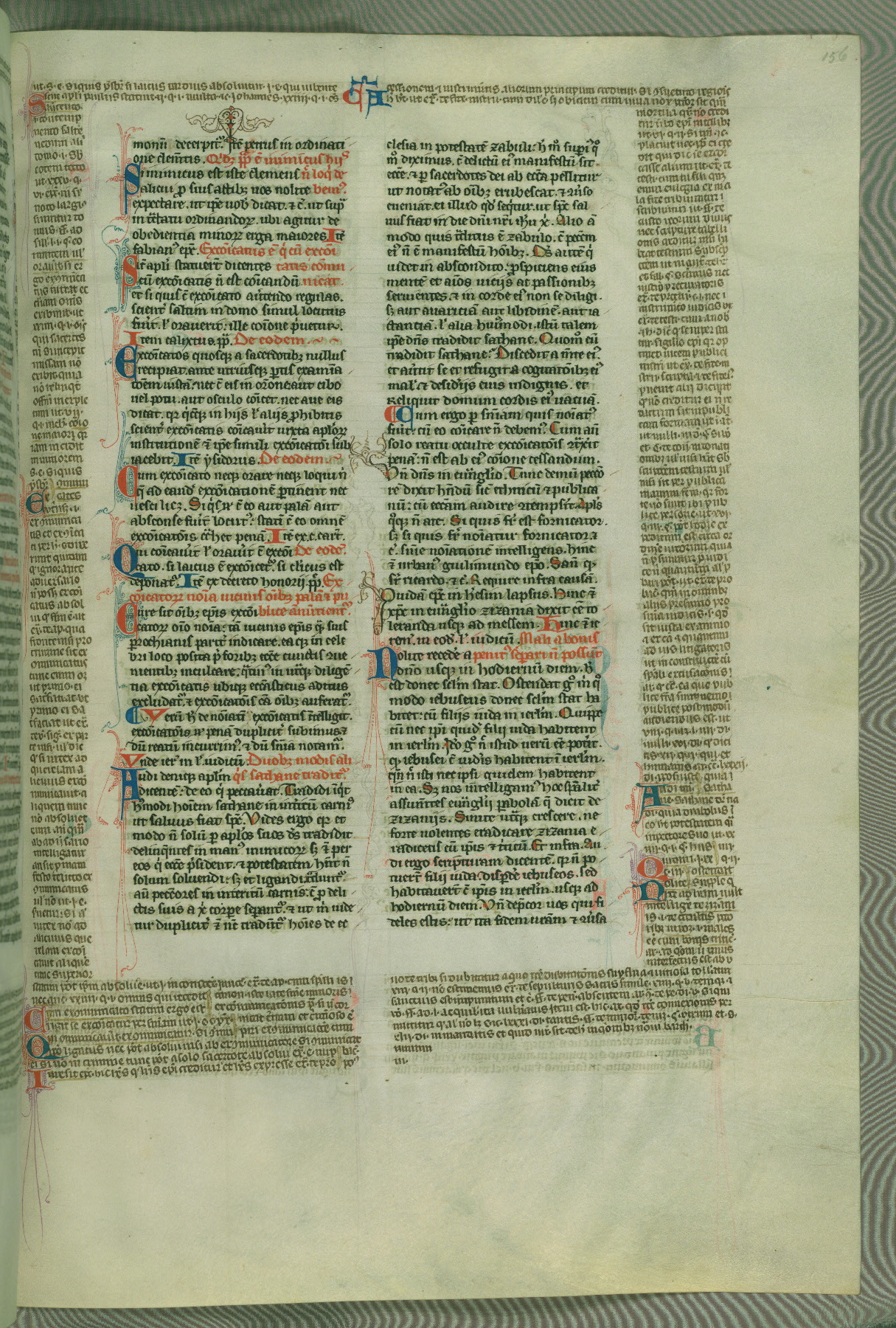 This deluxe version of Gratian's Decretum was created ca. 1280-90, most likely in Hainaut. The lively decoration of the manuscript indicates a marked taste for narrative, and there are thirty-seven historiated initials. The gloss work was completed by Bartholomew of Brescia. At first, Paris would seem to be the most likely place of origin, given that it was the leading center for the study of canon law. However, this particular manuscript exhibits scribal features that suggest its place of origin as being the Cistercian abbey of Cambron in Hainaut. Furthermore, Abbot Baudouin de Bousso, whose tenure at the abbey was from 1283 to 1293, was schooled in theology at the University of Paris, and he would eventually endorse the production of many fine manuscripts while at Cambron. In fact, the catalyst for this endeavor seems to have been the Beaupré Antiphonary (W.759-761), which was was created at Cambron during the 1280s. Stylistic features of W.133 seem to have connections with the Beaupré Antiphonary. For example, Cistercian monks are shown in three extant illuminations throughout three of the antiphonary volumes; these monks are pictured in brown habits similar to the type worn by clerics in W.133. The reliance upon Cistercian precedents for textual and design features associates W.133 with the Cistercian abbey at Cambron. However, more remains to be confirmed by further inspection of the output of the scriptorium at Cambron.