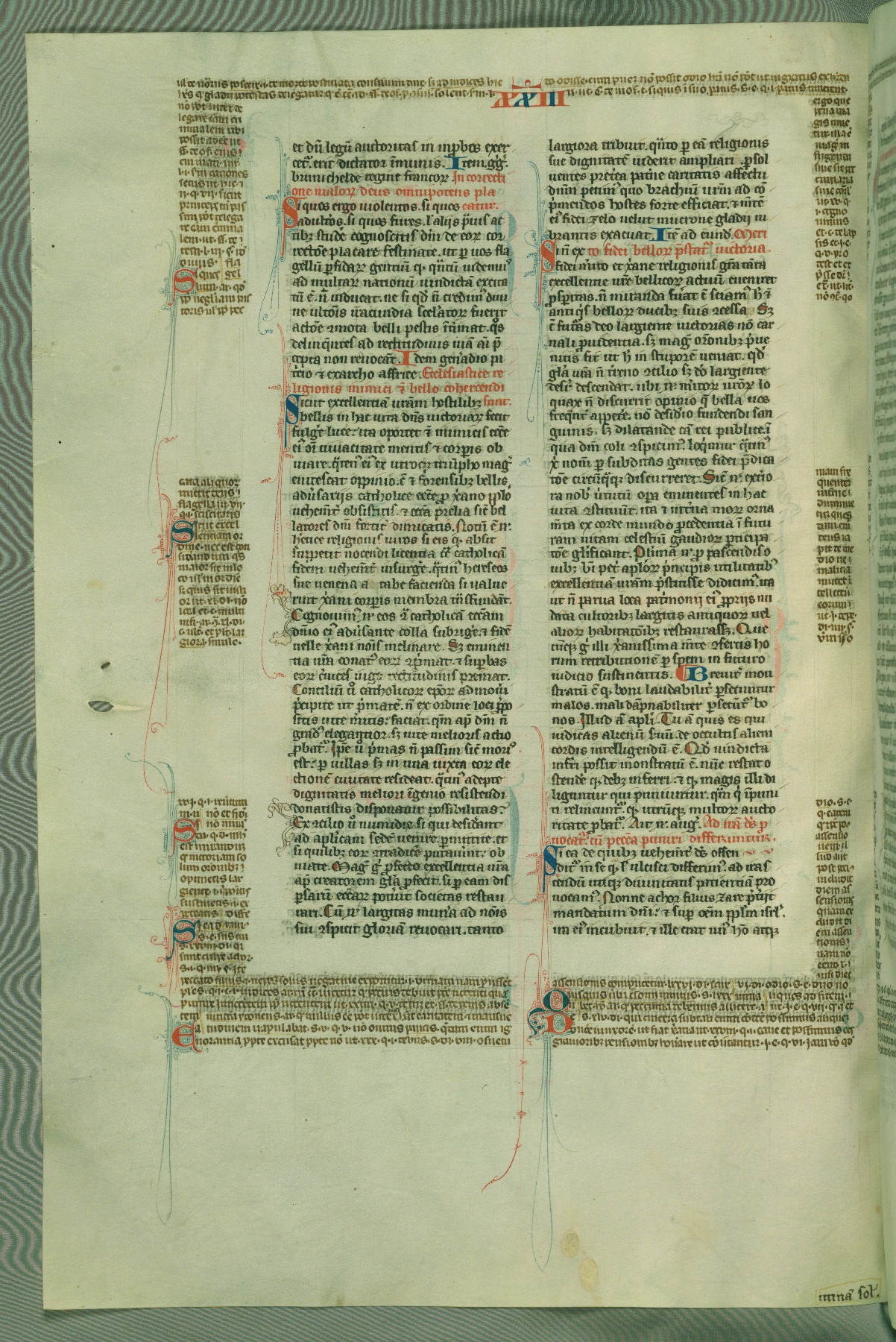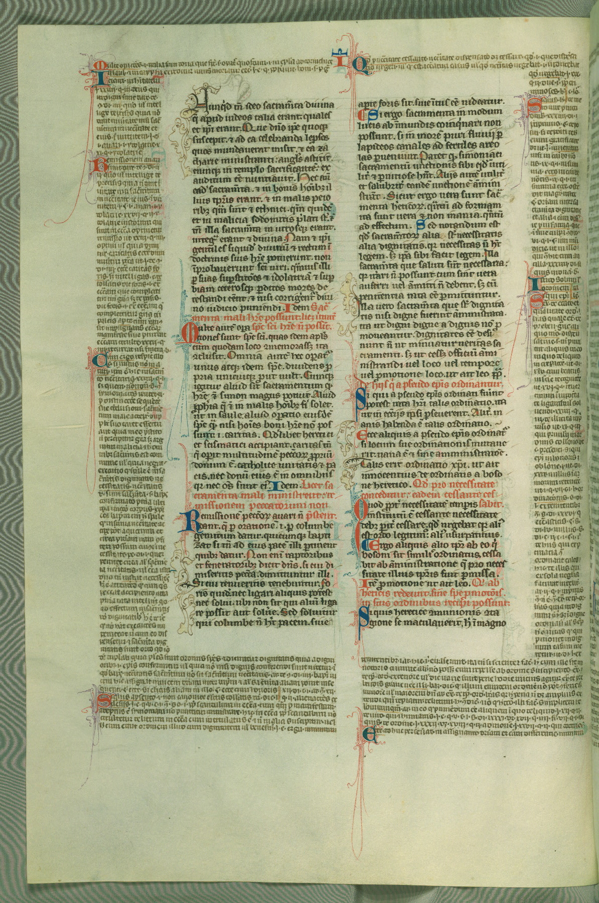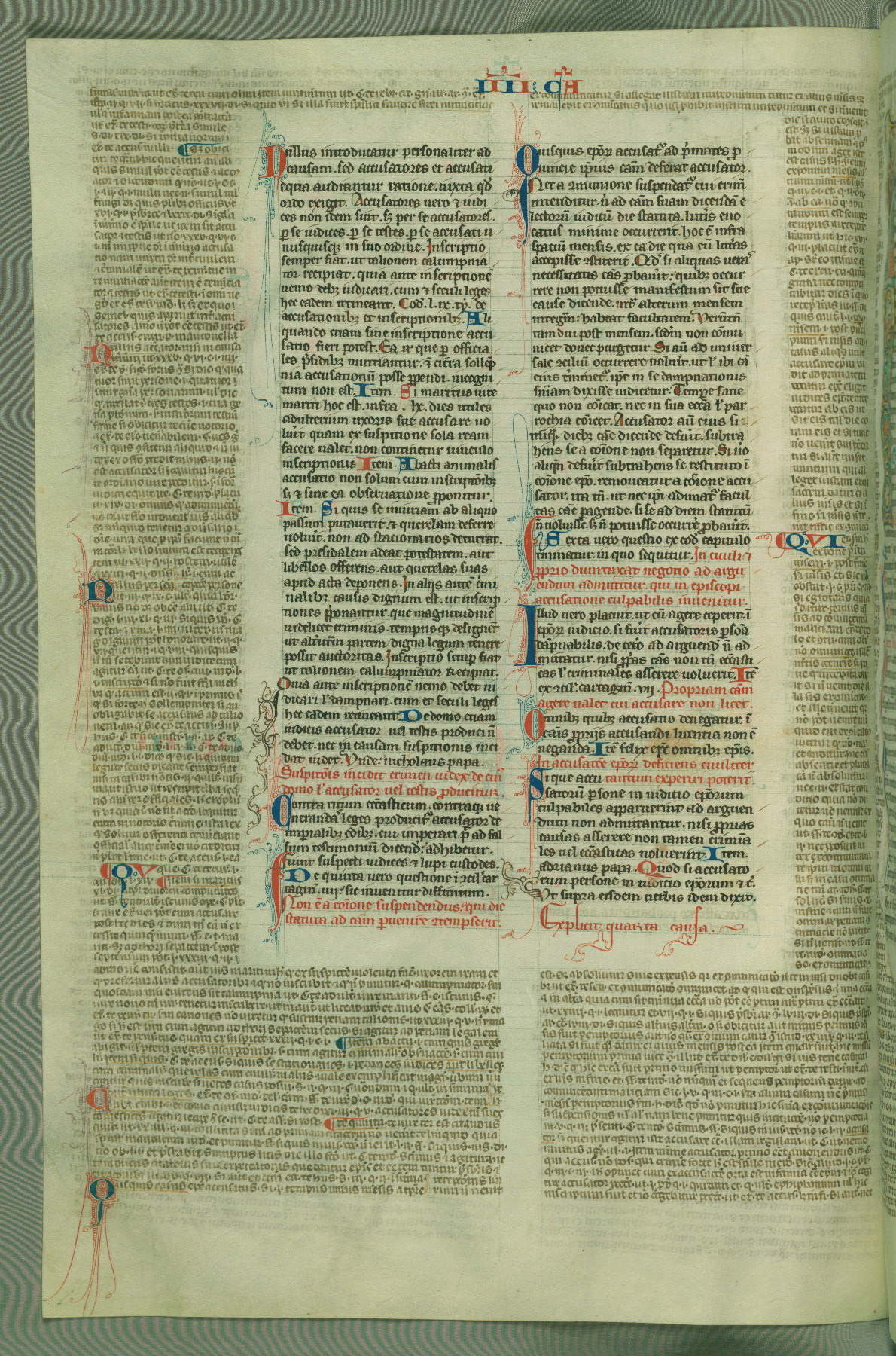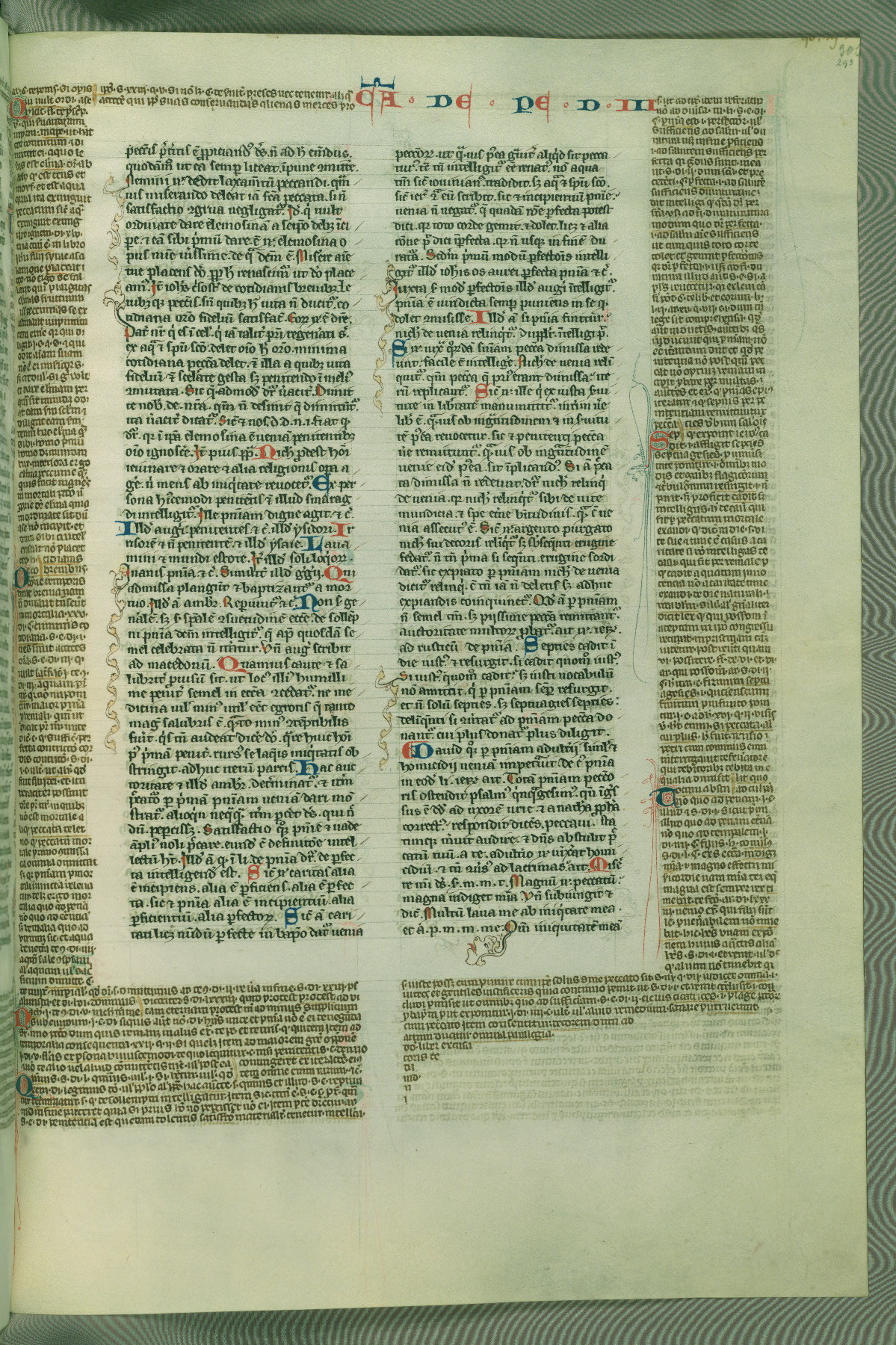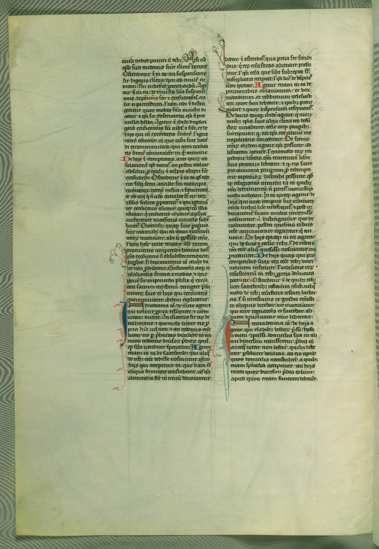 This deluxe version of Gratian's Decretum was created ca. 1280-90, most likely in Hainaut. The lively decoration of the manuscript indicates a marked taste for narrative, and there are thirty-seven historiated initials. The gloss work was completed by Bartholomew of Brescia. At first, Paris would seem to be the most likely place of origin, given that it was the leading center for the study of canon law. However, this particular manuscript exhibits scribal features that suggest its place of origin as being the Cistercian abbey of Cambron in Hainaut. Furthermore, Abbot Baudouin de Bousso, whose tenure at the abbey was from 1283 to 1293, was schooled in theology at the University of Paris, and he would eventually endorse the production of many fine manuscripts while at Cambron. In fact, the catalyst for this endeavor seems to have been the Beaupré Antiphonary (W.759-761), which was was created at Cambron during the 1280s. Stylistic features of W.133 seem to have connections with the Beaupré Antiphonary. For example, Cistercian monks are shown in three extant illuminations throughout three of the antiphonary volumes; these monks are pictured in brown habits similar to the type worn by clerics in W.133. The reliance upon Cistercian precedents for textual and design features associates W.133 with the Cistercian abbey at Cambron. However, more remains to be confirmed by further inspection of the output of the scriptorium at Cambron.