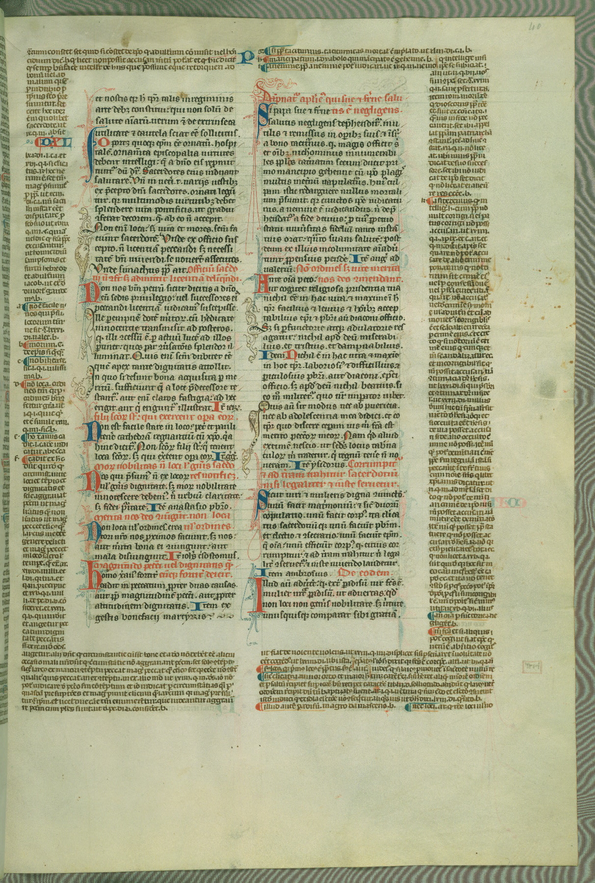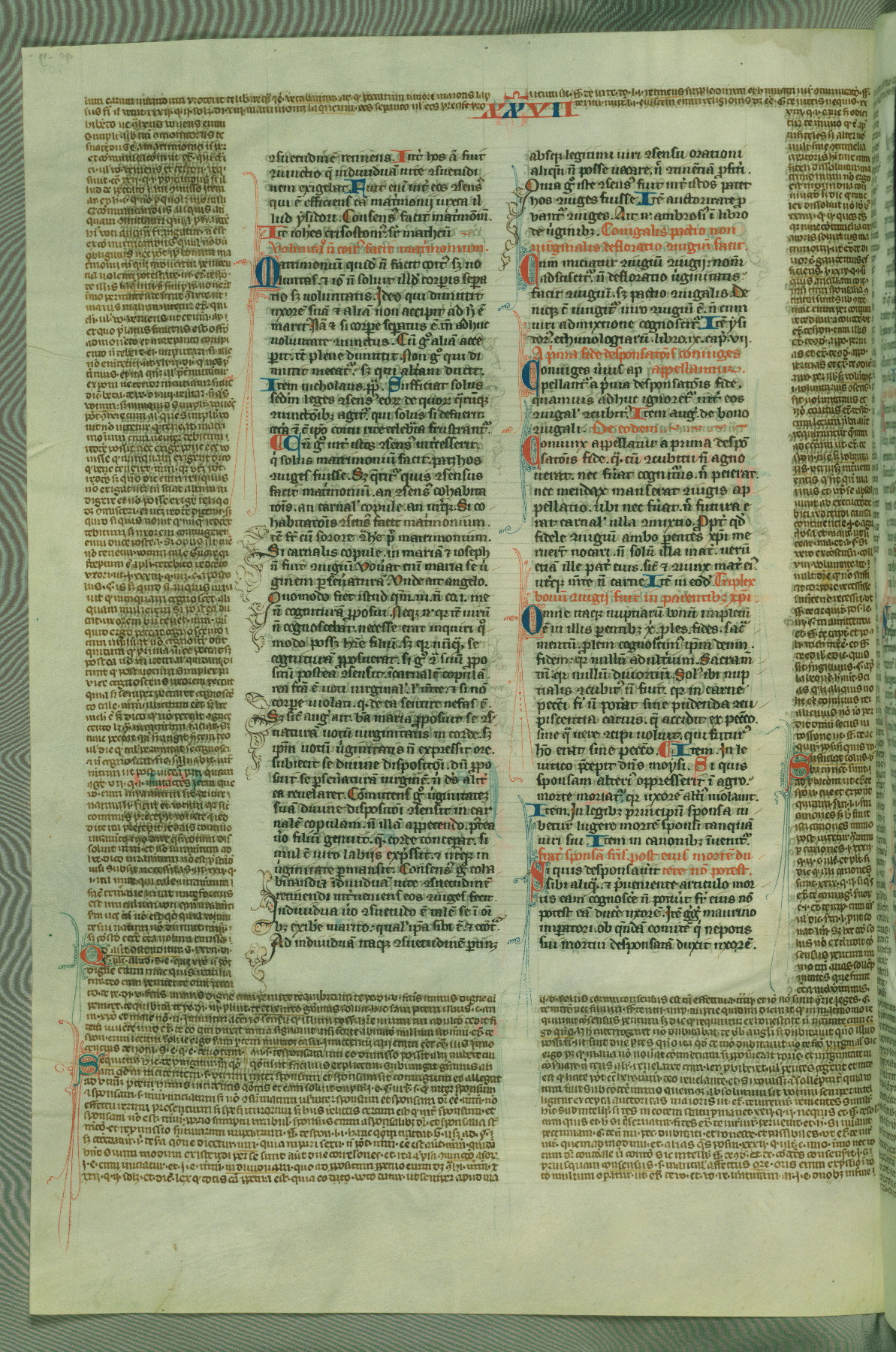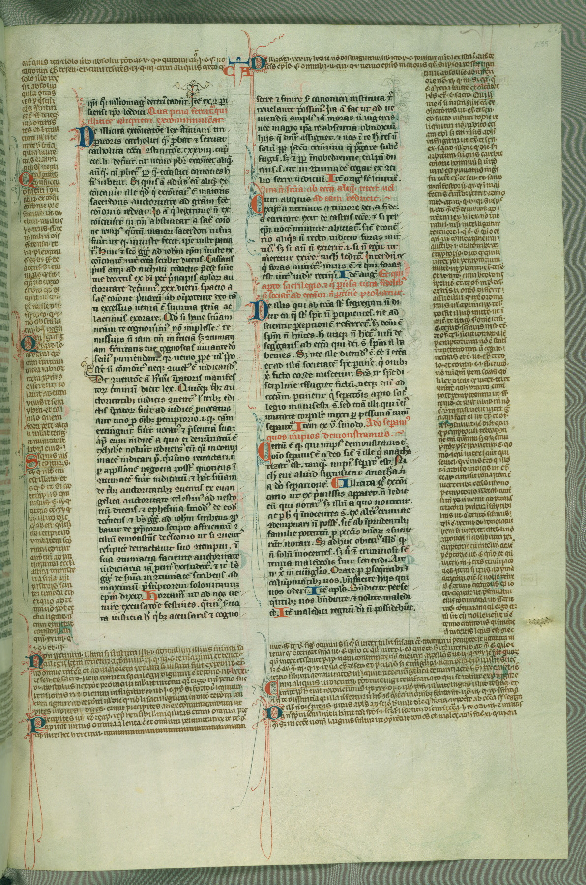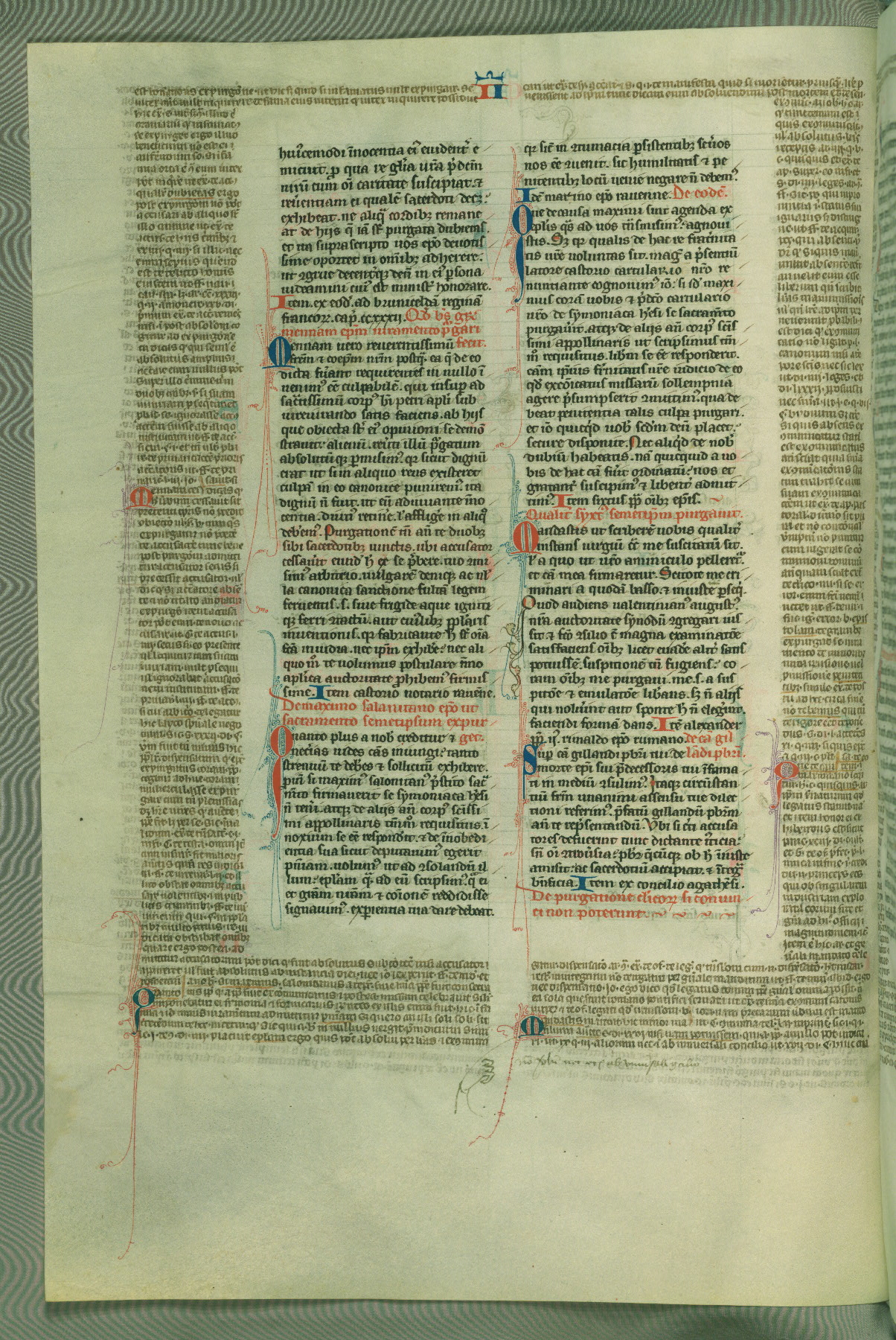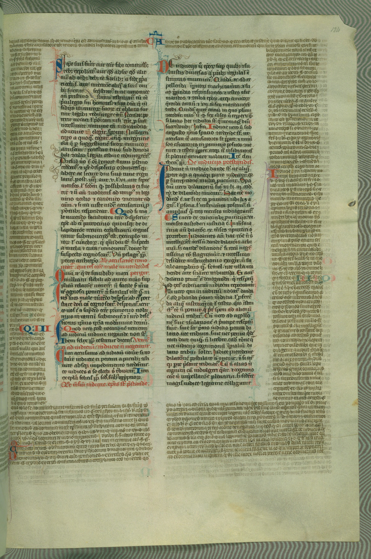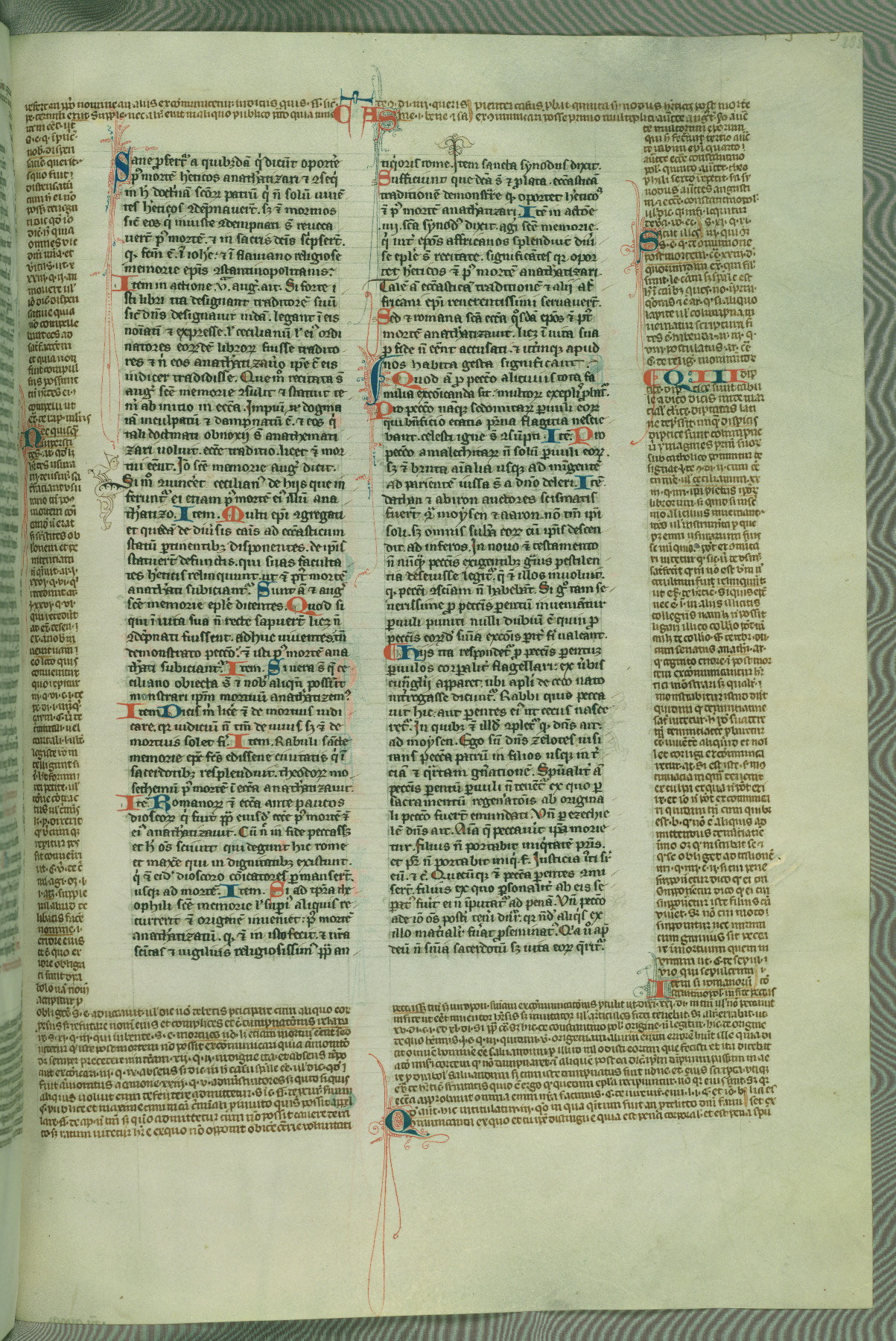 This deluxe version of Gratian's Decretum was created ca. 1280-90, most likely in Hainaut. The lively decoration of the manuscript indicates a marked taste for narrative, and there are thirty-seven historiated initials. The gloss work was completed by Bartholomew of Brescia. At first, Paris would seem to be the most likely place of origin, given that it was the leading center for the study of canon law. However, this particular manuscript exhibits scribal features that suggest its place of origin as being the Cistercian abbey of Cambron in Hainaut. Furthermore, Abbot Baudouin de Bousso, whose tenure at the abbey was from 1283 to 1293, was schooled in theology at the University of Paris, and he would eventually endorse the production of many fine manuscripts while at Cambron. In fact, the catalyst for this endeavor seems to have been the Beaupré Antiphonary (W.759-761), which was was created at Cambron during the 1280s. Stylistic features of W.133 seem to have connections with the Beaupré Antiphonary. For example, Cistercian monks are shown in three extant illuminations throughout three of the antiphonary volumes; these monks are pictured in brown habits similar to the type worn by clerics in W.133. The reliance upon Cistercian precedents for textual and design features associates W.133 with the Cistercian abbey at Cambron. However, more remains to be confirmed by further inspection of the output of the scriptorium at Cambron.