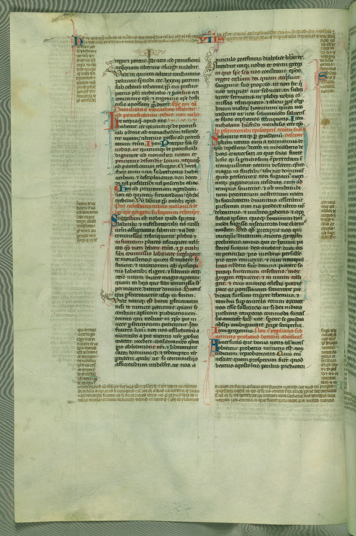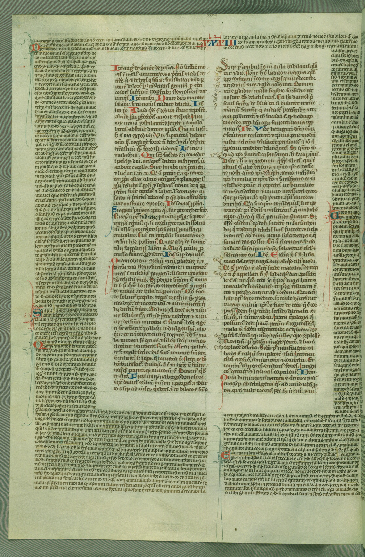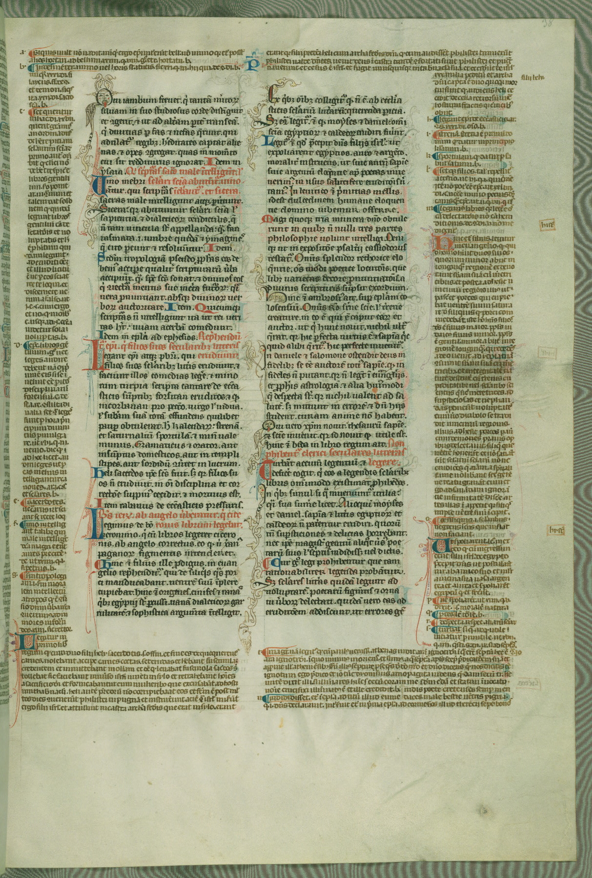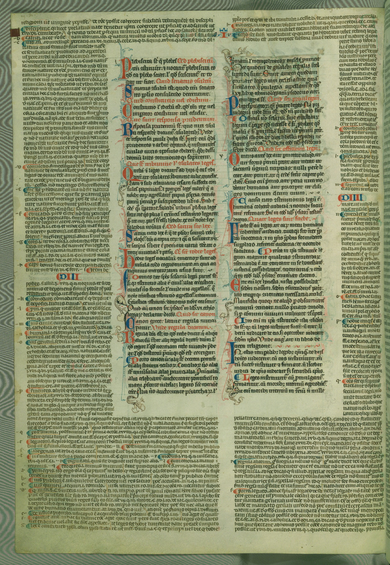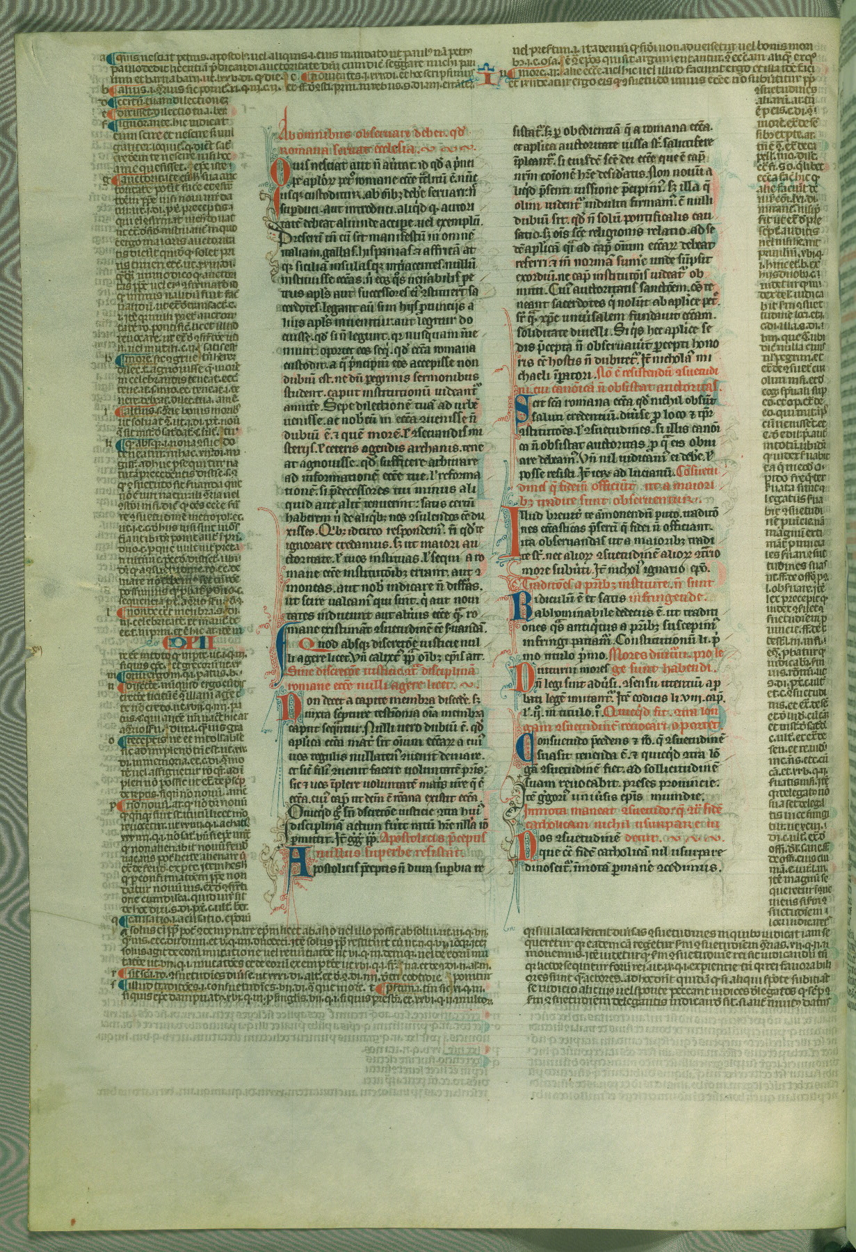 This deluxe version of Gratian's Decretum was created ca. 1280-90, most likely in Hainaut. The lively decoration of the manuscript indicates a marked taste for narrative, and there are thirty-seven historiated initials. The gloss work was completed by Bartholomew of Brescia. At first, Paris would seem to be the most likely place of origin, given that it was the leading center for the study of canon law. However, this particular manuscript exhibits scribal features that suggest its place of origin as being the Cistercian abbey of Cambron in Hainaut. Furthermore, Abbot Baudouin de Bousso, whose tenure at the abbey was from 1283 to 1293, was schooled in theology at the University of Paris, and he would eventually endorse the production of many fine manuscripts while at Cambron. In fact, the catalyst for this endeavor seems to have been the Beaupré Antiphonary (W.759-761), which was was created at Cambron during the 1280s. Stylistic features of W.133 seem to have connections with the Beaupré Antiphonary. For example, Cistercian monks are shown in three extant illuminations throughout three of the antiphonary volumes; these monks are pictured in brown habits similar to the type worn by clerics in W.133. The reliance upon Cistercian precedents for textual and design features associates W.133 with the Cistercian abbey at Cambron. However, more remains to be confirmed by further inspection of the output of the scriptorium at Cambron.