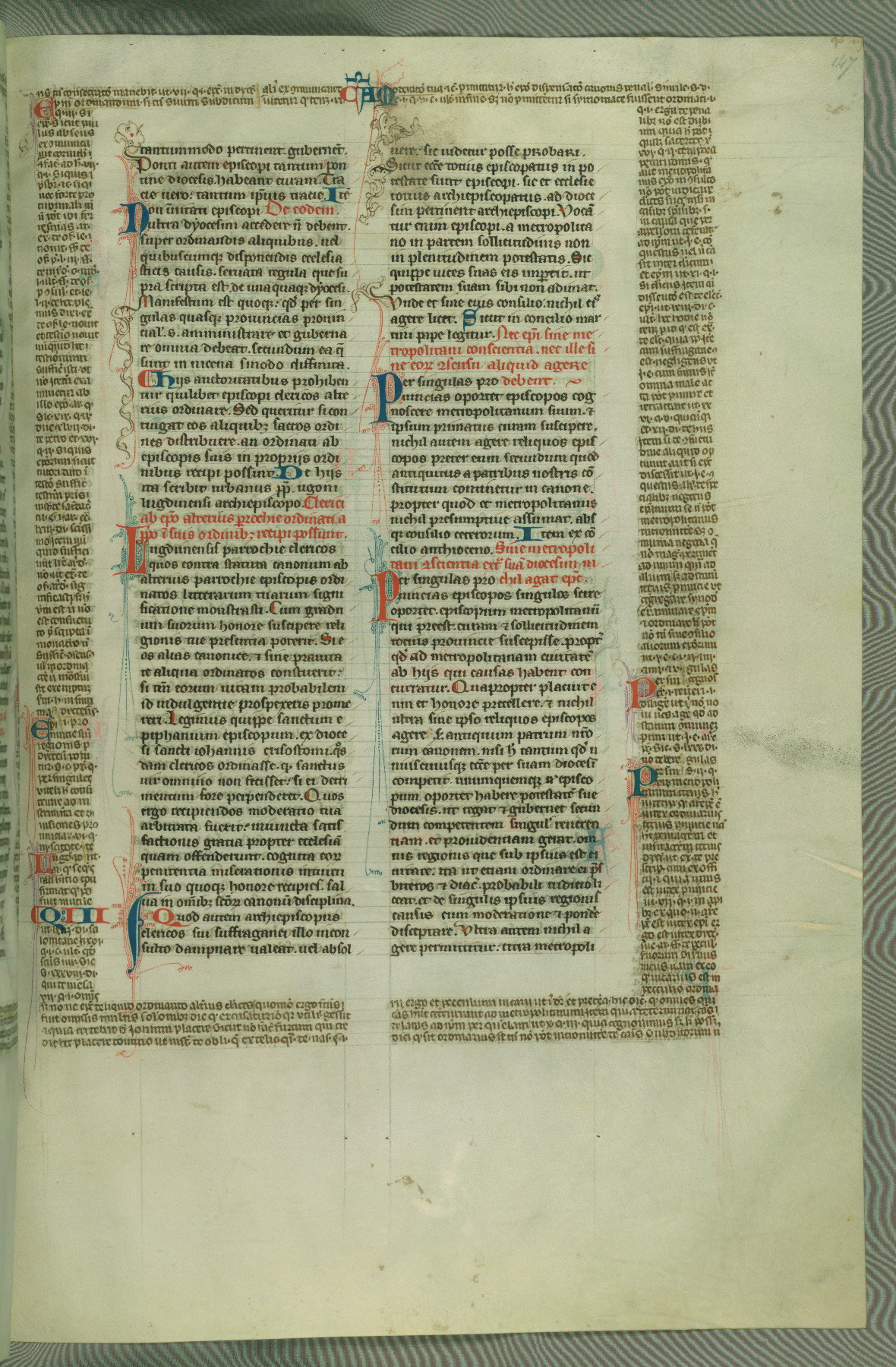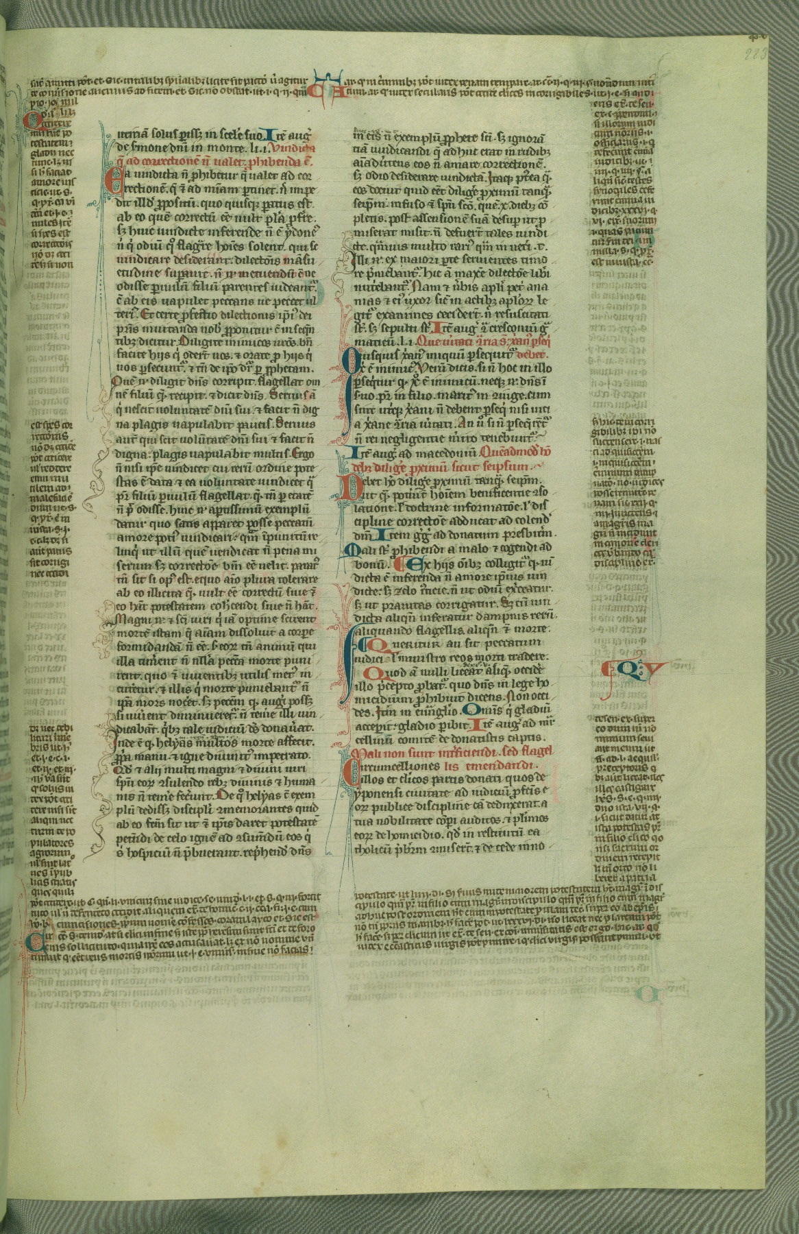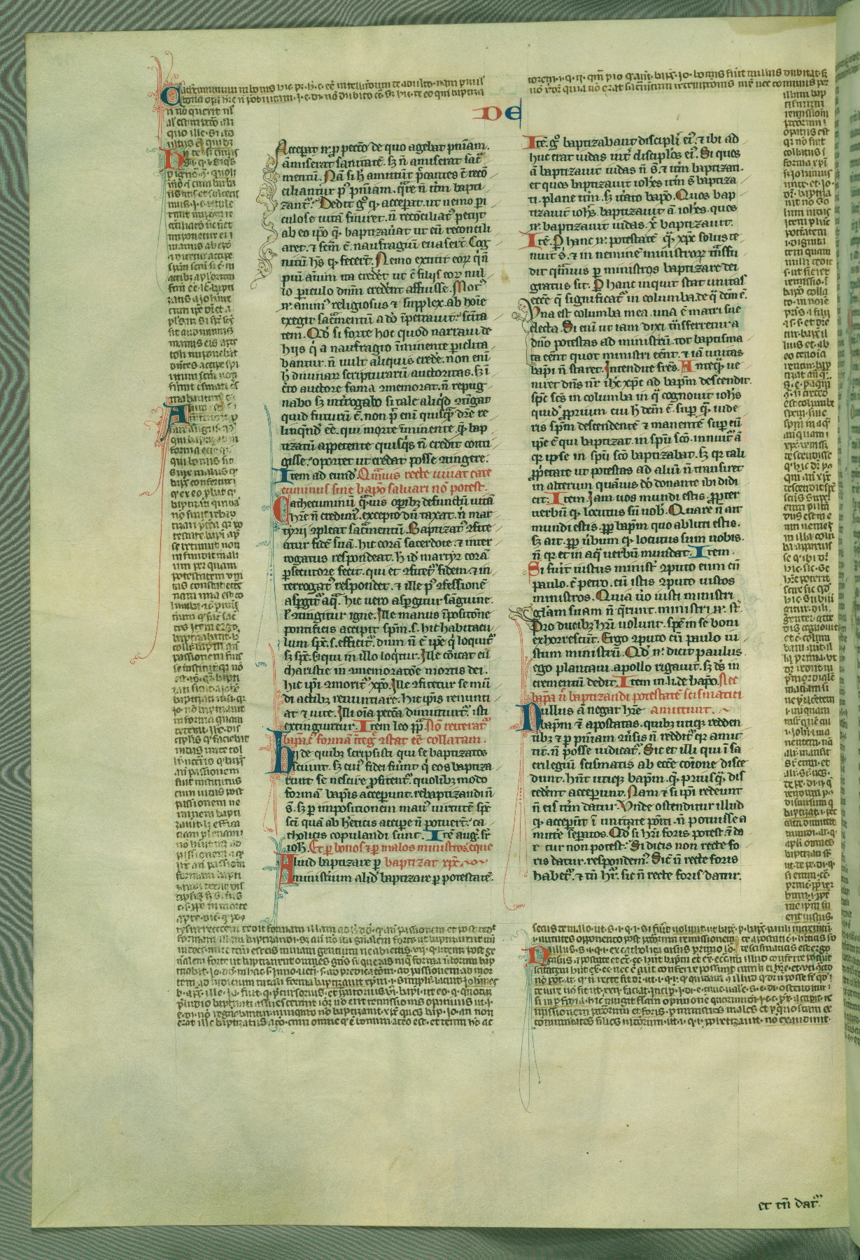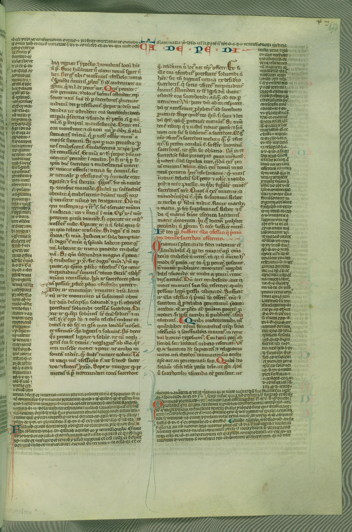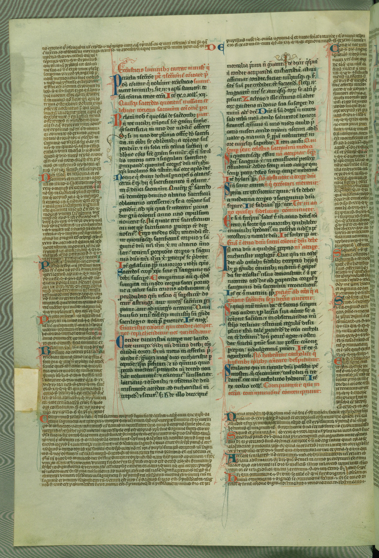 This deluxe version of Gratian's Decretum was created ca. 1280-90, most likely in Hainaut. The lively decoration of the manuscript indicates a marked taste for narrative, and there are thirty-seven historiated initials. The gloss work was completed by Bartholomew of Brescia. At first, Paris would seem to be the most likely place of origin, given that it was the leading center for the study of canon law. However, this particular manuscript exhibits scribal features that suggest its place of origin as being the Cistercian abbey of Cambron in Hainaut. Furthermore, Abbot Baudouin de Bousso, whose tenure at the abbey was from 1283 to 1293, was schooled in theology at the University of Paris, and he would eventually endorse the production of many fine manuscripts while at Cambron. In fact, the catalyst for this endeavor seems to have been the Beaupré Antiphonary (W.759-761), which was was created at Cambron during the 1280s. Stylistic features of W.133 seem to have connections with the Beaupré Antiphonary. For example, Cistercian monks are shown in three extant illuminations throughout three of the antiphonary volumes; these monks are pictured in brown habits similar to the type worn by clerics in W.133. The reliance upon Cistercian precedents for textual and design features associates W.133 with the Cistercian abbey at Cambron. However, more remains to be confirmed by further inspection of the output of the scriptorium at Cambron.