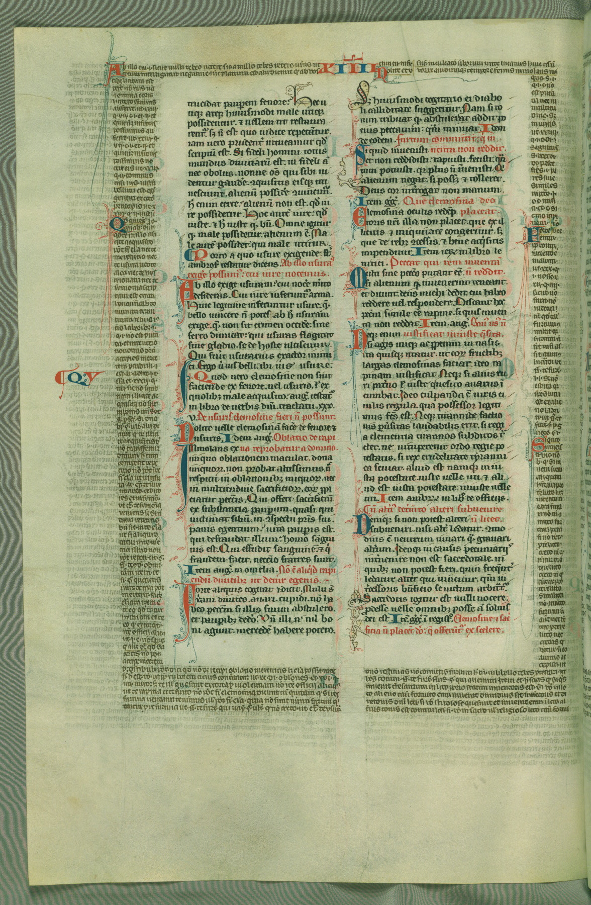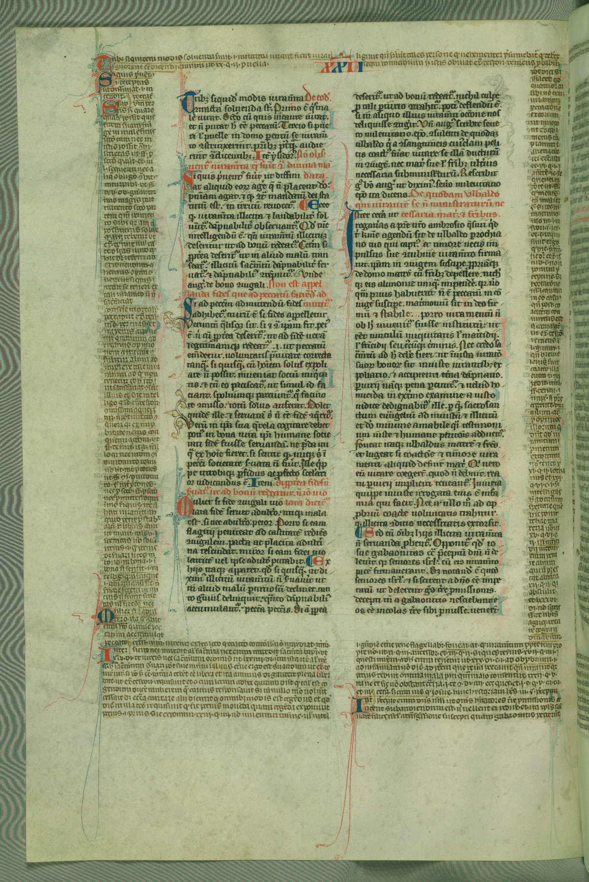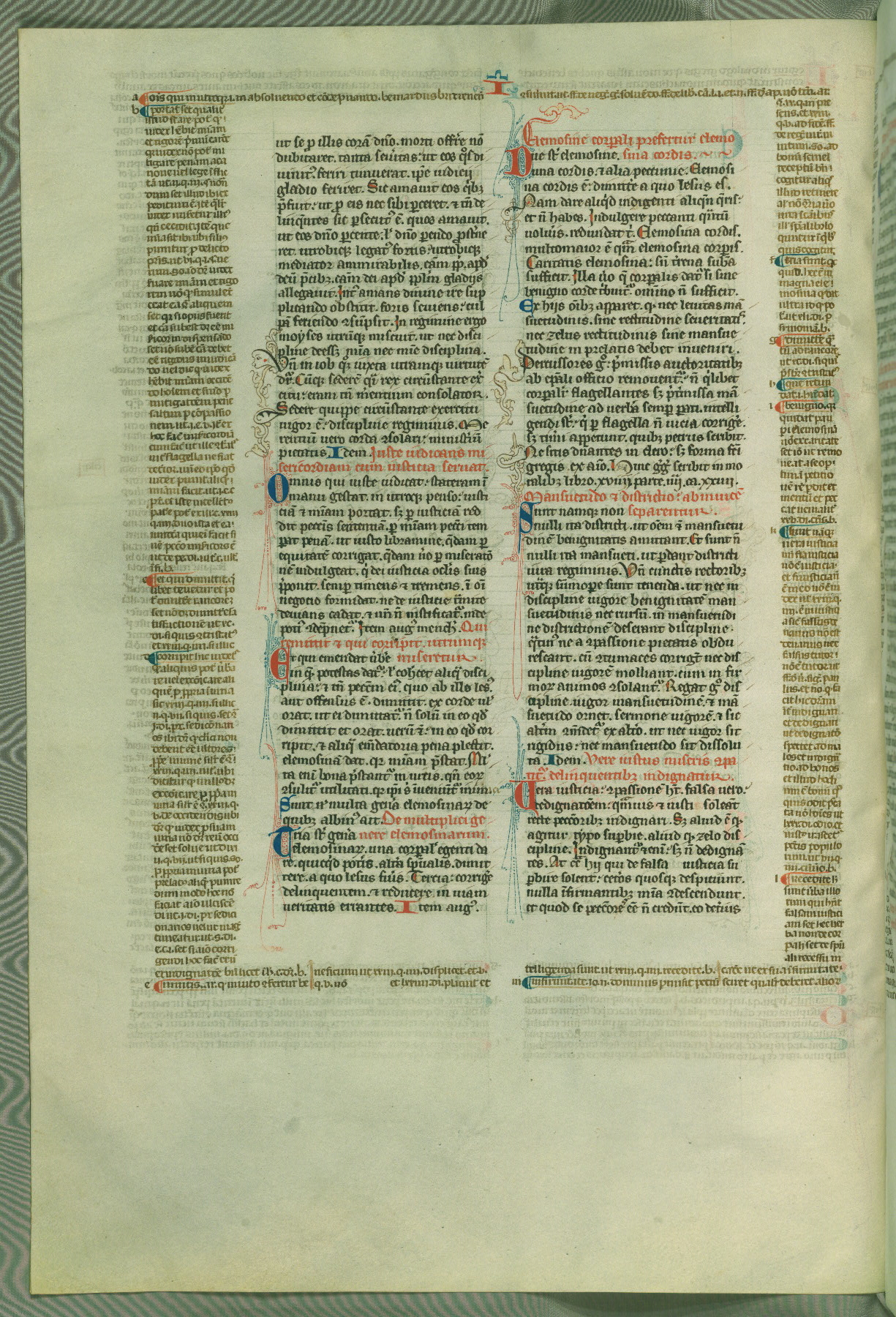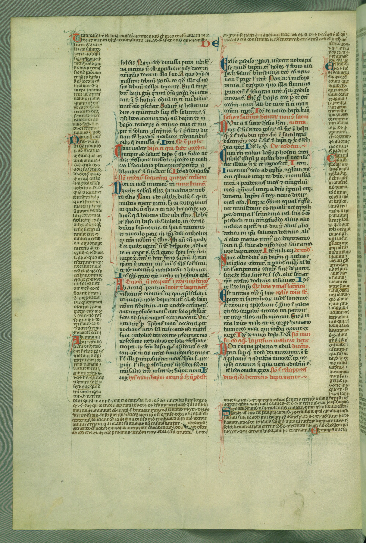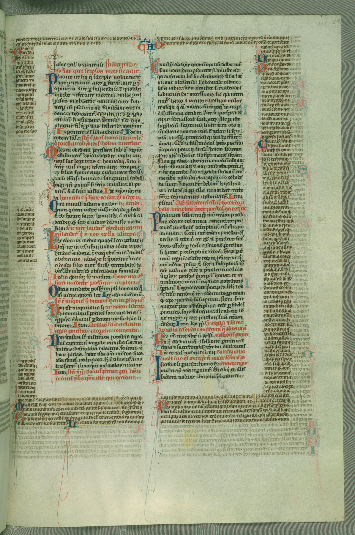 This deluxe version of Gratian's Decretum was created ca. 1280-90, most likely in Hainaut. The lively decoration of the manuscript indicates a marked taste for narrative, and there are thirty-seven historiated initials. The gloss work was completed by Bartholomew of Brescia. At first, Paris would seem to be the most likely place of origin, given that it was the leading center for the study of canon law. However, this particular manuscript exhibits scribal features that suggest its place of origin as being the Cistercian abbey of Cambron in Hainaut. Furthermore, Abbot Baudouin de Bousso, whose tenure at the abbey was from 1283 to 1293, was schooled in theology at the University of Paris, and he would eventually endorse the production of many fine manuscripts while at Cambron. In fact, the catalyst for this endeavor seems to have been the Beaupré Antiphonary (W.759-761), which was was created at Cambron during the 1280s. Stylistic features of W.133 seem to have connections with the Beaupré Antiphonary. For example, Cistercian monks are shown in three extant illuminations throughout three of the antiphonary volumes; these monks are pictured in brown habits similar to the type worn by clerics in W.133. The reliance upon Cistercian precedents for textual and design features associates W.133 with the Cistercian abbey at Cambron. However, more remains to be confirmed by further inspection of the output of the scriptorium at Cambron.