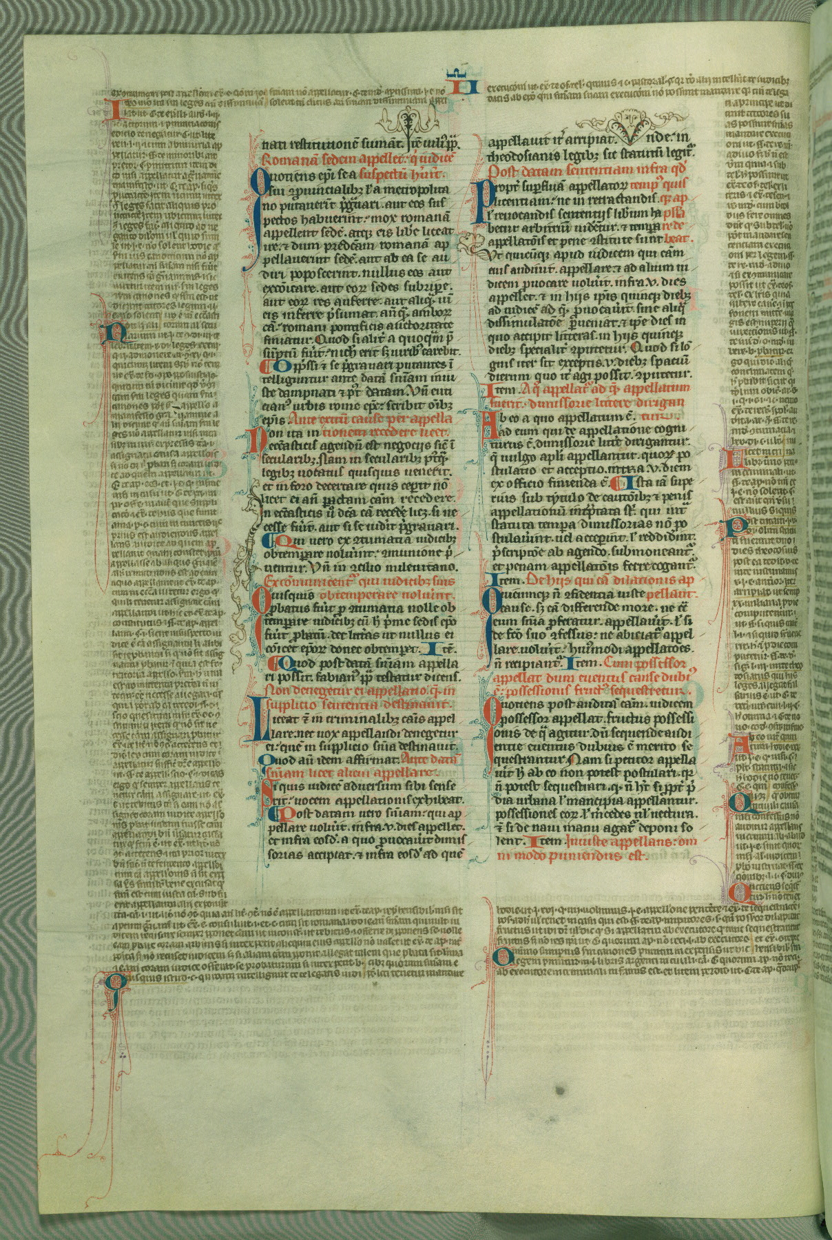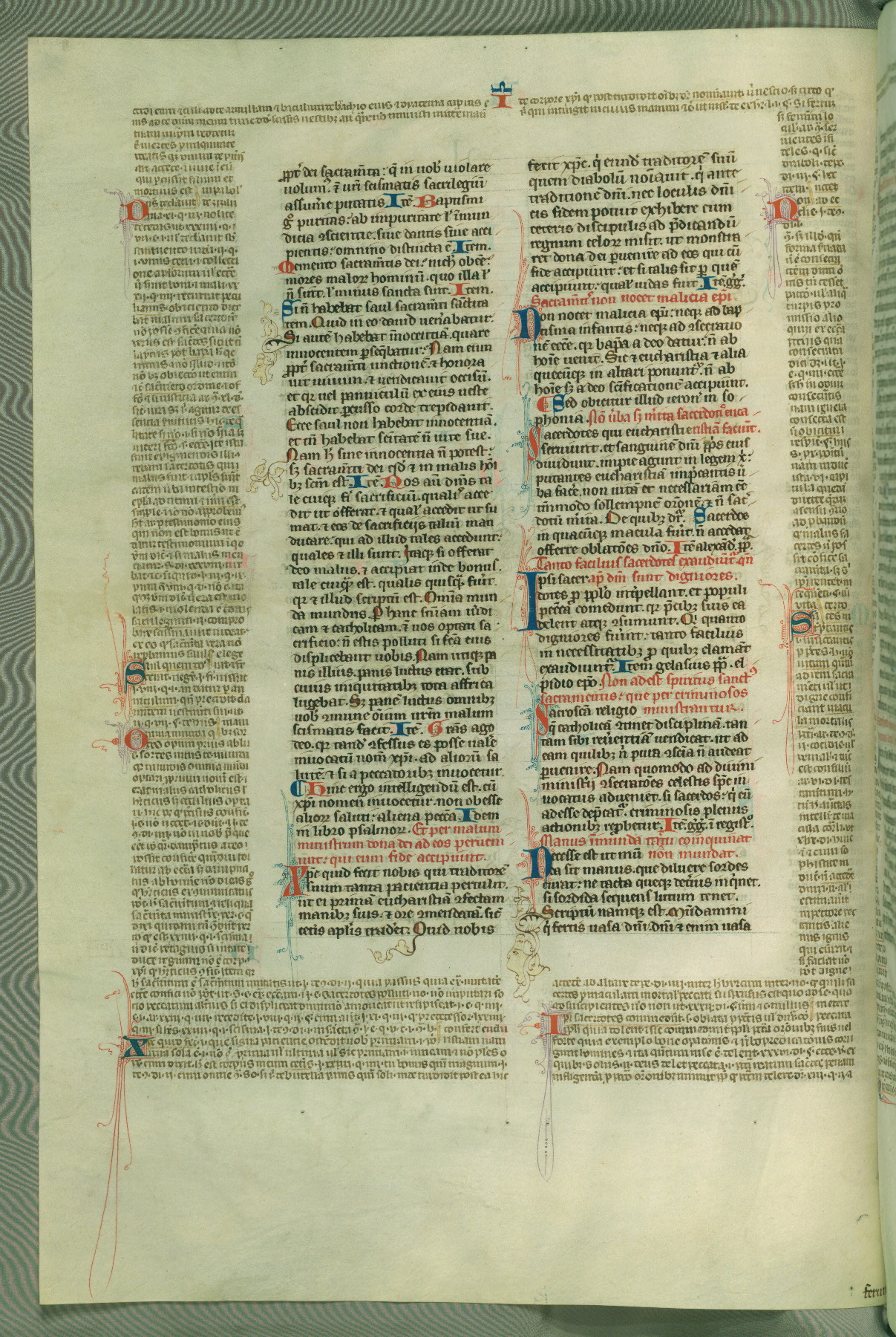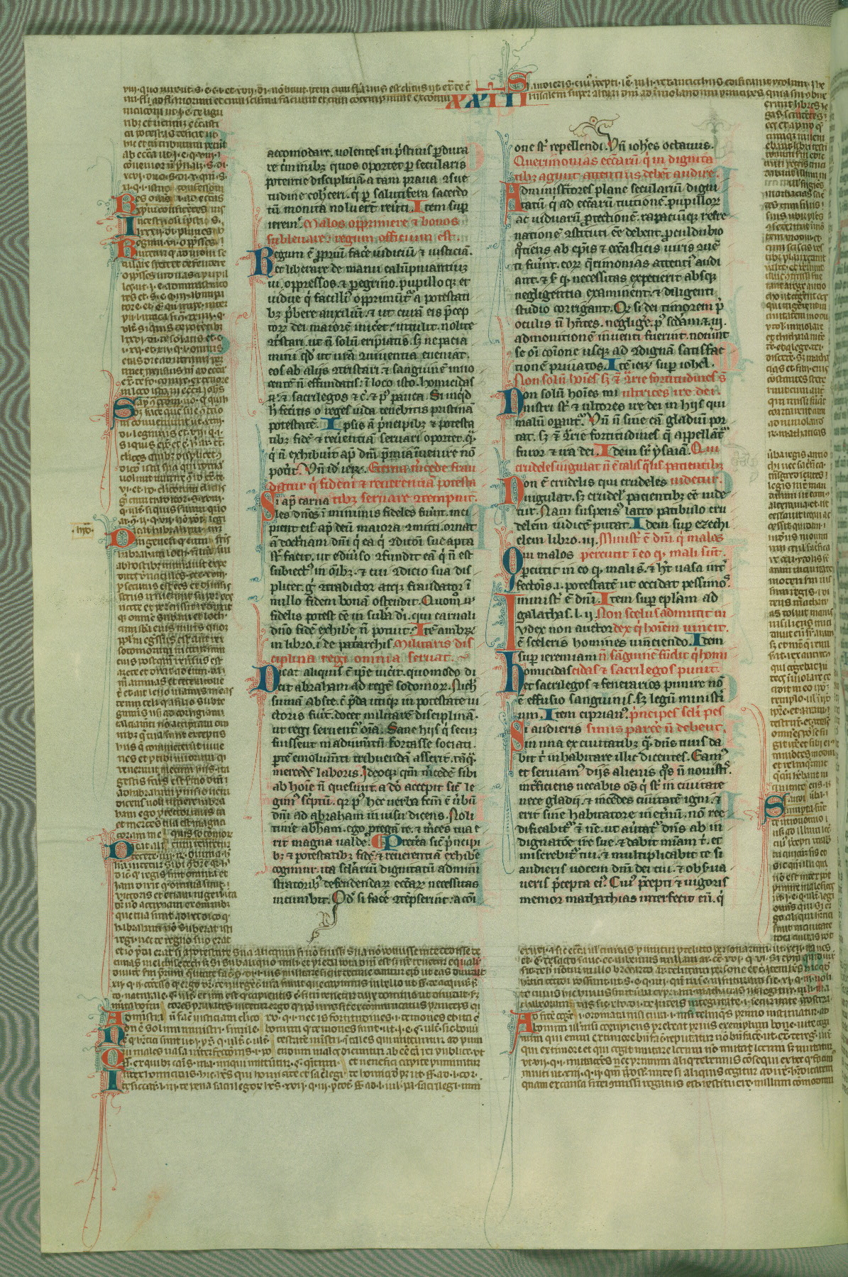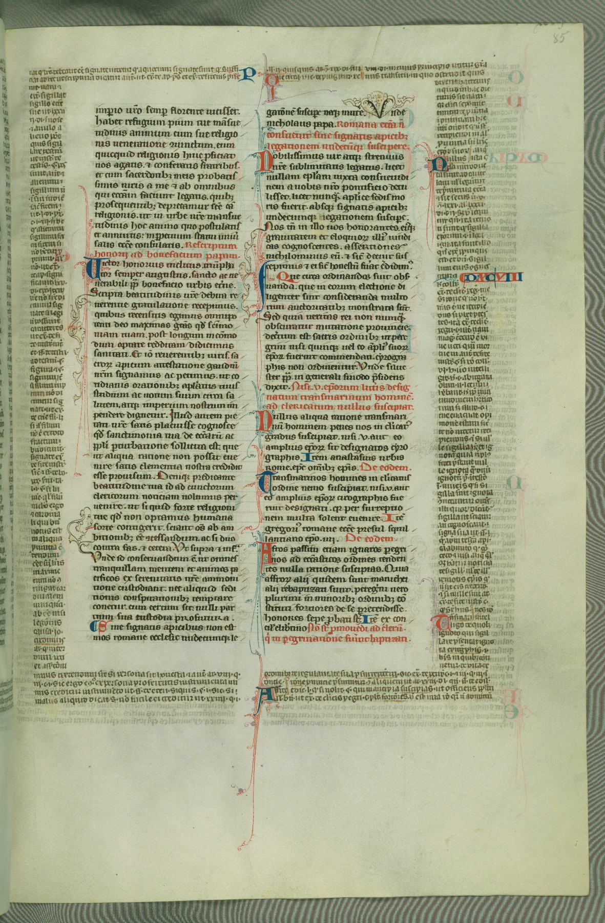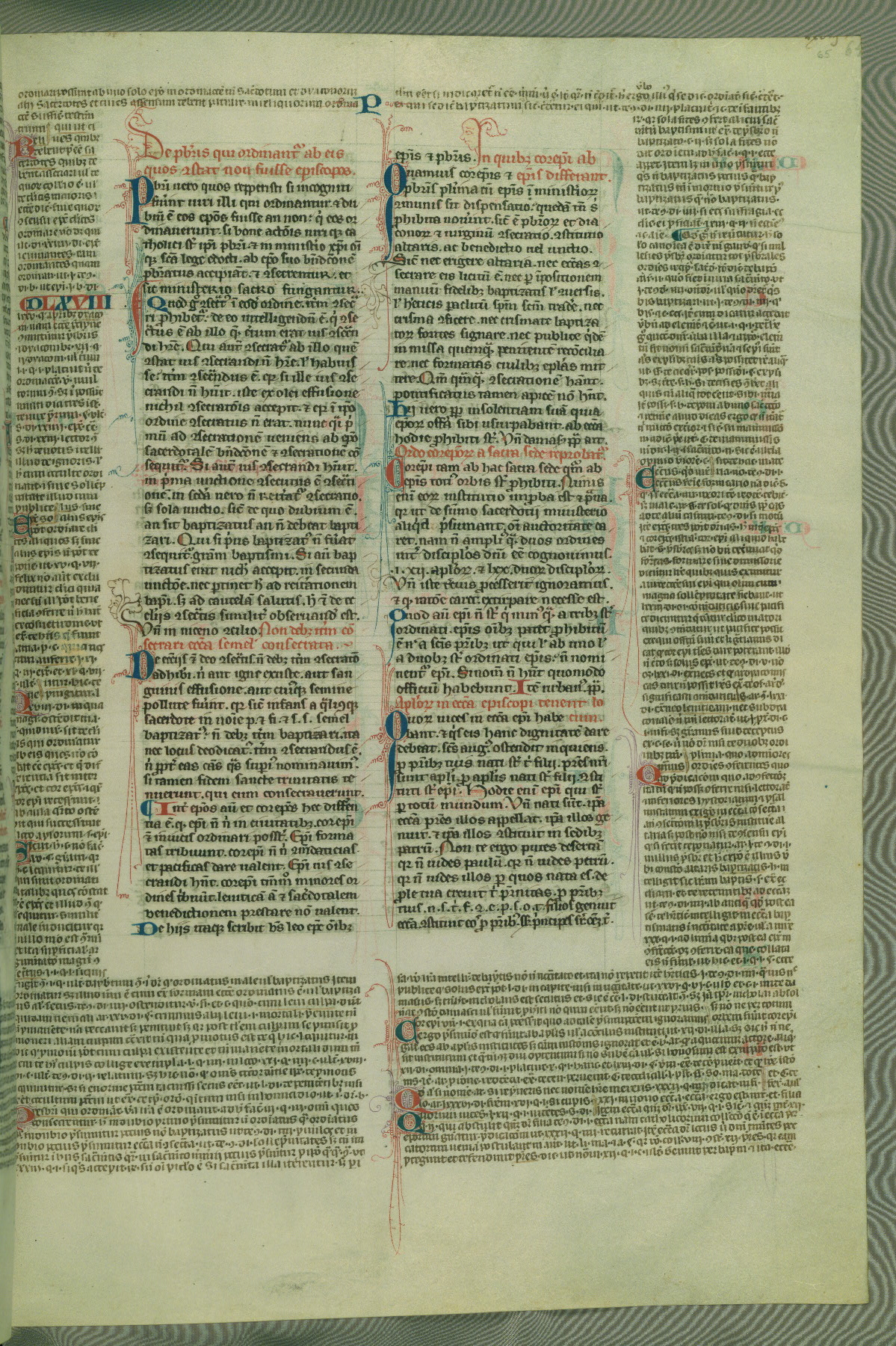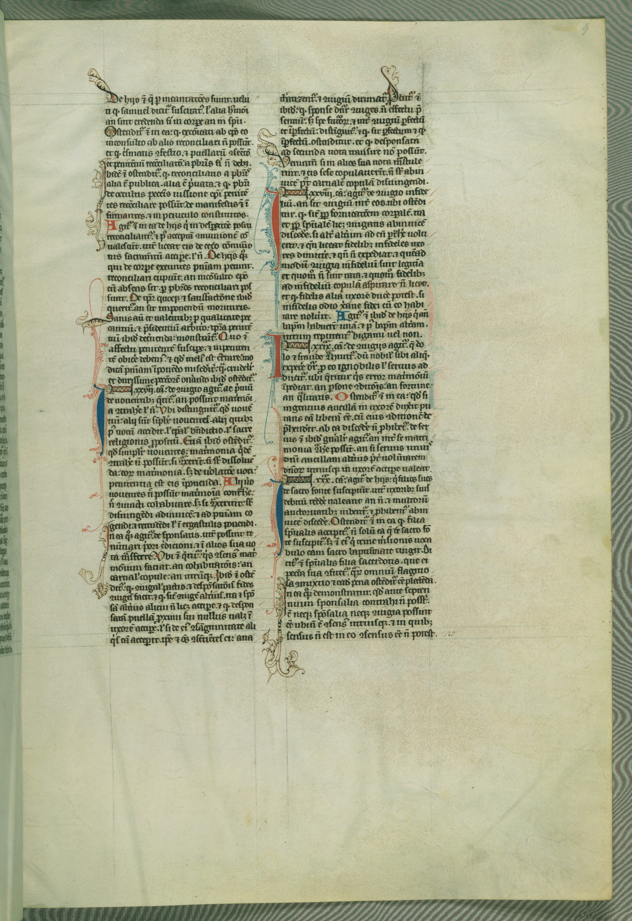 This deluxe version of Gratian's Decretum was created ca. 1280-90, most likely in Hainaut. The lively decoration of the manuscript indicates a marked taste for narrative, and there are thirty-seven historiated initials. The gloss work was completed by Bartholomew of Brescia. At first, Paris would seem to be the most likely place of origin, given that it was the leading center for the study of canon law. However, this particular manuscript exhibits scribal features that suggest its place of origin as being the Cistercian abbey of Cambron in Hainaut. Furthermore, Abbot Baudouin de Bousso, whose tenure at the abbey was from 1283 to 1293, was schooled in theology at the University of Paris, and he would eventually endorse the production of many fine manuscripts while at Cambron. In fact, the catalyst for this endeavor seems to have been the Beaupré Antiphonary (W.759-761), which was was created at Cambron during the 1280s. Stylistic features of W.133 seem to have connections with the Beaupré Antiphonary. For example, Cistercian monks are shown in three extant illuminations throughout three of the antiphonary volumes; these monks are pictured in brown habits similar to the type worn by clerics in W.133. The reliance upon Cistercian precedents for textual and design features associates W.133 with the Cistercian abbey at Cambron. However, more remains to be confirmed by further inspection of the output of the scriptorium at Cambron.
