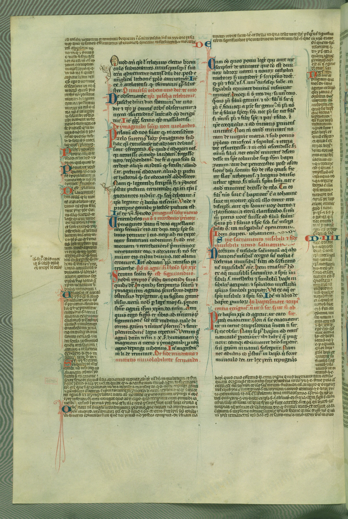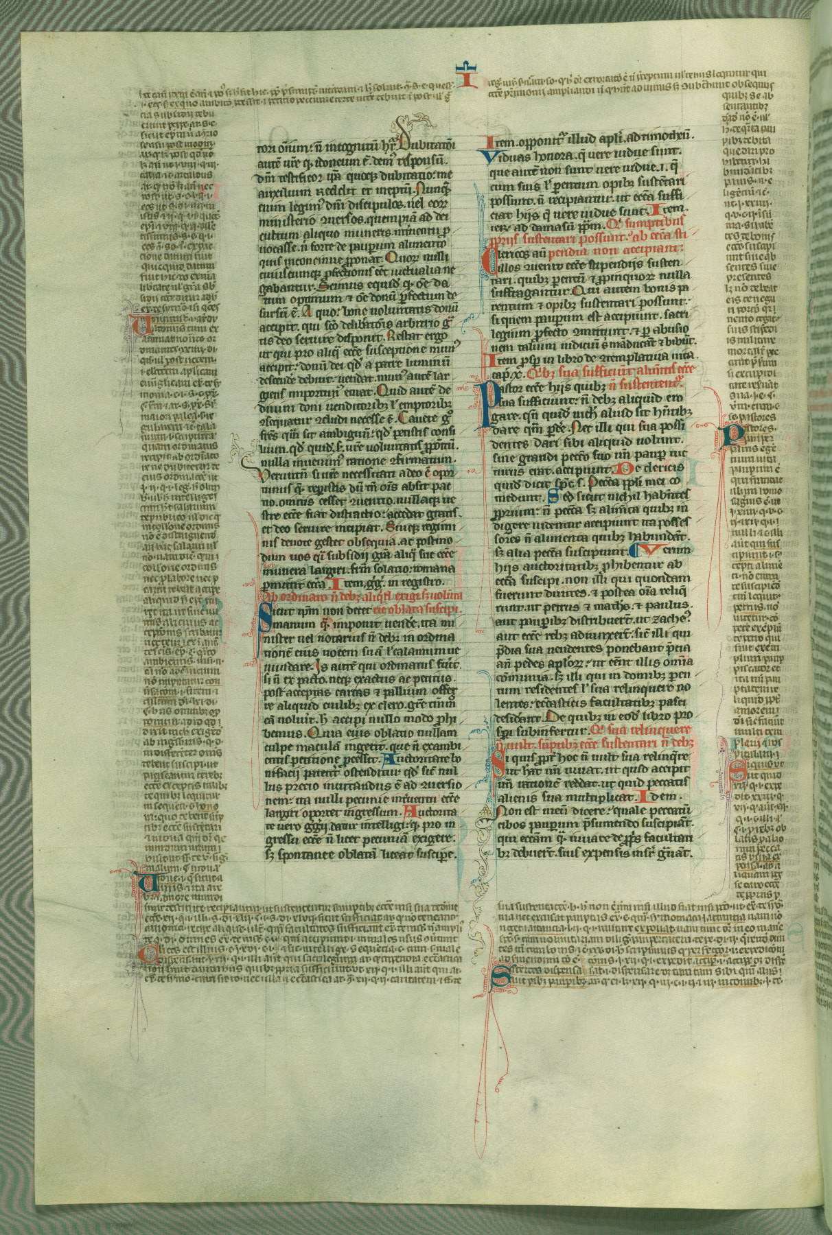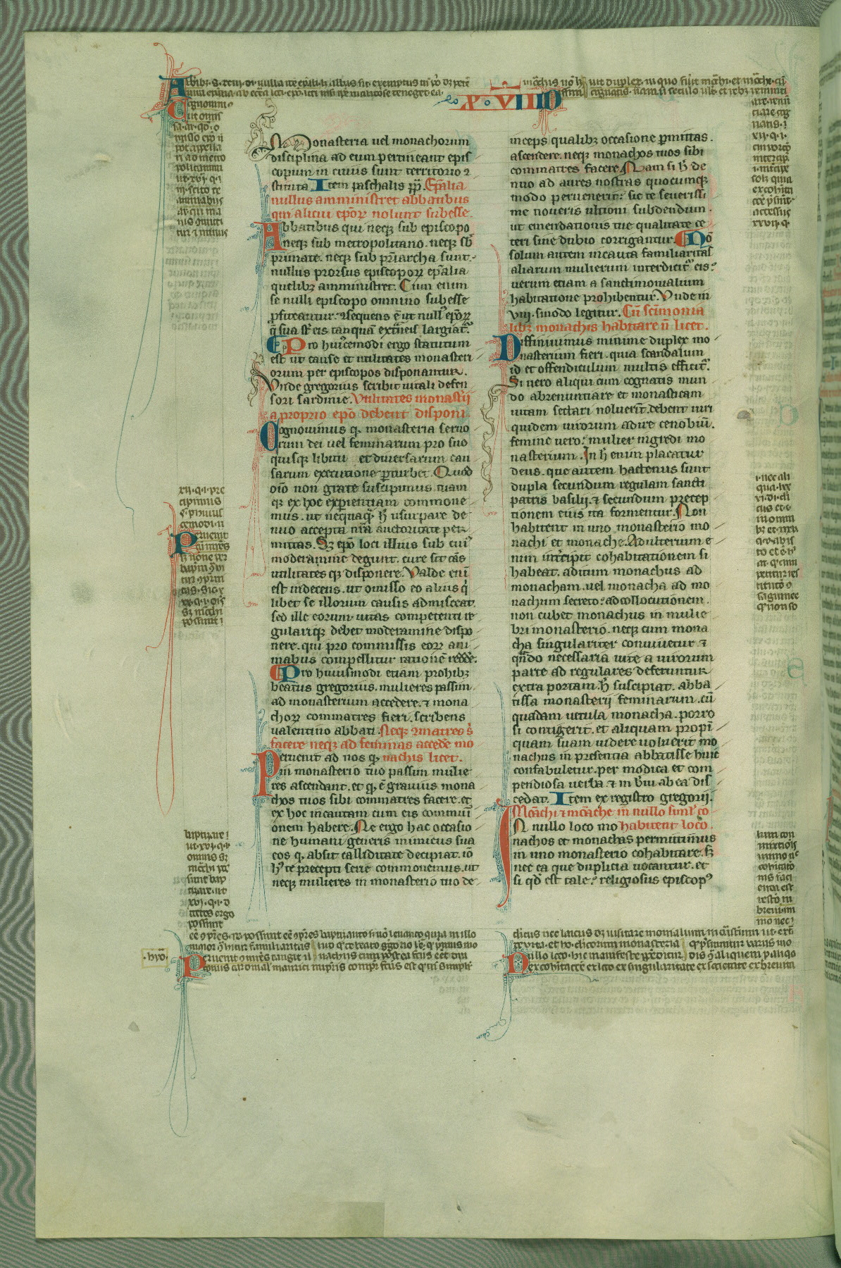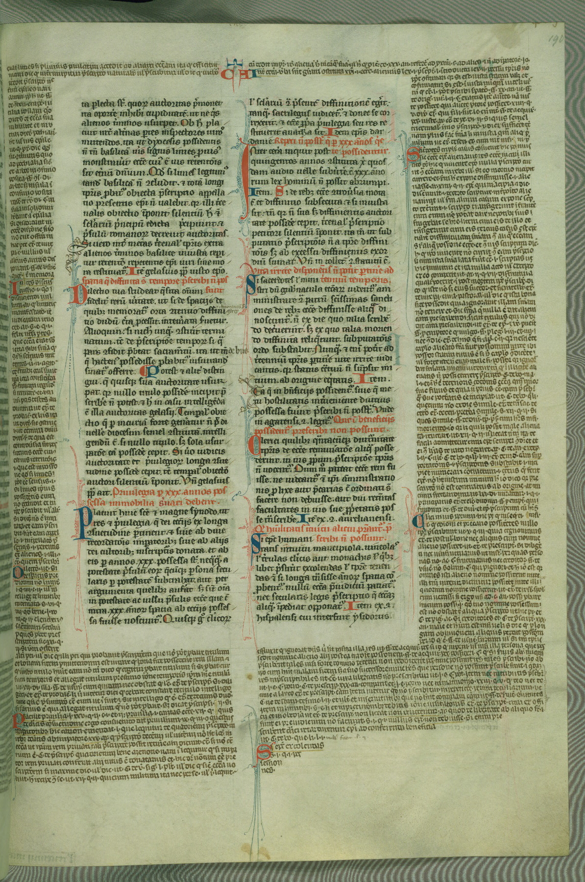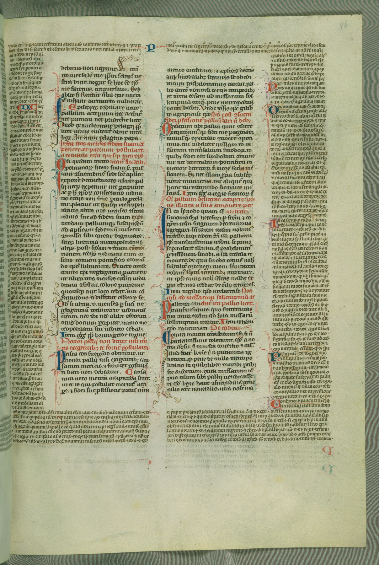 This deluxe version of Gratian's Decretum was created ca. 1280-90, most likely in Hainaut. The lively decoration of the manuscript indicates a marked taste for narrative, and there are thirty-seven historiated initials. The gloss work was completed by Bartholomew of Brescia. At first, Paris would seem to be the most likely place of origin, given that it was the leading center for the study of canon law. However, this particular manuscript exhibits scribal features that suggest its place of origin as being the Cistercian abbey of Cambron in Hainaut. Furthermore, Abbot Baudouin de Bousso, whose tenure at the abbey was from 1283 to 1293, was schooled in theology at the University of Paris, and he would eventually endorse the production of many fine manuscripts while at Cambron. In fact, the catalyst for this endeavor seems to have been the Beaupré Antiphonary (W.759-761), which was was created at Cambron during the 1280s. Stylistic features of W.133 seem to have connections with the Beaupré Antiphonary. For example, Cistercian monks are shown in three extant illuminations throughout three of the antiphonary volumes; these monks are pictured in brown habits similar to the type worn by clerics in W.133. The reliance upon Cistercian precedents for textual and design features associates W.133 with the Cistercian abbey at Cambron. However, more remains to be confirmed by further inspection of the output of the scriptorium at Cambron.