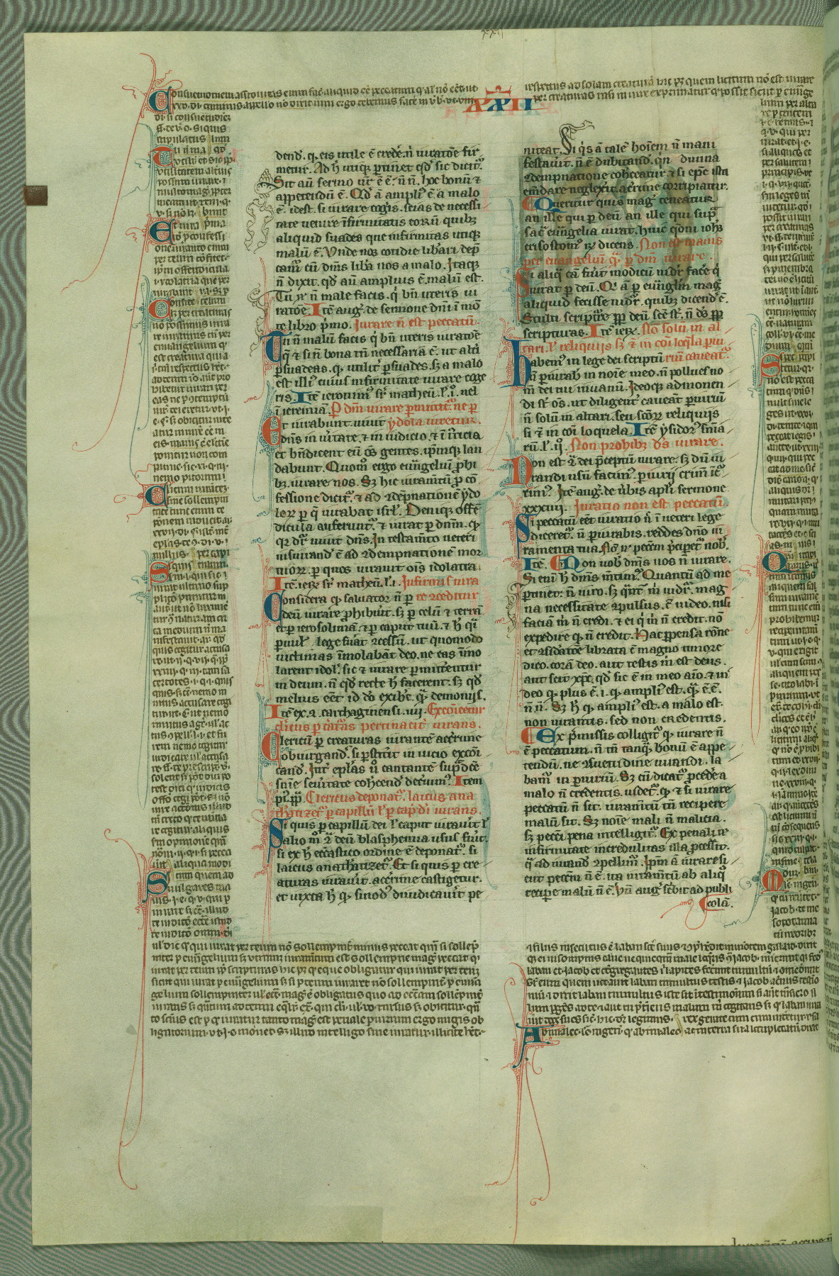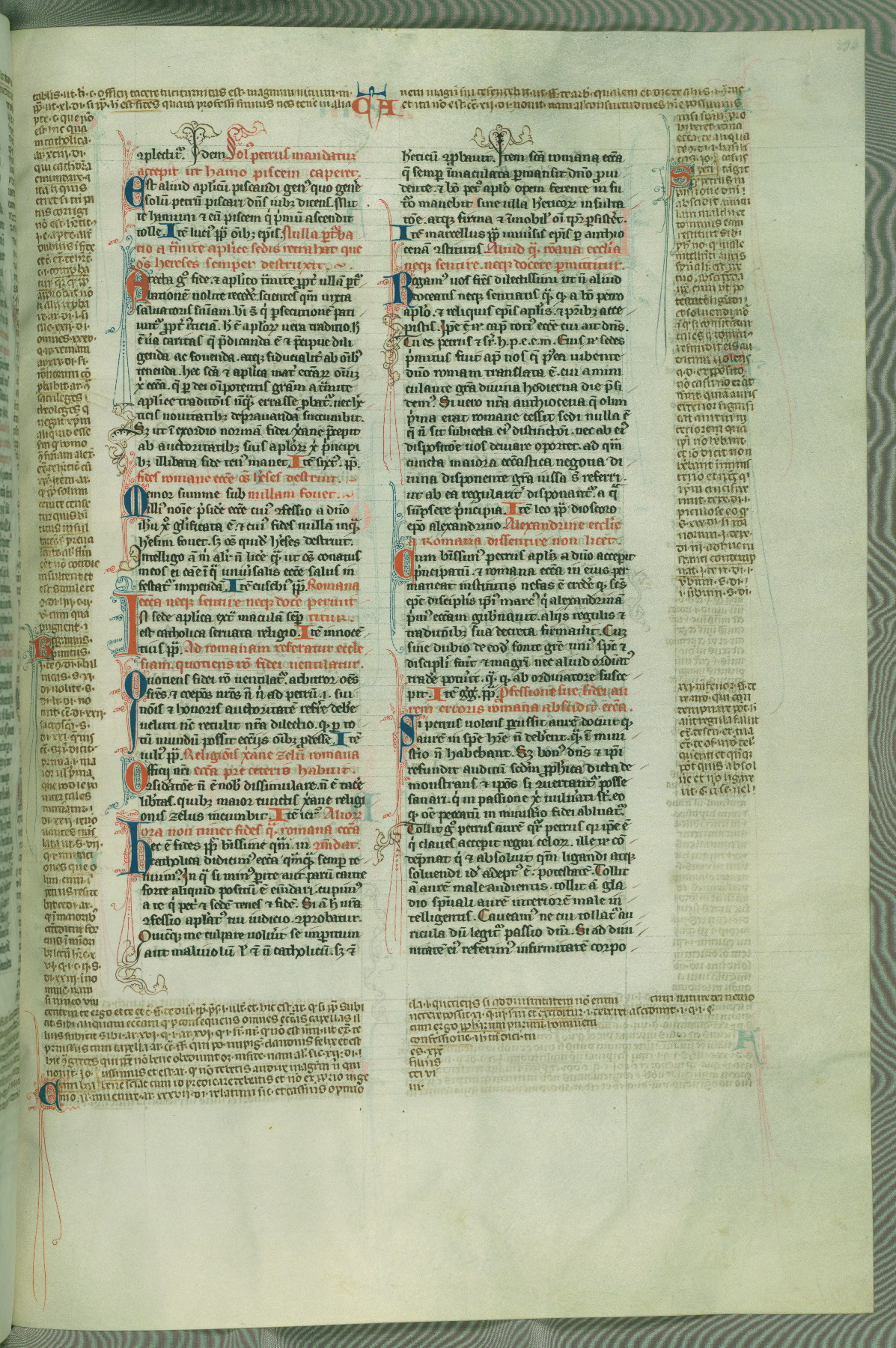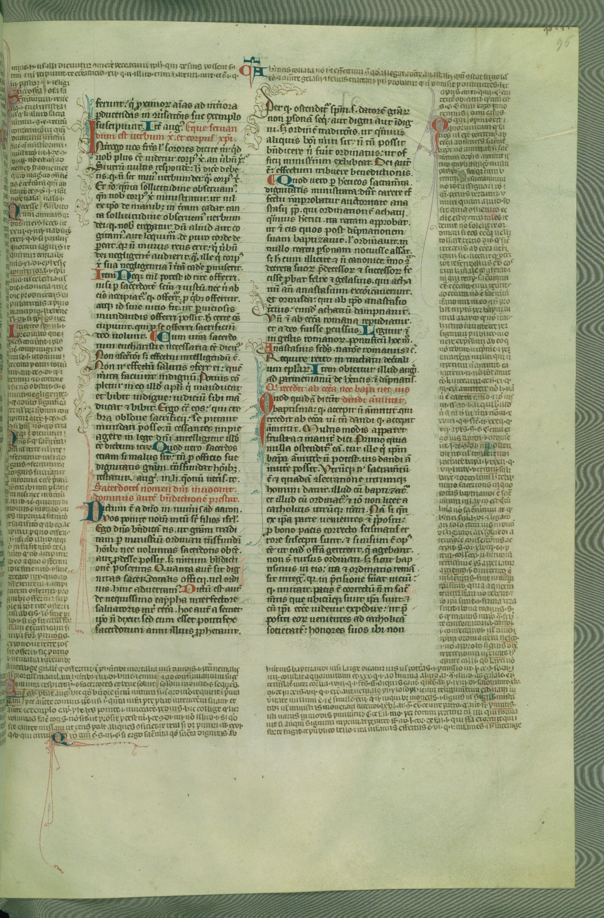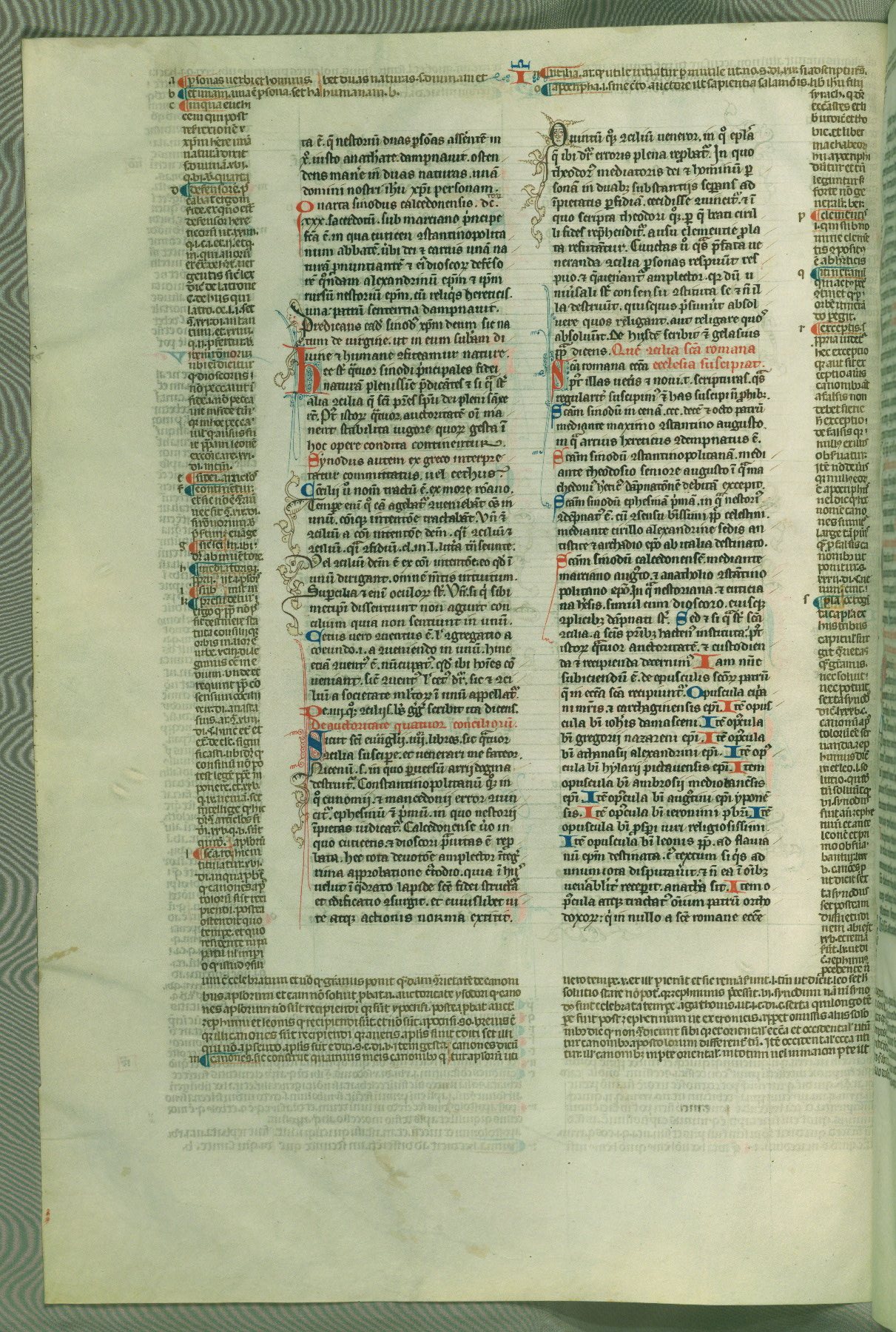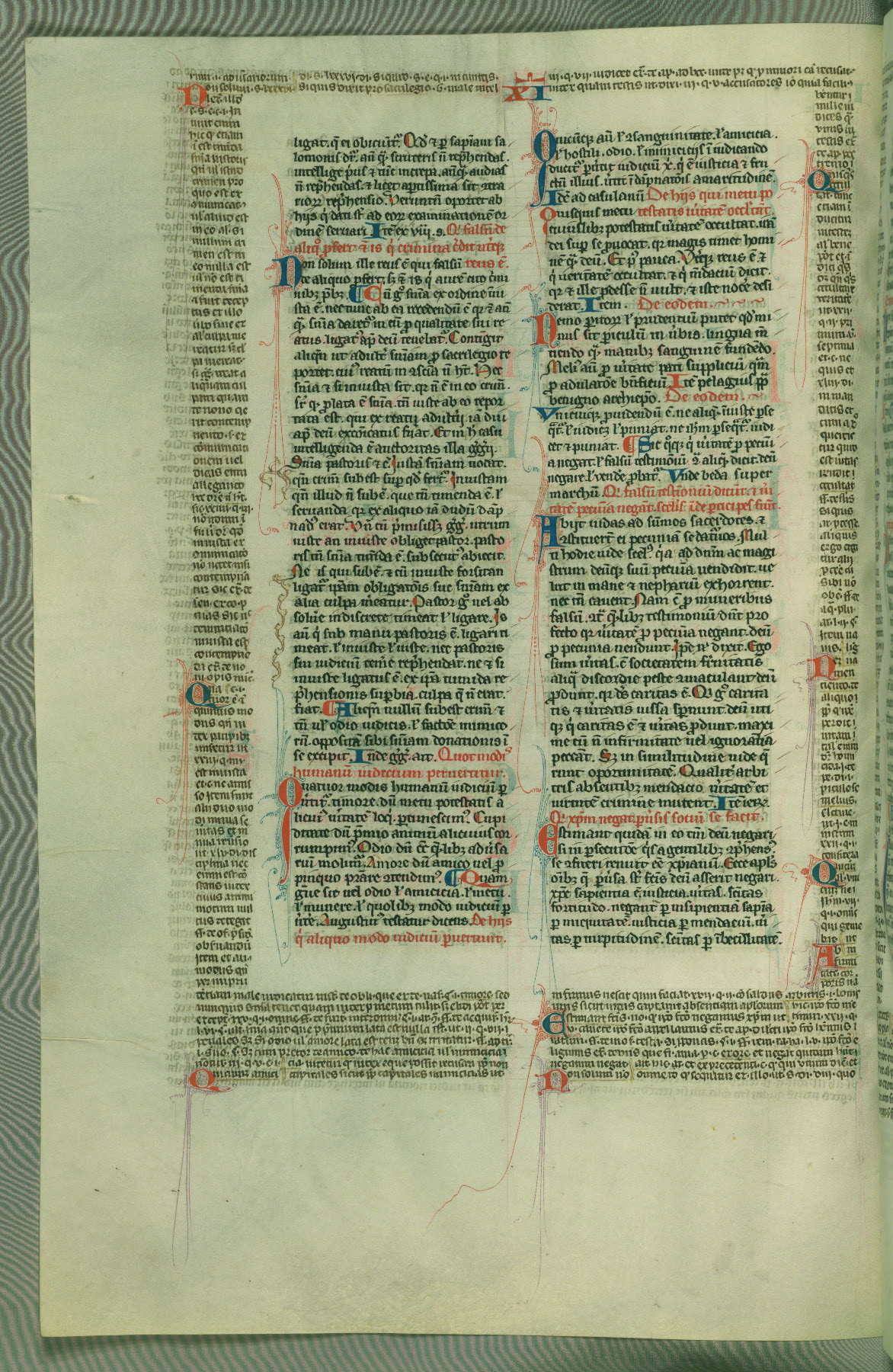 This deluxe version of Gratian's Decretum was created ca. 1280-90, most likely in Hainaut. The lively decoration of the manuscript indicates a marked taste for narrative, and there are thirty-seven historiated initials. The gloss work was completed by Bartholomew of Brescia. At first, Paris would seem to be the most likely place of origin, given that it was the leading center for the study of canon law. However, this particular manuscript exhibits scribal features that suggest its place of origin as being the Cistercian abbey of Cambron in Hainaut. Furthermore, Abbot Baudouin de Bousso, whose tenure at the abbey was from 1283 to 1293, was schooled in theology at the University of Paris, and he would eventually endorse the production of many fine manuscripts while at Cambron. In fact, the catalyst for this endeavor seems to have been the Beaupré Antiphonary (W.759-761), which was was created at Cambron during the 1280s. Stylistic features of W.133 seem to have connections with the Beaupré Antiphonary. For example, Cistercian monks are shown in three extant illuminations throughout three of the antiphonary volumes; these monks are pictured in brown habits similar to the type worn by clerics in W.133. The reliance upon Cistercian precedents for textual and design features associates W.133 with the Cistercian abbey at Cambron. However, more remains to be confirmed by further inspection of the output of the scriptorium at Cambron.