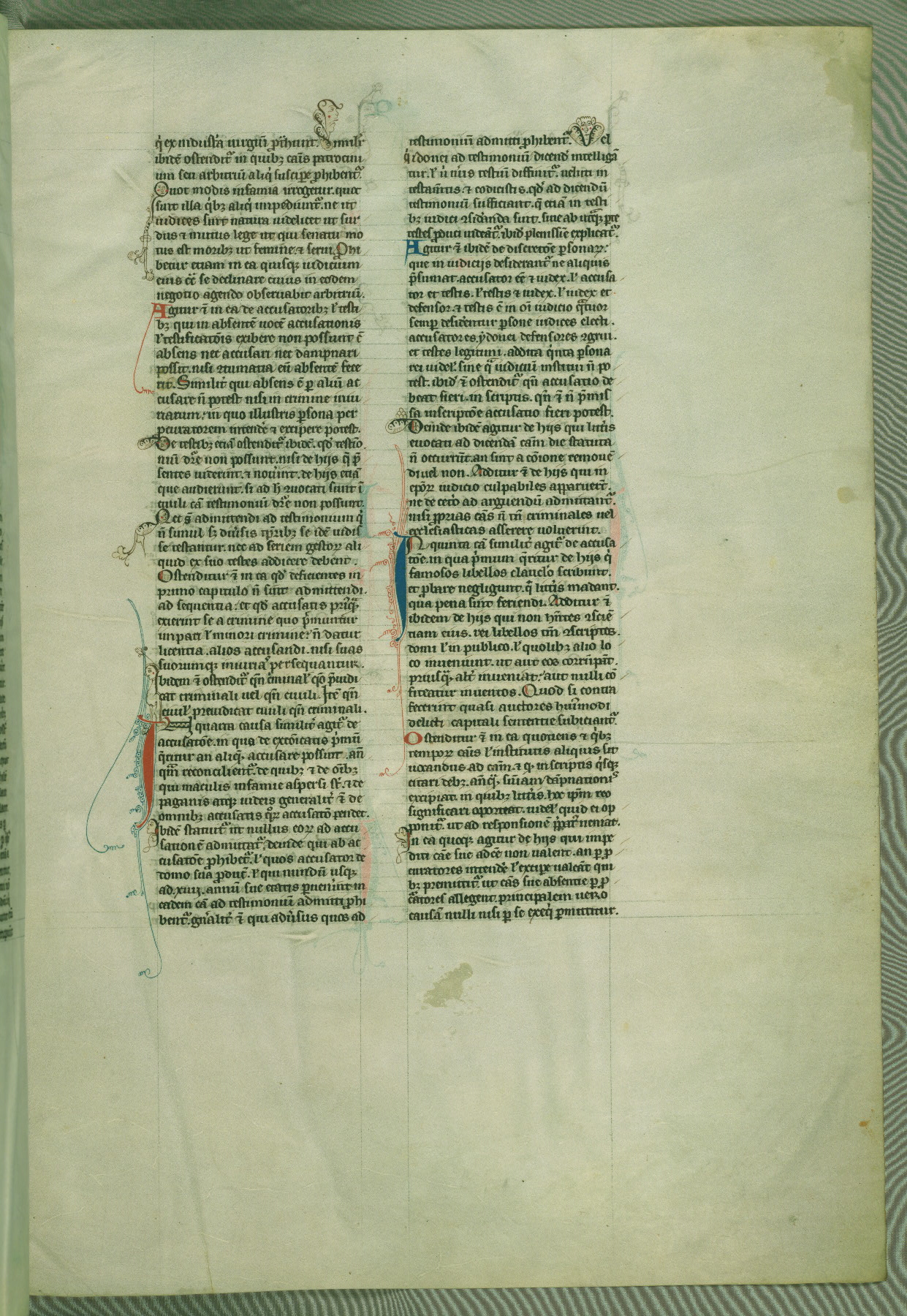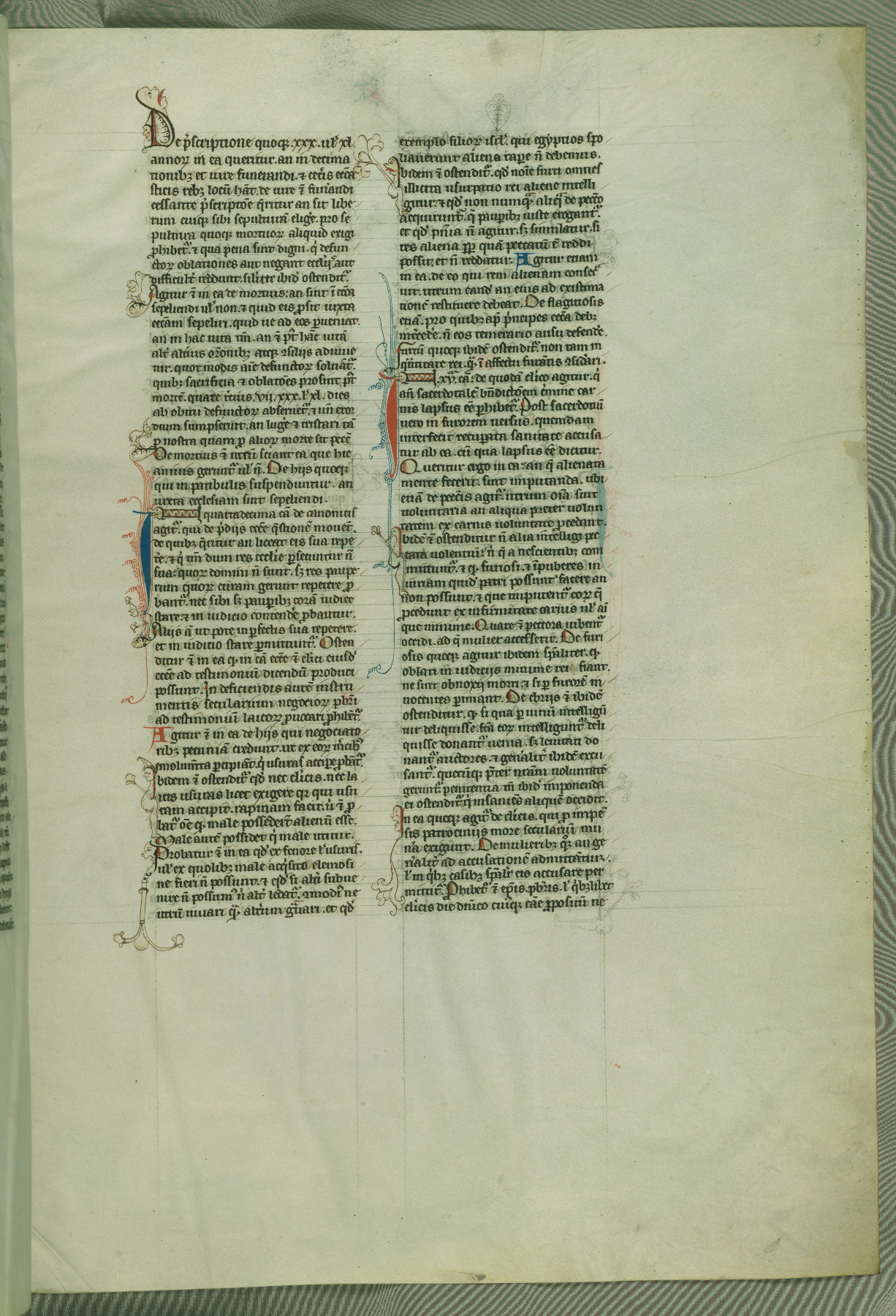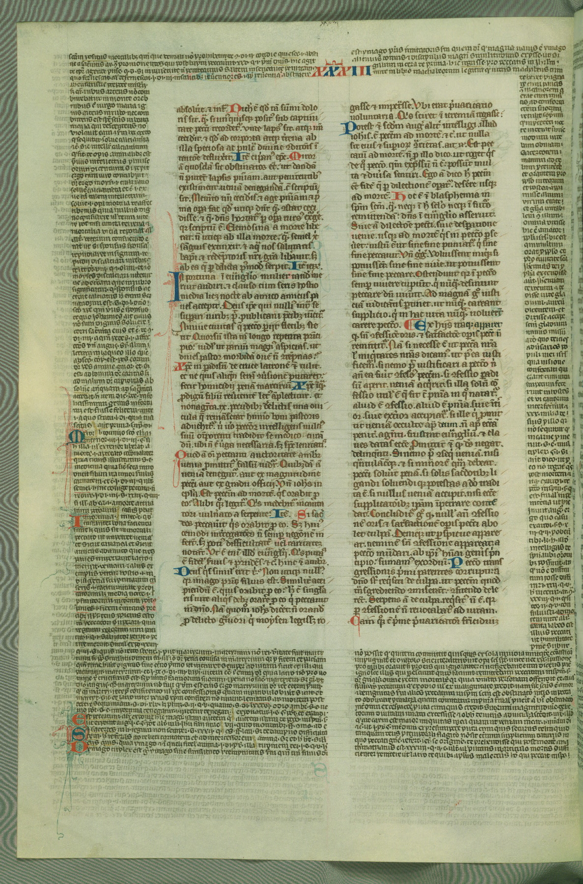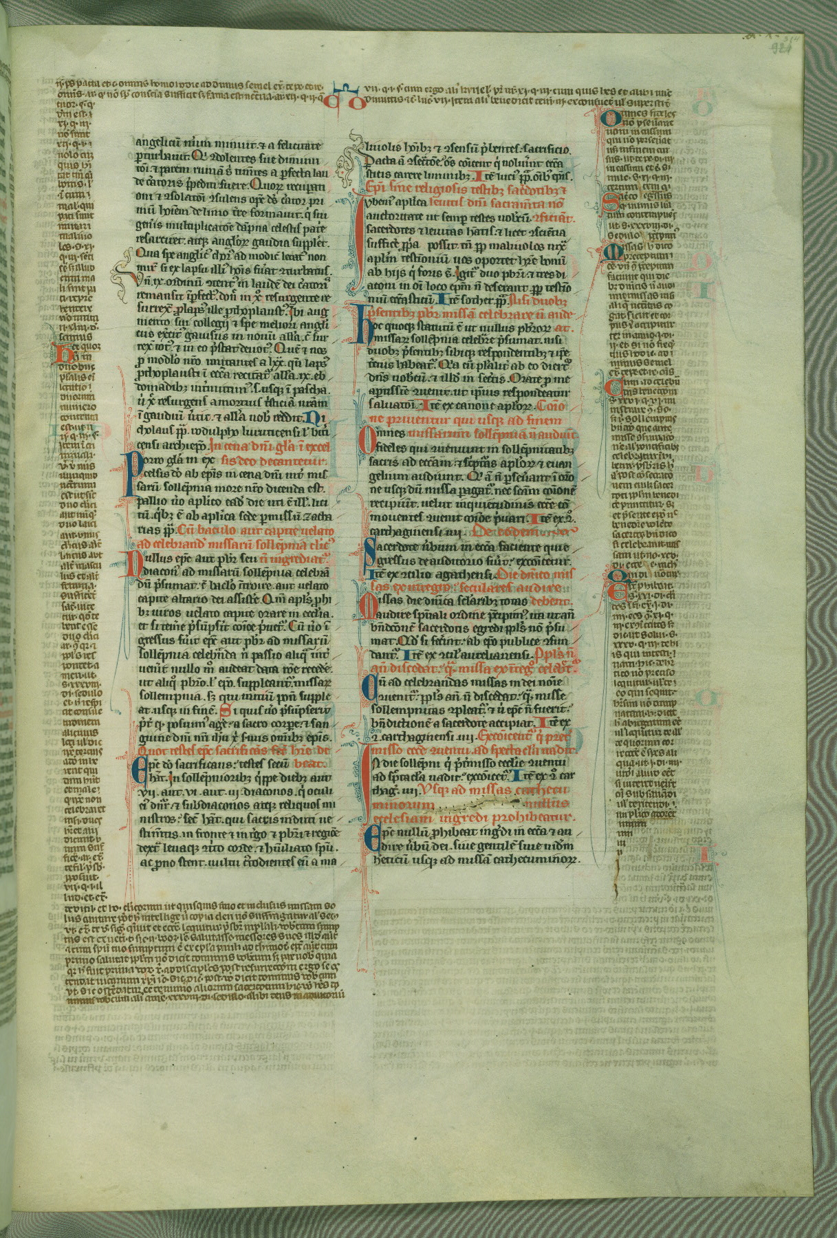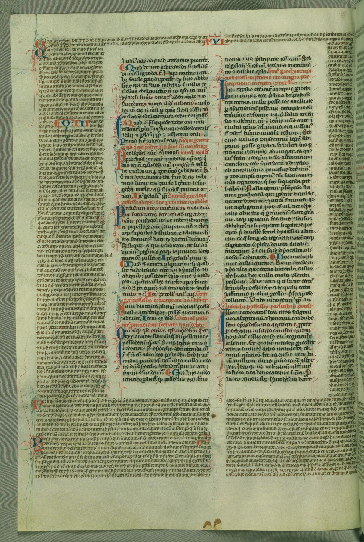 This deluxe version of Gratian's Decretum was created ca. 1280-90, most likely in Hainaut. The lively decoration of the manuscript indicates a marked taste for narrative, and there are thirty-seven historiated initials. The gloss work was completed by Bartholomew of Brescia. At first, Paris would seem to be the most likely place of origin, given that it was the leading center for the study of canon law. However, this particular manuscript exhibits scribal features that suggest its place of origin as being the Cistercian abbey of Cambron in Hainaut. Furthermore, Abbot Baudouin de Bousso, whose tenure at the abbey was from 1283 to 1293, was schooled in theology at the University of Paris, and he would eventually endorse the production of many fine manuscripts while at Cambron. In fact, the catalyst for this endeavor seems to have been the Beaupré Antiphonary (W.759-761), which was was created at Cambron during the 1280s. Stylistic features of W.133 seem to have connections with the Beaupré Antiphonary. For example, Cistercian monks are shown in three extant illuminations throughout three of the antiphonary volumes; these monks are pictured in brown habits similar to the type worn by clerics in W.133. The reliance upon Cistercian precedents for textual and design features associates W.133 with the Cistercian abbey at Cambron. However, more remains to be confirmed by further inspection of the output of the scriptorium at Cambron.