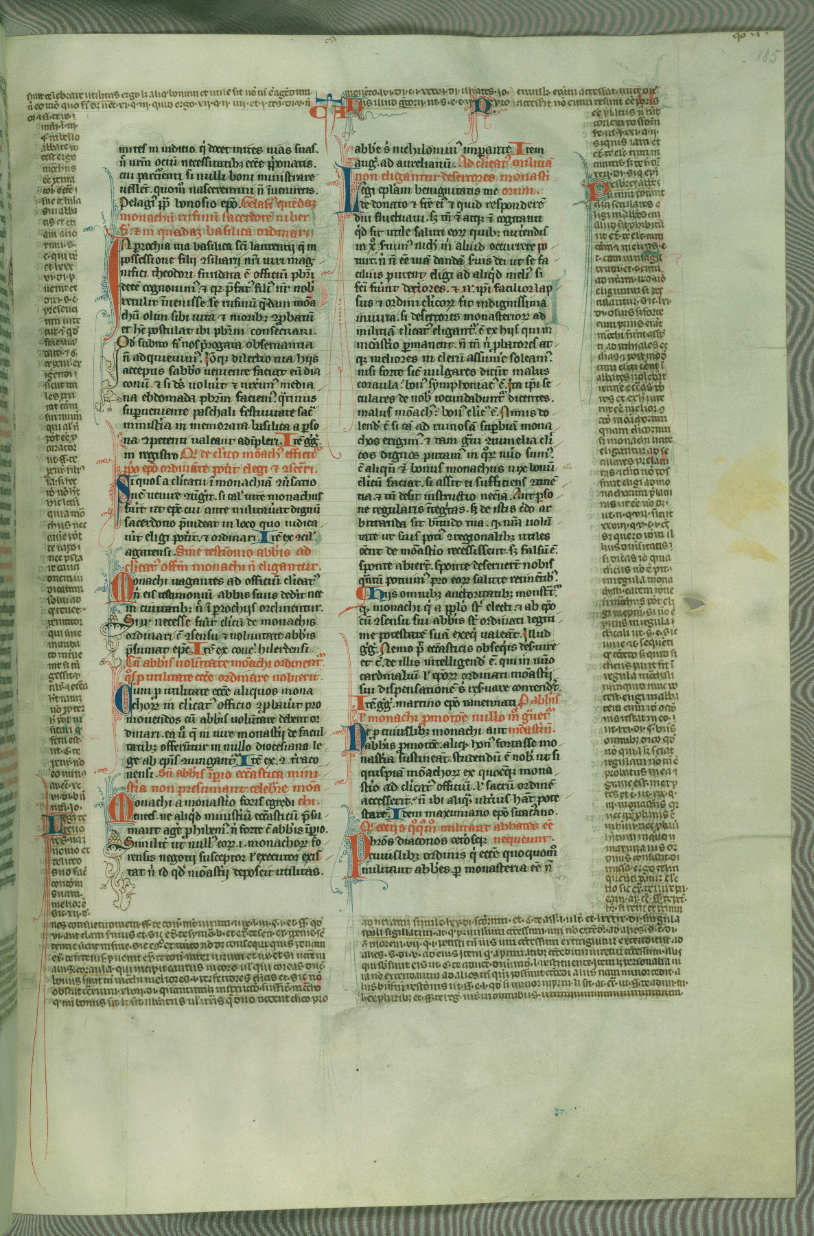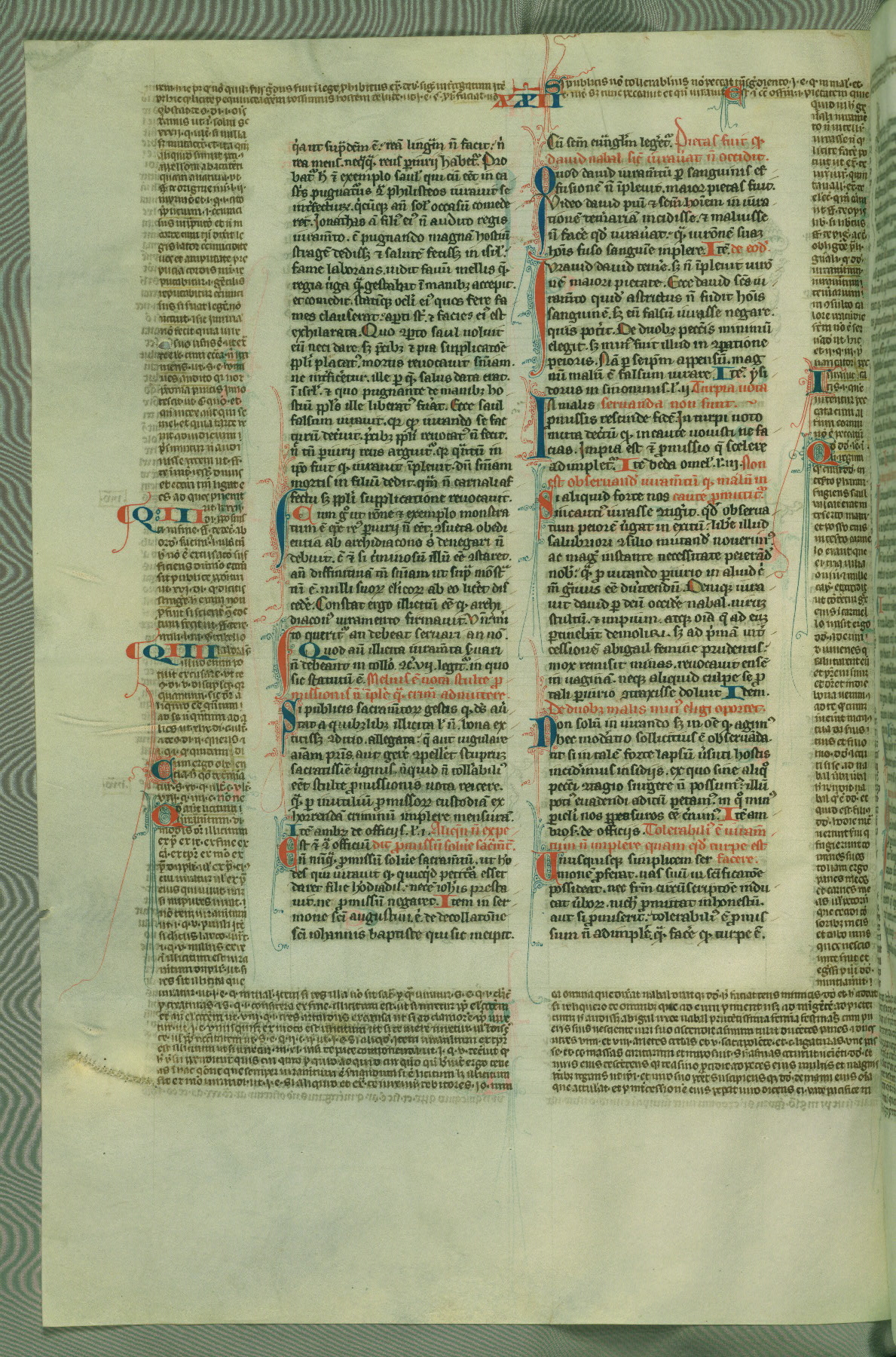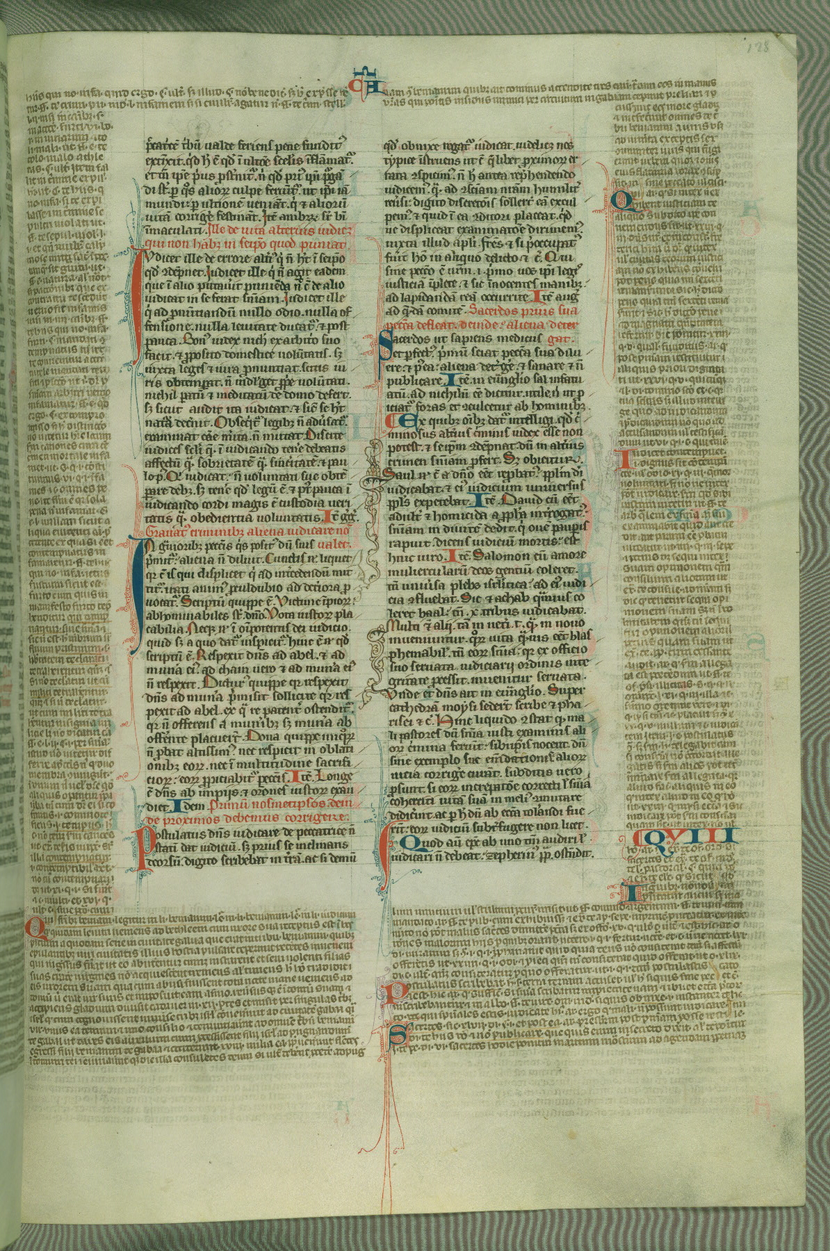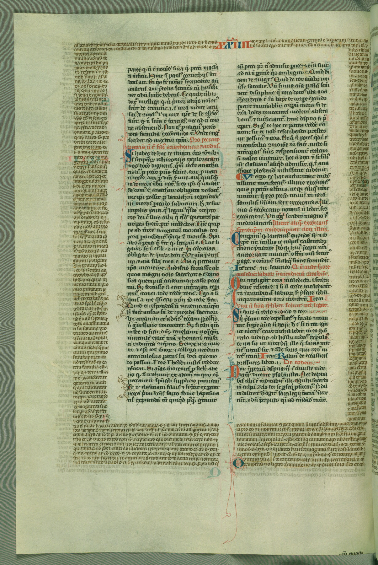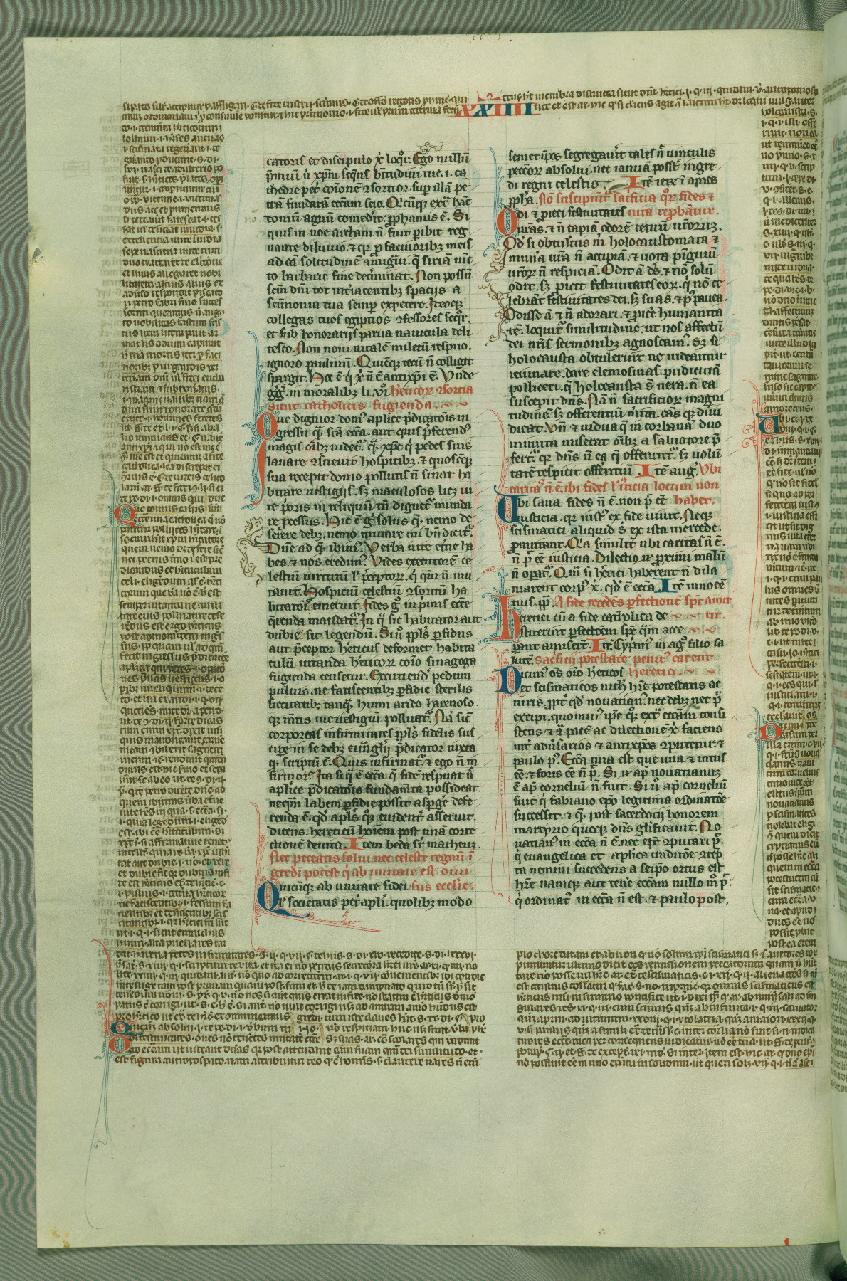 This deluxe version of Gratian's Decretum was created ca. 1280-90, most likely in Hainaut. The lively decoration of the manuscript indicates a marked taste for narrative, and there are thirty-seven historiated initials. The gloss work was completed by Bartholomew of Brescia. At first, Paris would seem to be the most likely place of origin, given that it was the leading center for the study of canon law. However, this particular manuscript exhibits scribal features that suggest its place of origin as being the Cistercian abbey of Cambron in Hainaut. Furthermore, Abbot Baudouin de Bousso, whose tenure at the abbey was from 1283 to 1293, was schooled in theology at the University of Paris, and he would eventually endorse the production of many fine manuscripts while at Cambron. In fact, the catalyst for this endeavor seems to have been the Beaupré Antiphonary (W.759-761), which was was created at Cambron during the 1280s. Stylistic features of W.133 seem to have connections with the Beaupré Antiphonary. For example, Cistercian monks are shown in three extant illuminations throughout three of the antiphonary volumes; these monks are pictured in brown habits similar to the type worn by clerics in W.133. The reliance upon Cistercian precedents for textual and design features associates W.133 with the Cistercian abbey at Cambron. However, more remains to be confirmed by further inspection of the output of the scriptorium at Cambron.