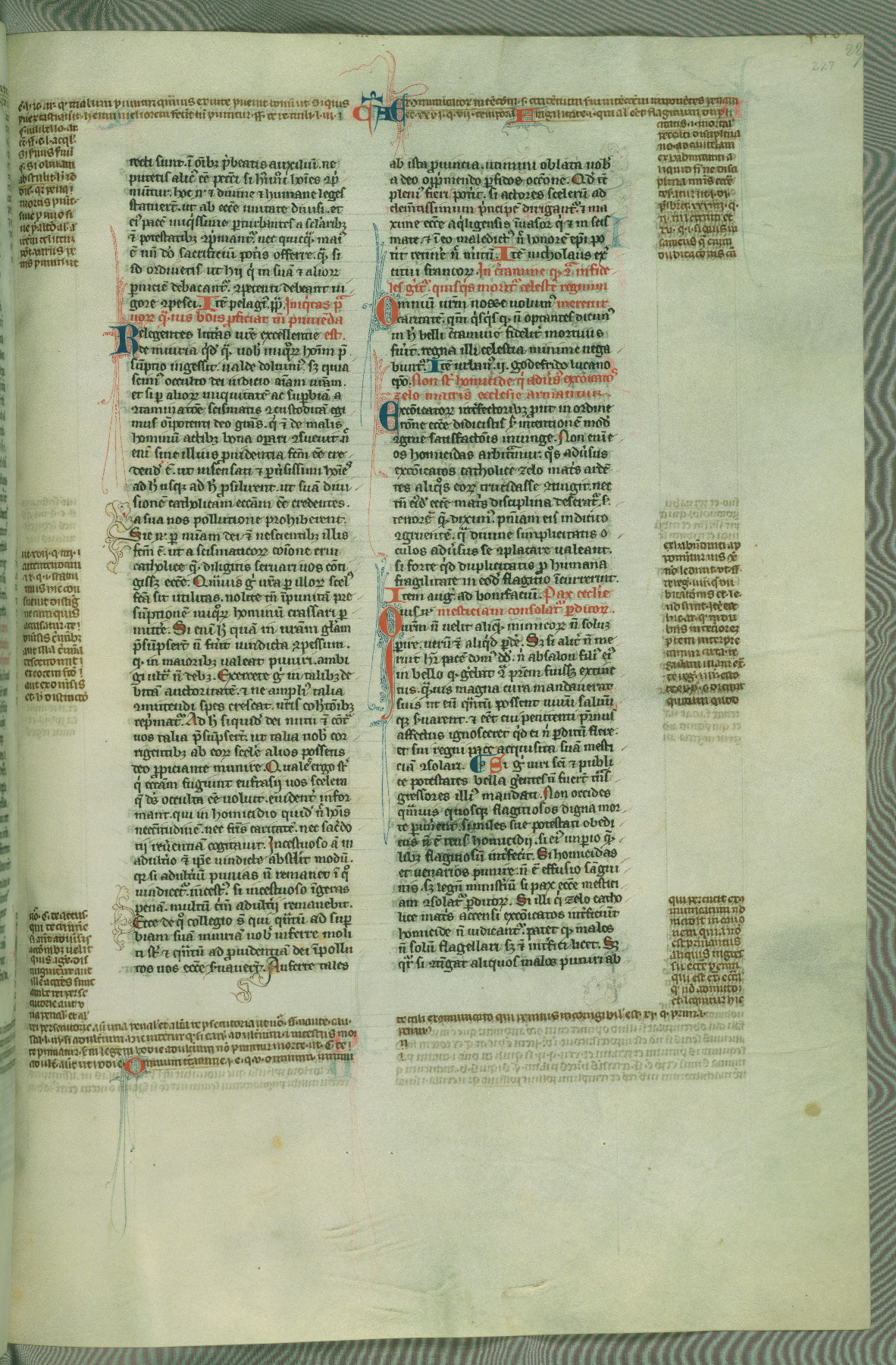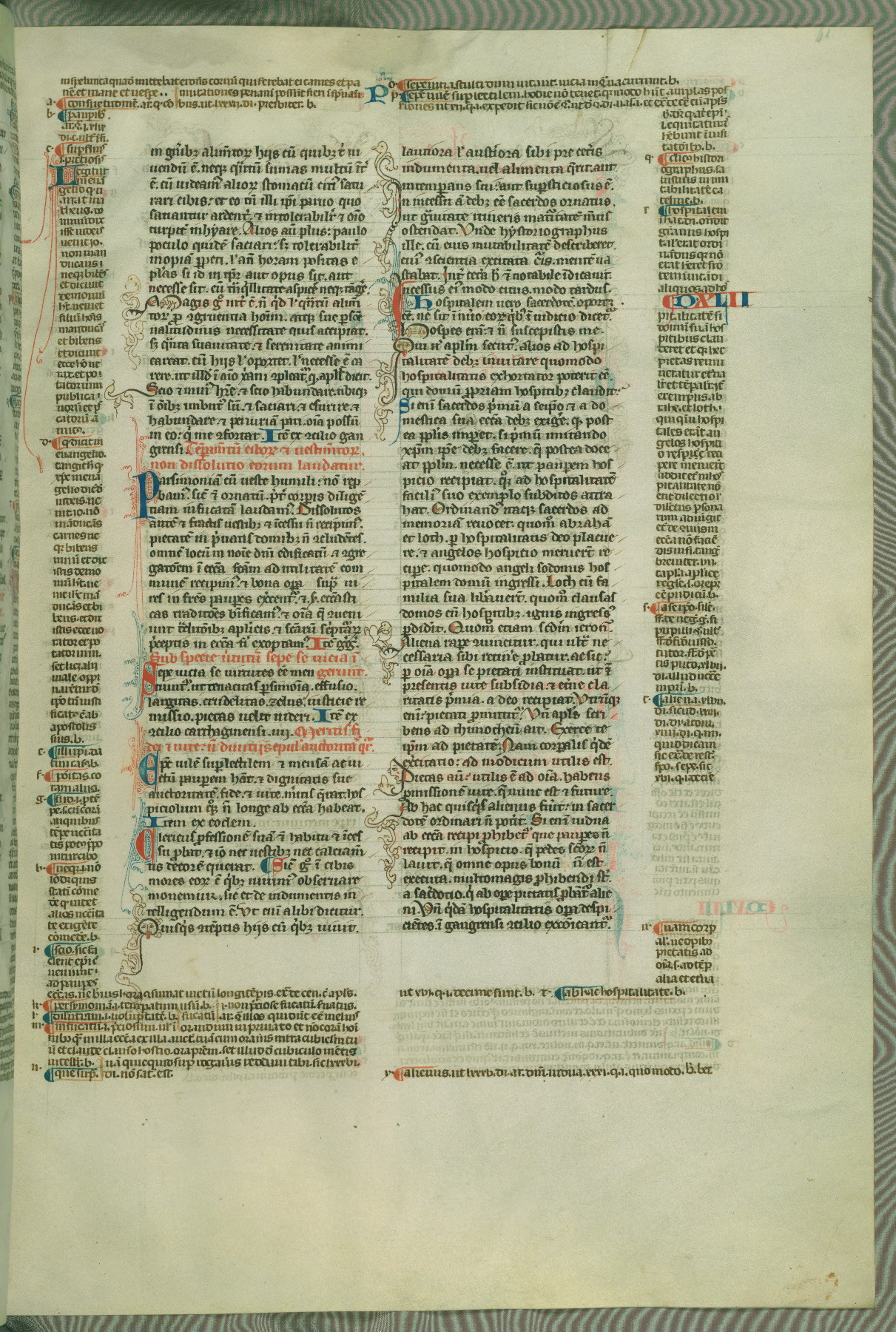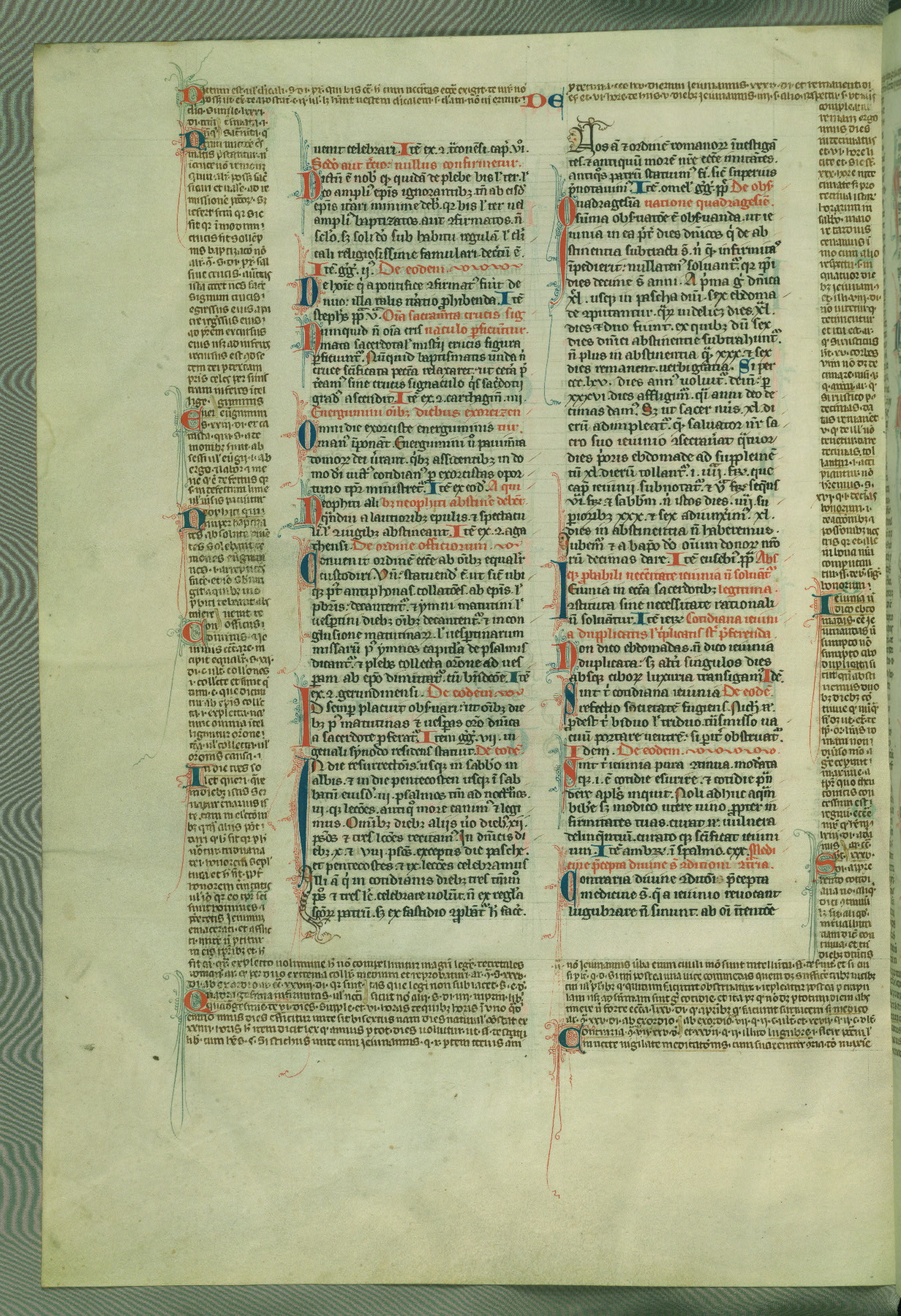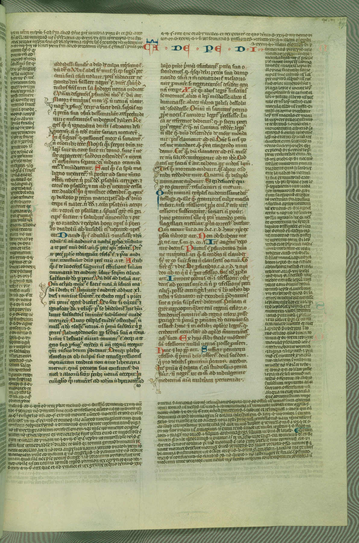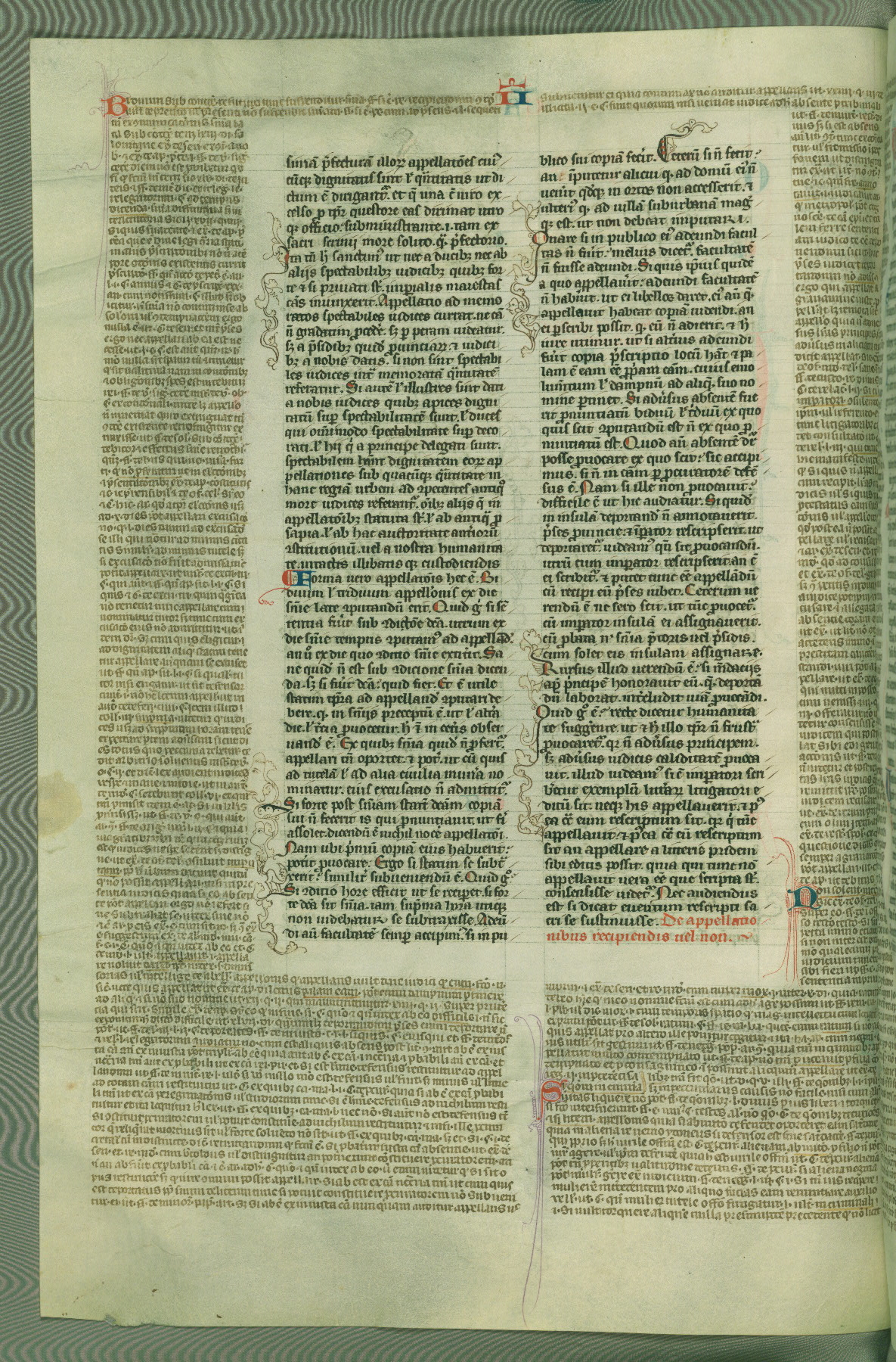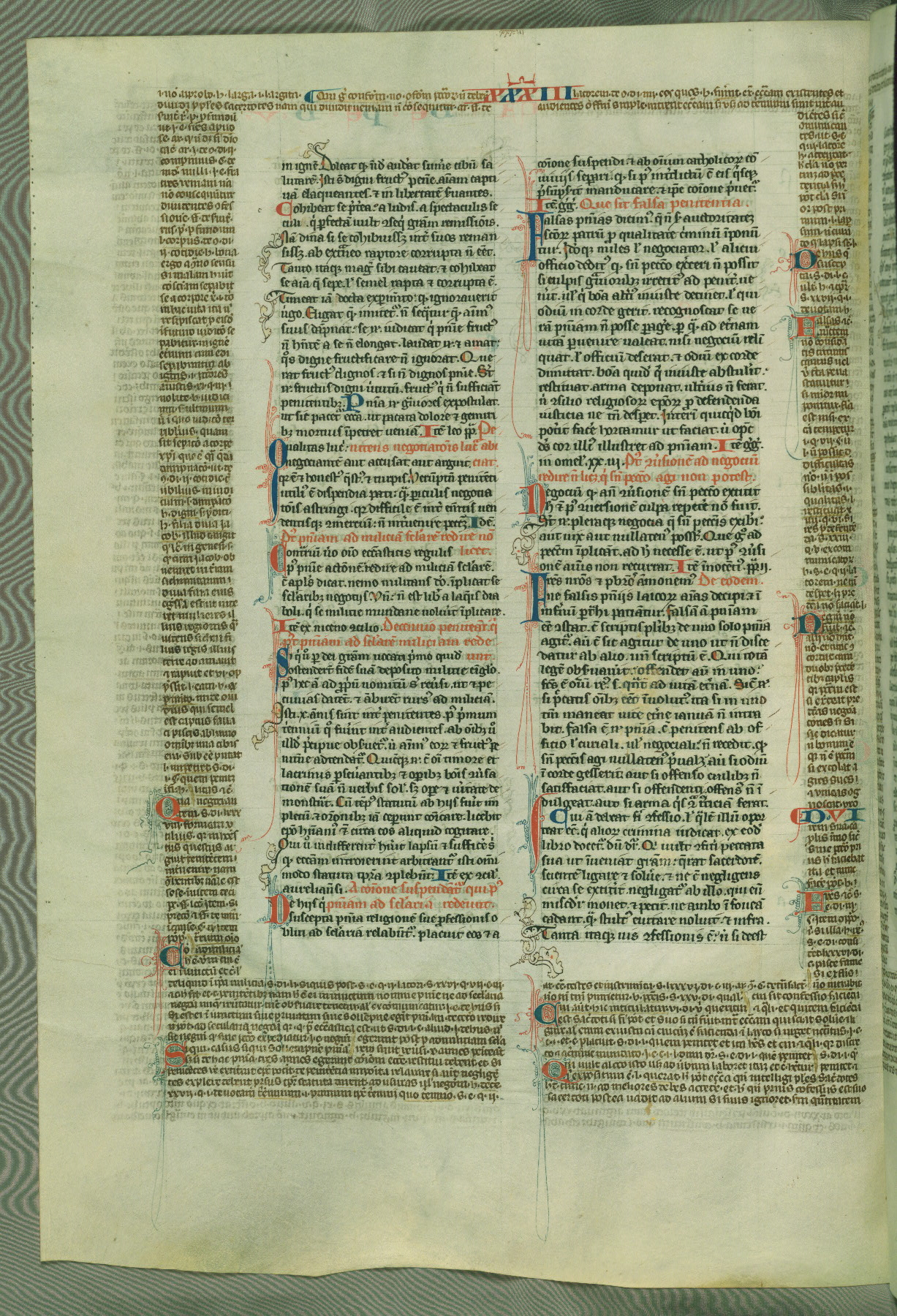 This deluxe version of Gratian's Decretum was created ca. 1280-90, most likely in Hainaut. The lively decoration of the manuscript indicates a marked taste for narrative, and there are thirty-seven historiated initials. The gloss work was completed by Bartholomew of Brescia. At first, Paris would seem to be the most likely place of origin, given that it was the leading center for the study of canon law. However, this particular manuscript exhibits scribal features that suggest its place of origin as being the Cistercian abbey of Cambron in Hainaut. Furthermore, Abbot Baudouin de Bousso, whose tenure at the abbey was from 1283 to 1293, was schooled in theology at the University of Paris, and he would eventually endorse the production of many fine manuscripts while at Cambron. In fact, the catalyst for this endeavor seems to have been the Beaupré Antiphonary (W.759-761), which was was created at Cambron during the 1280s. Stylistic features of W.133 seem to have connections with the Beaupré Antiphonary. For example, Cistercian monks are shown in three extant illuminations throughout three of the antiphonary volumes; these monks are pictured in brown habits similar to the type worn by clerics in W.133. The reliance upon Cistercian precedents for textual and design features associates W.133 with the Cistercian abbey at Cambron. However, more remains to be confirmed by further inspection of the output of the scriptorium at Cambron.