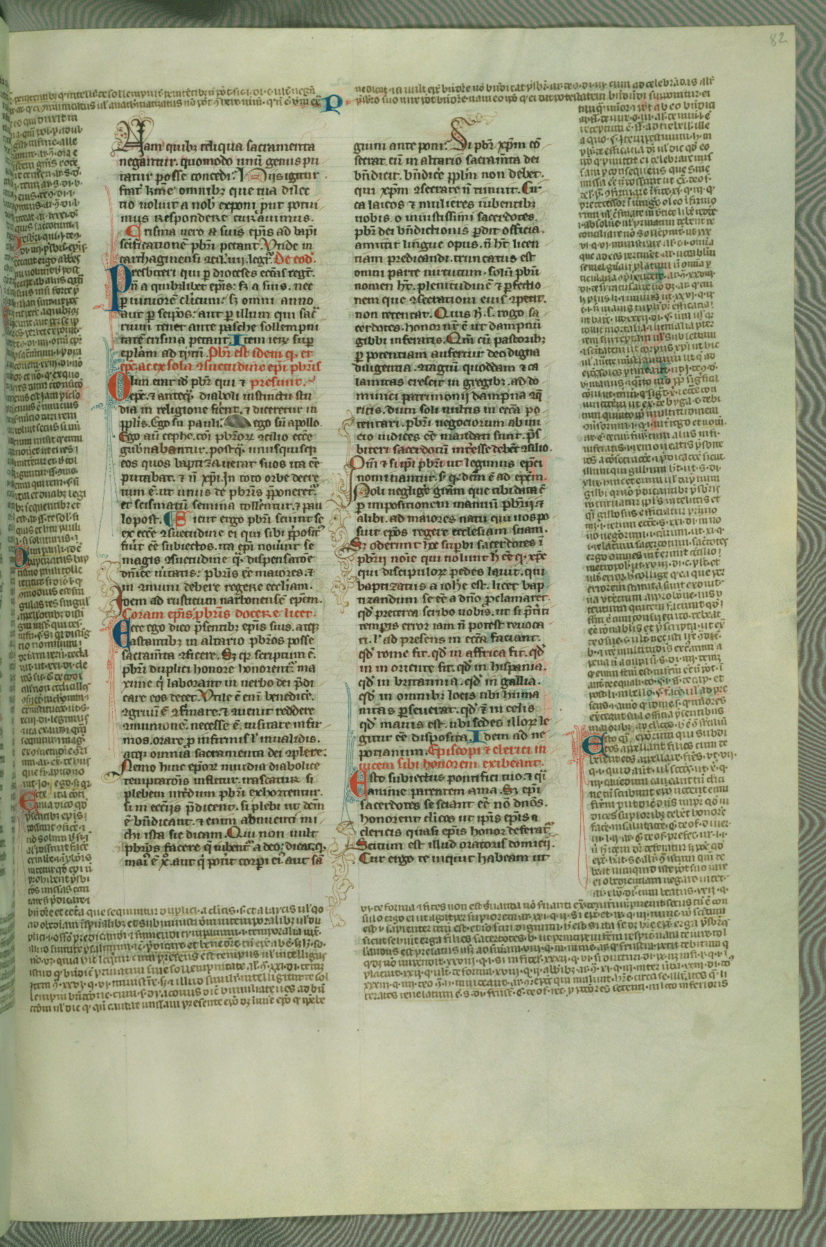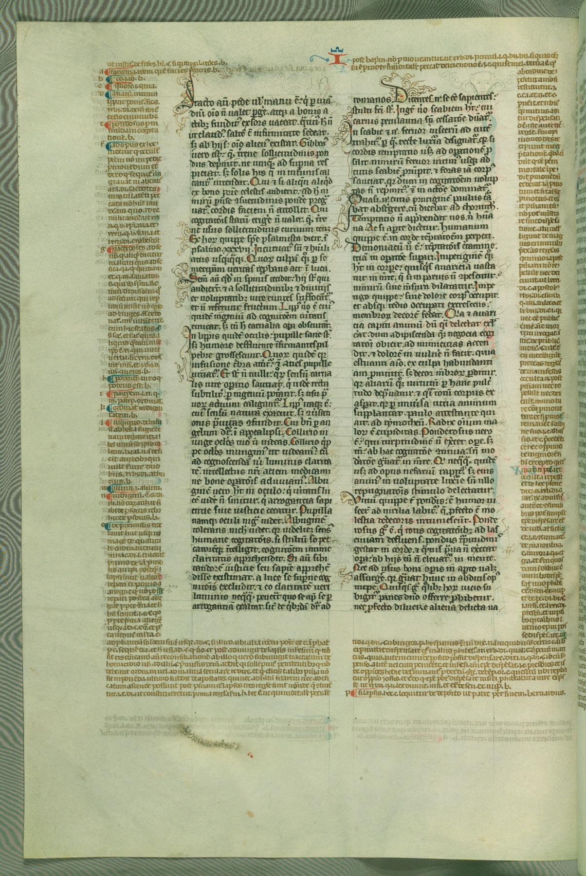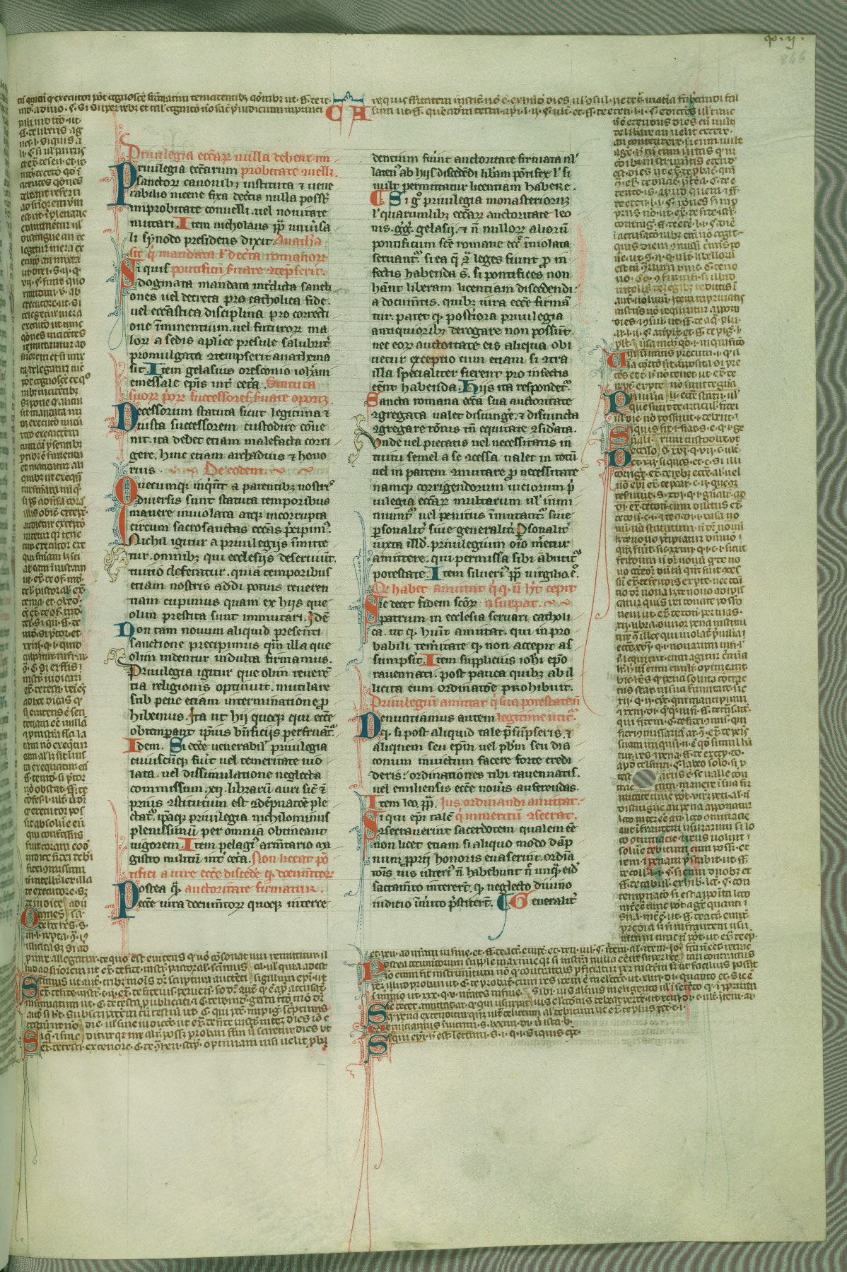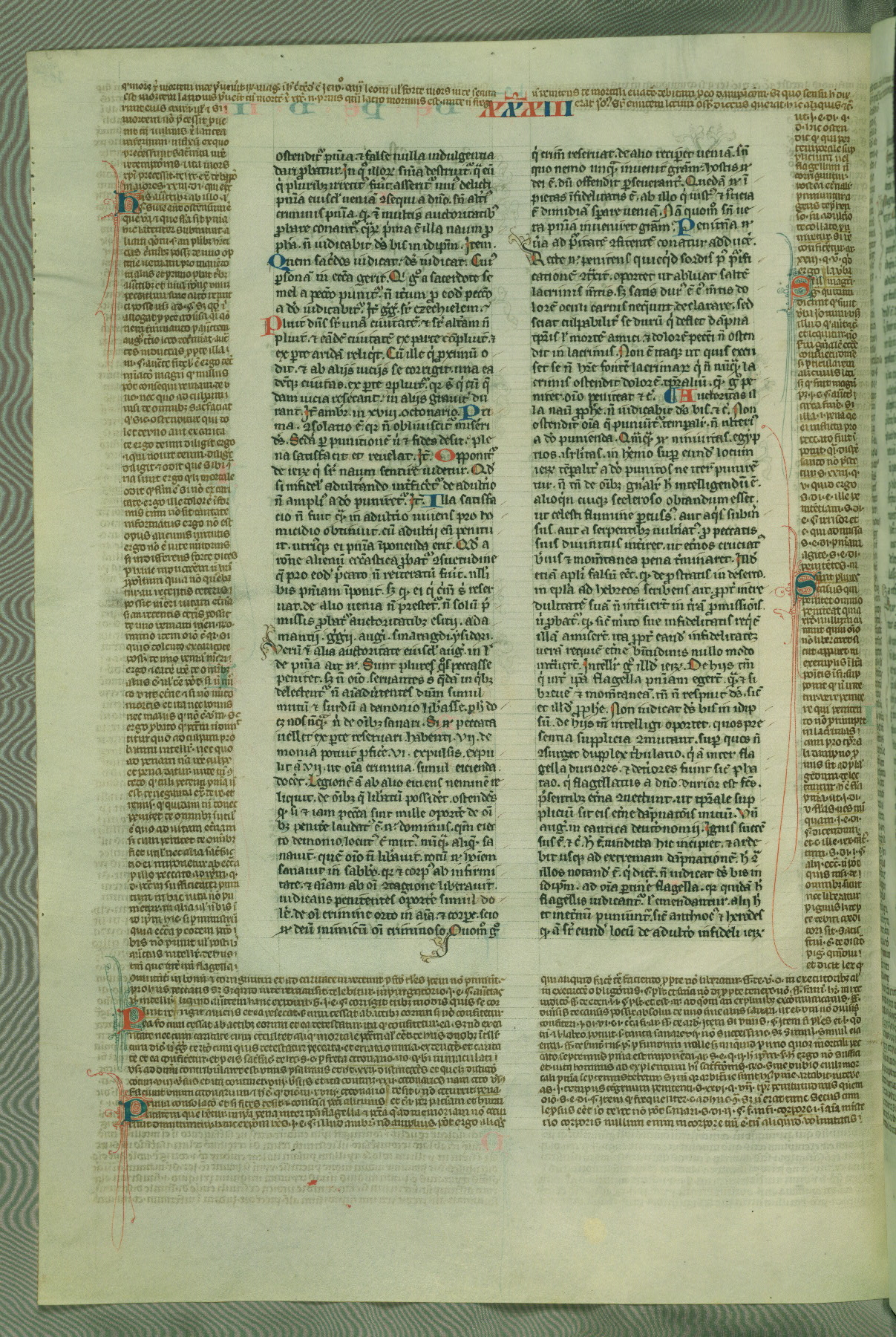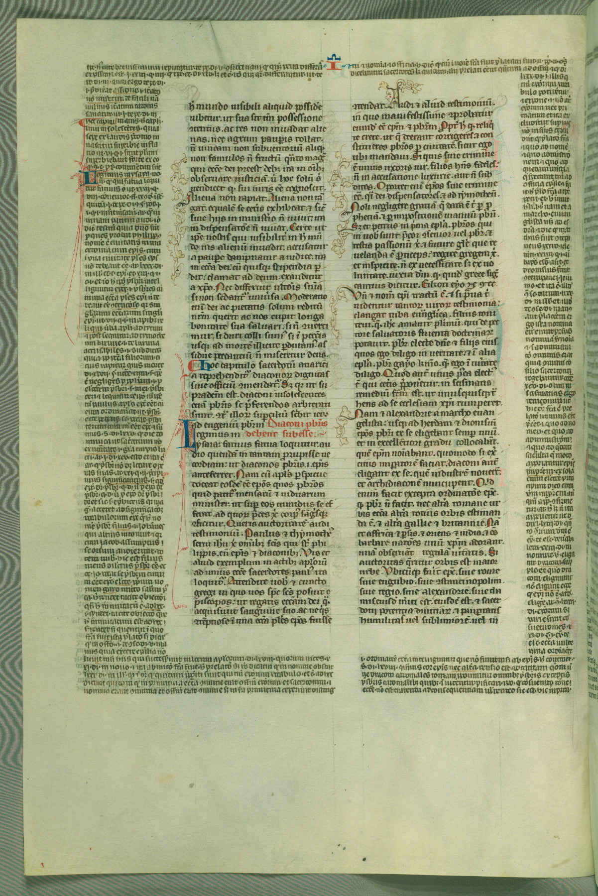This deluxe version of Gratian's Decretum was created ca. 1280-90, most likely in Hainaut. The lively decoration of the manuscript indicates a marked taste for narrative, and there are thirty-seven historiated initials. The gloss work was completed by Bartholomew of Brescia. At first, Paris would seem to be the most likely place of origin, given that it was the leading center for the study of canon law. However, this particular manuscript exhibits scribal features that suggest its place of origin as being the Cistercian abbey of Cambron in Hainaut. Furthermore, Abbot Baudouin de Bousso, whose tenure at the abbey was from 1283 to 1293, was schooled in theology at the University of Paris, and he would eventually endorse the production of many fine manuscripts while at Cambron. In fact, the catalyst for this endeavor seems to have been the Beaupré Antiphonary (W.759-761), which was was created at Cambron during the 1280s. Stylistic features of W.133 seem to have connections with the Beaupré Antiphonary. For example, Cistercian monks are shown in three extant illuminations throughout three of the antiphonary volumes; these monks are pictured in brown habits similar to the type worn by clerics in W.133. The reliance upon Cistercian precedents for textual and design features associates W.133 with the Cistercian abbey at Cambron. However, more remains to be confirmed by further inspection of the output of the scriptorium at Cambron.