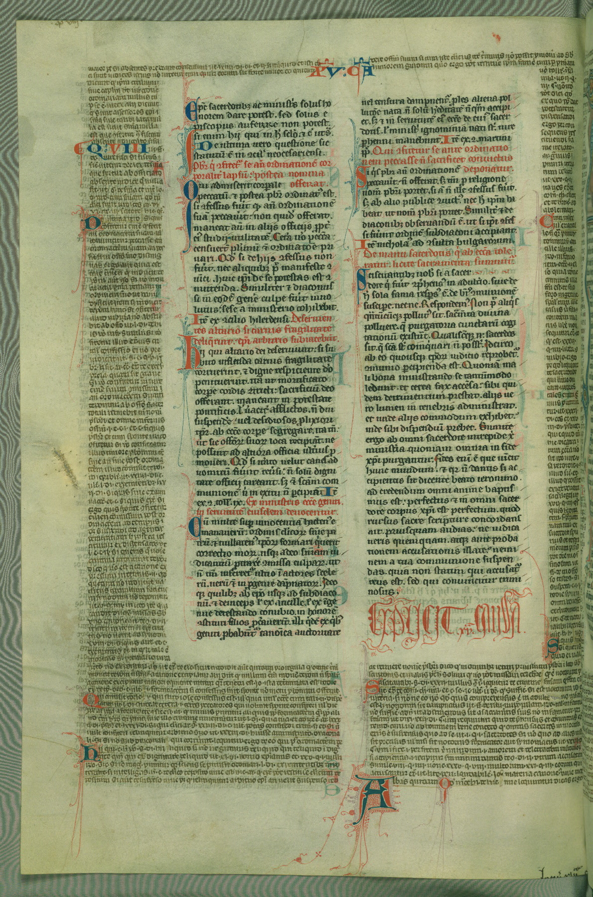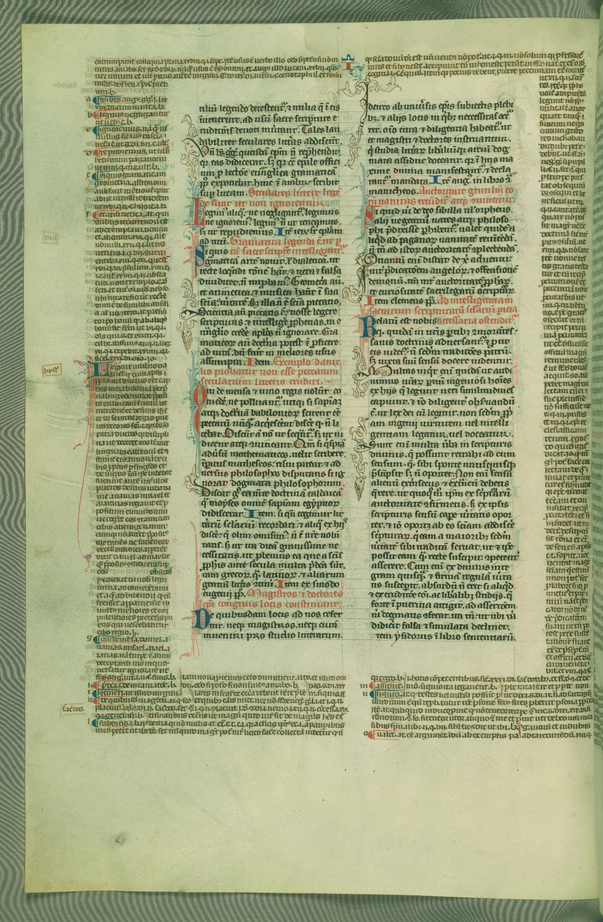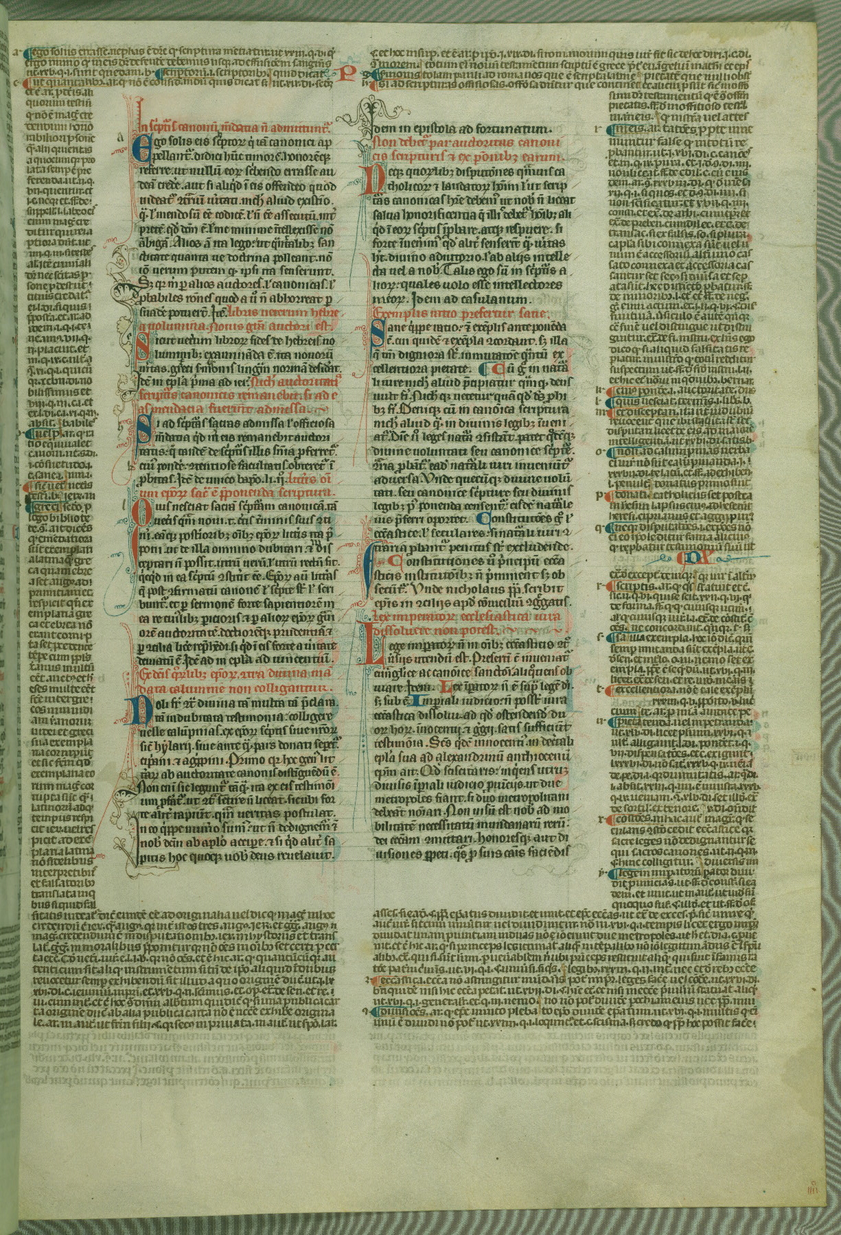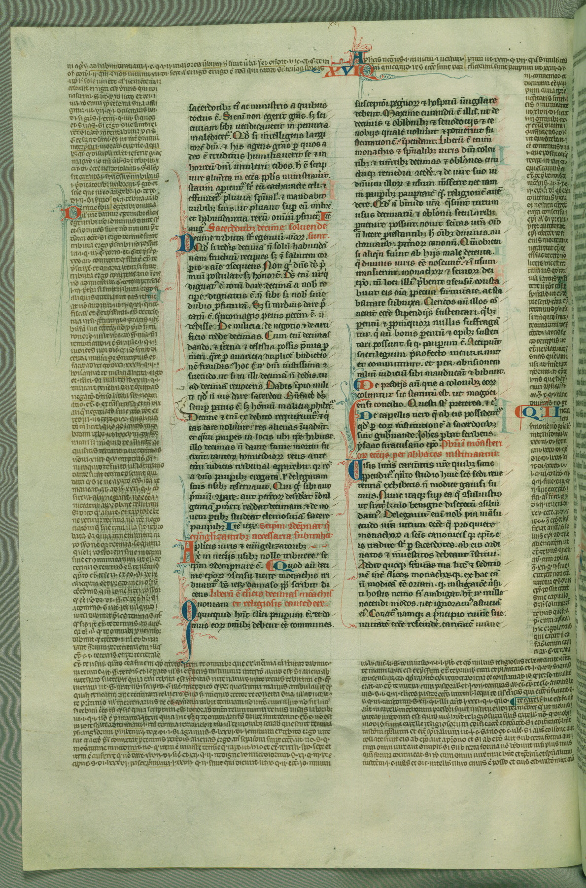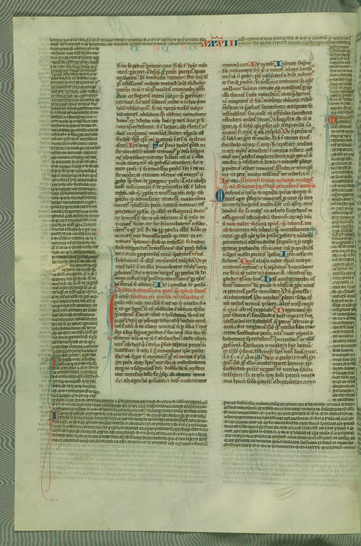 This deluxe version of Gratian's Decretum was created ca. 1280-90, most likely in Hainaut. The lively decoration of the manuscript indicates a marked taste for narrative, and there are thirty-seven historiated initials. The gloss work was completed by Bartholomew of Brescia. At first, Paris would seem to be the most likely place of origin, given that it was the leading center for the study of canon law. However, this particular manuscript exhibits scribal features that suggest its place of origin as being the Cistercian abbey of Cambron in Hainaut. Furthermore, Abbot Baudouin de Bousso, whose tenure at the abbey was from 1283 to 1293, was schooled in theology at the University of Paris, and he would eventually endorse the production of many fine manuscripts while at Cambron. In fact, the catalyst for this endeavor seems to have been the Beaupré Antiphonary (W.759-761), which was was created at Cambron during the 1280s. Stylistic features of W.133 seem to have connections with the Beaupré Antiphonary. For example, Cistercian monks are shown in three extant illuminations throughout three of the antiphonary volumes; these monks are pictured in brown habits similar to the type worn by clerics in W.133. The reliance upon Cistercian precedents for textual and design features associates W.133 with the Cistercian abbey at Cambron. However, more remains to be confirmed by further inspection of the output of the scriptorium at Cambron.