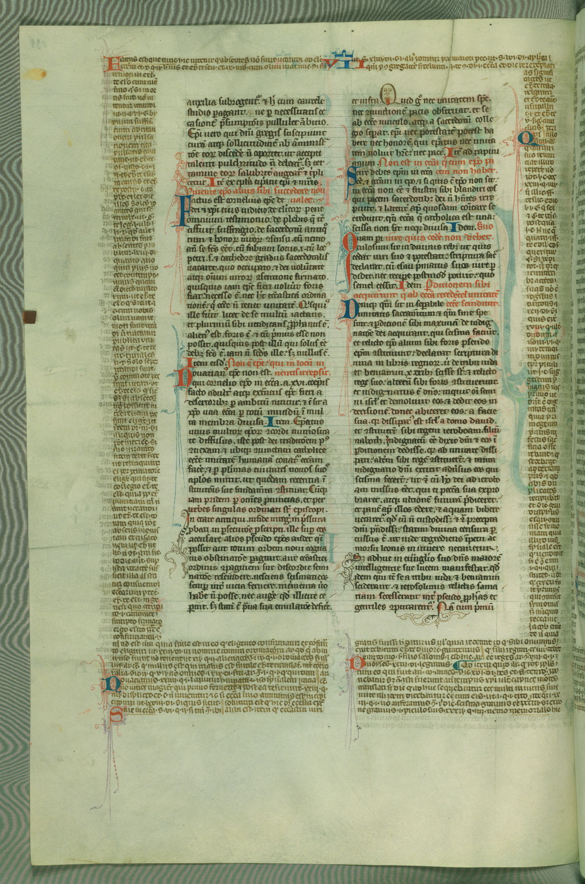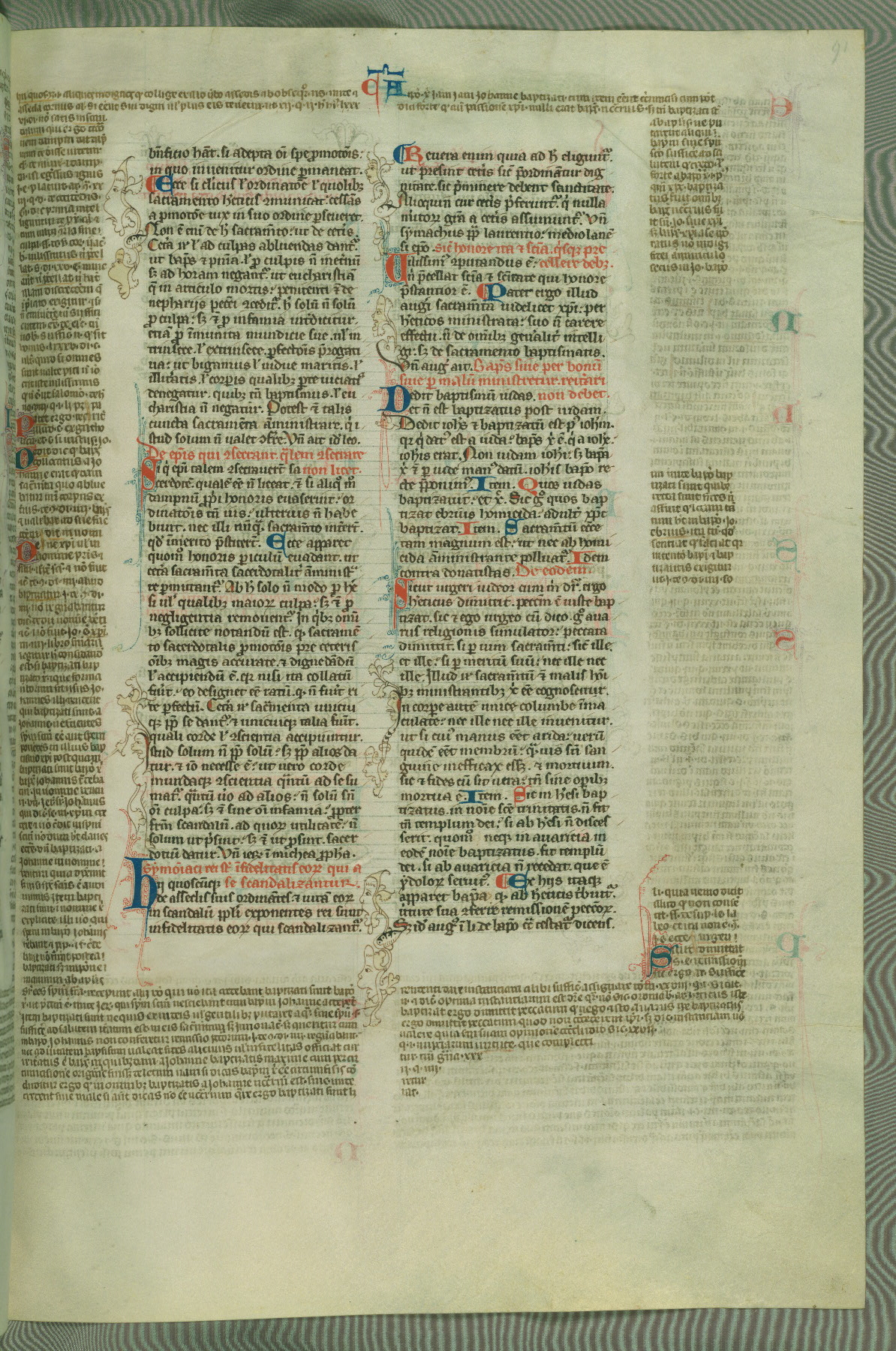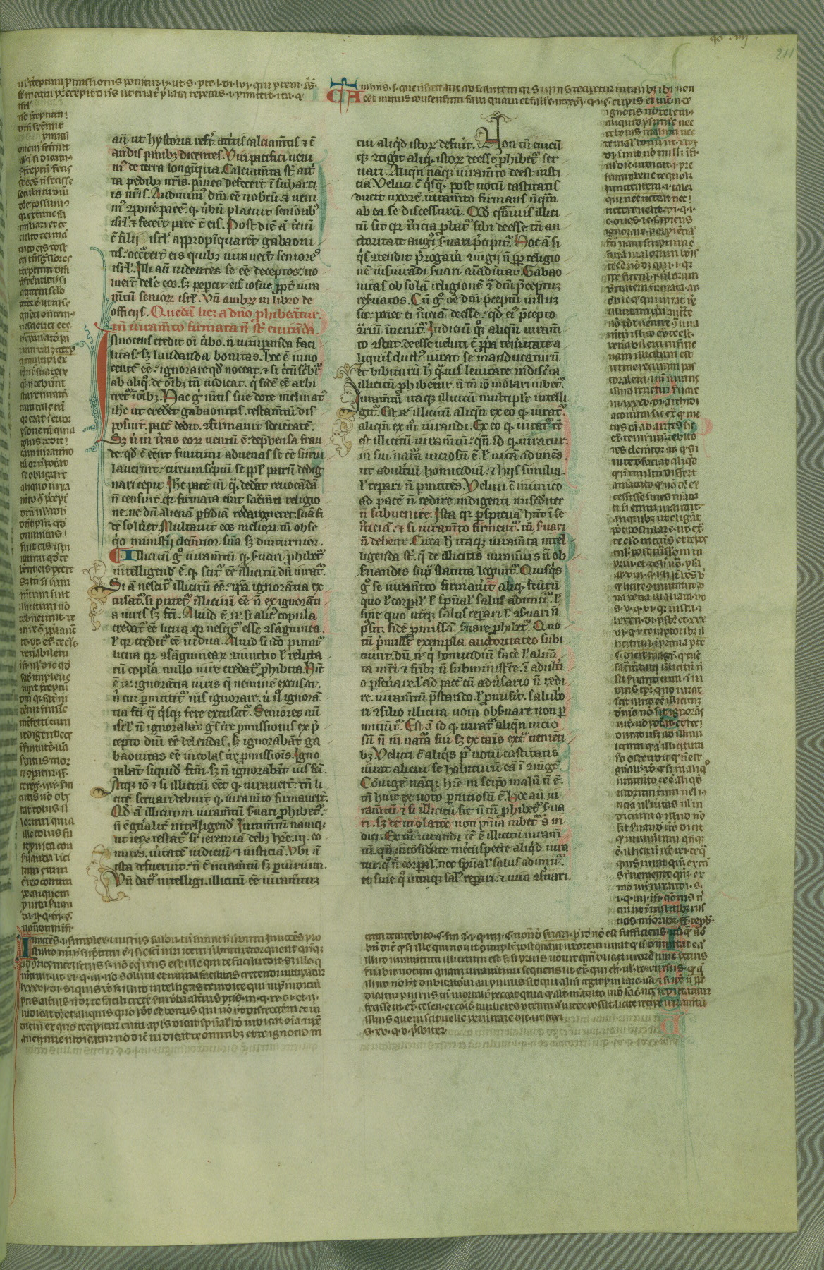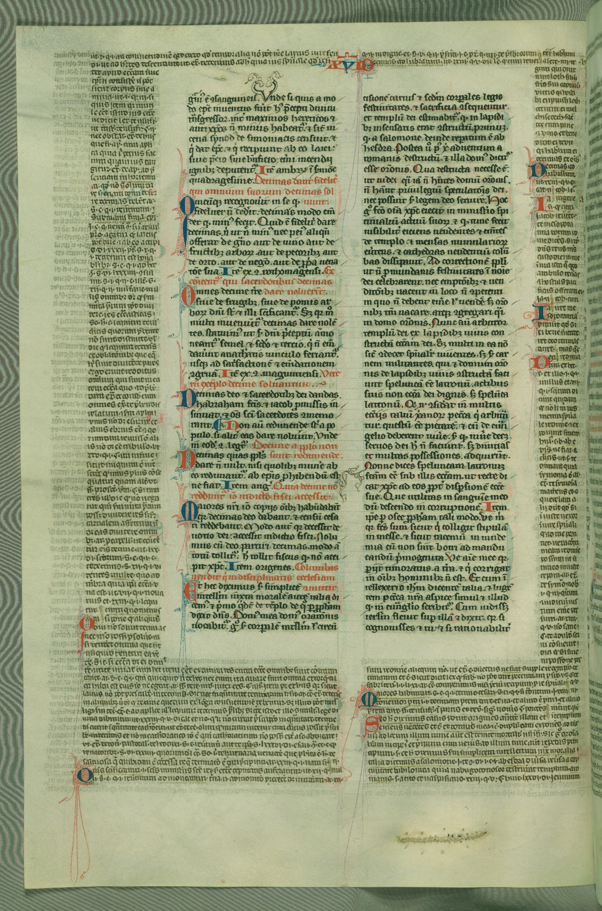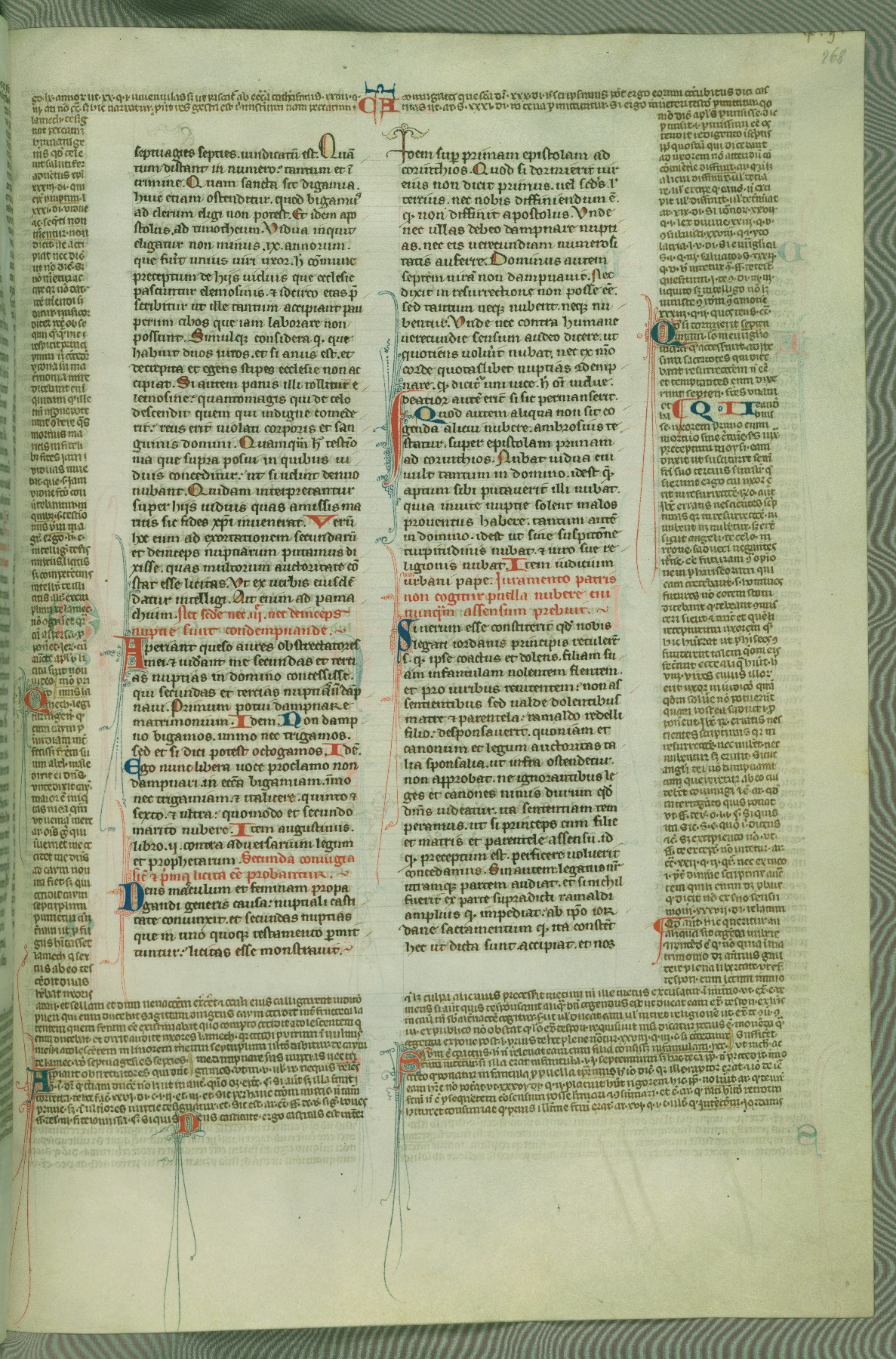 This deluxe version of Gratian's Decretum was created ca. 1280-90, most likely in Hainaut. The lively decoration of the manuscript indicates a marked taste for narrative, and there are thirty-seven historiated initials. The gloss work was completed by Bartholomew of Brescia. At first, Paris would seem to be the most likely place of origin, given that it was the leading center for the study of canon law. However, this particular manuscript exhibits scribal features that suggest its place of origin as being the Cistercian abbey of Cambron in Hainaut. Furthermore, Abbot Baudouin de Bousso, whose tenure at the abbey was from 1283 to 1293, was schooled in theology at the University of Paris, and he would eventually endorse the production of many fine manuscripts while at Cambron. In fact, the catalyst for this endeavor seems to have been the Beaupré Antiphonary (W.759-761), which was was created at Cambron during the 1280s. Stylistic features of W.133 seem to have connections with the Beaupré Antiphonary. For example, Cistercian monks are shown in three extant illuminations throughout three of the antiphonary volumes; these monks are pictured in brown habits similar to the type worn by clerics in W.133. The reliance upon Cistercian precedents for textual and design features associates W.133 with the Cistercian abbey at Cambron. However, more remains to be confirmed by further inspection of the output of the scriptorium at Cambron.
