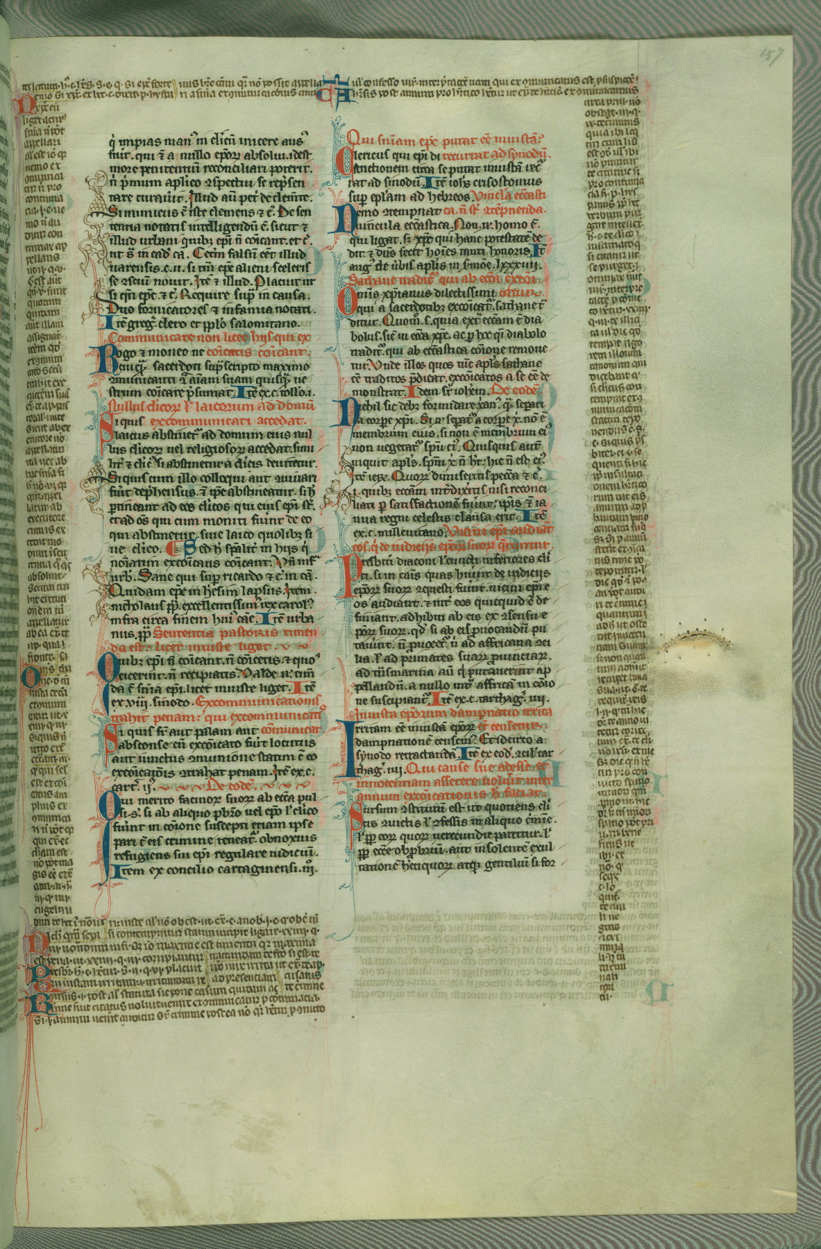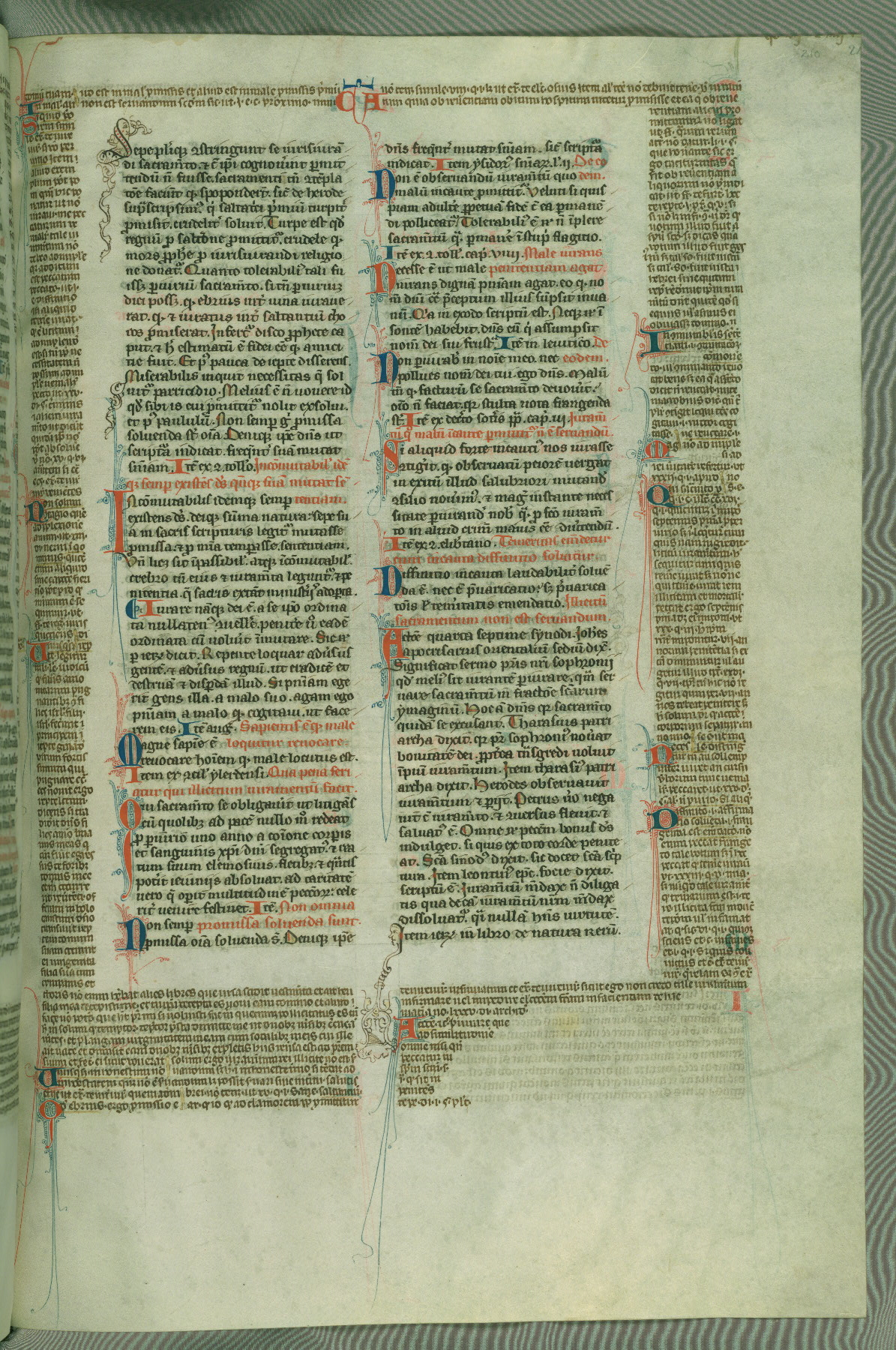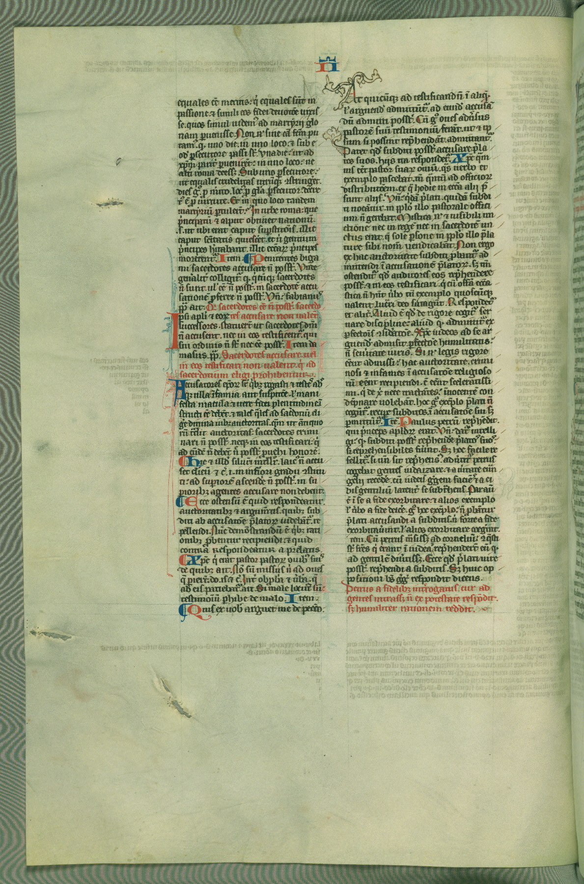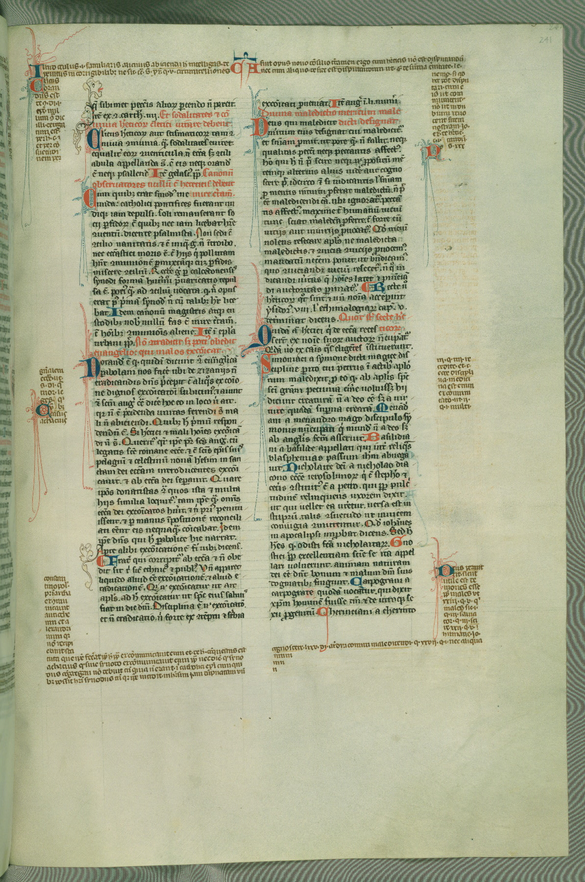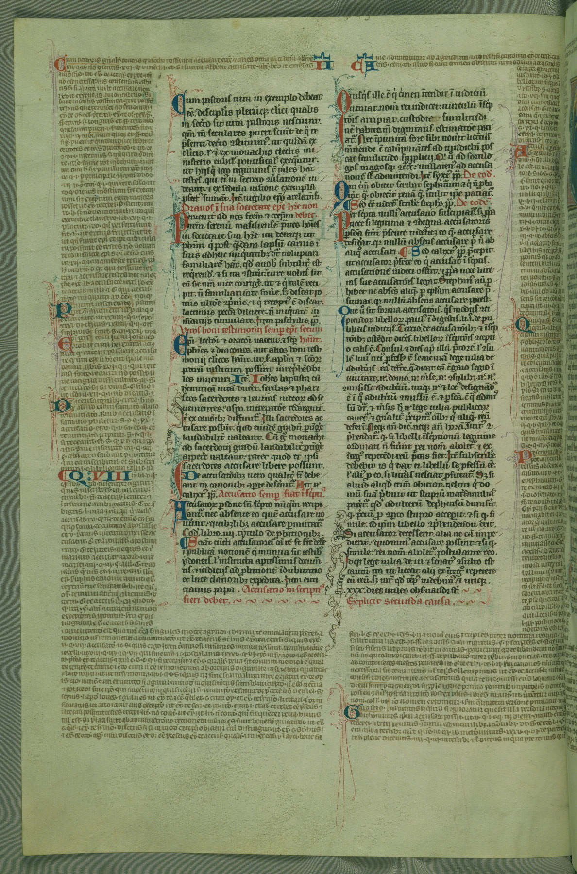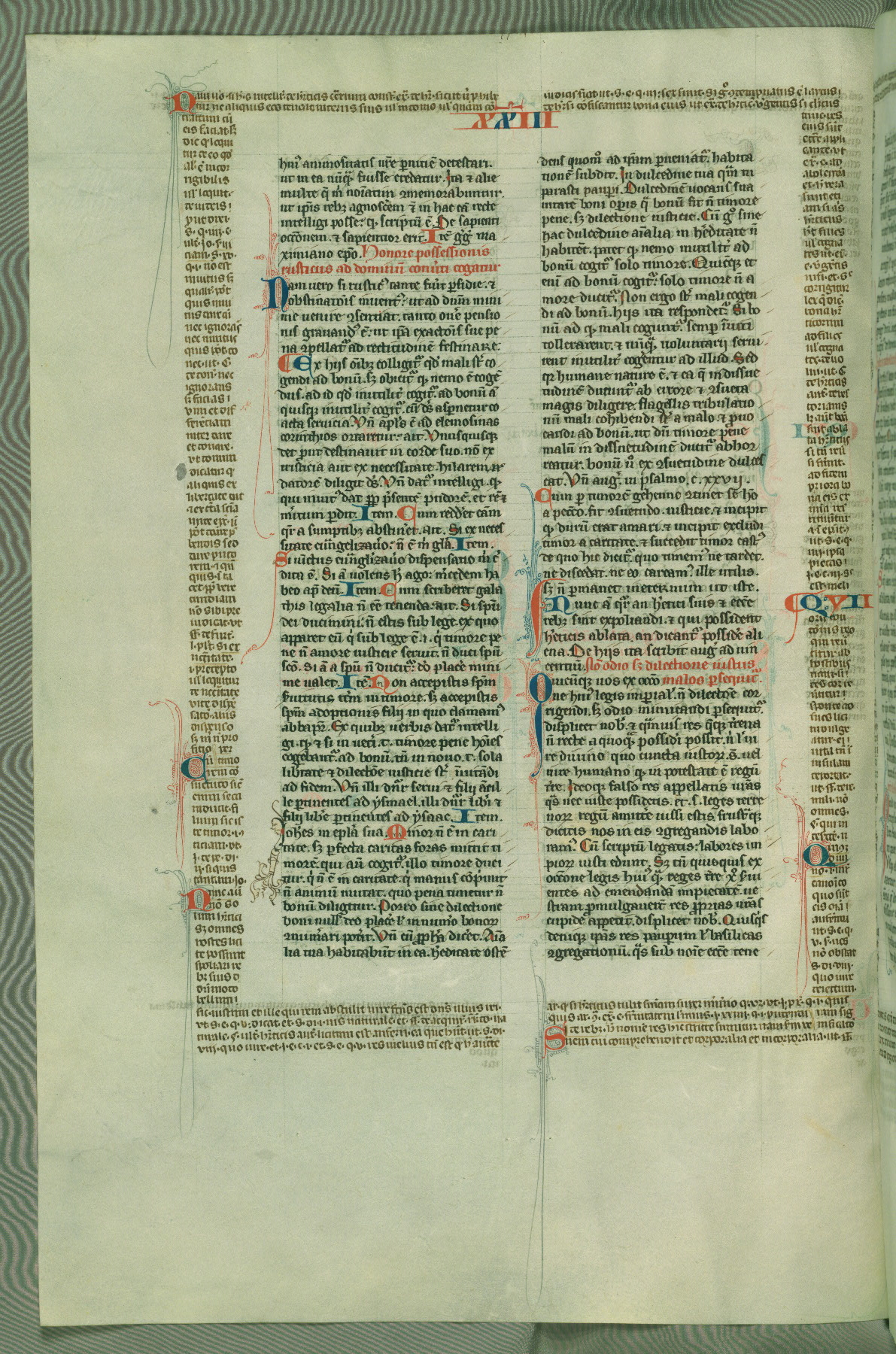 This deluxe version of Gratian's Decretum was created ca. 1280-90, most likely in Hainaut. The lively decoration of the manuscript indicates a marked taste for narrative, and there are thirty-seven historiated initials. The gloss work was completed by Bartholomew of Brescia. At first, Paris would seem to be the most likely place of origin, given that it was the leading center for the study of canon law. However, this particular manuscript exhibits scribal features that suggest its place of origin as being the Cistercian abbey of Cambron in Hainaut. Furthermore, Abbot Baudouin de Bousso, whose tenure at the abbey was from 1283 to 1293, was schooled in theology at the University of Paris, and he would eventually endorse the production of many fine manuscripts while at Cambron. In fact, the catalyst for this endeavor seems to have been the Beaupré Antiphonary (W.759-761), which was was created at Cambron during the 1280s. Stylistic features of W.133 seem to have connections with the Beaupré Antiphonary. For example, Cistercian monks are shown in three extant illuminations throughout three of the antiphonary volumes; these monks are pictured in brown habits similar to the type worn by clerics in W.133. The reliance upon Cistercian precedents for textual and design features associates W.133 with the Cistercian abbey at Cambron. However, more remains to be confirmed by further inspection of the output of the scriptorium at Cambron.