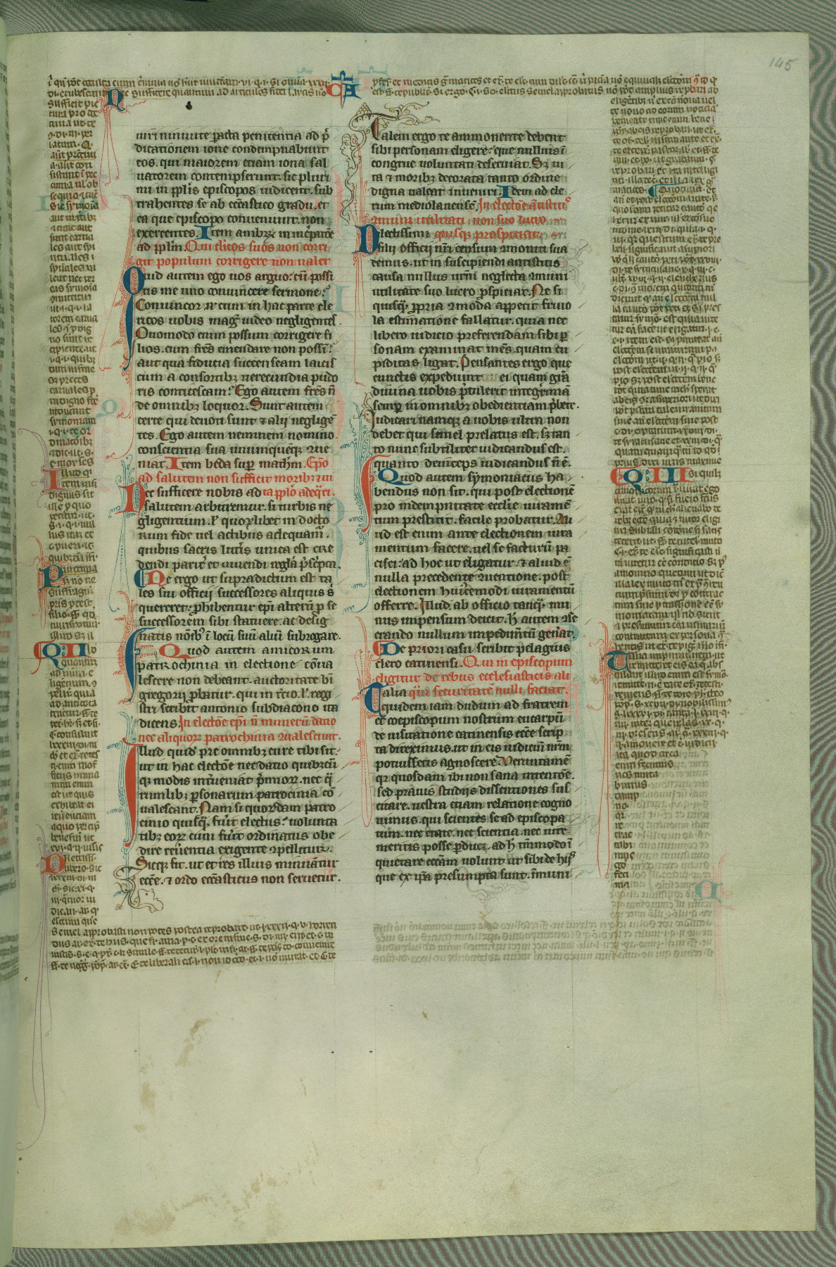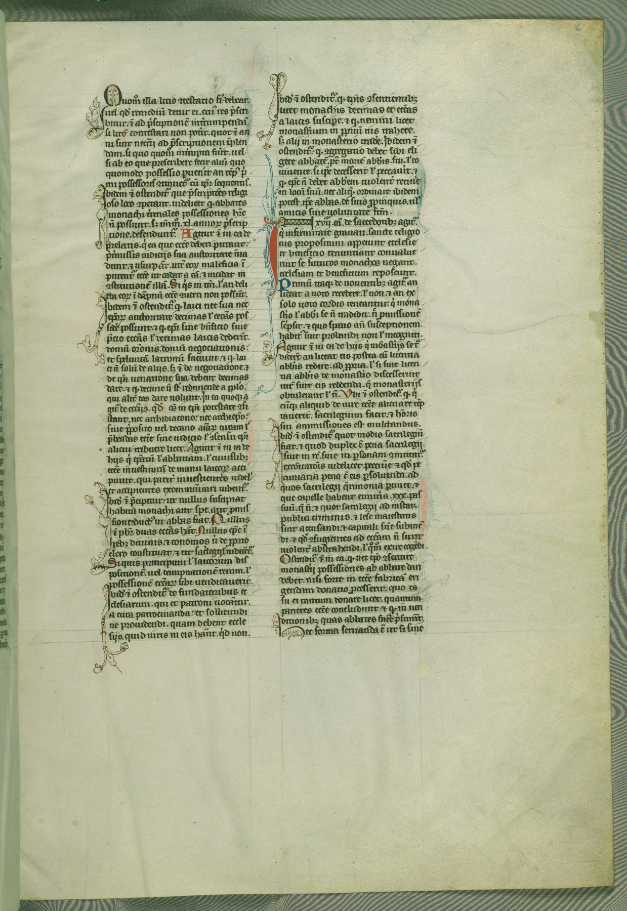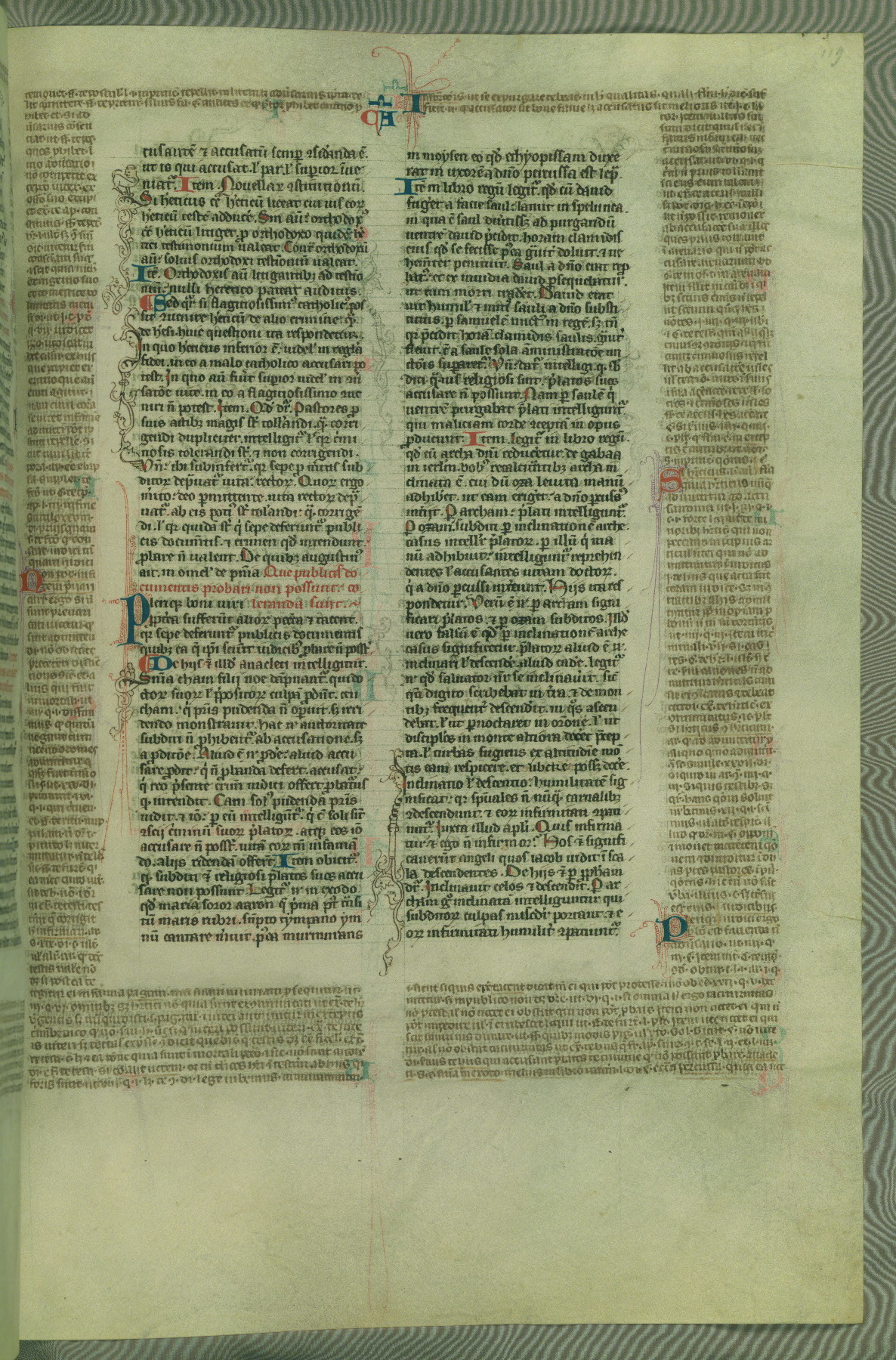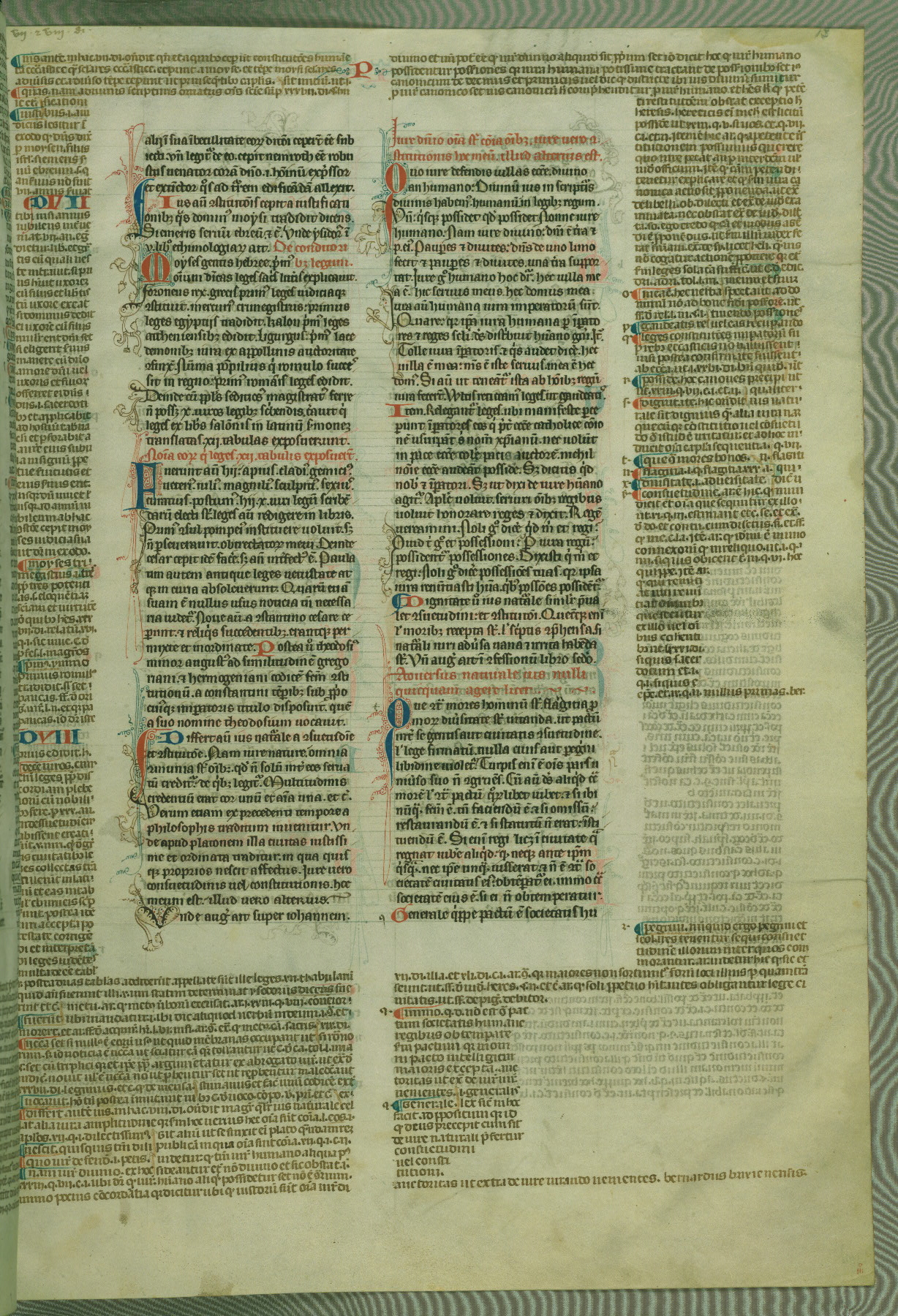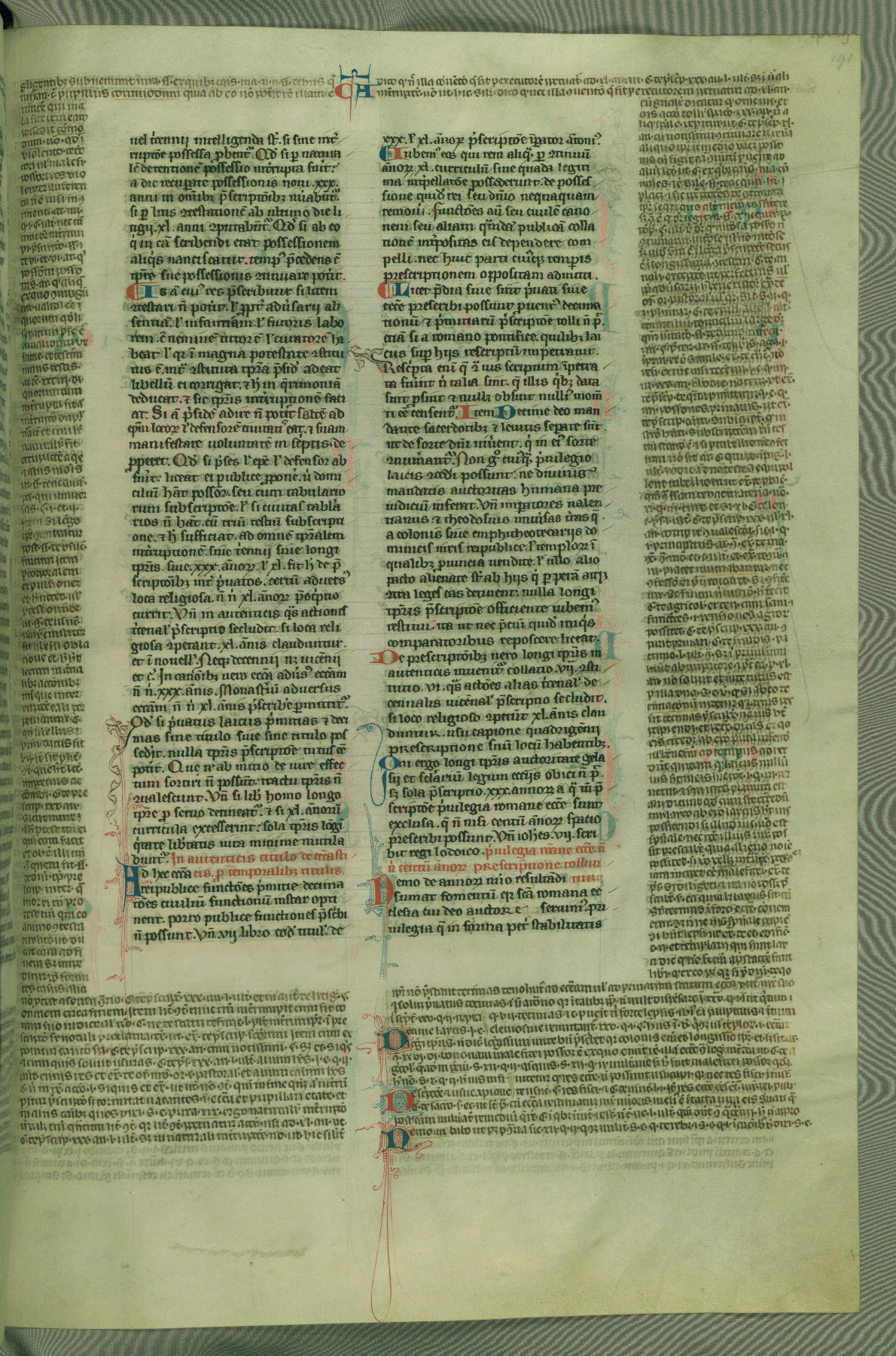 This deluxe version of Gratian's Decretum was created ca. 1280-90, most likely in Hainaut. The lively decoration of the manuscript indicates a marked taste for narrative, and there are thirty-seven historiated initials. The gloss work was completed by Bartholomew of Brescia. At first, Paris would seem to be the most likely place of origin, given that it was the leading center for the study of canon law. However, this particular manuscript exhibits scribal features that suggest its place of origin as being the Cistercian abbey of Cambron in Hainaut. Furthermore, Abbot Baudouin de Bousso, whose tenure at the abbey was from 1283 to 1293, was schooled in theology at the University of Paris, and he would eventually endorse the production of many fine manuscripts while at Cambron. In fact, the catalyst for this endeavor seems to have been the Beaupré Antiphonary (W.759-761), which was was created at Cambron during the 1280s. Stylistic features of W.133 seem to have connections with the Beaupré Antiphonary. For example, Cistercian monks are shown in three extant illuminations throughout three of the antiphonary volumes; these monks are pictured in brown habits similar to the type worn by clerics in W.133. The reliance upon Cistercian precedents for textual and design features associates W.133 with the Cistercian abbey at Cambron. However, more remains to be confirmed by further inspection of the output of the scriptorium at Cambron.