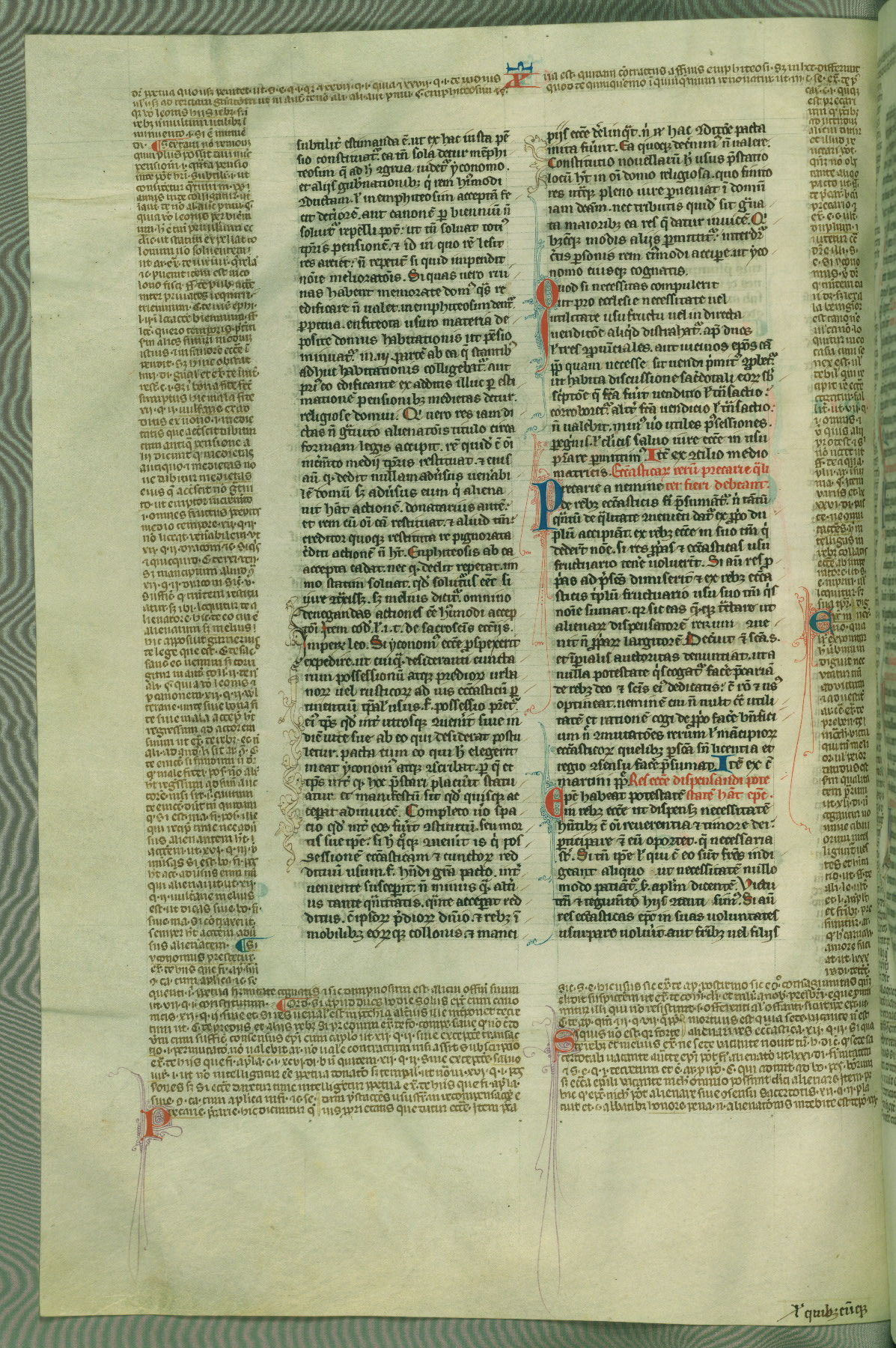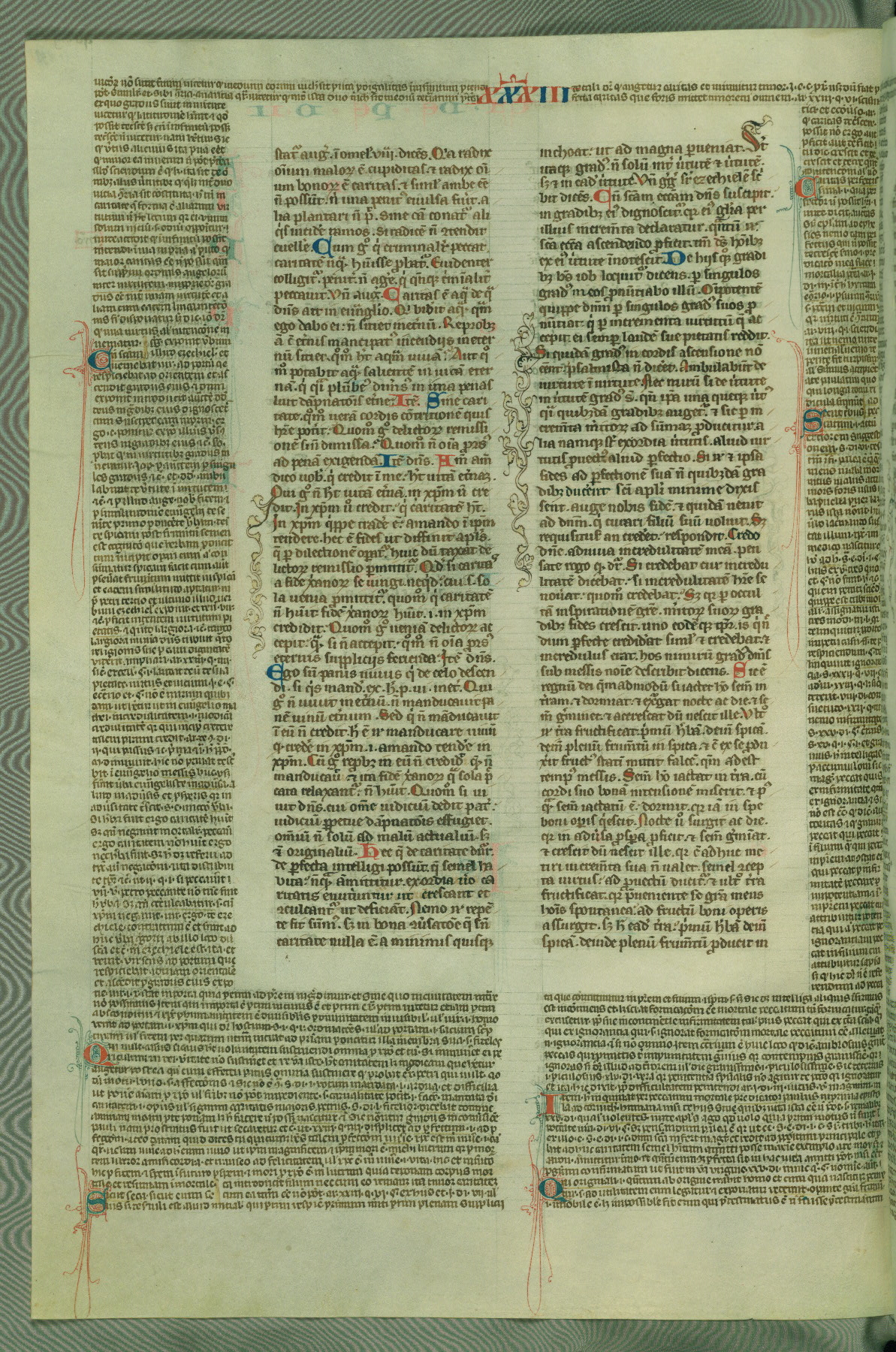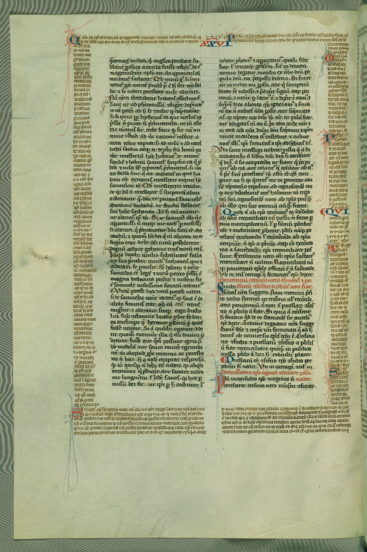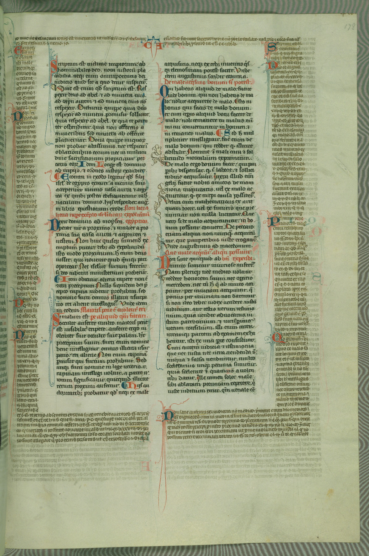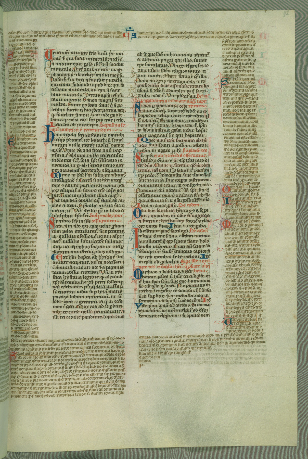 This deluxe version of Gratian's Decretum was created ca. 1280-90, most likely in Hainaut. The lively decoration of the manuscript indicates a marked taste for narrative, and there are thirty-seven historiated initials. The gloss work was completed by Bartholomew of Brescia. At first, Paris would seem to be the most likely place of origin, given that it was the leading center for the study of canon law. However, this particular manuscript exhibits scribal features that suggest its place of origin as being the Cistercian abbey of Cambron in Hainaut. Furthermore, Abbot Baudouin de Bousso, whose tenure at the abbey was from 1283 to 1293, was schooled in theology at the University of Paris, and he would eventually endorse the production of many fine manuscripts while at Cambron. In fact, the catalyst for this endeavor seems to have been the Beaupré Antiphonary (W.759-761), which was was created at Cambron during the 1280s. Stylistic features of W.133 seem to have connections with the Beaupré Antiphonary. For example, Cistercian monks are shown in three extant illuminations throughout three of the antiphonary volumes; these monks are pictured in brown habits similar to the type worn by clerics in W.133. The reliance upon Cistercian precedents for textual and design features associates W.133 with the Cistercian abbey at Cambron. However, more remains to be confirmed by further inspection of the output of the scriptorium at Cambron.