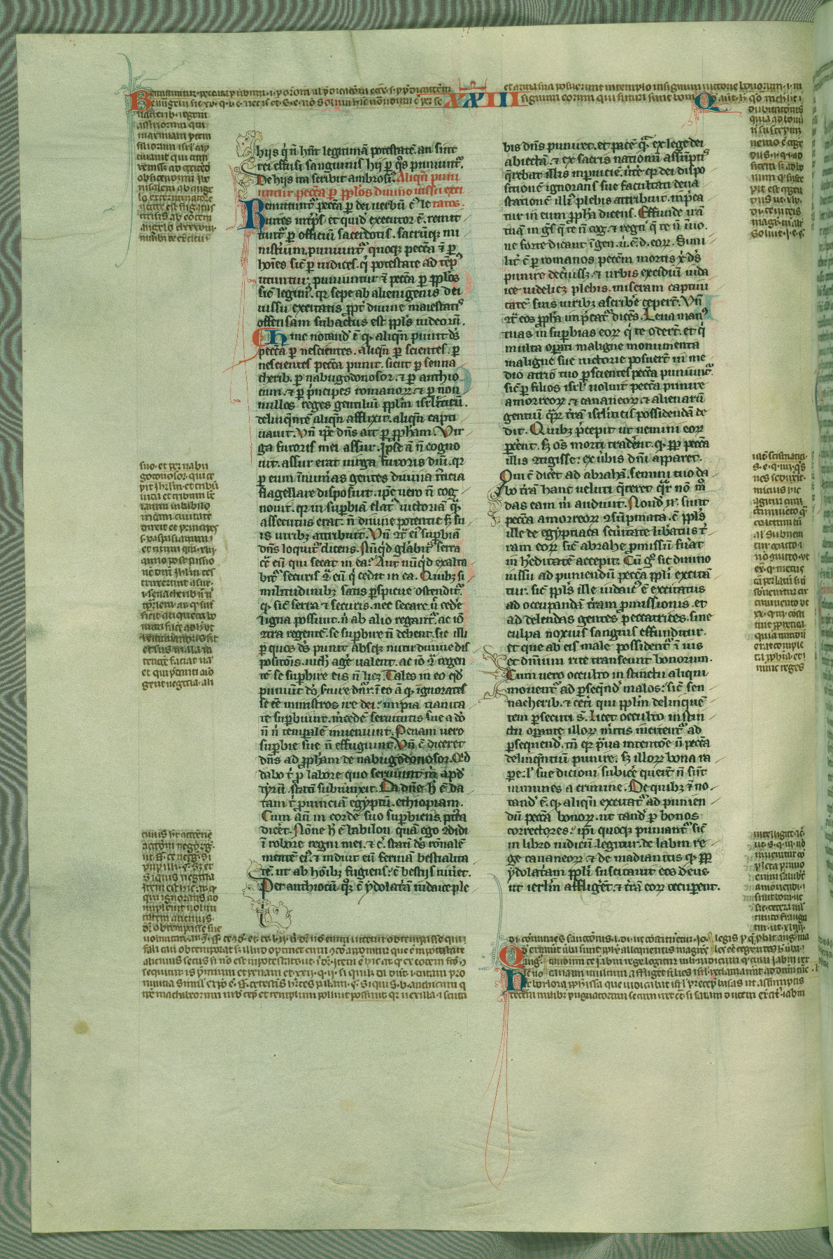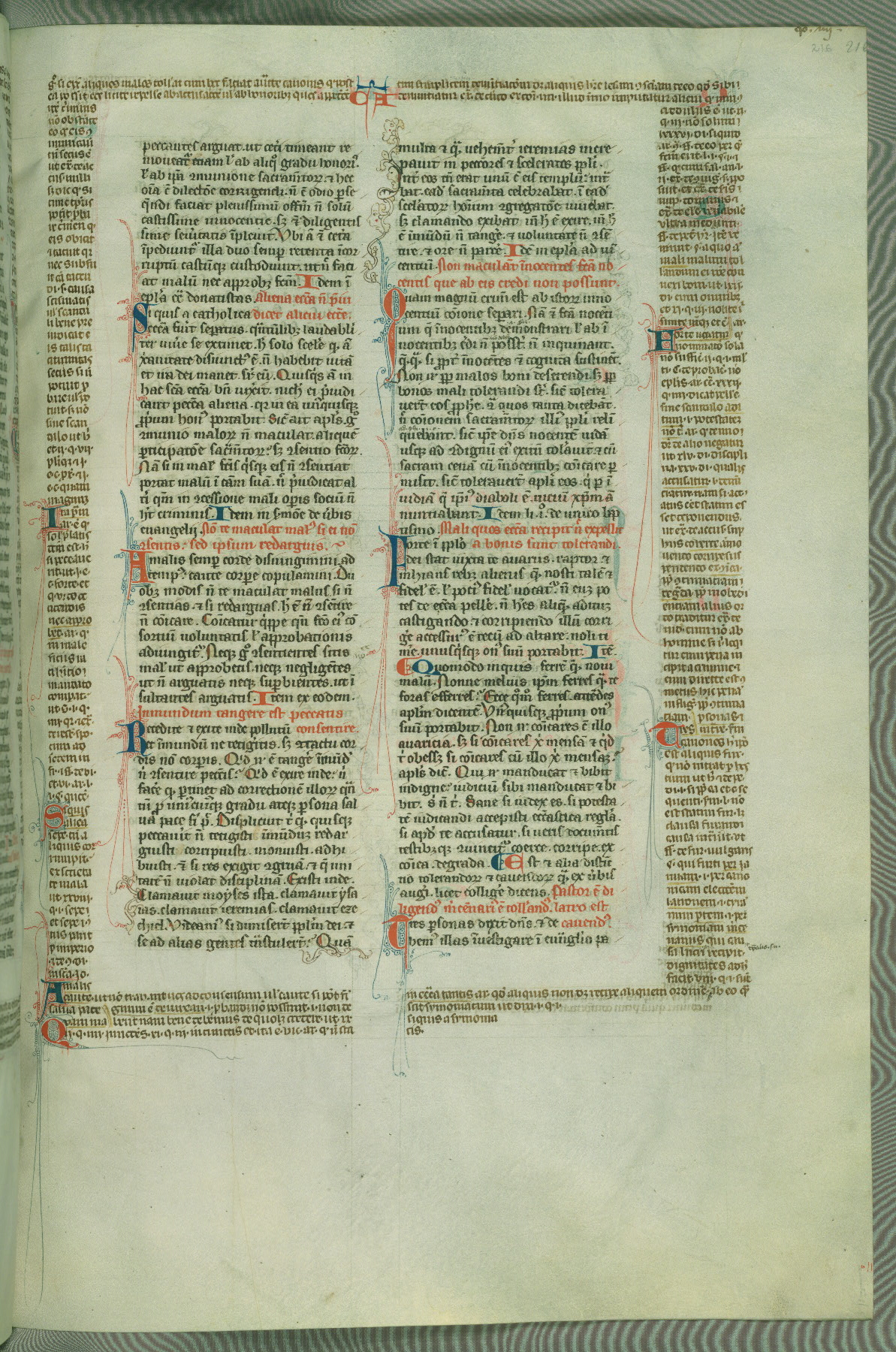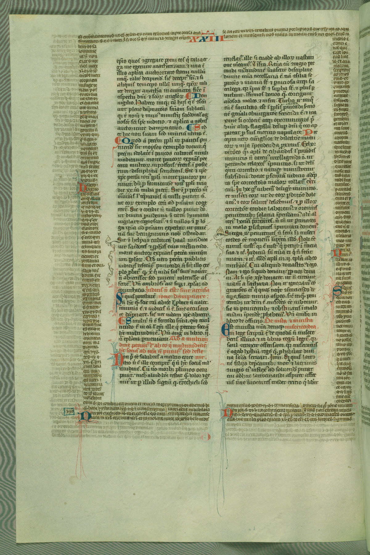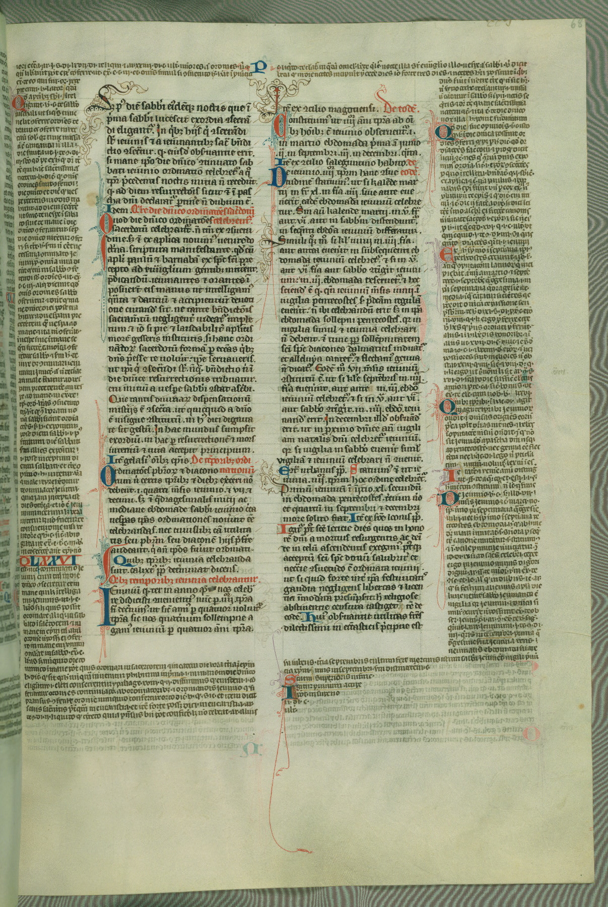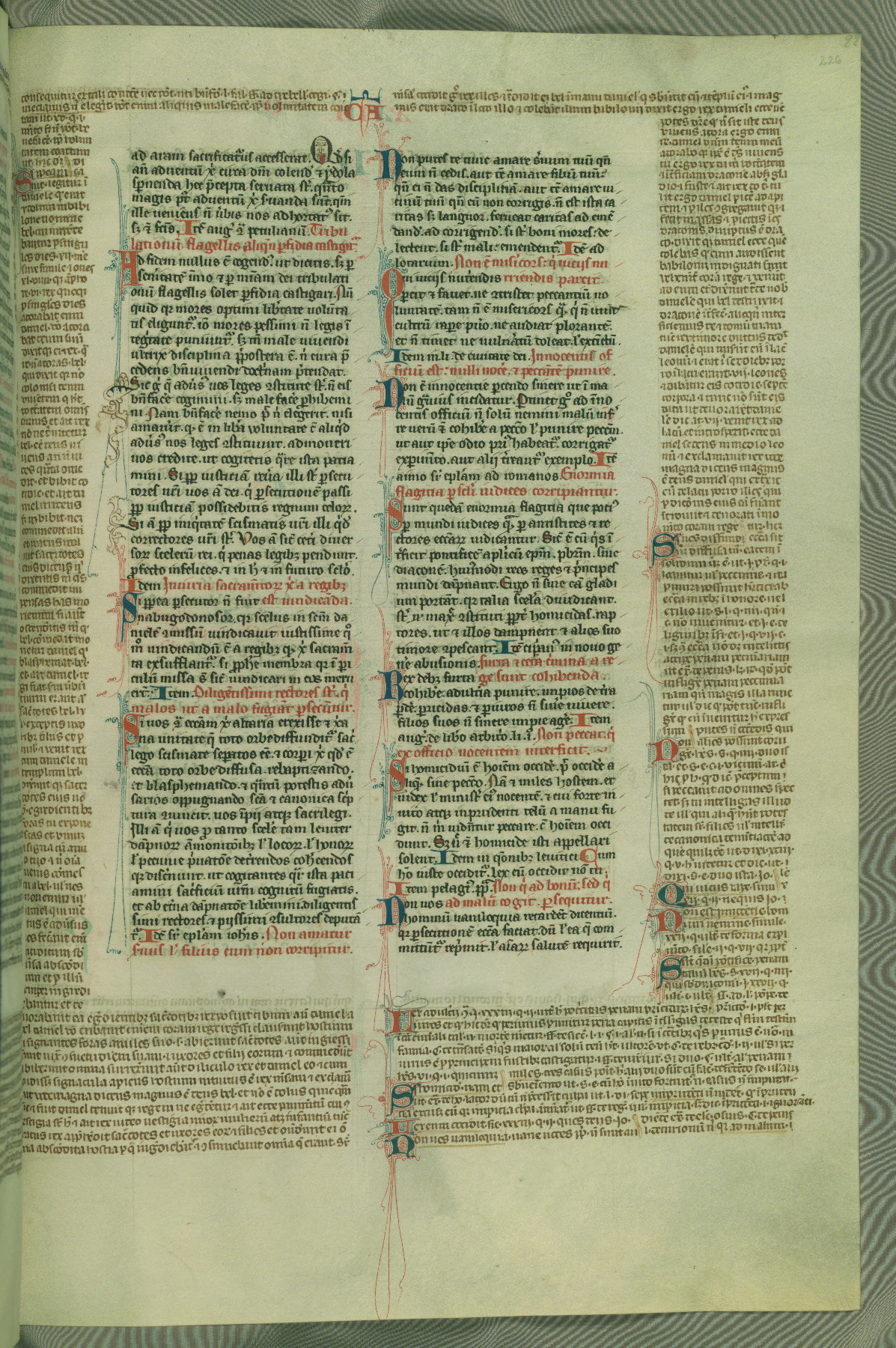 This deluxe version of Gratian's Decretum was created ca. 1280-90, most likely in Hainaut. The lively decoration of the manuscript indicates a marked taste for narrative, and there are thirty-seven historiated initials. The gloss work was completed by Bartholomew of Brescia. At first, Paris would seem to be the most likely place of origin, given that it was the leading center for the study of canon law. However, this particular manuscript exhibits scribal features that suggest its place of origin as being the Cistercian abbey of Cambron in Hainaut. Furthermore, Abbot Baudouin de Bousso, whose tenure at the abbey was from 1283 to 1293, was schooled in theology at the University of Paris, and he would eventually endorse the production of many fine manuscripts while at Cambron. In fact, the catalyst for this endeavor seems to have been the Beaupré Antiphonary (W.759-761), which was was created at Cambron during the 1280s. Stylistic features of W.133 seem to have connections with the Beaupré Antiphonary. For example, Cistercian monks are shown in three extant illuminations throughout three of the antiphonary volumes; these monks are pictured in brown habits similar to the type worn by clerics in W.133. The reliance upon Cistercian precedents for textual and design features associates W.133 with the Cistercian abbey at Cambron. However, more remains to be confirmed by further inspection of the output of the scriptorium at Cambron.