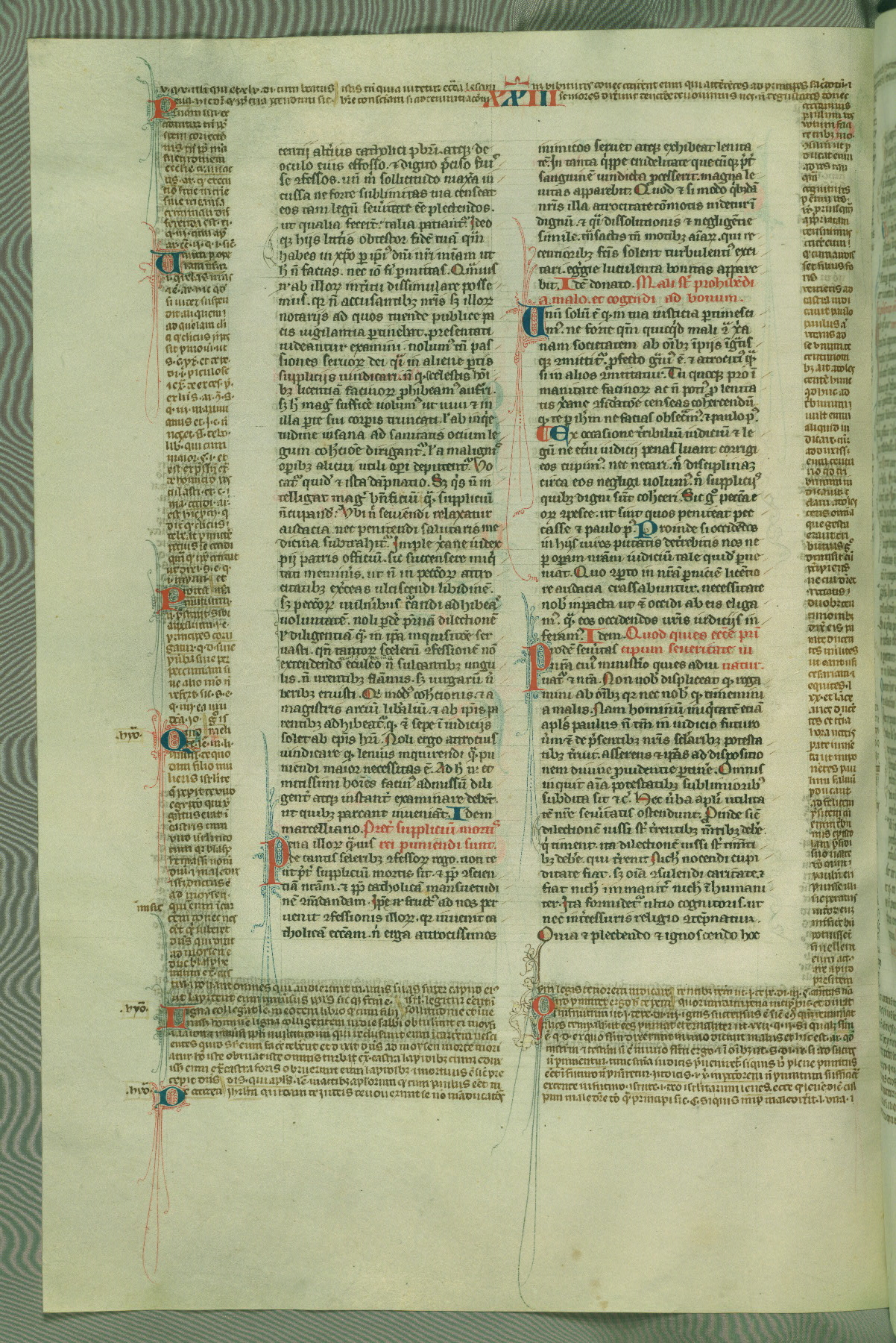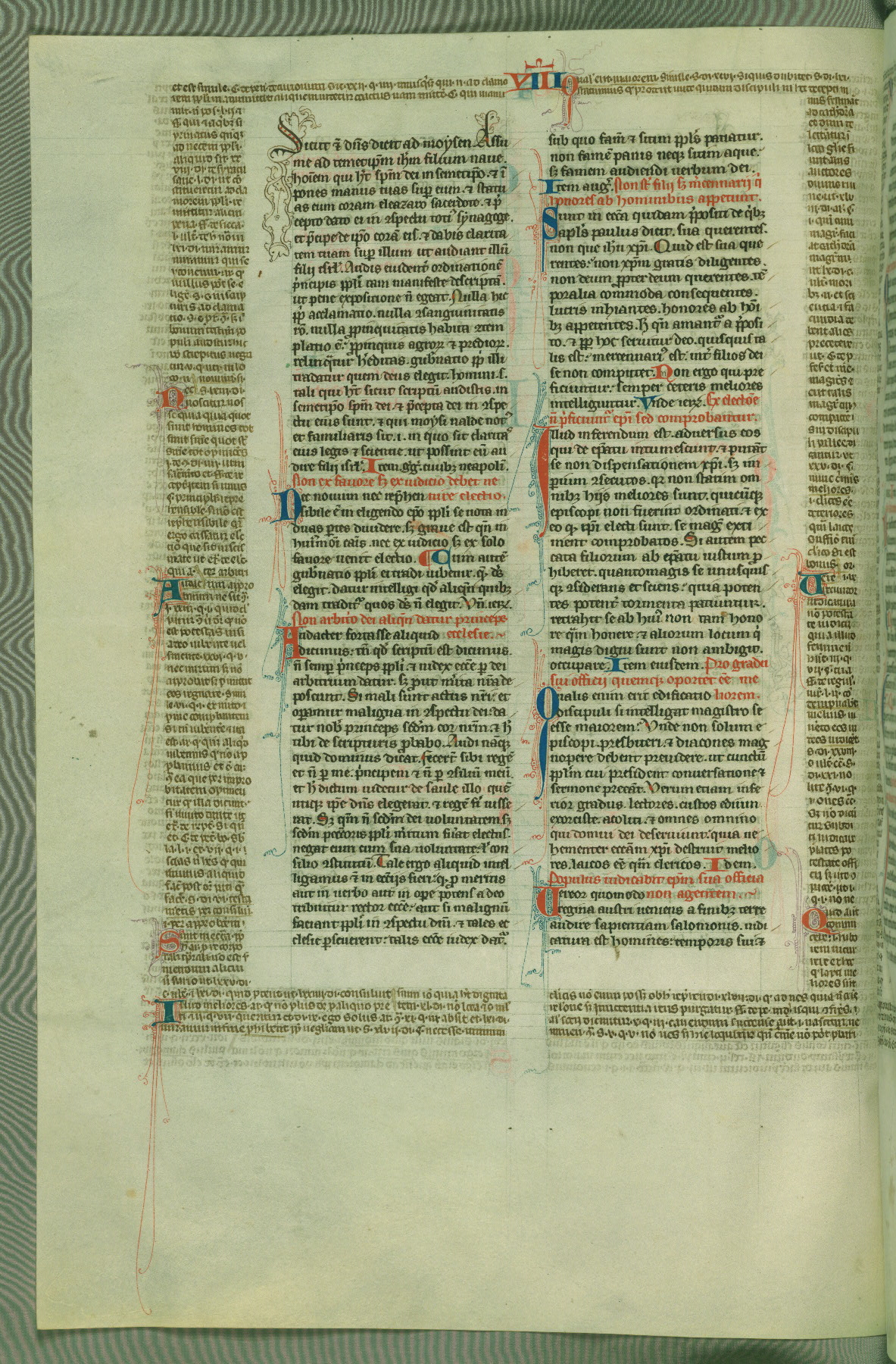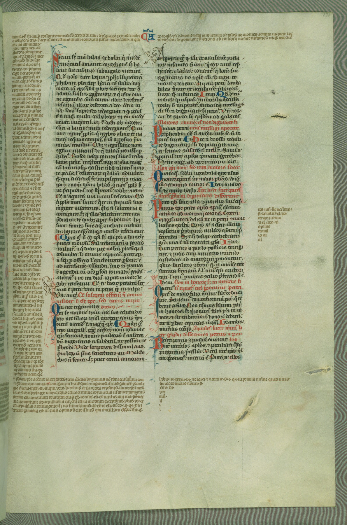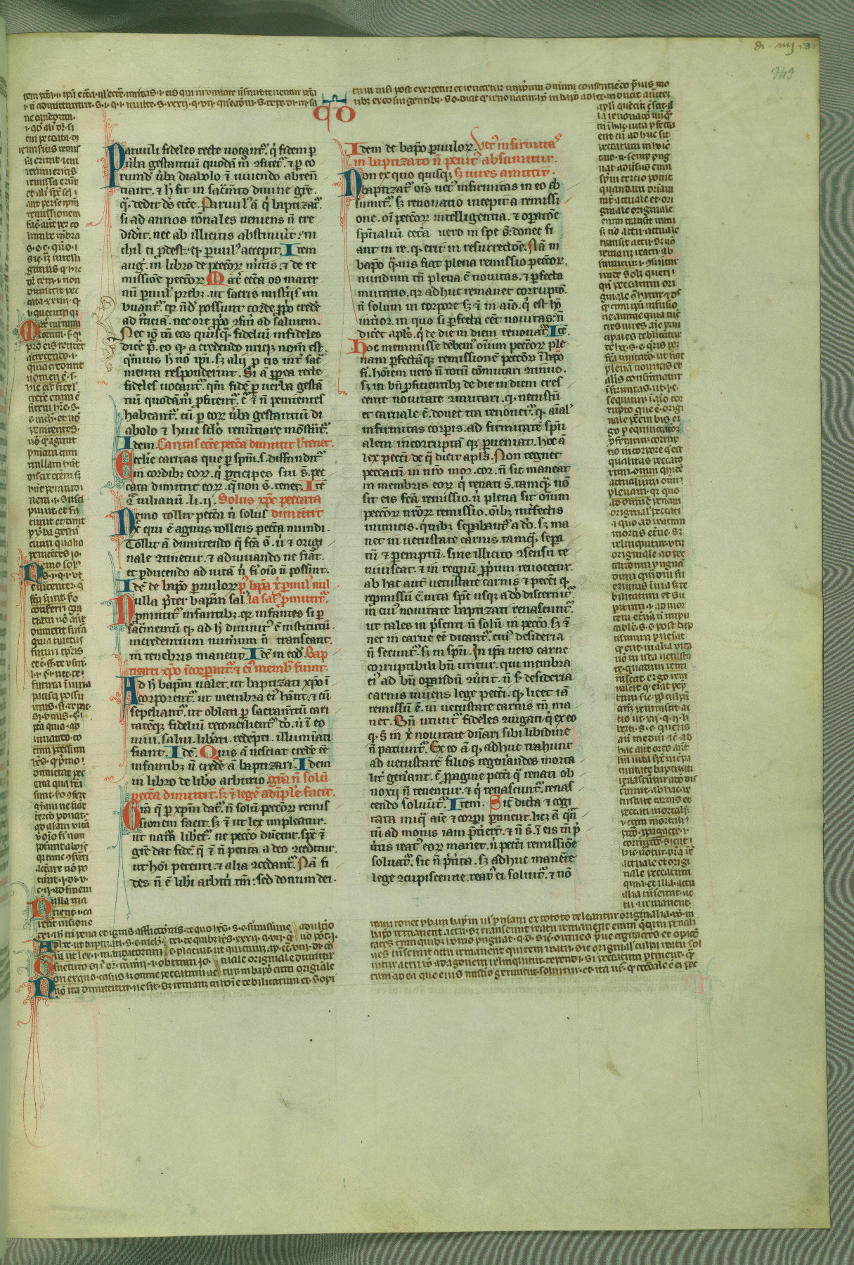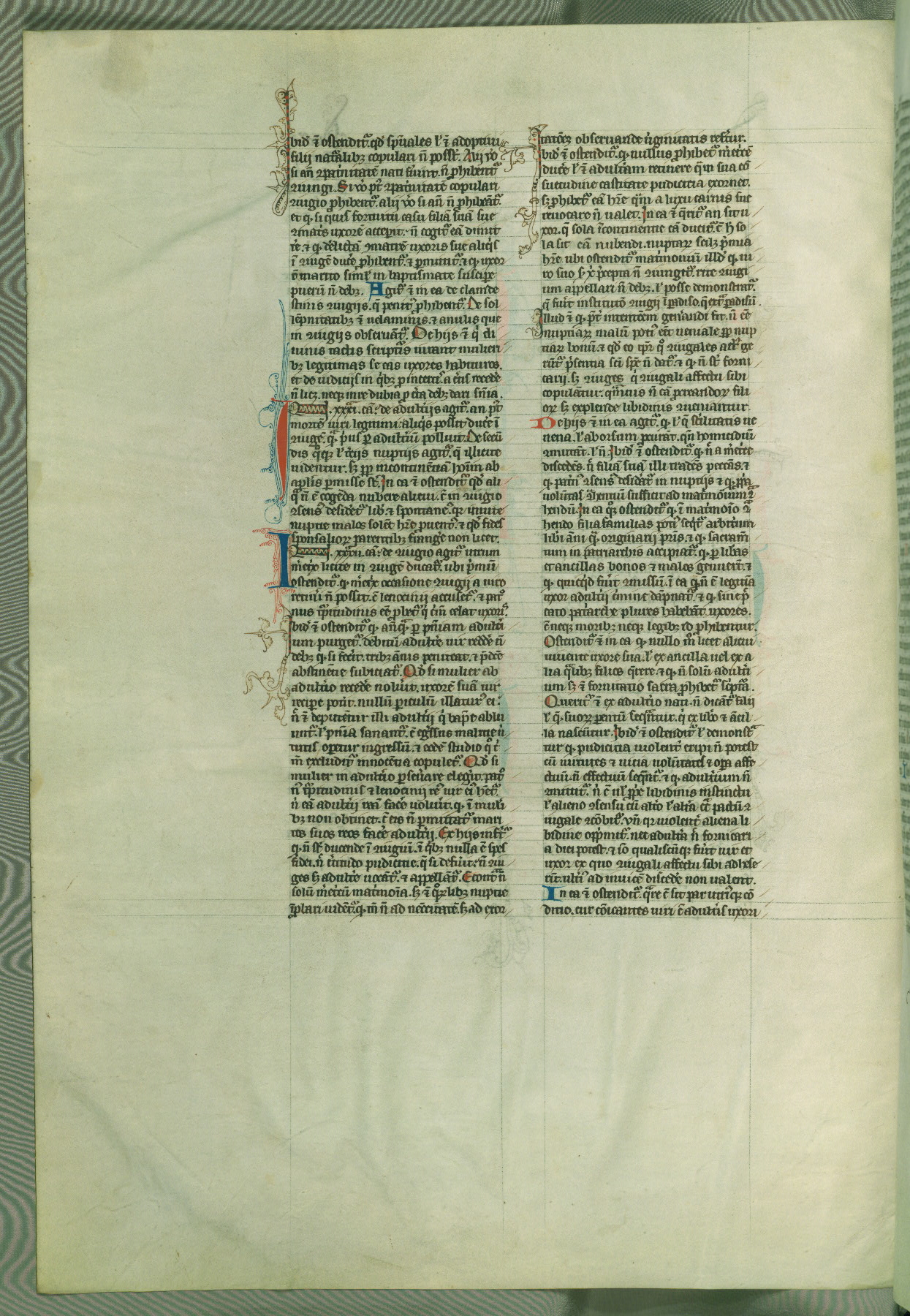 This deluxe version of Gratian's Decretum was created ca. 1280-90, most likely in Hainaut. The lively decoration of the manuscript indicates a marked taste for narrative, and there are thirty-seven historiated initials. The gloss work was completed by Bartholomew of Brescia. At first, Paris would seem to be the most likely place of origin, given that it was the leading center for the study of canon law. However, this particular manuscript exhibits scribal features that suggest its place of origin as being the Cistercian abbey of Cambron in Hainaut. Furthermore, Abbot Baudouin de Bousso, whose tenure at the abbey was from 1283 to 1293, was schooled in theology at the University of Paris, and he would eventually endorse the production of many fine manuscripts while at Cambron. In fact, the catalyst for this endeavor seems to have been the Beaupré Antiphonary (W.759-761), which was was created at Cambron during the 1280s. Stylistic features of W.133 seem to have connections with the Beaupré Antiphonary. For example, Cistercian monks are shown in three extant illuminations throughout three of the antiphonary volumes; these monks are pictured in brown habits similar to the type worn by clerics in W.133. The reliance upon Cistercian precedents for textual and design features associates W.133 with the Cistercian abbey at Cambron. However, more remains to be confirmed by further inspection of the output of the scriptorium at Cambron.