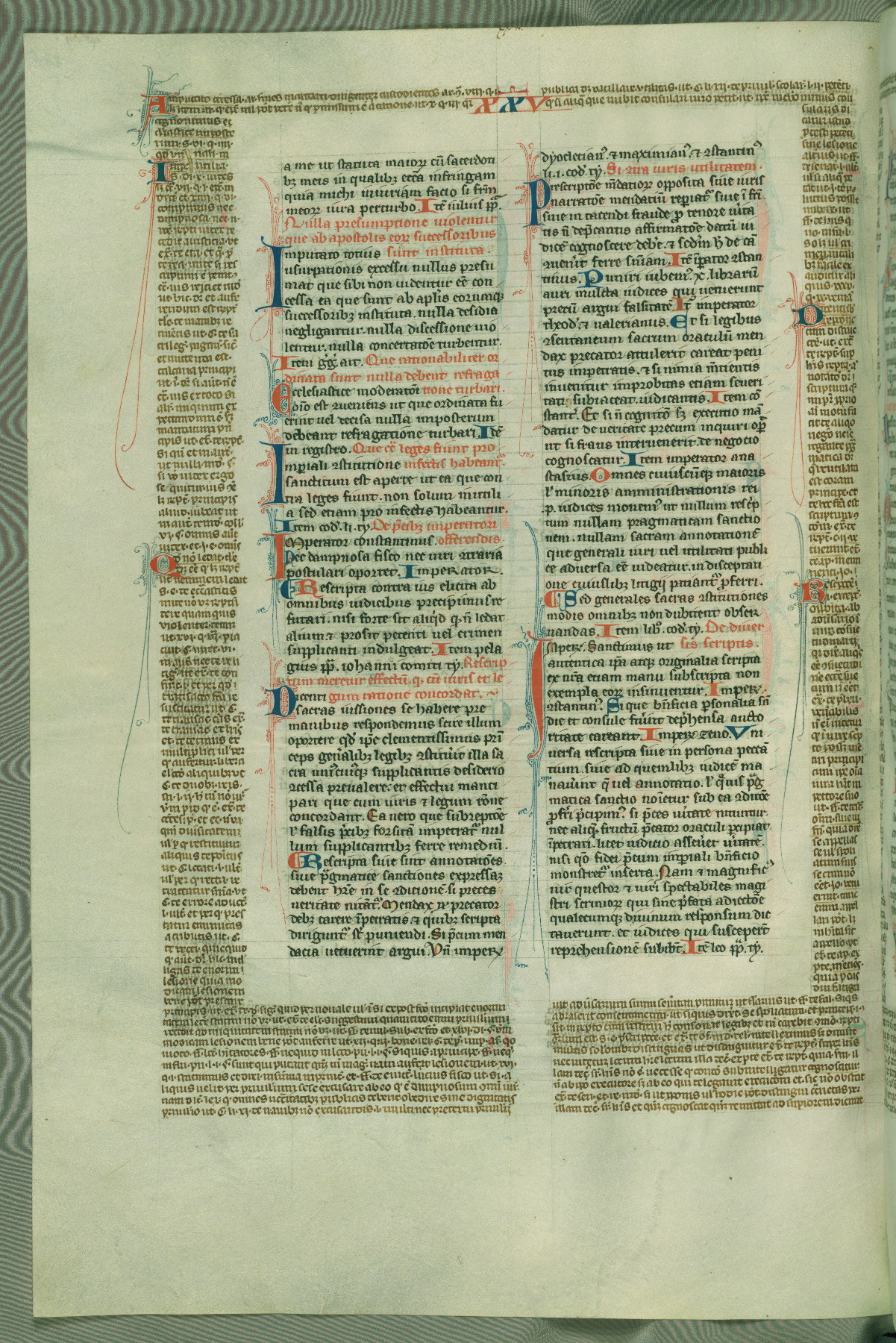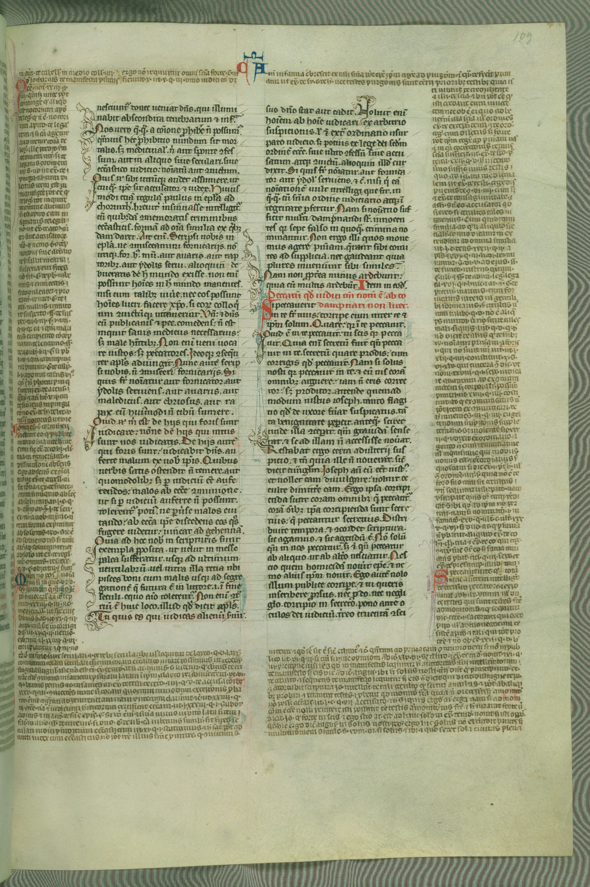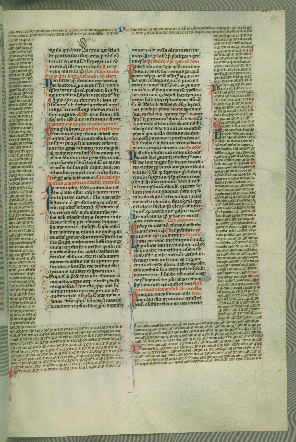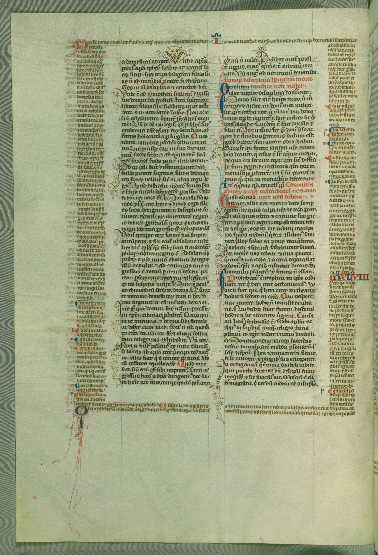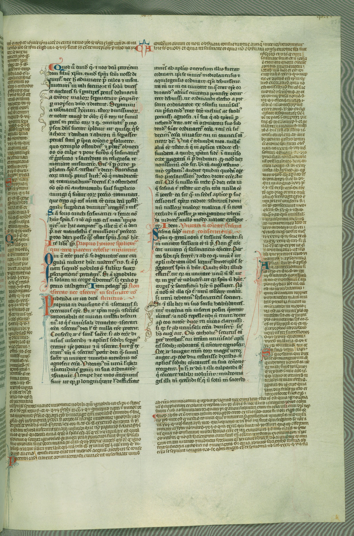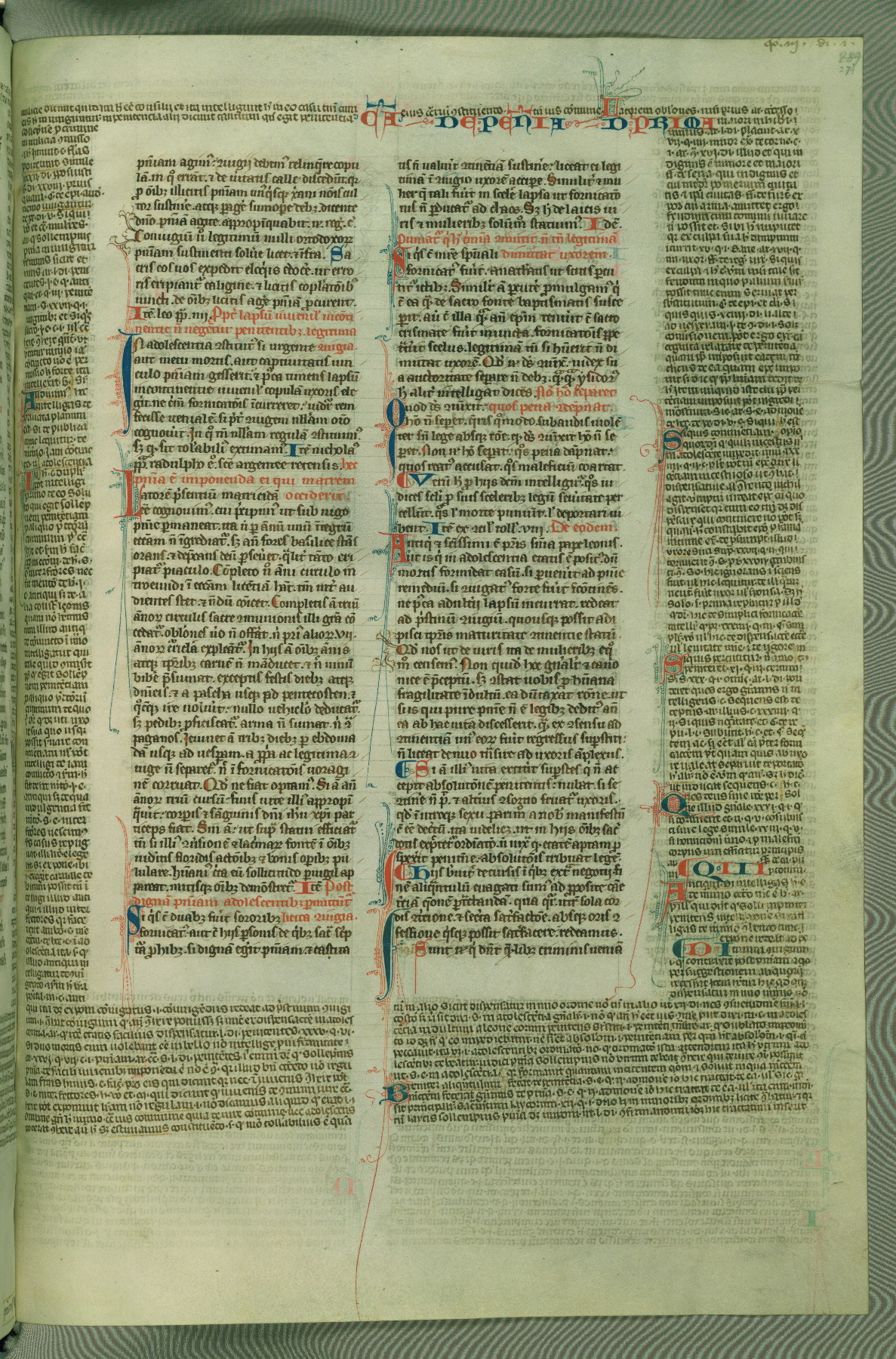 This deluxe version of Gratian's Decretum was created ca. 1280-90, most likely in Hainaut. The lively decoration of the manuscript indicates a marked taste for narrative, and there are thirty-seven historiated initials. The gloss work was completed by Bartholomew of Brescia. At first, Paris would seem to be the most likely place of origin, given that it was the leading center for the study of canon law. However, this particular manuscript exhibits scribal features that suggest its place of origin as being the Cistercian abbey of Cambron in Hainaut. Furthermore, Abbot Baudouin de Bousso, whose tenure at the abbey was from 1283 to 1293, was schooled in theology at the University of Paris, and he would eventually endorse the production of many fine manuscripts while at Cambron. In fact, the catalyst for this endeavor seems to have been the Beaupré Antiphonary (W.759-761), which was was created at Cambron during the 1280s. Stylistic features of W.133 seem to have connections with the Beaupré Antiphonary. For example, Cistercian monks are shown in three extant illuminations throughout three of the antiphonary volumes; these monks are pictured in brown habits similar to the type worn by clerics in W.133. The reliance upon Cistercian precedents for textual and design features associates W.133 with the Cistercian abbey at Cambron. However, more remains to be confirmed by further inspection of the output of the scriptorium at Cambron.