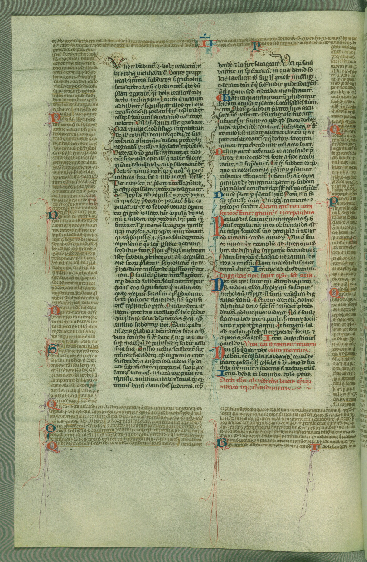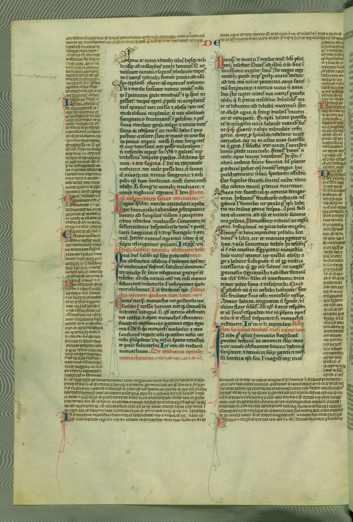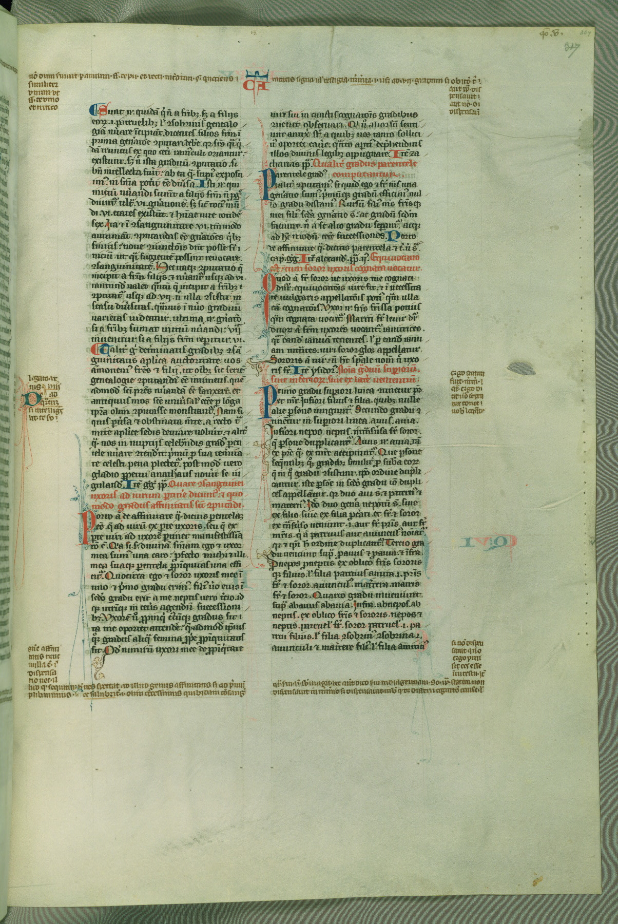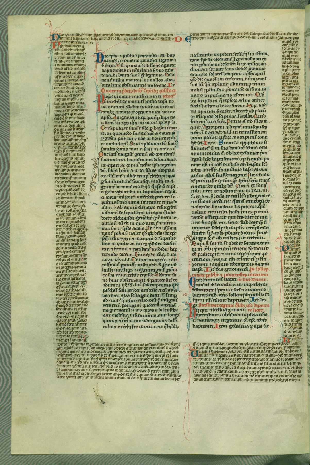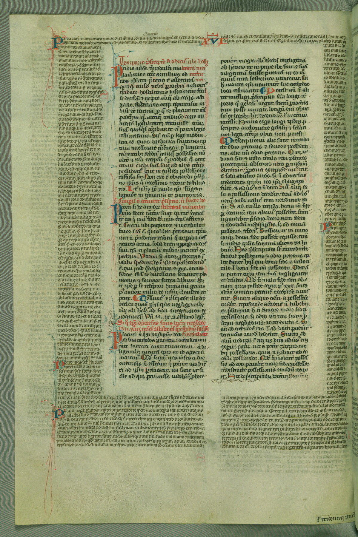 This deluxe version of Gratian's Decretum was created ca. 1280-90, most likely in Hainaut. The lively decoration of the manuscript indicates a marked taste for narrative, and there are thirty-seven historiated initials. The gloss work was completed by Bartholomew of Brescia. At first, Paris would seem to be the most likely place of origin, given that it was the leading center for the study of canon law. However, this particular manuscript exhibits scribal features that suggest its place of origin as being the Cistercian abbey of Cambron in Hainaut. Furthermore, Abbot Baudouin de Bousso, whose tenure at the abbey was from 1283 to 1293, was schooled in theology at the University of Paris, and he would eventually endorse the production of many fine manuscripts while at Cambron. In fact, the catalyst for this endeavor seems to have been the Beaupré Antiphonary (W.759-761), which was was created at Cambron during the 1280s. Stylistic features of W.133 seem to have connections with the Beaupré Antiphonary. For example, Cistercian monks are shown in three extant illuminations throughout three of the antiphonary volumes; these monks are pictured in brown habits similar to the type worn by clerics in W.133. The reliance upon Cistercian precedents for textual and design features associates W.133 with the Cistercian abbey at Cambron. However, more remains to be confirmed by further inspection of the output of the scriptorium at Cambron.