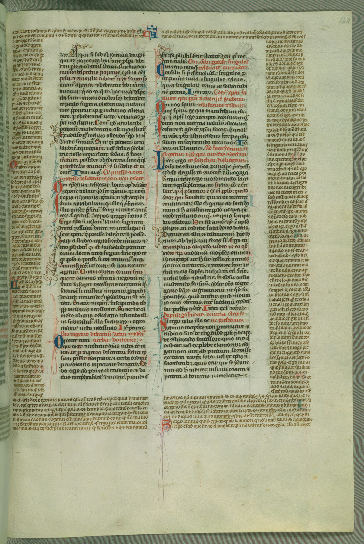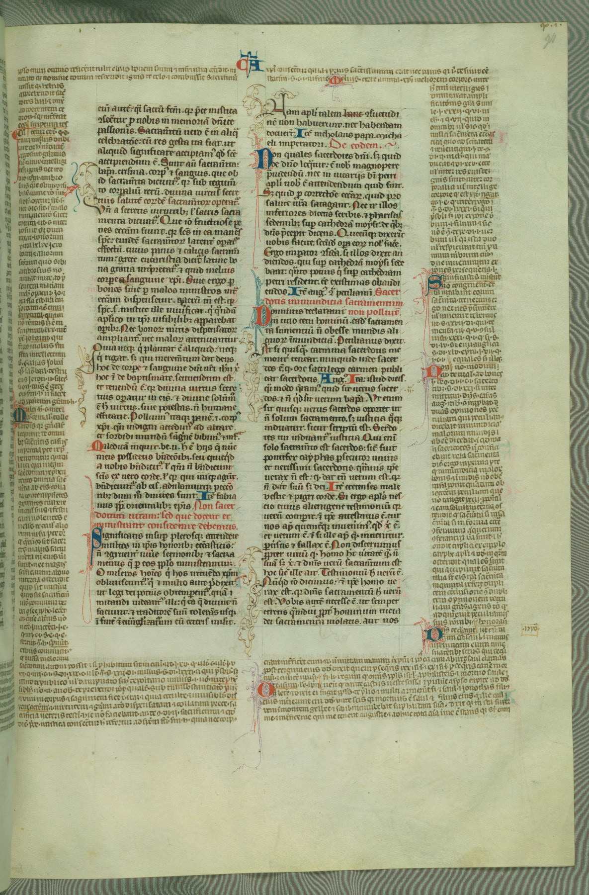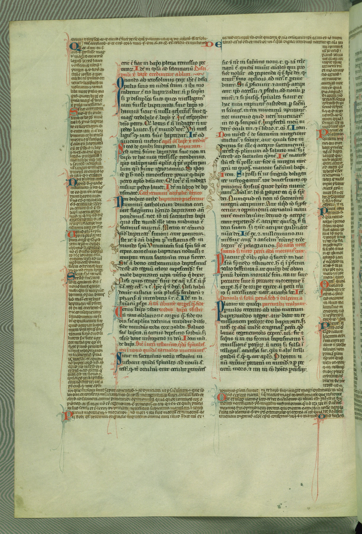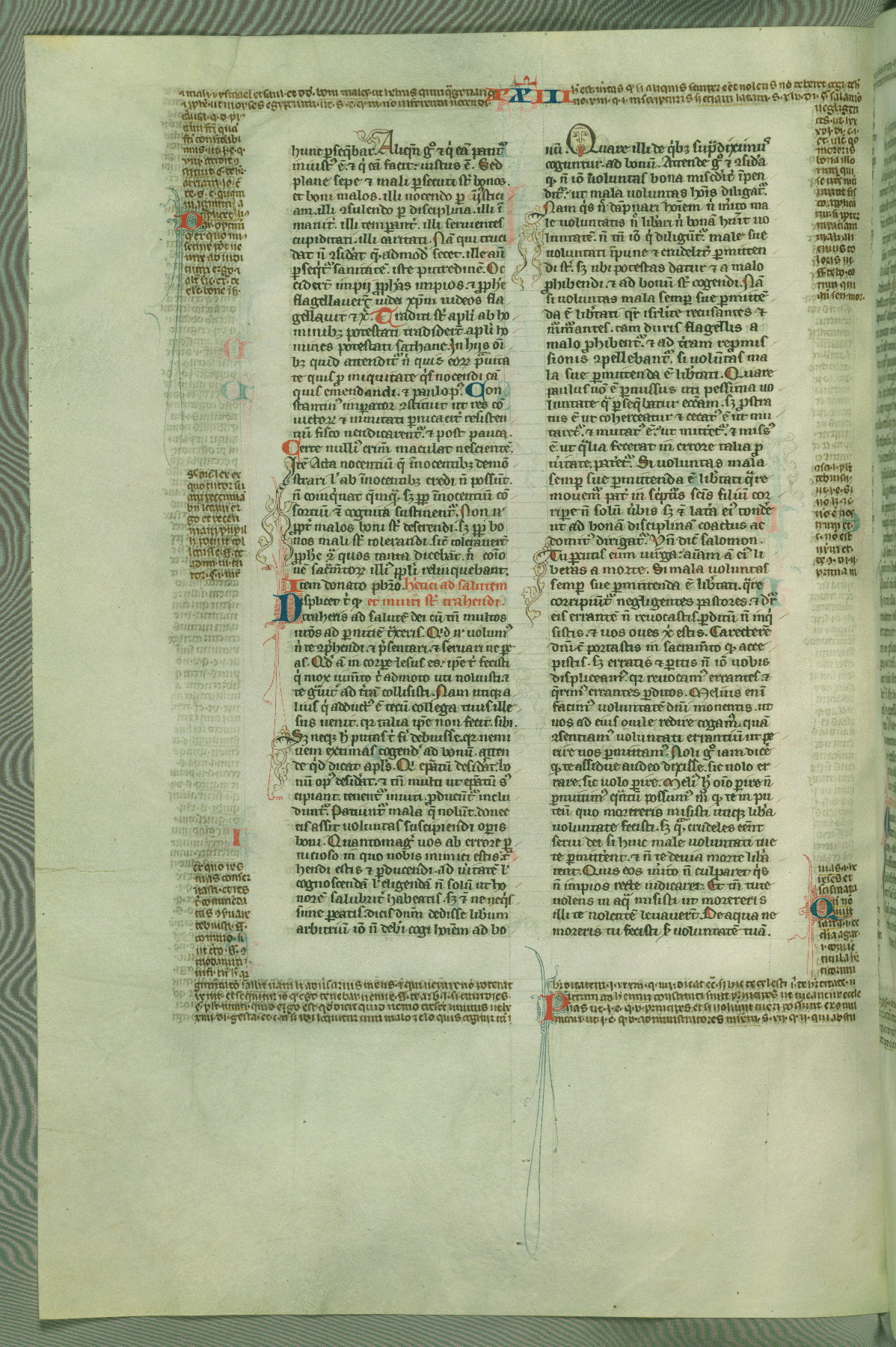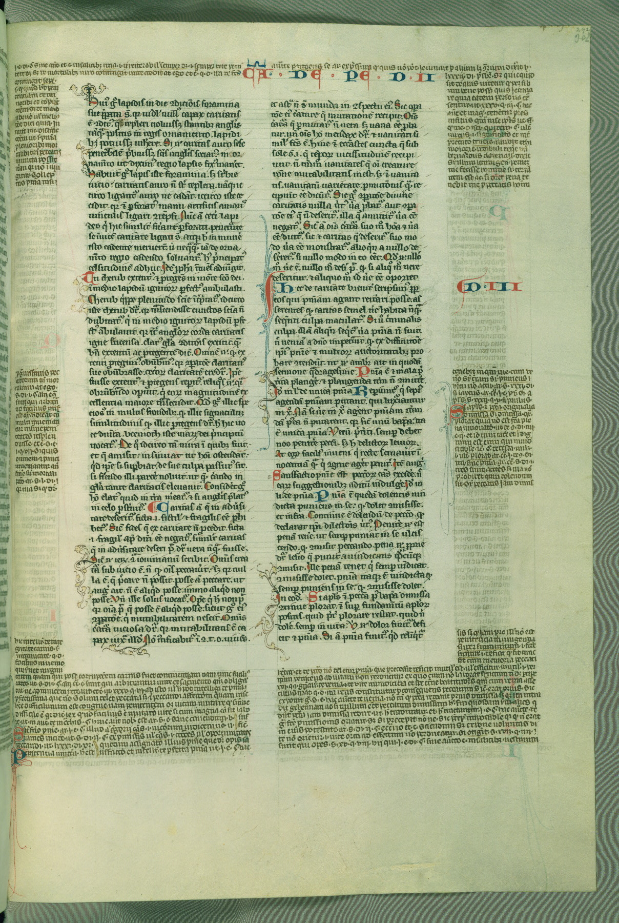 This deluxe version of Gratian's Decretum was created ca. 1280-90, most likely in Hainaut. The lively decoration of the manuscript indicates a marked taste for narrative, and there are thirty-seven historiated initials. The gloss work was completed by Bartholomew of Brescia. At first, Paris would seem to be the most likely place of origin, given that it was the leading center for the study of canon law. However, this particular manuscript exhibits scribal features that suggest its place of origin as being the Cistercian abbey of Cambron in Hainaut. Furthermore, Abbot Baudouin de Bousso, whose tenure at the abbey was from 1283 to 1293, was schooled in theology at the University of Paris, and he would eventually endorse the production of many fine manuscripts while at Cambron. In fact, the catalyst for this endeavor seems to have been the Beaupré Antiphonary (W.759-761), which was was created at Cambron during the 1280s. Stylistic features of W.133 seem to have connections with the Beaupré Antiphonary. For example, Cistercian monks are shown in three extant illuminations throughout three of the antiphonary volumes; these monks are pictured in brown habits similar to the type worn by clerics in W.133. The reliance upon Cistercian precedents for textual and design features associates W.133 with the Cistercian abbey at Cambron. However, more remains to be confirmed by further inspection of the output of the scriptorium at Cambron.