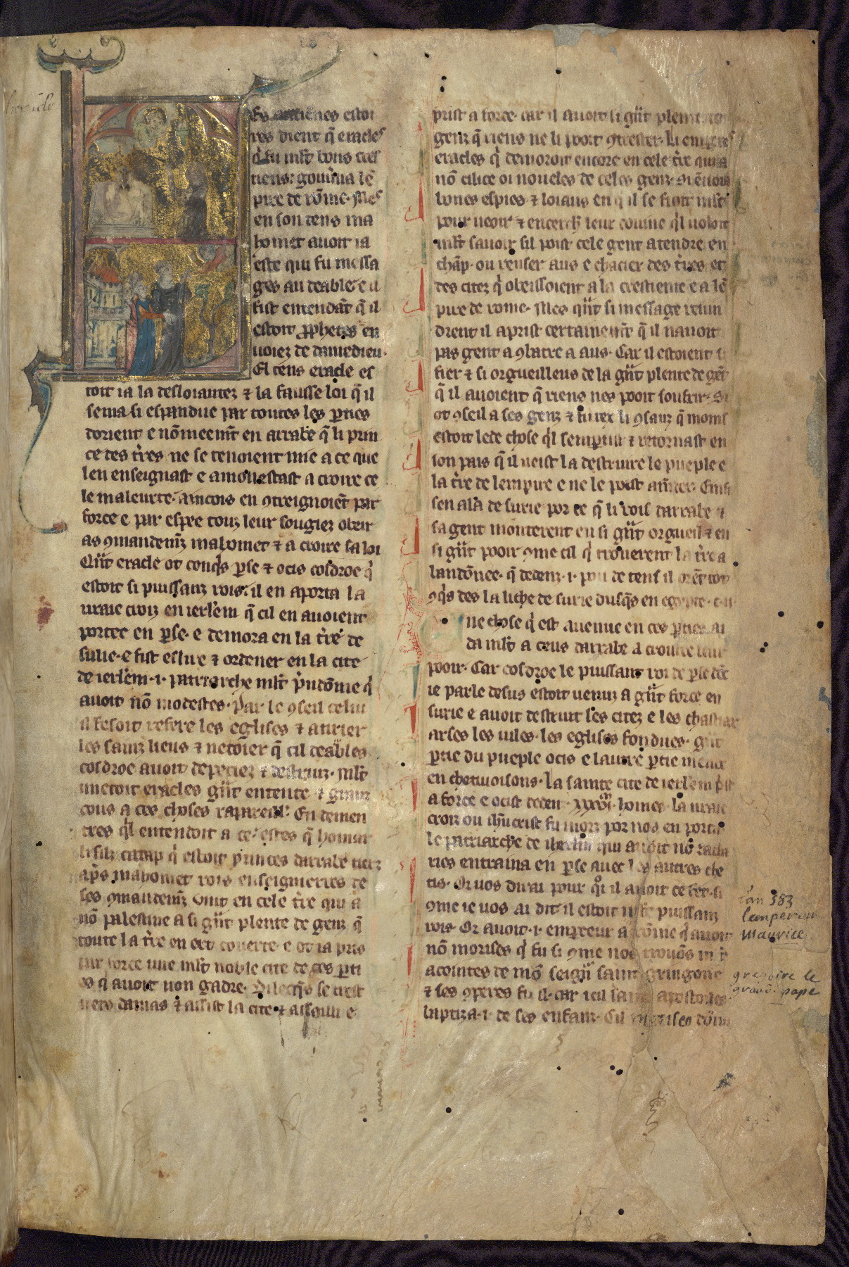- Decoration note: Twenty-seven miniatures; twenty-two historiated initials (7-13 lines); borders; decorated illuminated initials at beginnings of most major text divisions that are marked by panel miniatures (2-3 lines); flourished initials at beginnings of secondary text divisions (2 lines); text in dark brown ink