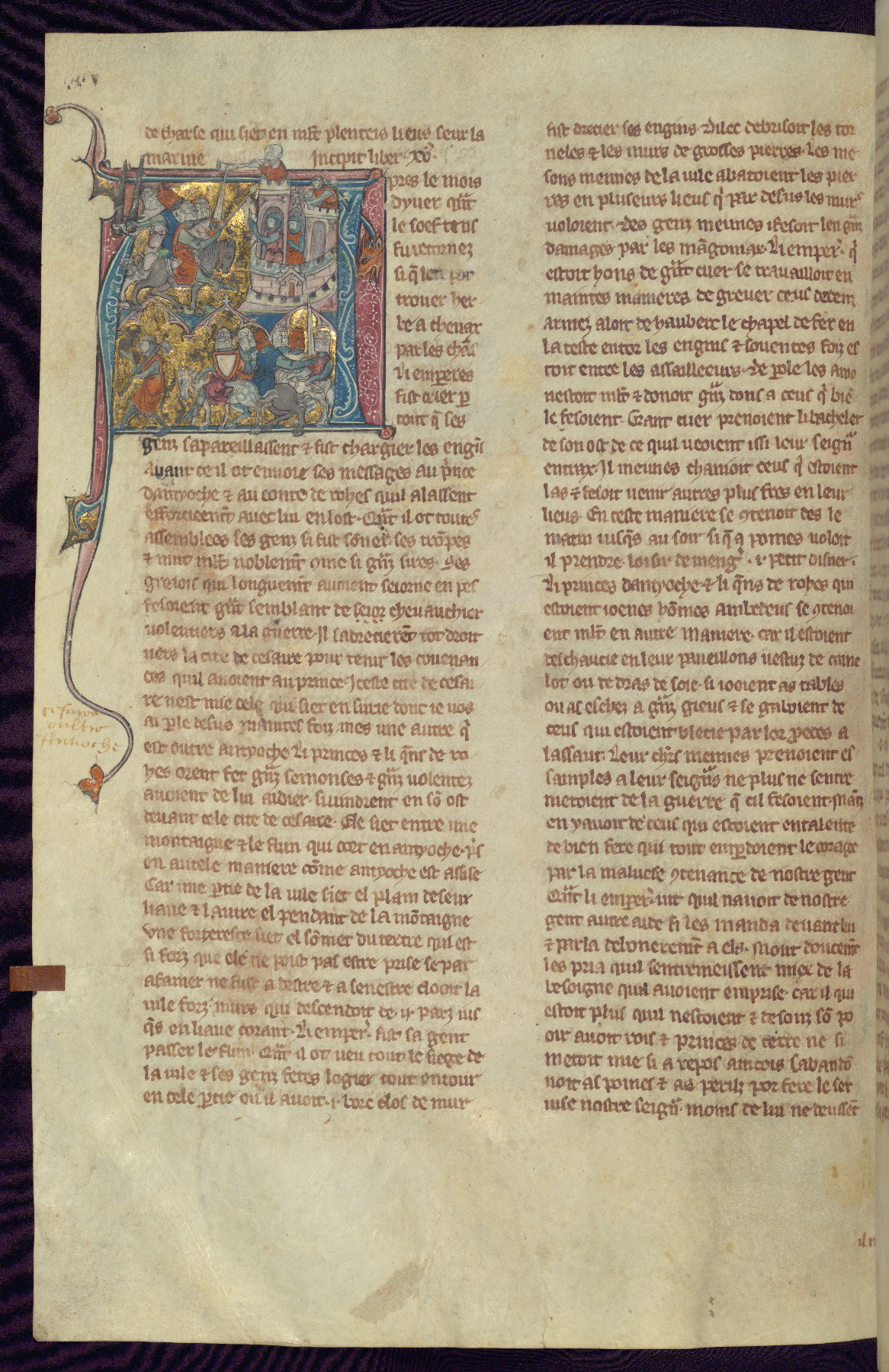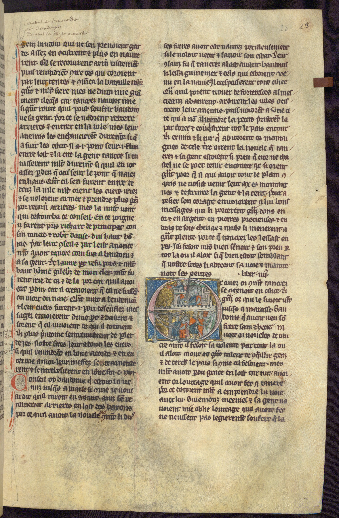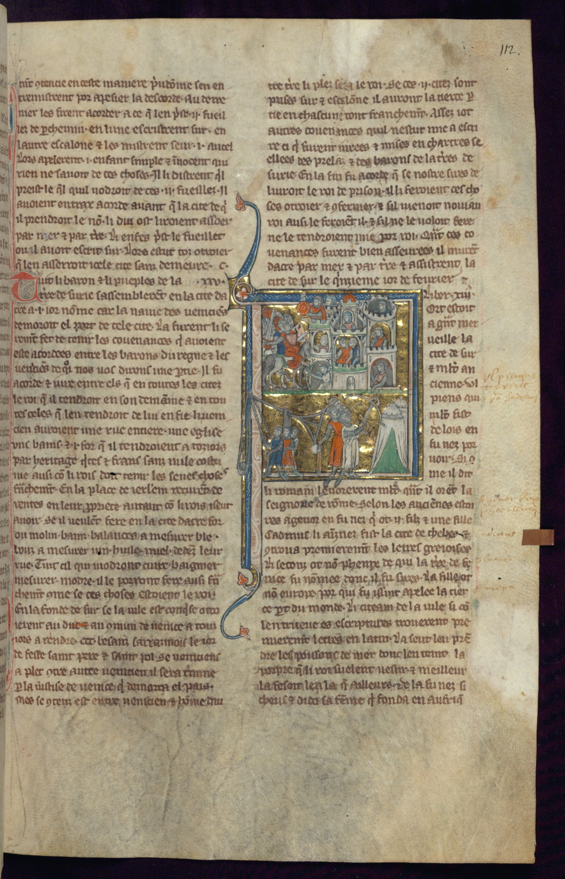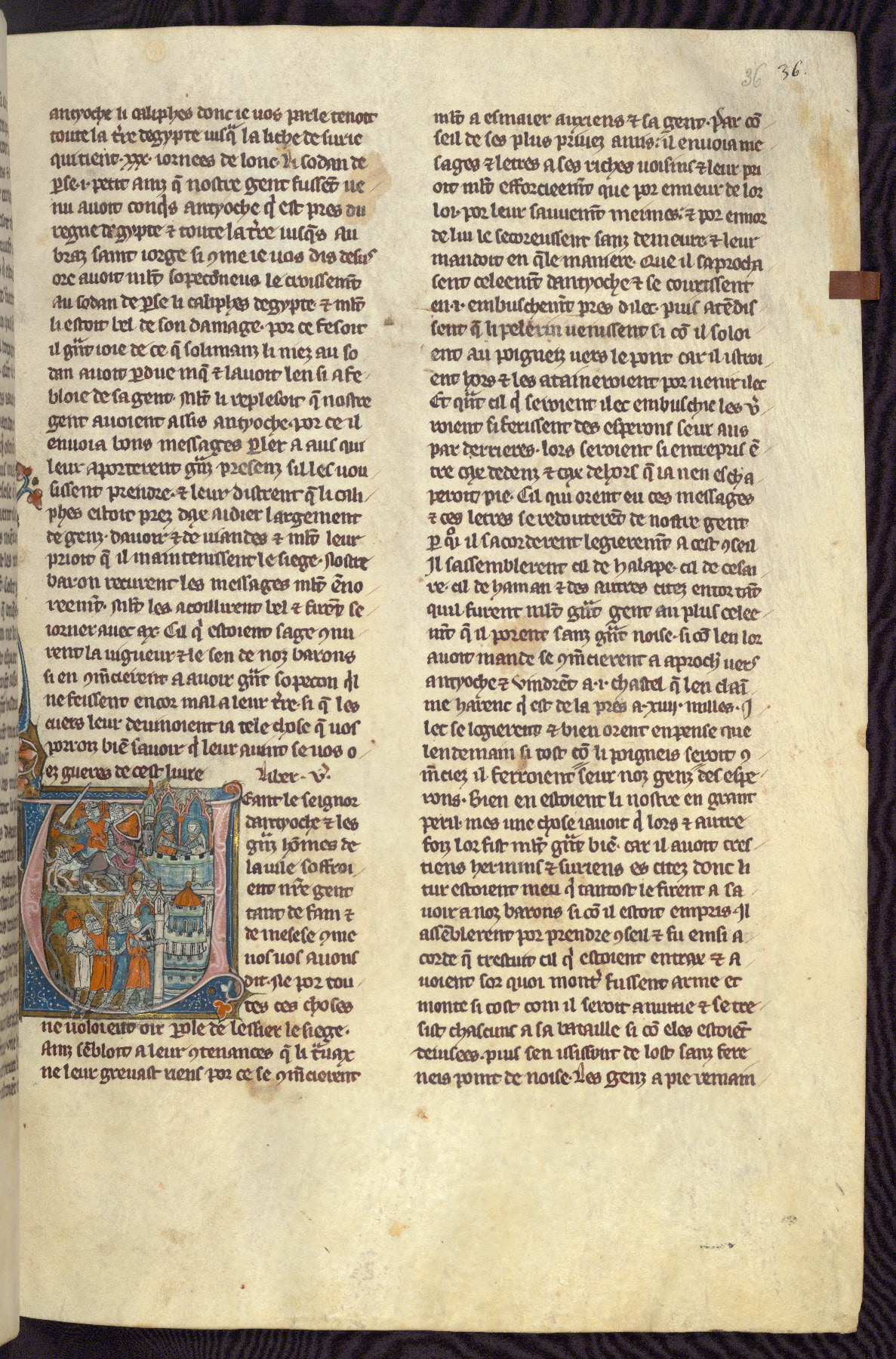 - Title: Historiated initial "V" with Firuz preparing to kill his brother as crusaders return / Crusaders enter Antioch, gates opened from within by compatriots
