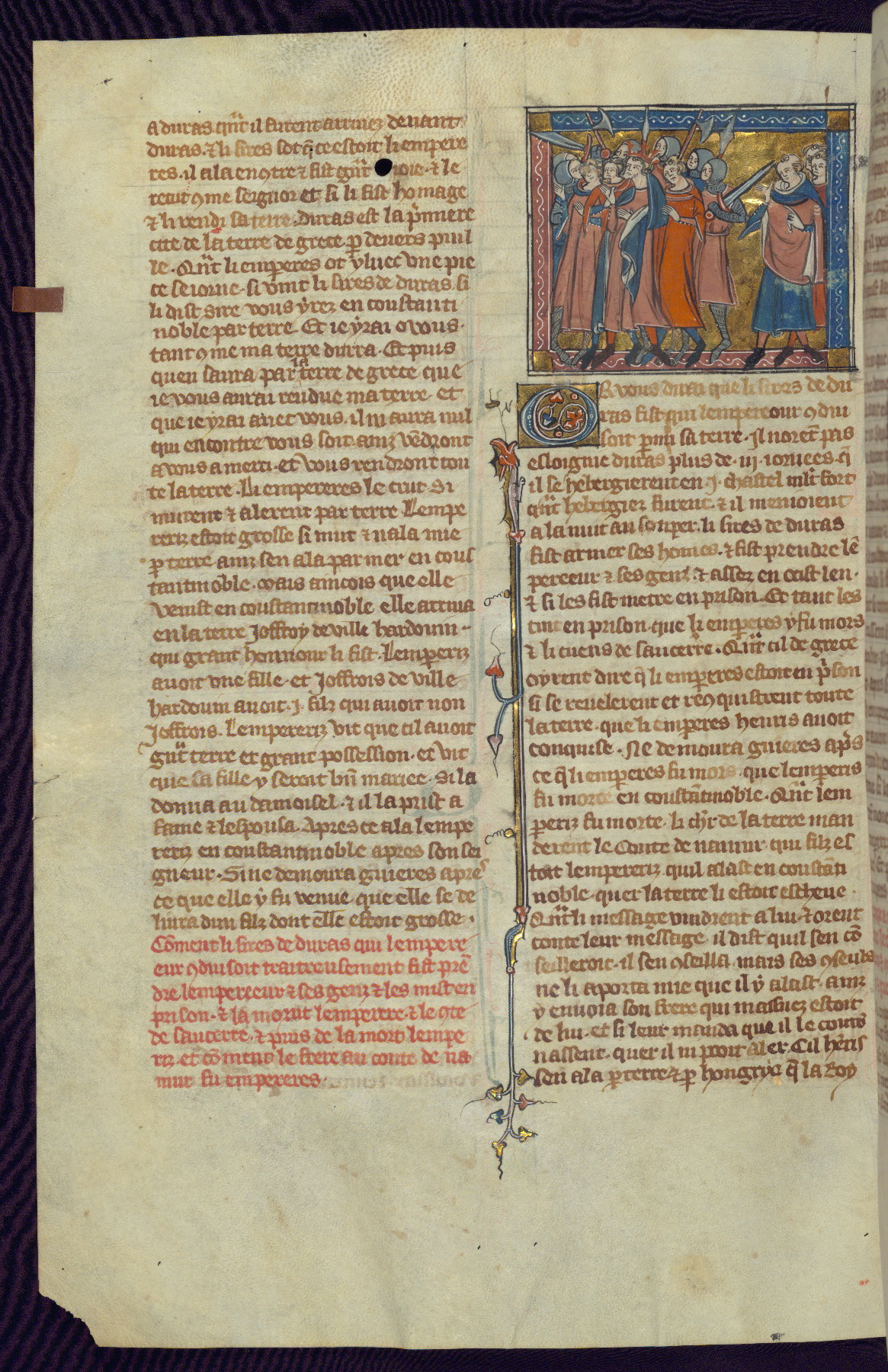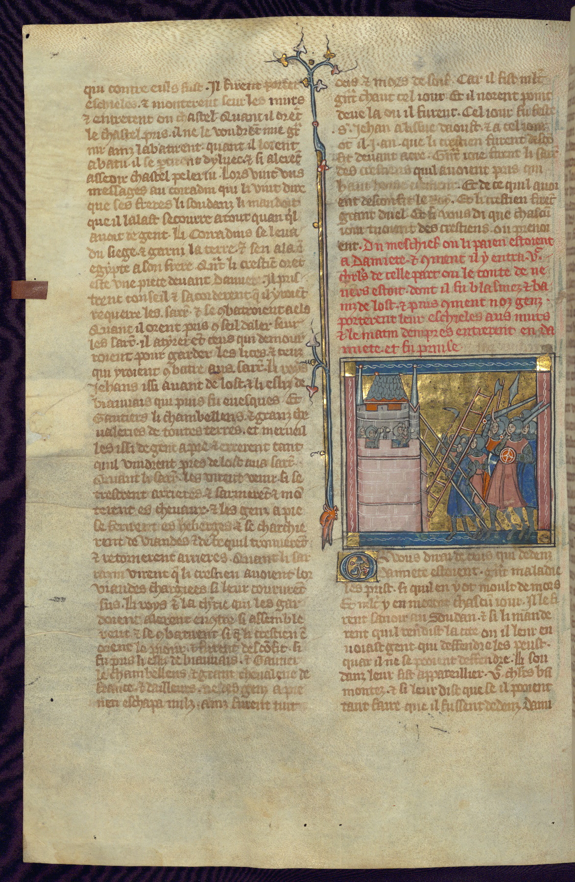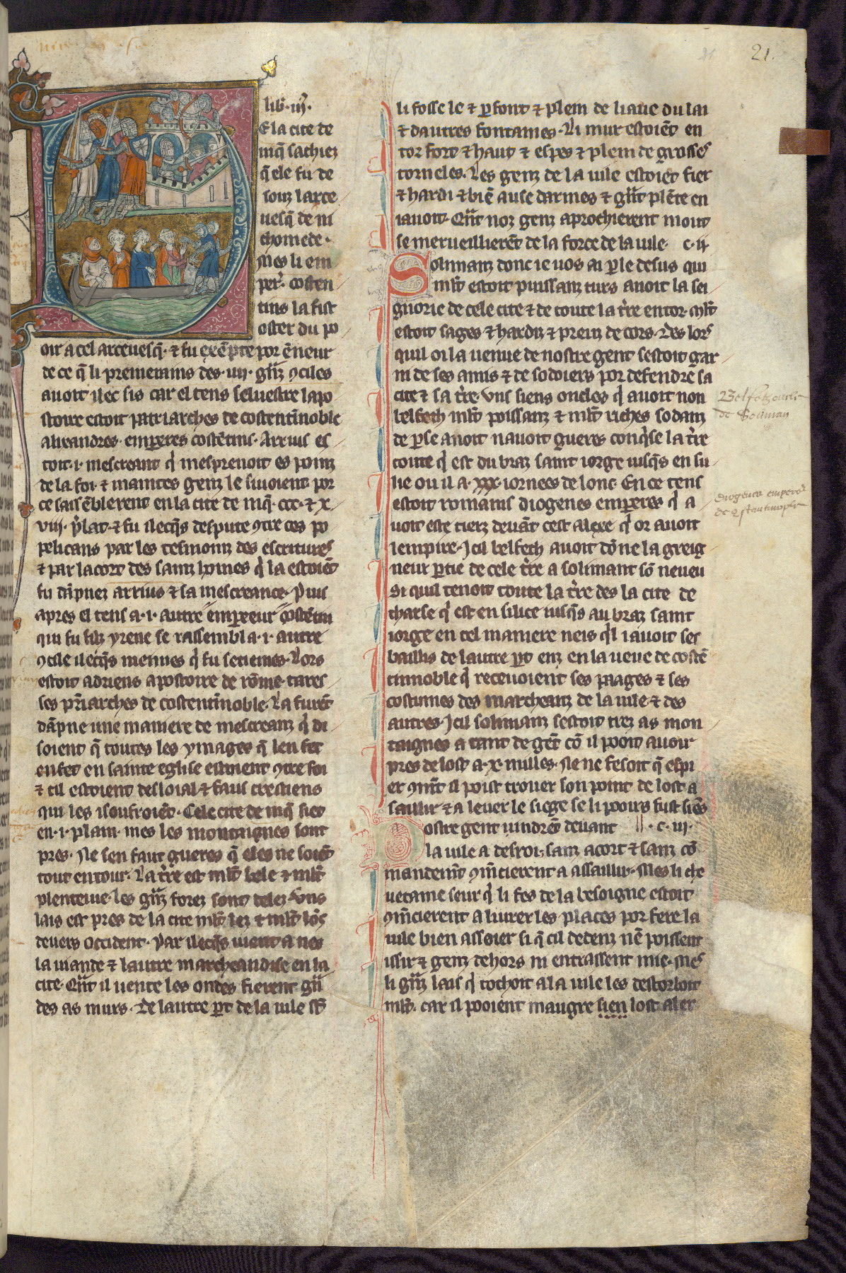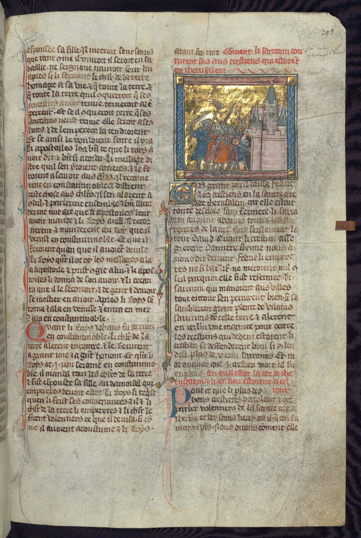 - Title: Historiated initial "V" with Firuz preparing to kill his brother as crusaders return / Crusaders enter Antioch, gates opened from within by compatriots