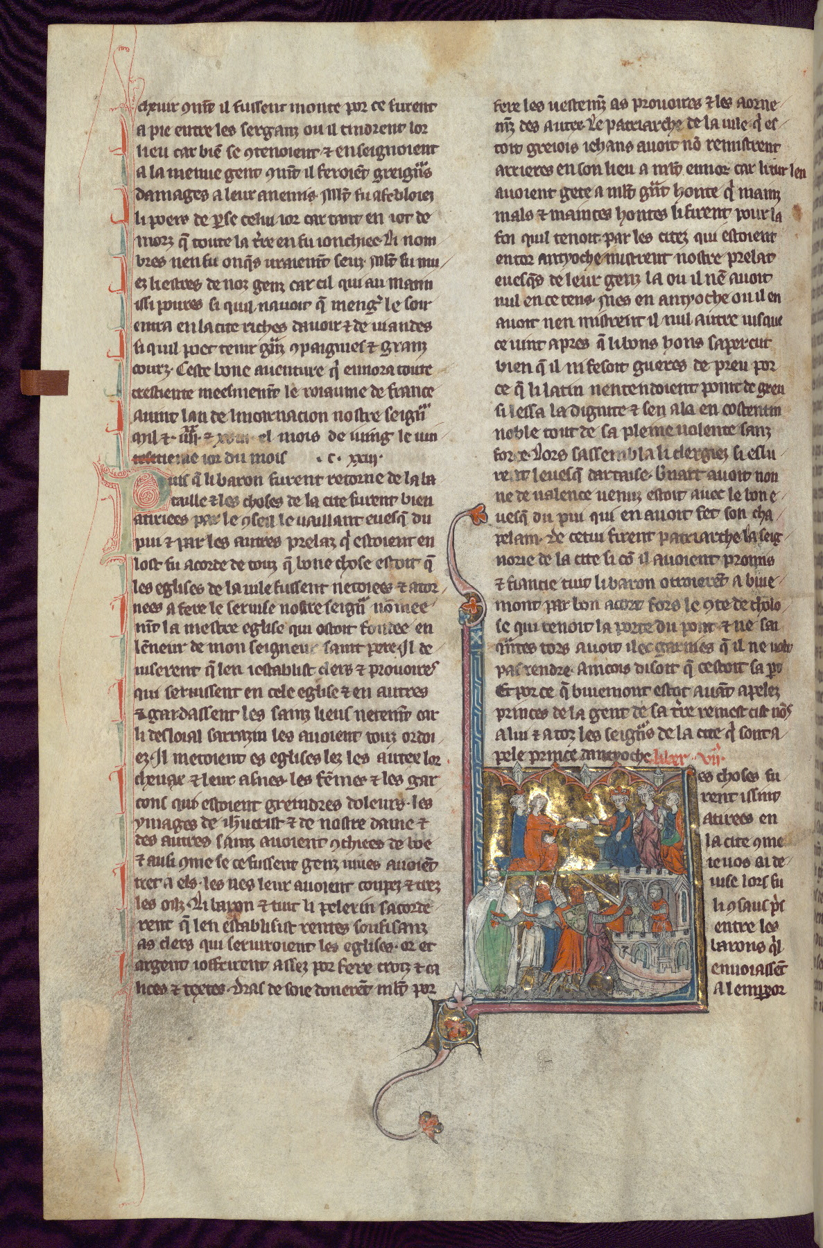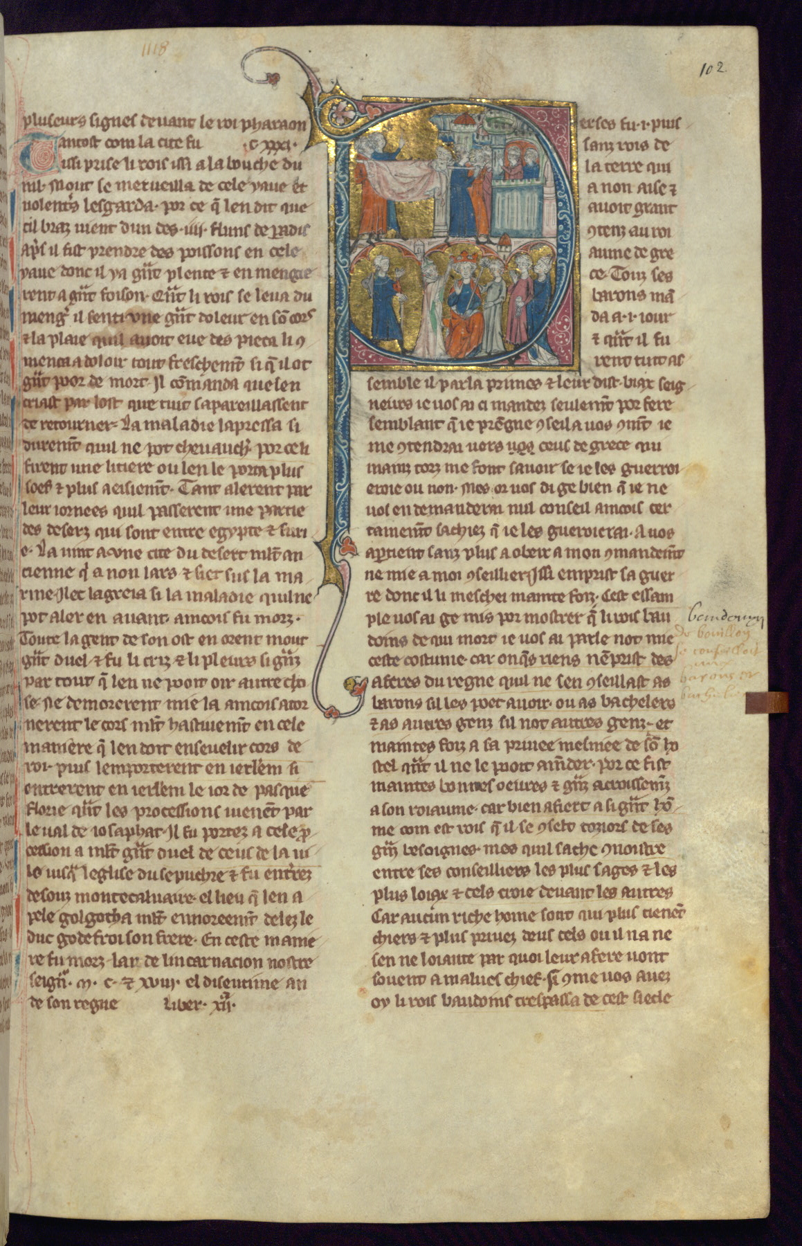- Title: Historiated initial "P" with Baldwin I returning to Jerusalem for burial on Palm Sunday, 118 AD / Coronation of Baldwin II at Bethlehem, messenger at left bringing news of Eustace of Boulogne's support of Baldwin II