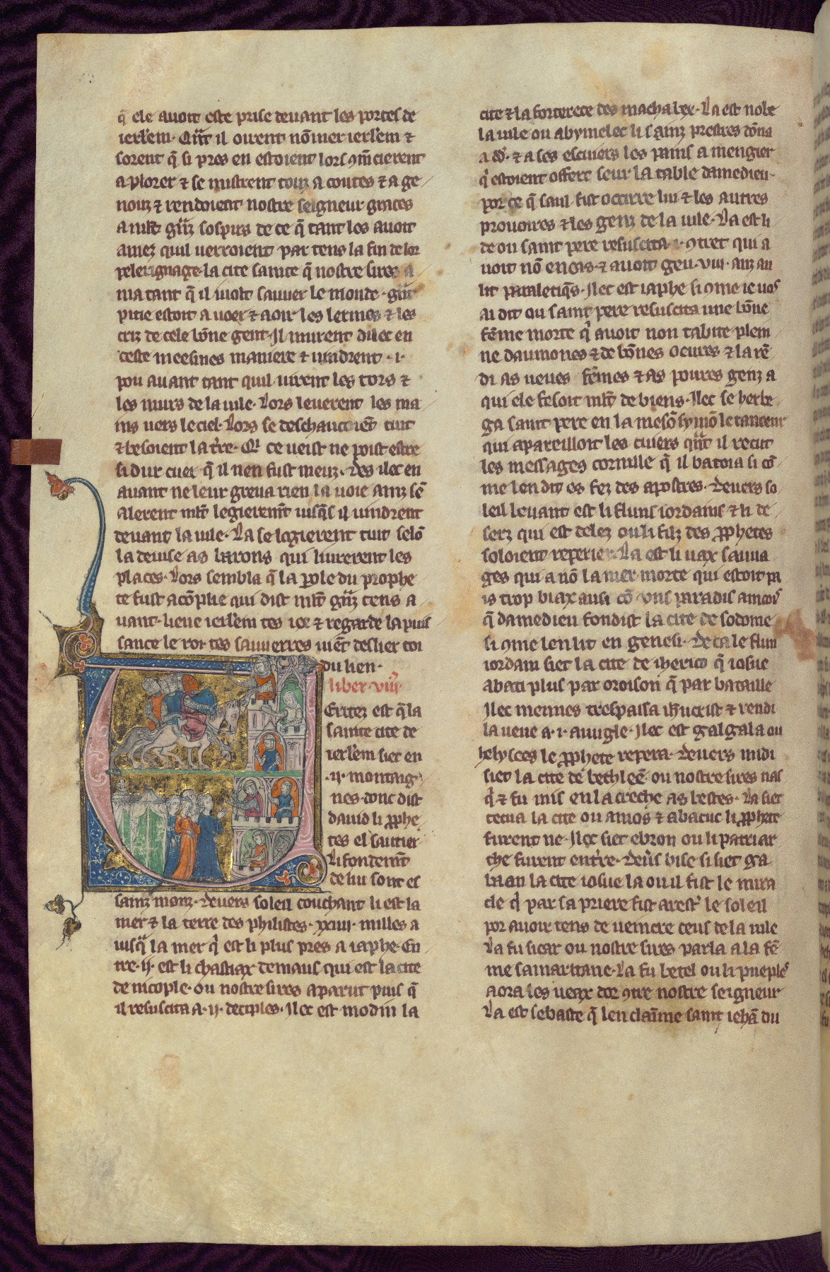 William II, Archbishop of Tyre (ca. 1130-1190) began this monumental historical account of the First Crusade and its subsequent Western rulers ca. 1167. Titled "History of Deeds Done Beyond the Sea," this chronicle was continued by the author until his death ca. 1190. Shortly thereafter, the manuscript was translated from the original Latin into French. The French edition, Estoire d'Eracles, was completed in two stages, ca. 1300-40, not only preserving the history of the Crusades as recorded until 1190 by William of Tyre (fols. 1-236), but also including two continuations that were added to the volume ca. 1340, some forty years later than the original portion of the text. Featuring twenty-seven panel miniatures and twenty-two historiated initials, this stunning chronicle is one of few that survives to this day.