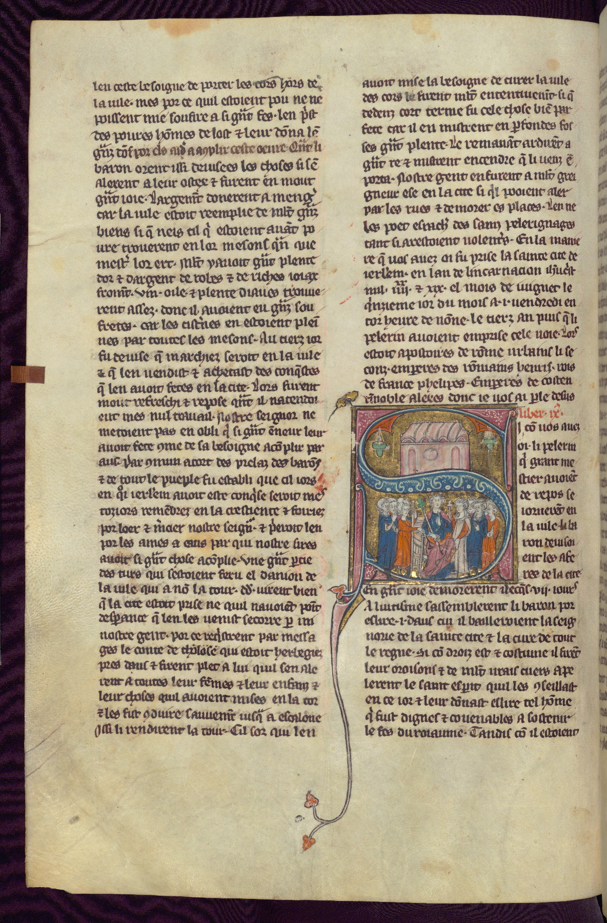 - Title: Historiated initial "S" with The Holy Sepulchre / Godefroy de Bouillon enthroned, holding green trefoil topped septre, acclaimed by subjects as new ruler of Jerusalem