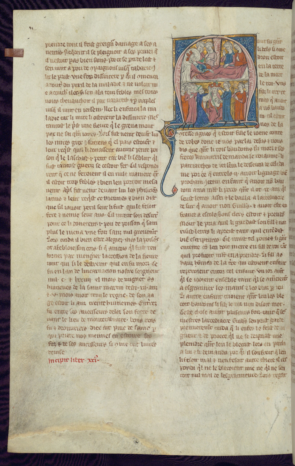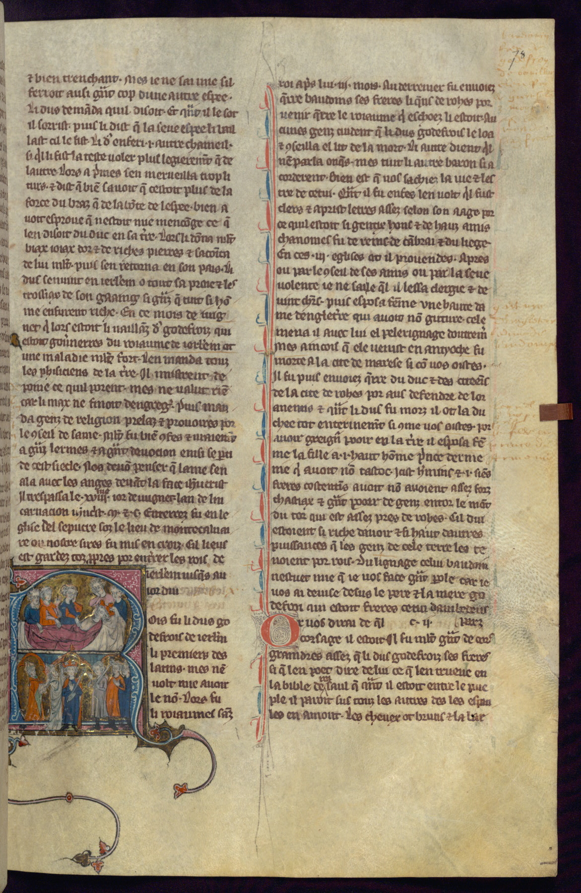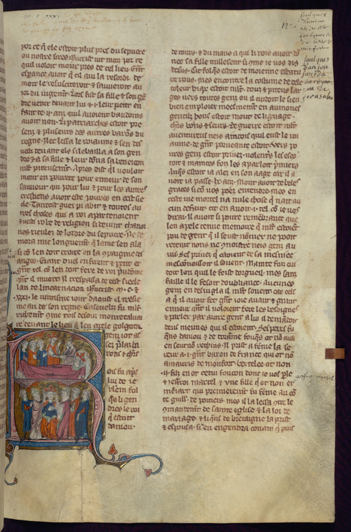 - Title: Historiated initial "R" with King Baldwin II on deathbed, death mourned by newly crowned King Fulk and four men / Coronation of King Fulk by two bishops; Melisinda at far right beside man, another man at far left