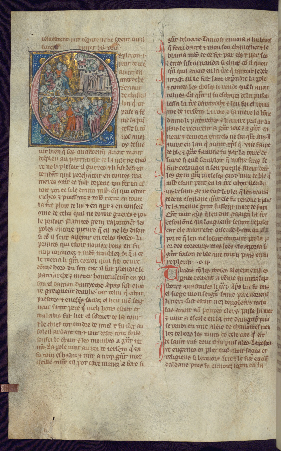 - Title: Historiated initial "O" with Abuse of Patriarch of Antioch through exposure on tower / Raynaud of Chatillon on horseback, orders men to seize Patriarch