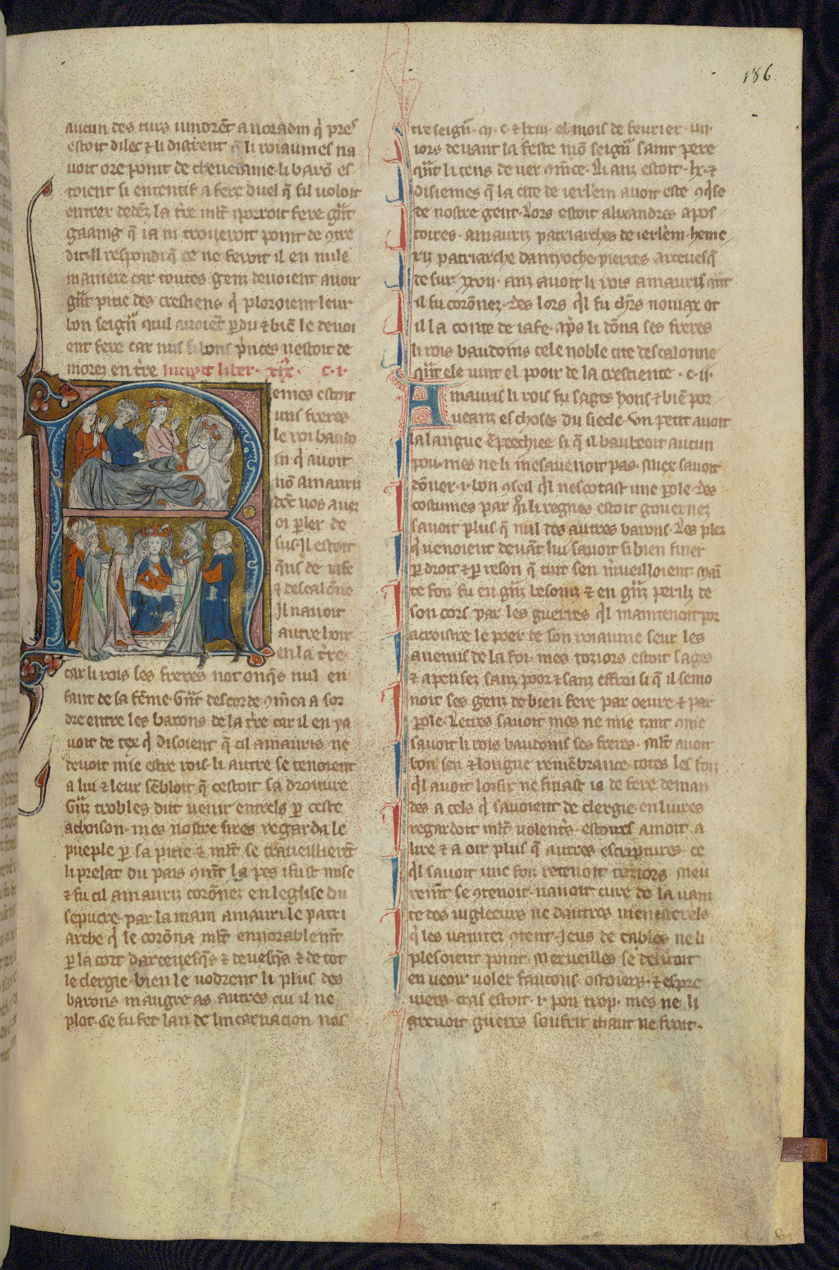 - Title: Historiated initial "R" with King Baldwin III on deathbed, death mourned by newly crowned King Amaury and two men / Coronation of Amaury I by two bishops at left