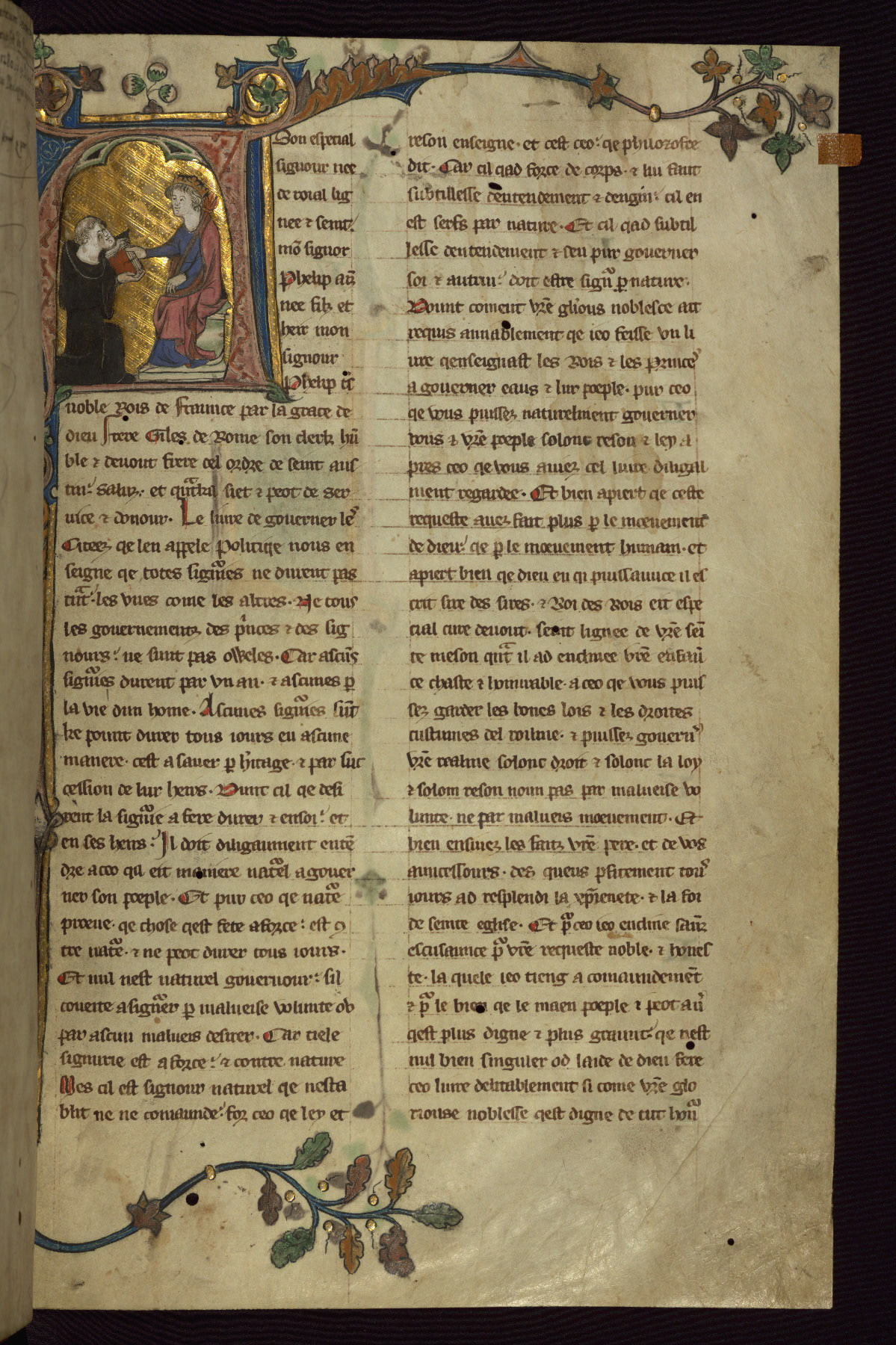 The Augustinian monk and archbishop of Bourges Giles of Rome dedicated his De regimine principum to “his special lord Lord Philip [the future Philip IV, or Philip the Fair], first-born son and heir of the most famous man Lord Philip [Philip III] by the grace of God most illustrious king of France” (suo domino speciali Domino Philippo primogenito & hæredi præclarissimi viri Domini Philippi dei gratia Illustrissimi Regis Francorum). As the future Philip the Fair would have been no more than thirteen years old at the time of the commission, it seems likely that the manuscript's actual patron was his father, Philip III.