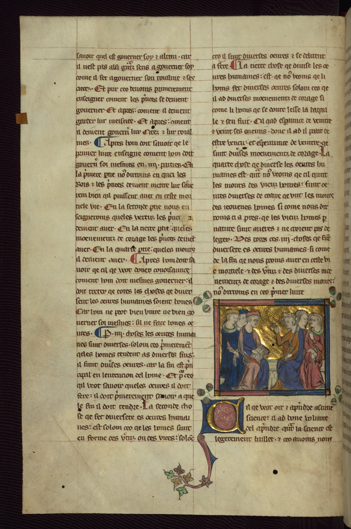 This illumination depicts a prince consulting and receiving the advice of learned counselors, an apt subject to illustrate a text on the art of government. One of the scholars in the miniature points to the pages of a book that lies open on his lap, while the seated king raises his right hand in a gesture for attention.