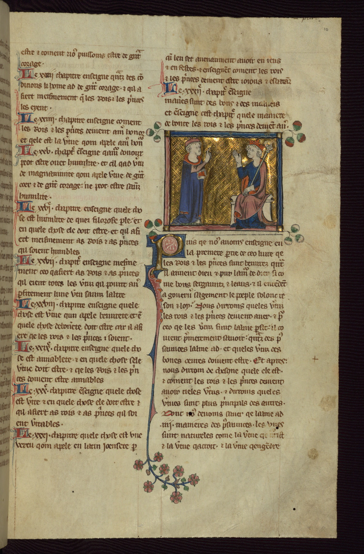 This early fourteenth-century English manuscript is an example of Henri de Gauchy’s French translation of De regimine principum, a text that is an important witness to the flowering of the “mirror for princes” genre at the courts of the Capetian kings of France. Giles of Rome first composed De regimine principum for Philip the Fair of France around 1277, and it was soon translated into several vernacular languages. Henri de Gauchy’s was the most prolifically copied of the French translations, and remains extant in thirty-one copies, six of which are of English origin. W.144 is one of a cluster of illuminated manuscripts of a political nature produced during the last years of the reign of King Edward II and the minority of Edward III, a tumultuous period in English history during which concerns about good government came to the fore. Although the manuscript contains no evidence of ownership prior to 1463, the quality of the illumination in W.144 suggests that this book was originally destined for a king or member of the nobility. The text is divided into three books intended to instruct princes on their ethical, economic, and political responsibilities: the conduct of the individual ruler; the rule of the family and household; and, the governance of the kingdom. Scenes of princes and scholars conversing, as wells as princes instructing their queens and children, are among the ten miniatures and historiated initials. Stylistically, the book is a member of the Queen Mary Psalter group (London, British Library Royal 2 B VII), although aspects of its illumination also relate it to other important groups of manuscripts produced in early fourteenth-century England.