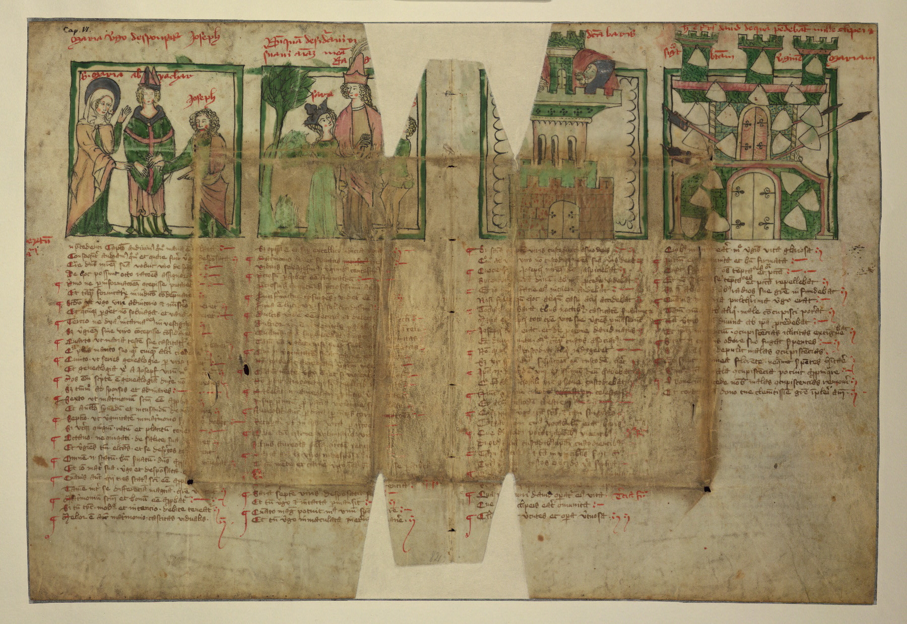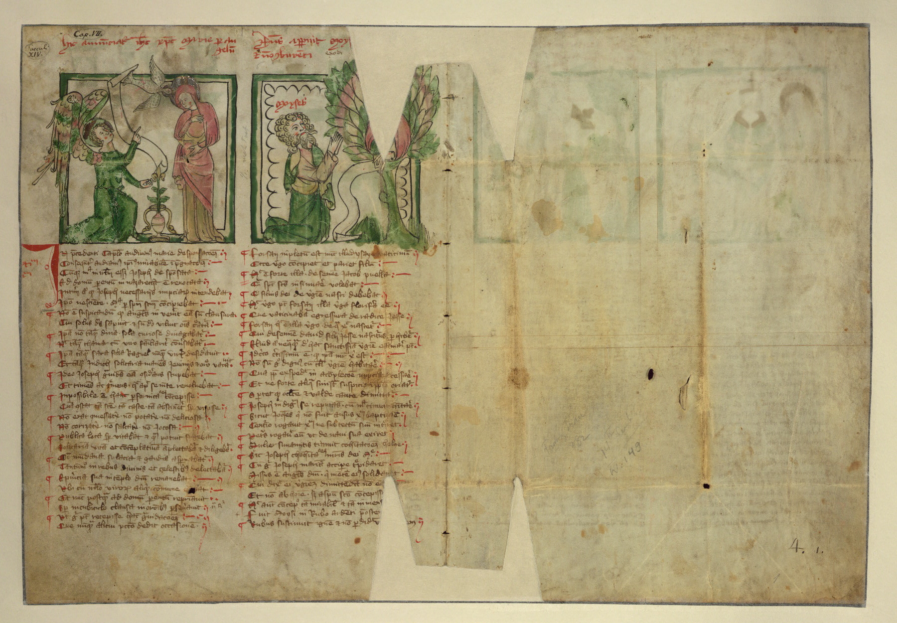 This a fragment of a manuscript that was made in Germany in the late fourteenth century. It was part of a brightly illuminated copy of a popular anonymous treatise called the Speculum humanae salvationis, or Mirror of human salvation, in which events of the Old Testament were compared to those of the New. In this example, as was often the case, each column is headed by a miniature. These pages were reused as a wrapper for a book at some later time. The ghosting of the book it adorned can still be seen in the dark, abraded portion that spans the two pages. By the nineteenth century, the value of the pages was recognized, and they were restored to their state as a bifolium.