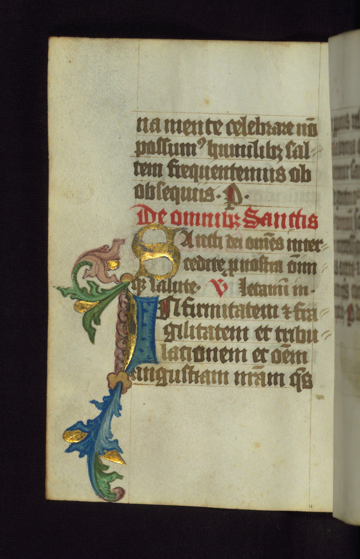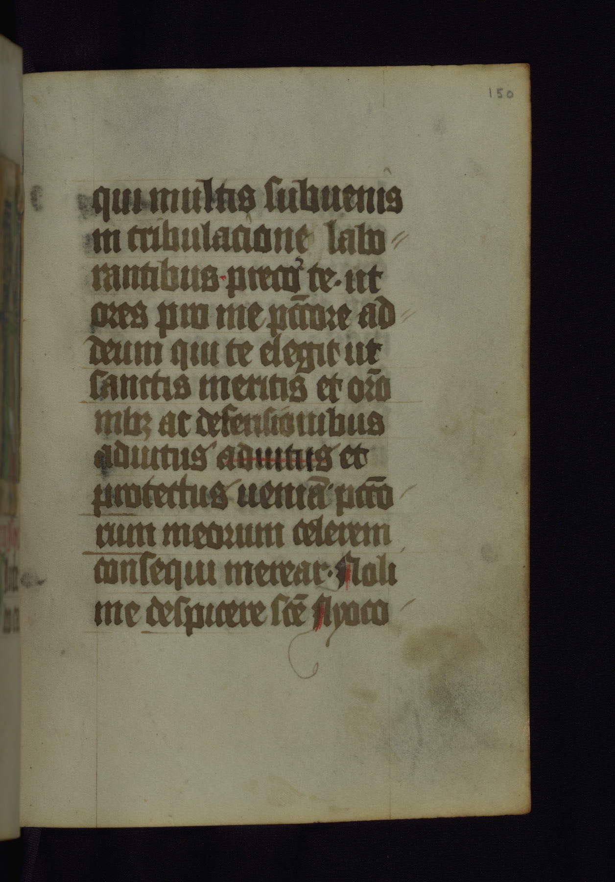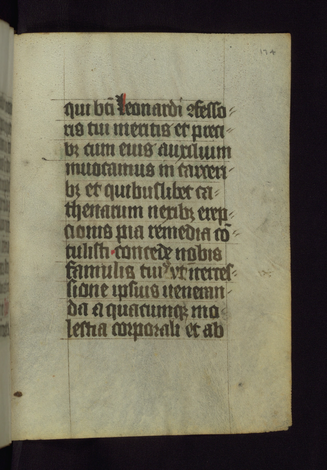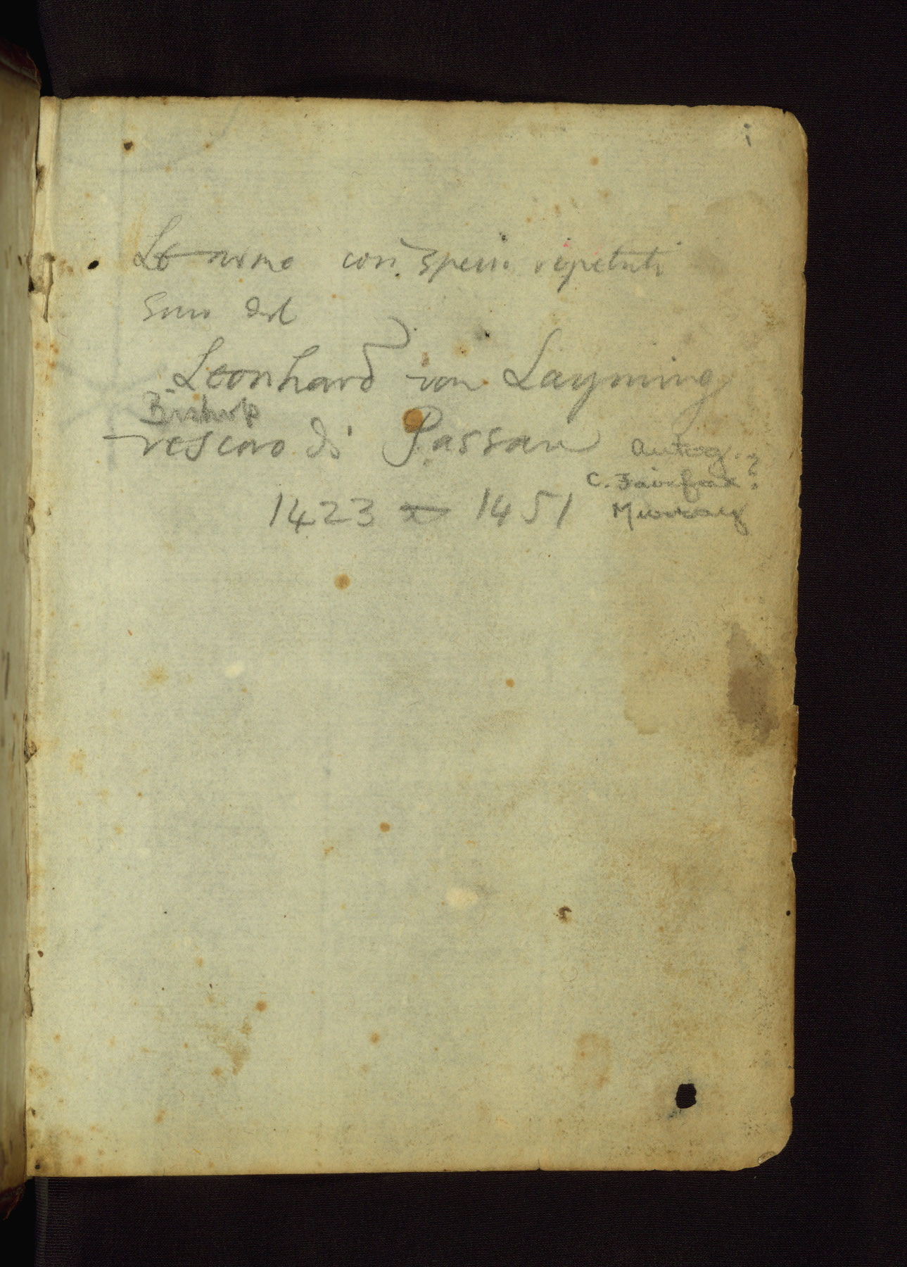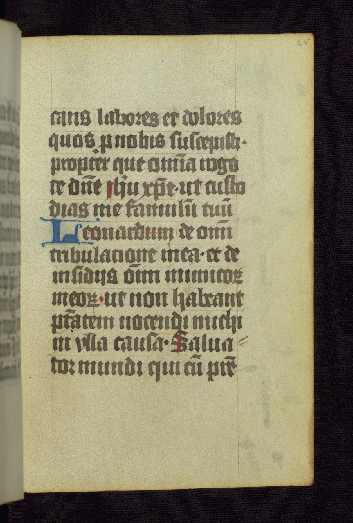 This late medieval German prayer book is an example of a highly personal devotional item. It was originally made ca. 1440 for Leonhard von Laymingen, bishop of Passau (fl. 1423-1451). The text primarily features a series of prayers to various saints as well as prayers for travelings. Many illuminations and some text pages have been excised, but the book is nonetheless extensively decorated. The prayer book's illuminations consist of thirty miniatures and four historiated initials that complement the text, usually with illustrations of saints. Bishop von Laymingen appears in his prayer book several times kneeling before the saint to which that particular prayer is dedicated. Additionally, the Laymingen coat of arms appears twenty times throughout the book.