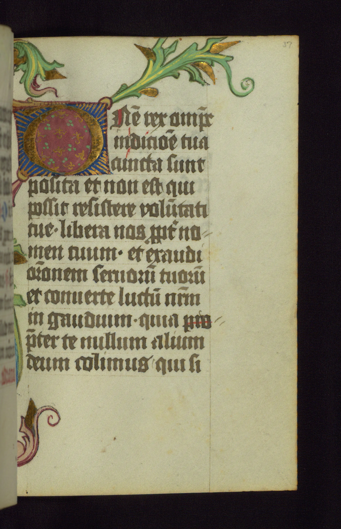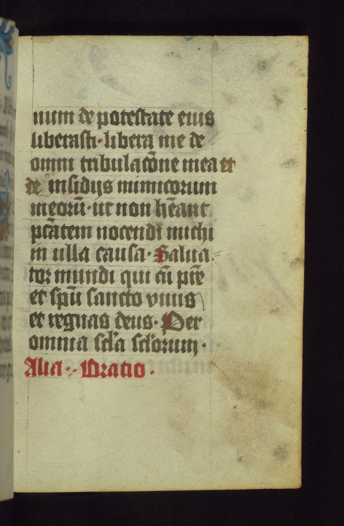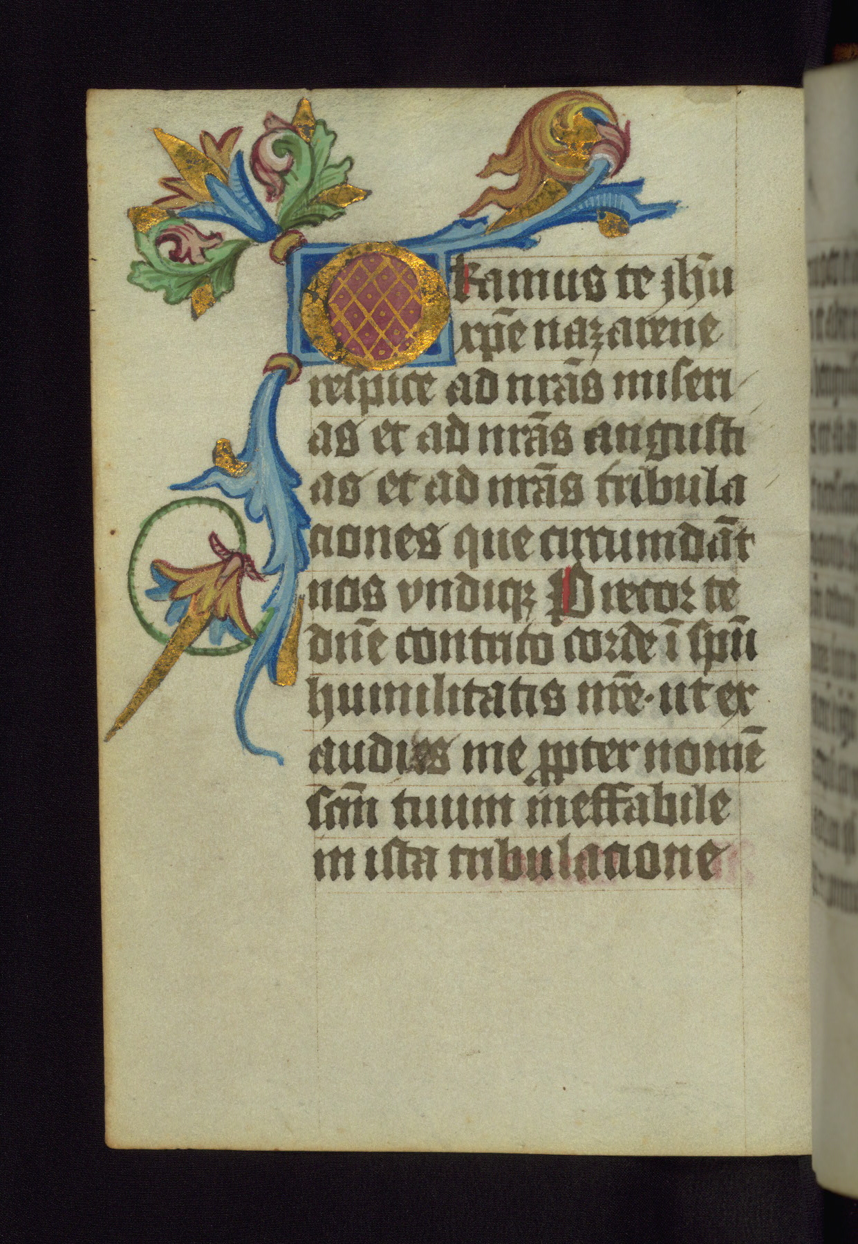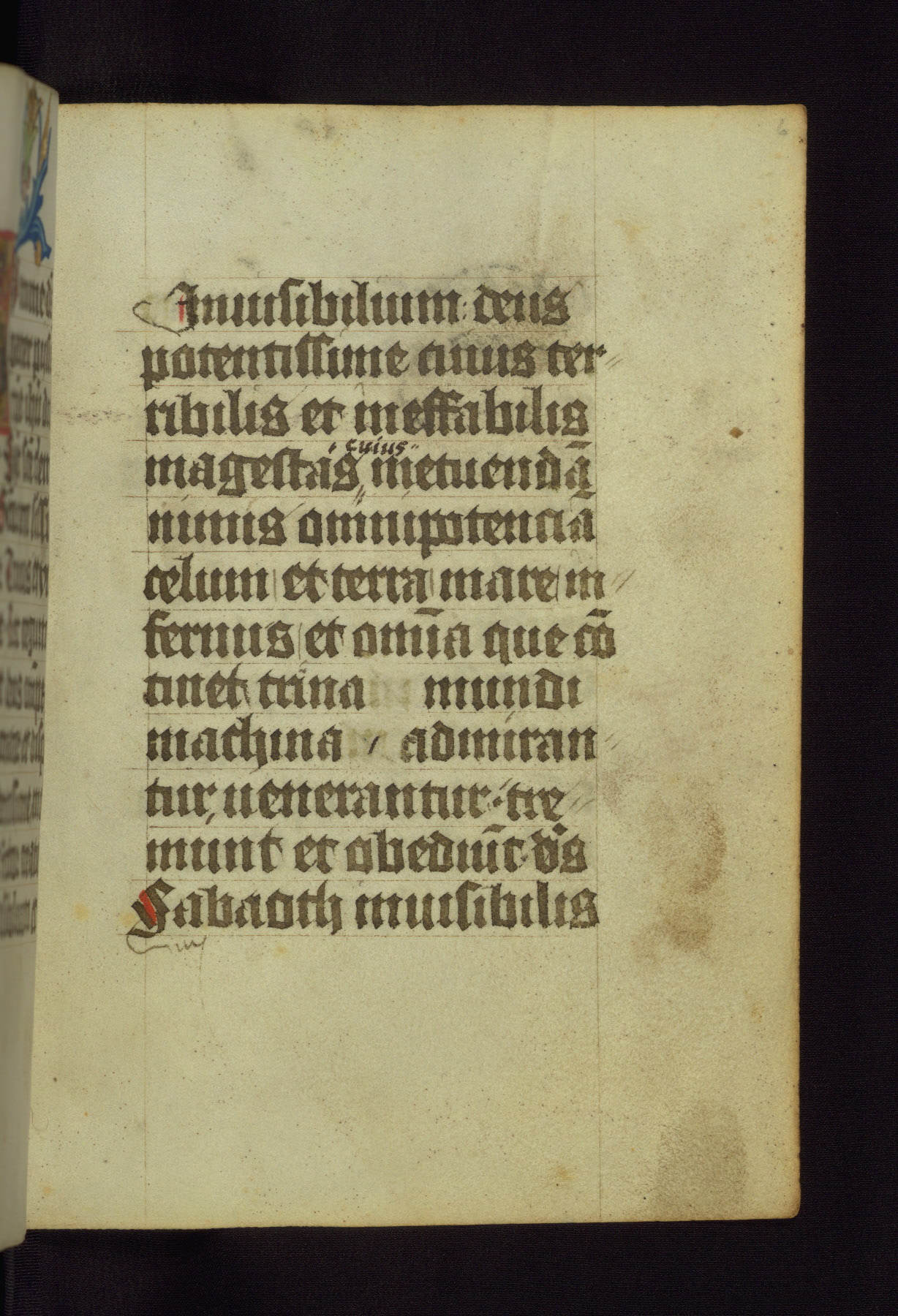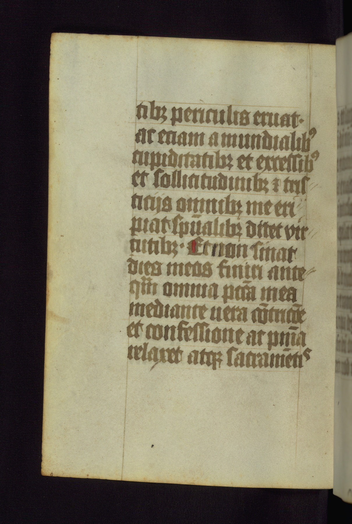 This late medieval German prayer book is an example of a highly personal devotional item. It was originally made ca. 1440 for Leonhard von Laymingen, bishop of Passau (fl. 1423-1451). The text primarily features a series of prayers to various saints as well as prayers for travelings. Many illuminations and some text pages have been excised, but the book is nonetheless extensively decorated. The prayer book's illuminations consist of thirty miniatures and four historiated initials that complement the text, usually with illustrations of saints. Bishop von Laymingen appears in his prayer book several times kneeling before the saint to which that particular prayer is dedicated. Additionally, the Laymingen coat of arms appears twenty times throughout the book.