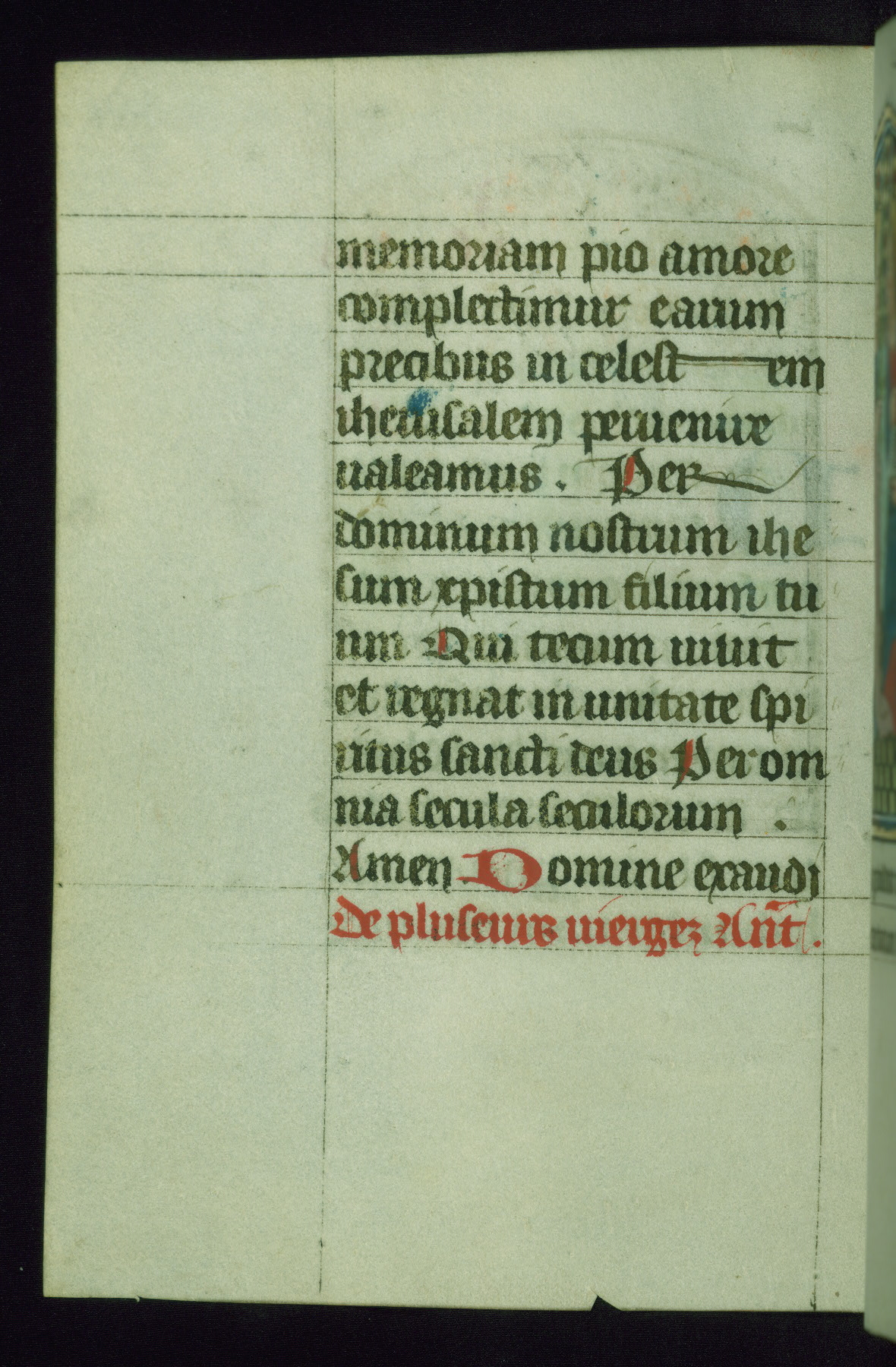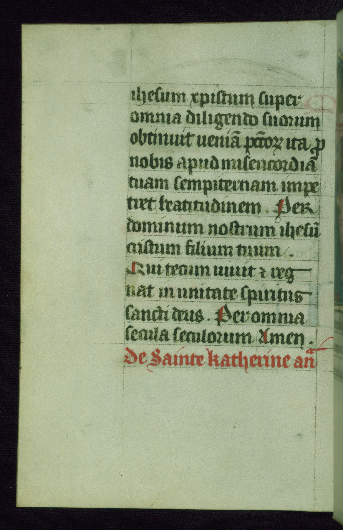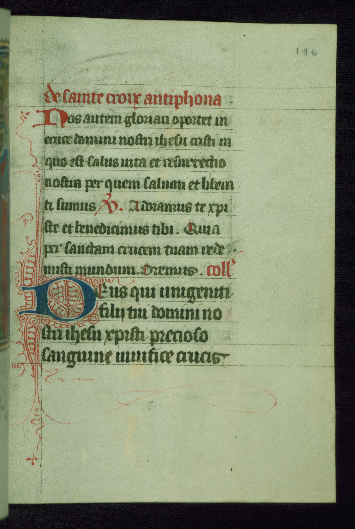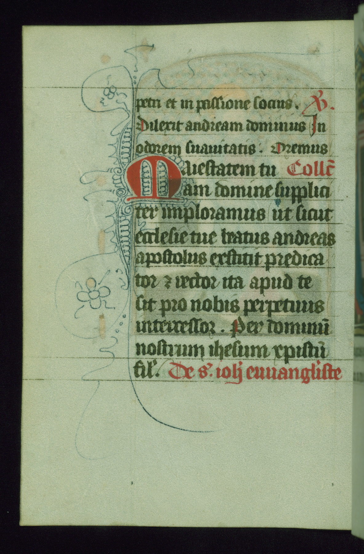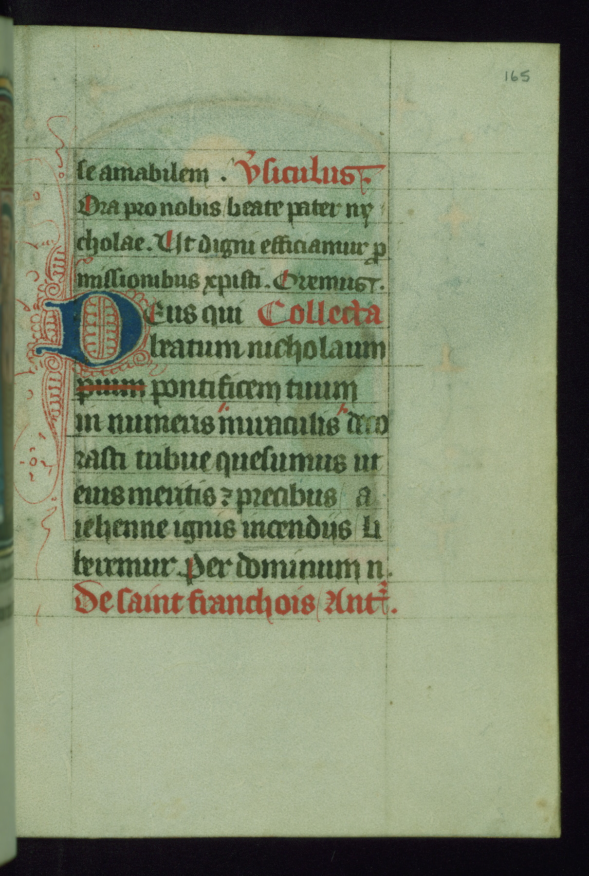 This prayer book was produced ca. 1430-40, likely in Brabant, but the contents of the calendar point to Tournai and Cambrai, and the Office of the Dead is for the use of Liège. North Netherlandish influence, possibly connected with works by the Masters of the Gold Scrolls, is suggested by the style and iconography of its images. The manuscript is notable for its large number of miniatures--forty-eight in total--as well as the sense of narrative within them, and the diversity of the suffrages they illustrate is striking. That the original owner had a strong interest in the Passion is evident in both the choice of texts and the images. The manuscript was well used, and accrued not only additional prayers and suffrages, but devotional objects as well: a pilgrim's badge was once attached to the corner of the image for the suffrage to relics on fol. 160r.