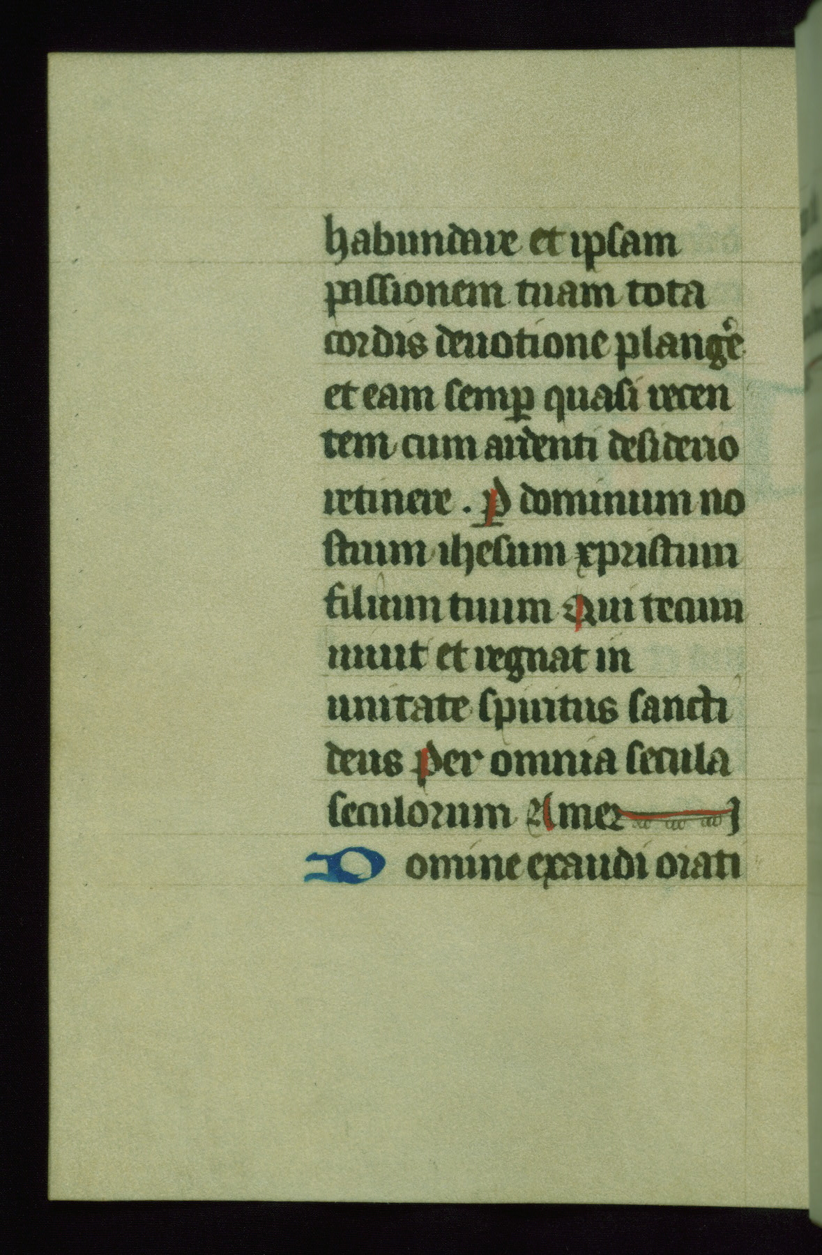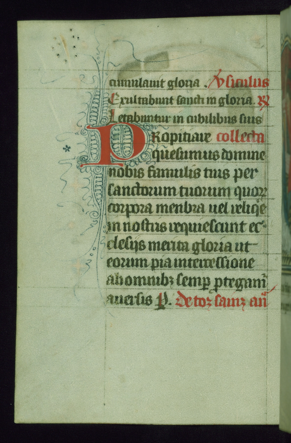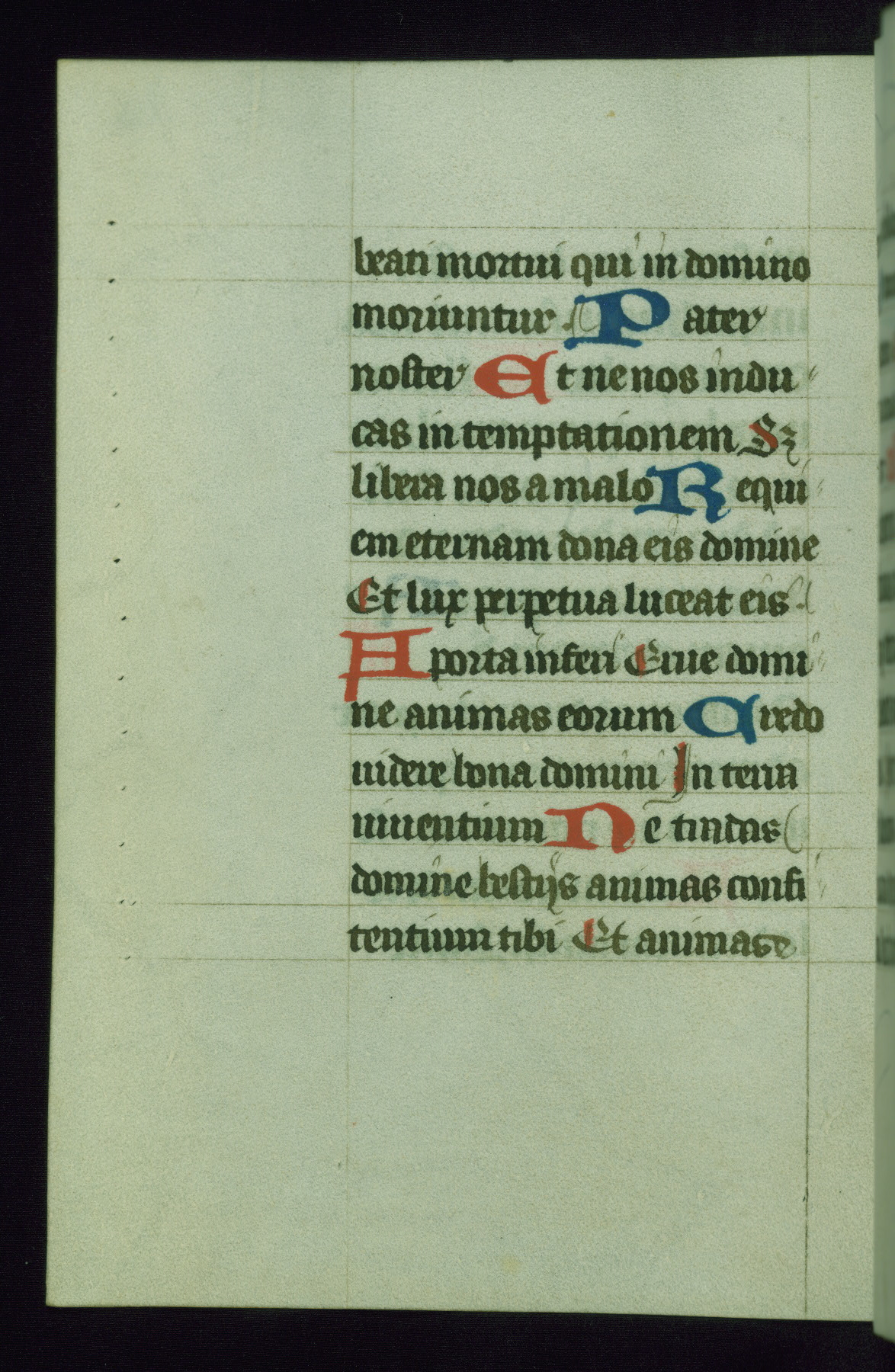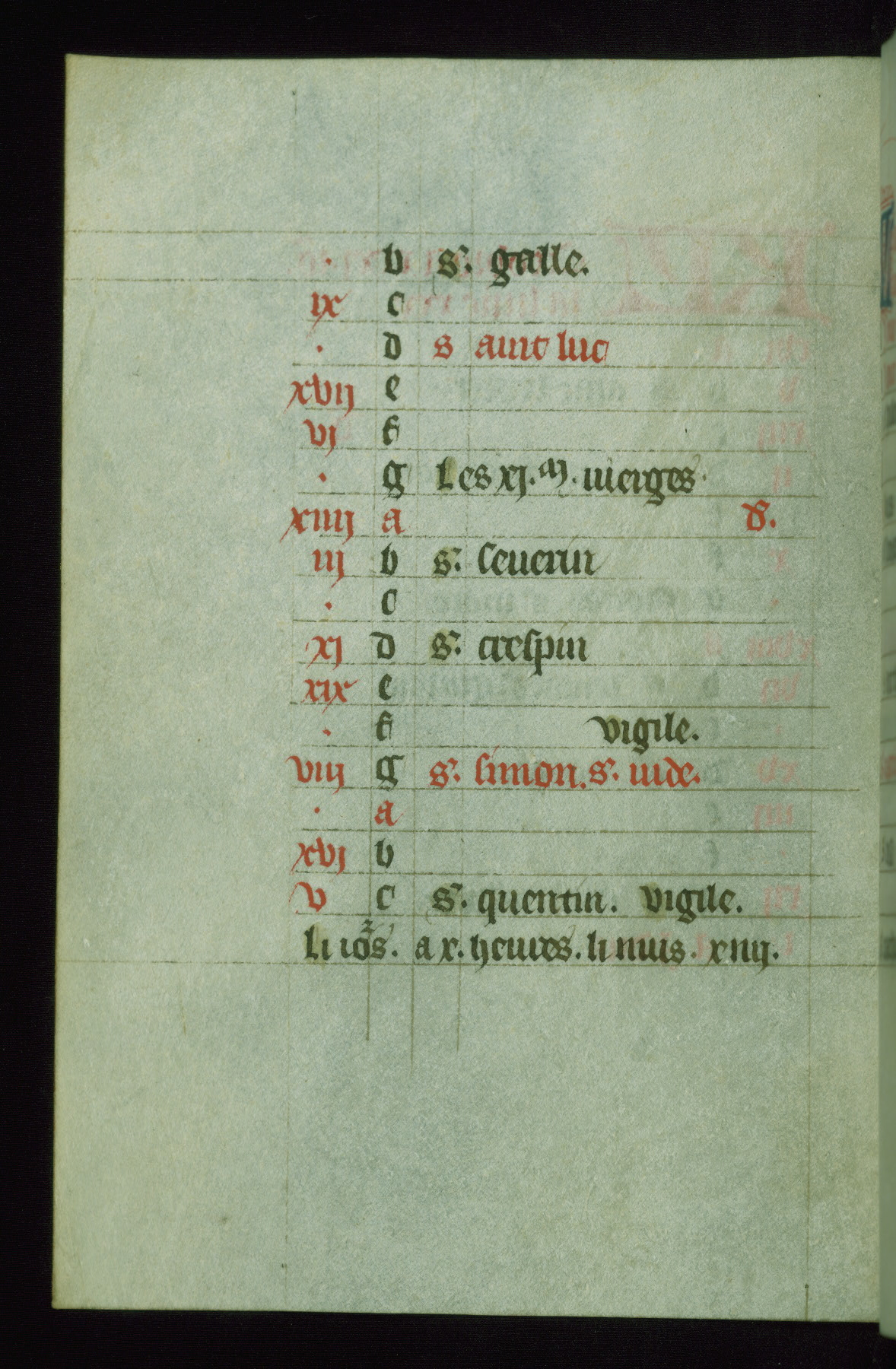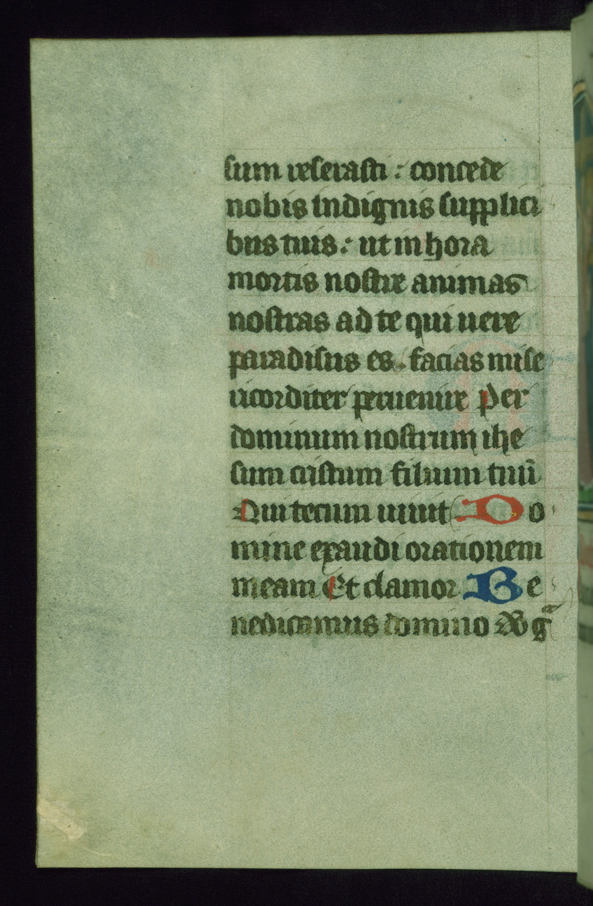 This prayer book was produced ca. 1430-40, likely in Brabant, but the contents of the calendar point to Tournai and Cambrai, and the Office of the Dead is for the use of Liège. North Netherlandish influence, possibly connected with works by the Masters of the Gold Scrolls, is suggested by the style and iconography of its images. The manuscript is notable for its large number of miniatures--forty-eight in total--as well as the sense of narrative within them, and the diversity of the suffrages they illustrate is striking. That the original owner had a strong interest in the Passion is evident in both the choice of texts and the images. The manuscript was well used, and accrued not only additional prayers and suffrages, but devotional objects as well: a pilgrim's badge was once attached to the corner of the image for the suffrage to relics on fol. 160r.