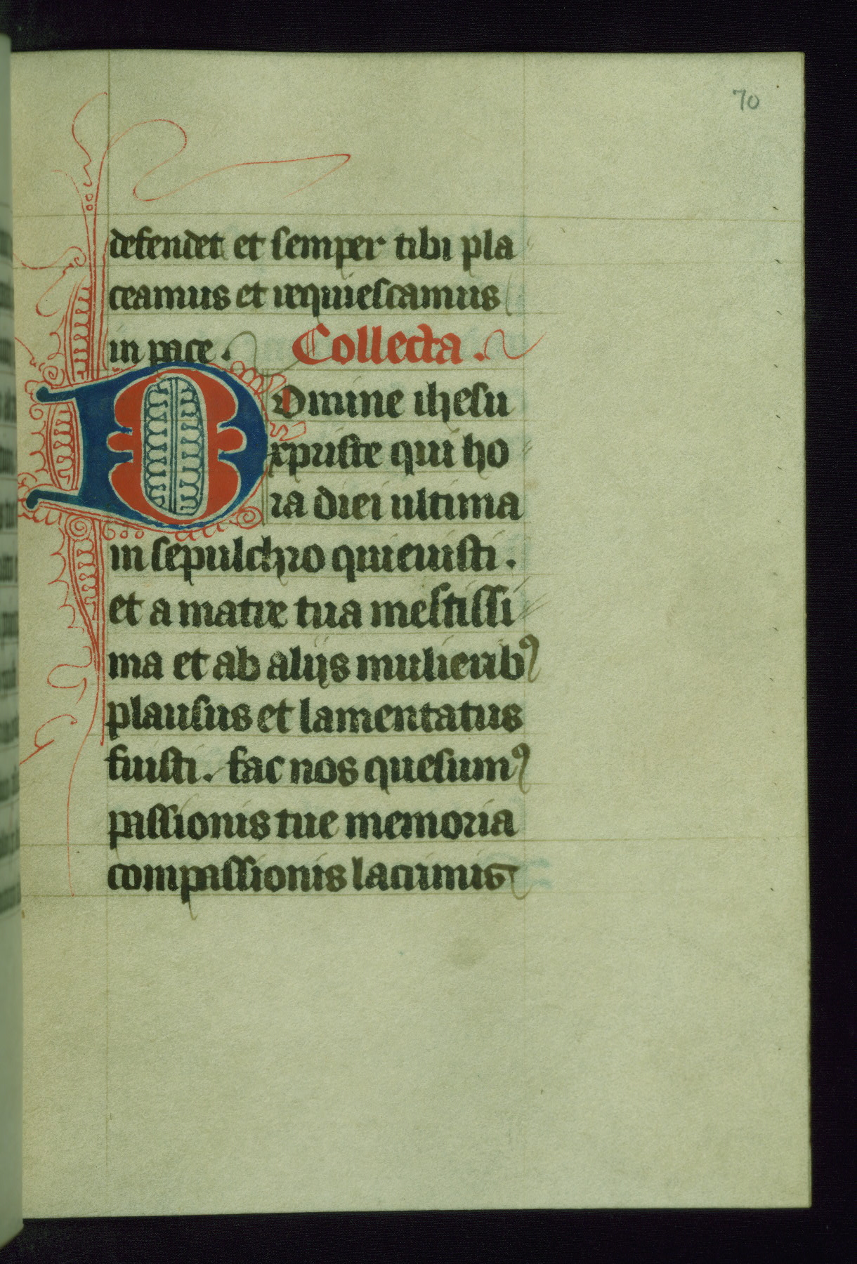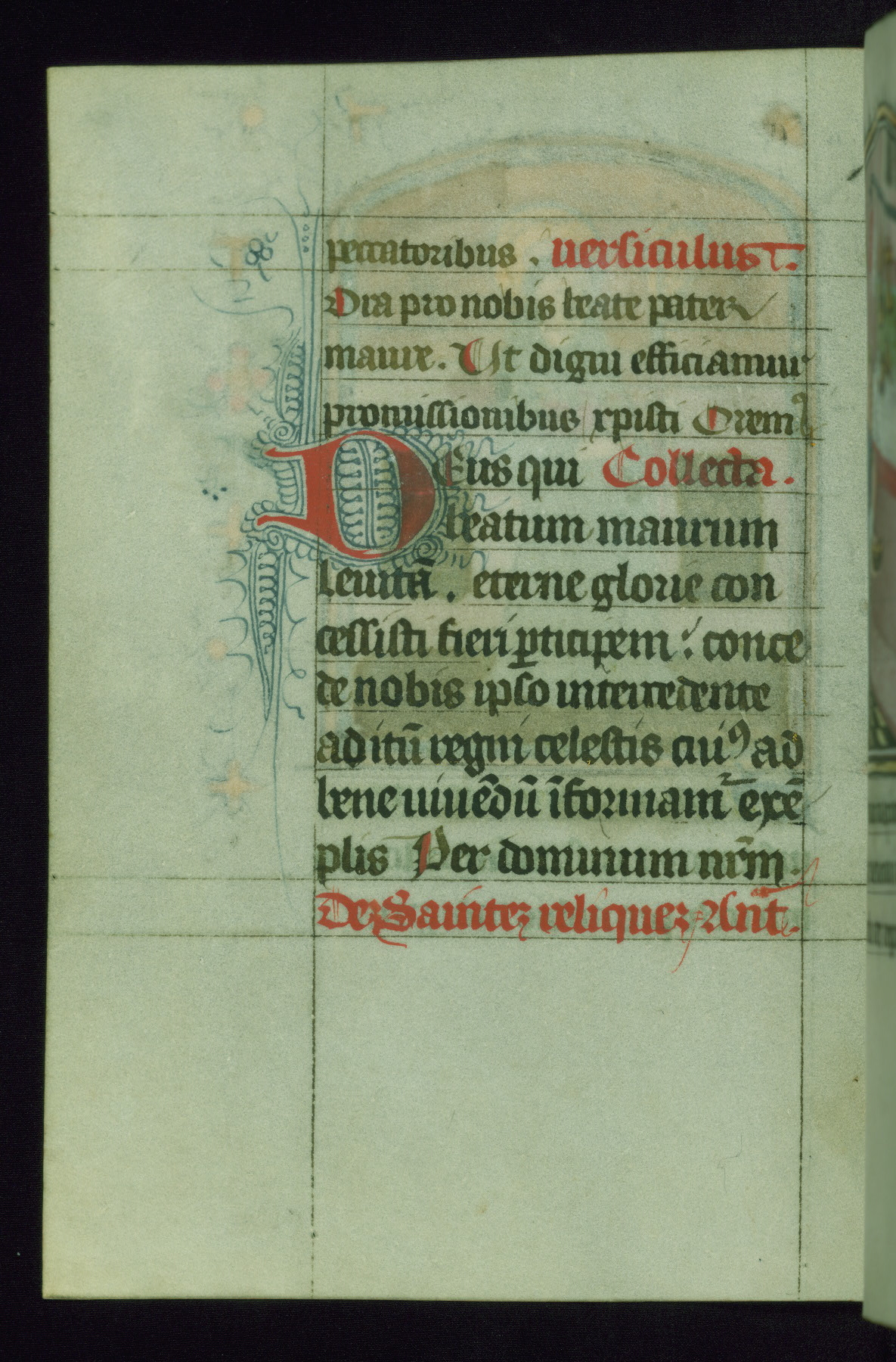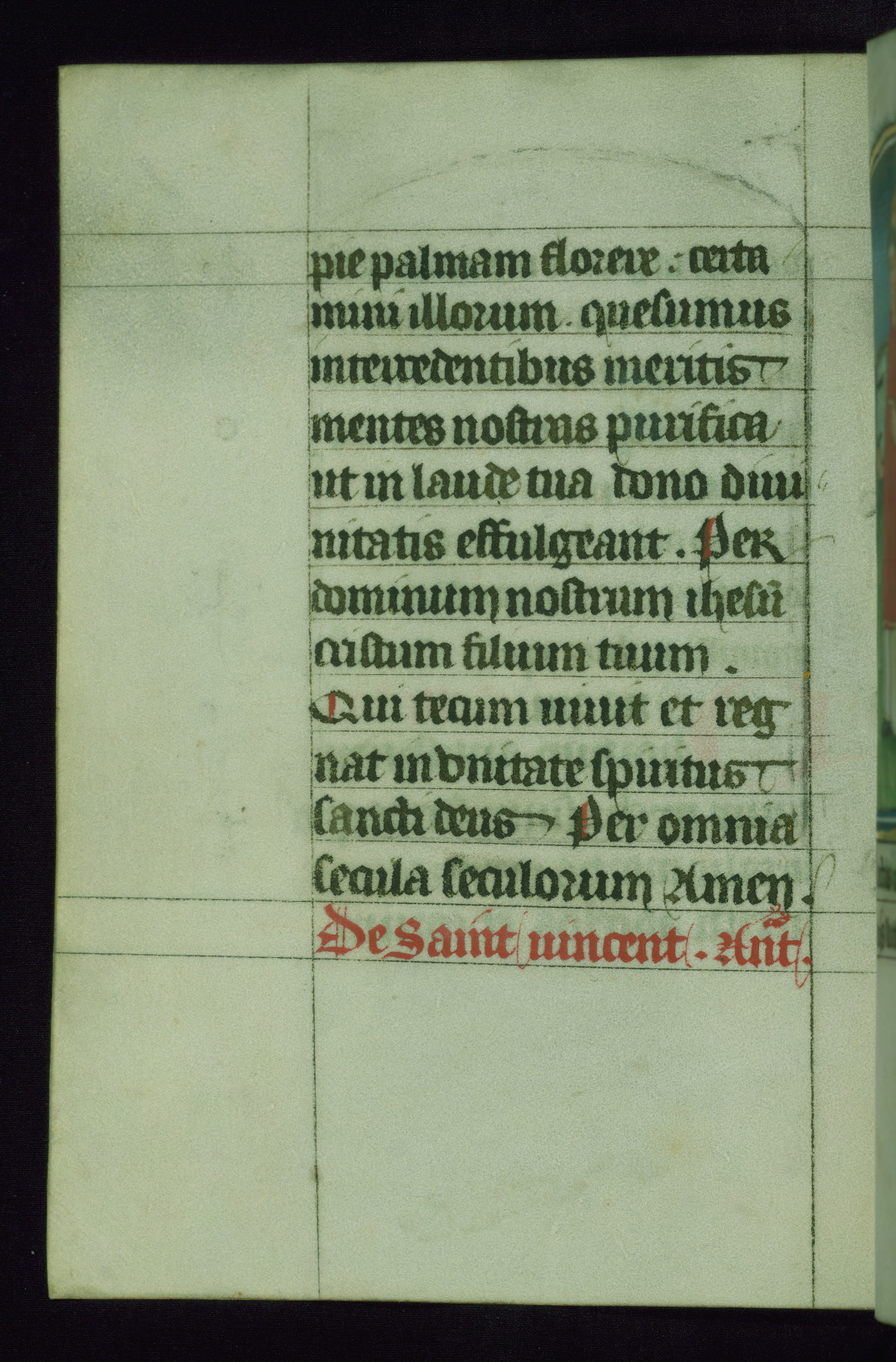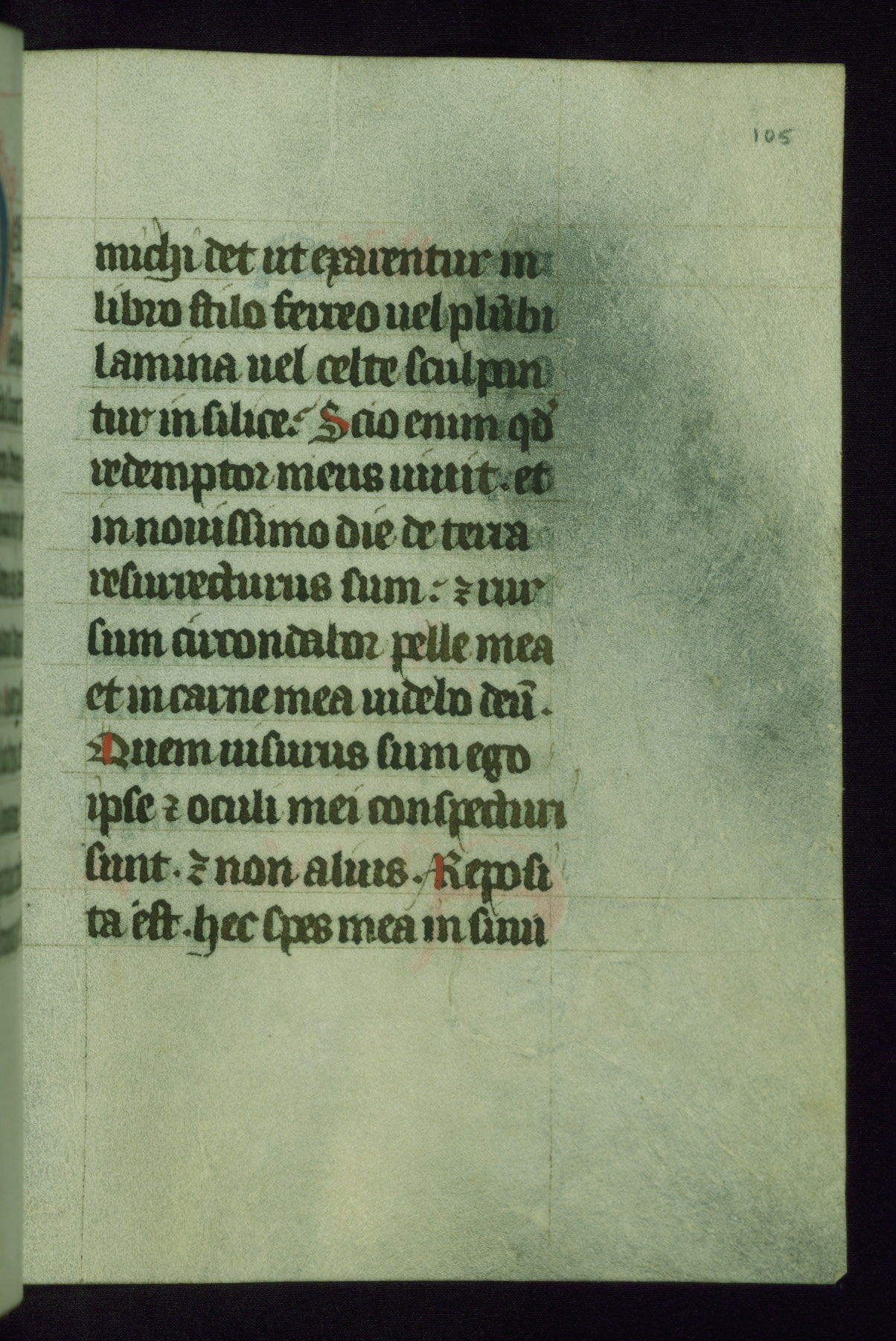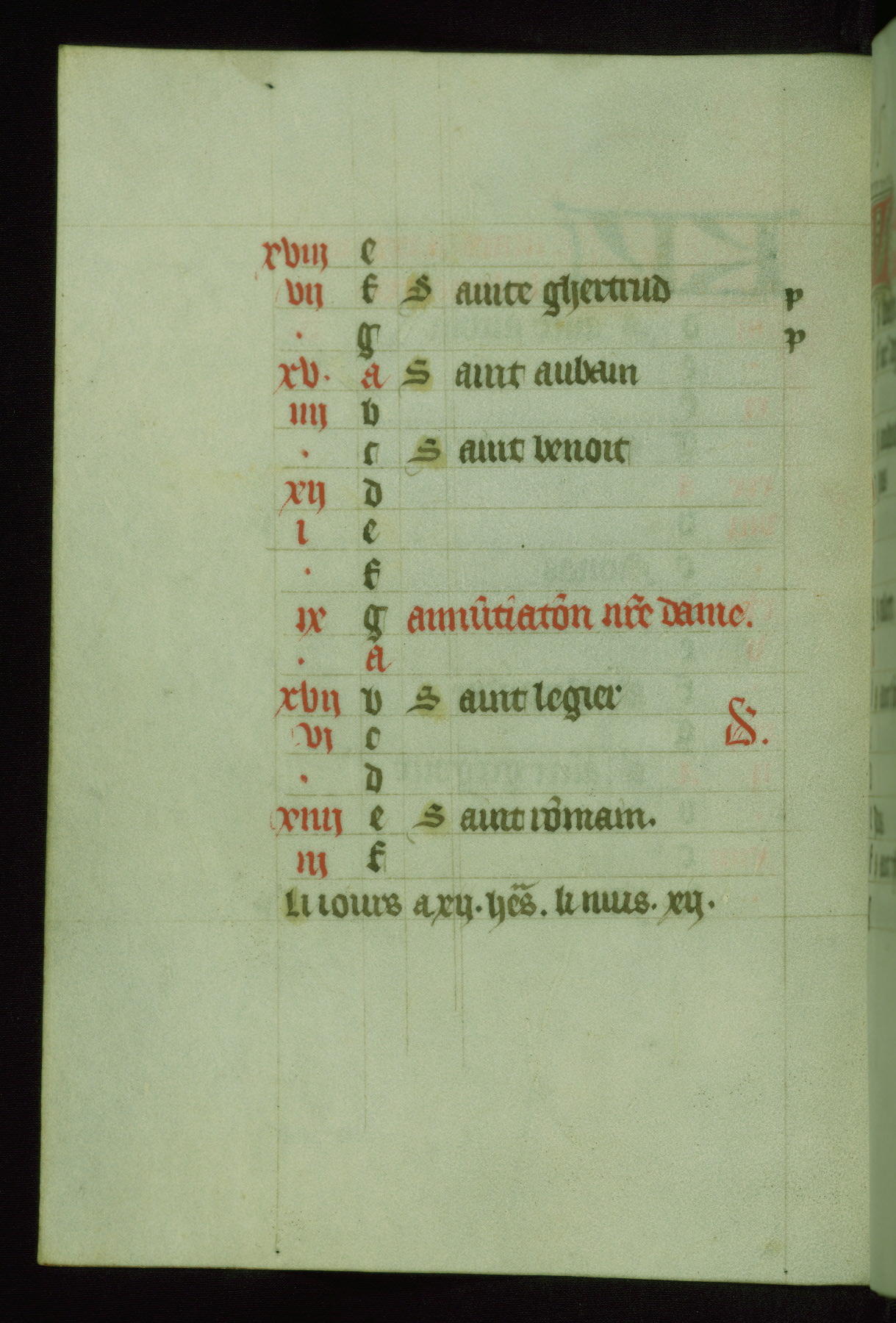 This prayer book was produced ca. 1430-40, likely in Brabant, but the contents of the calendar point to Tournai and Cambrai, and the Office of the Dead is for the use of Liège. North Netherlandish influence, possibly connected with works by the Masters of the Gold Scrolls, is suggested by the style and iconography of its images. The manuscript is notable for its large number of miniatures--forty-eight in total--as well as the sense of narrative within them, and the diversity of the suffrages they illustrate is striking. That the original owner had a strong interest in the Passion is evident in both the choice of texts and the images. The manuscript was well used, and accrued not only additional prayers and suffrages, but devotional objects as well: a pilgrim's badge was once attached to the corner of the image for the suffrage to relics on fol. 160r.
