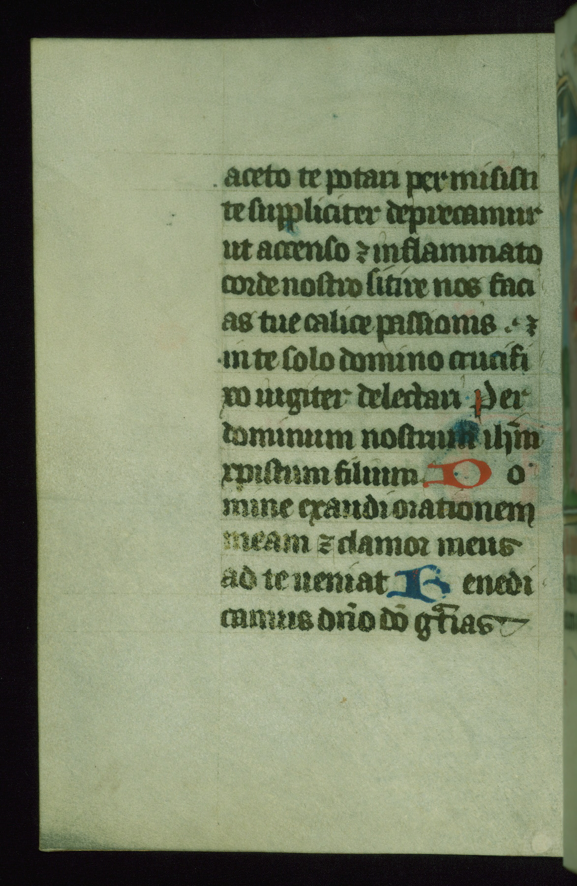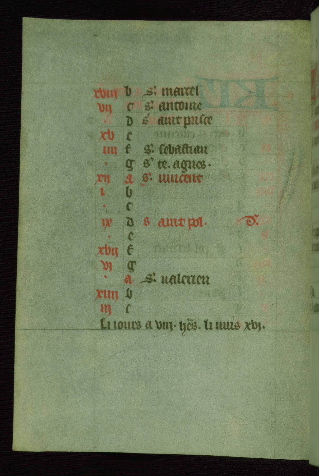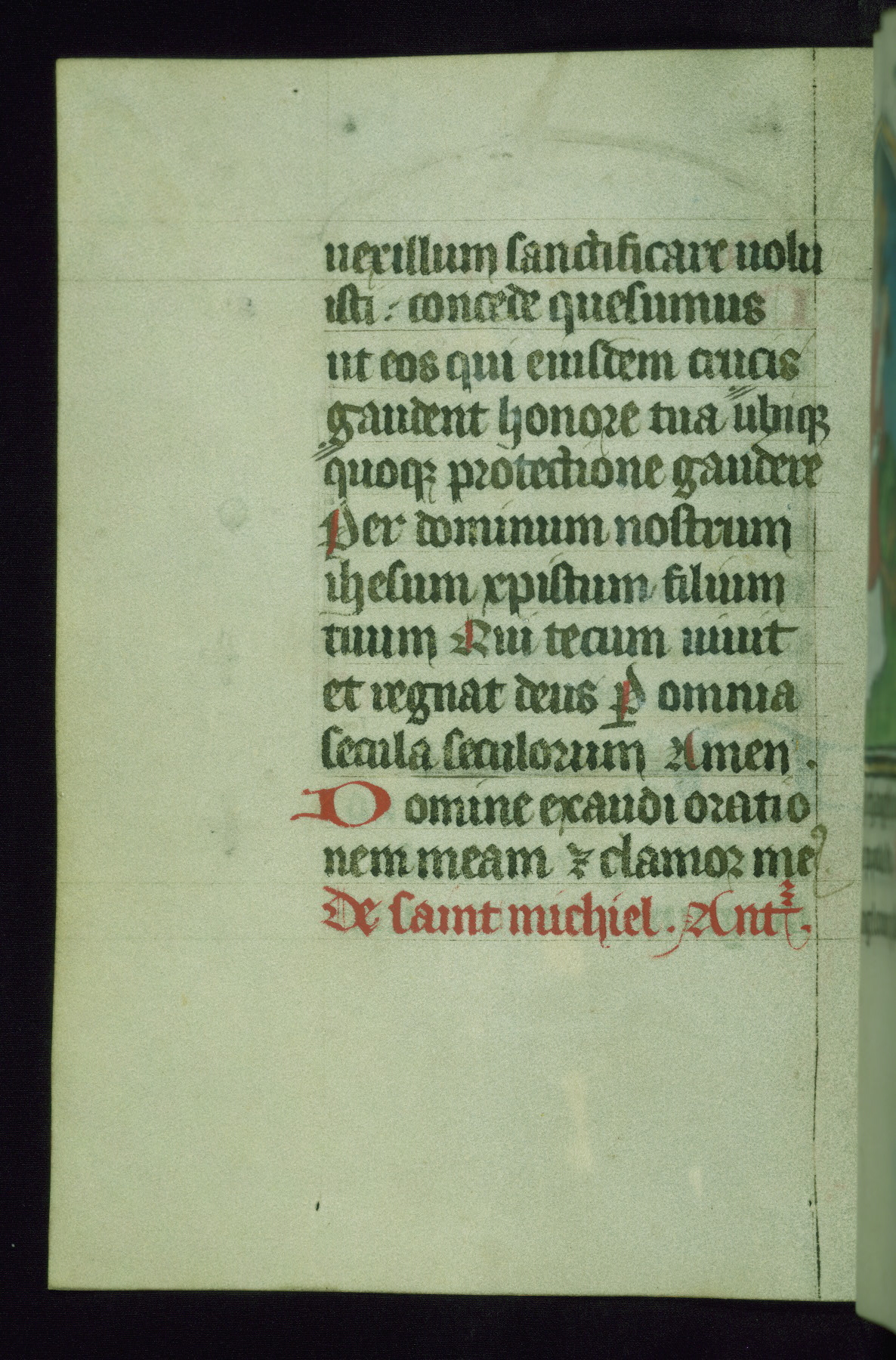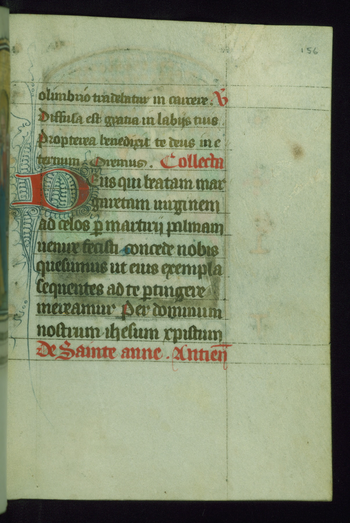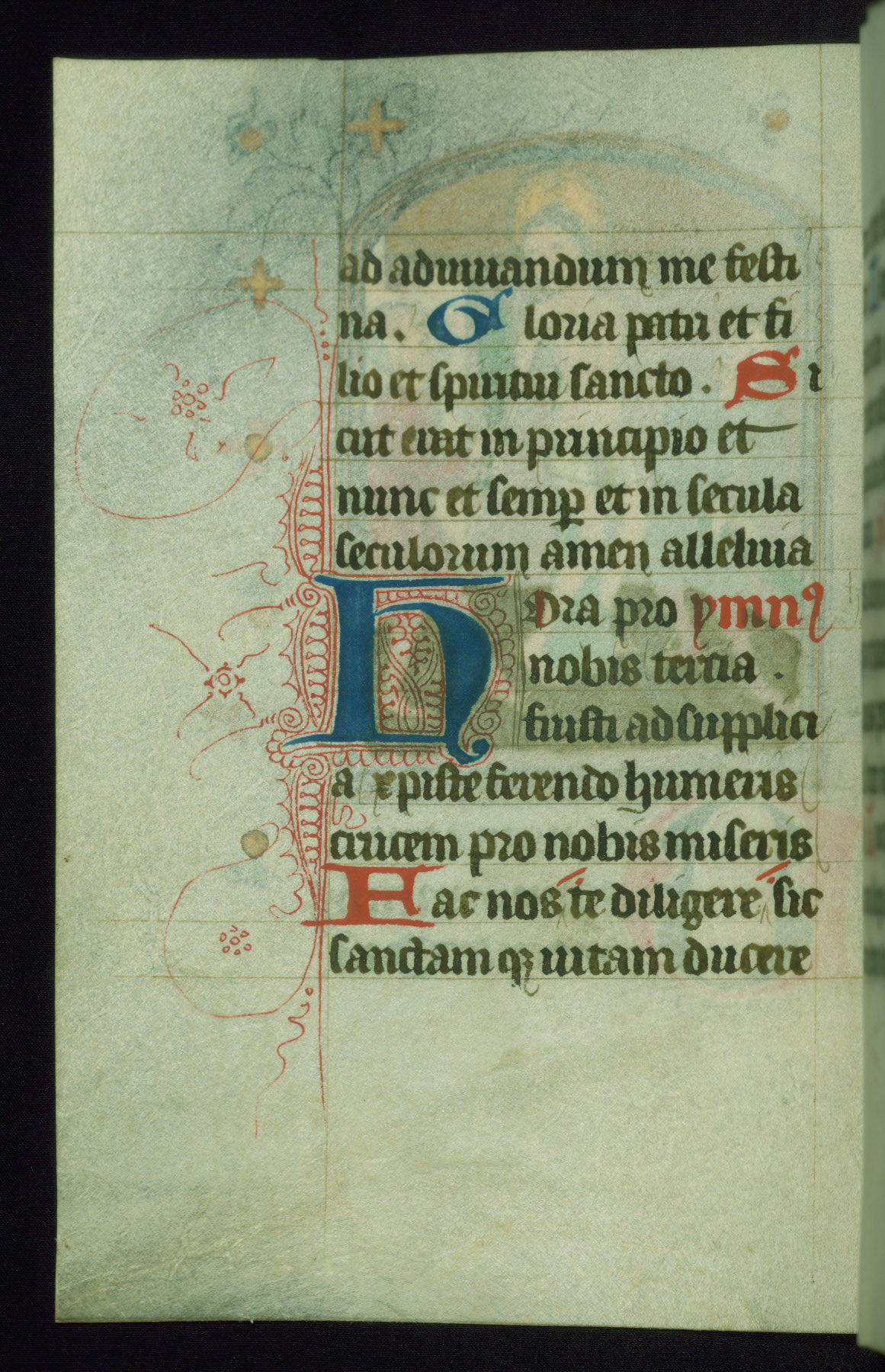 This prayer book was produced ca. 1430-40, likely in Brabant, but the contents of the calendar point to Tournai and Cambrai, and the Office of the Dead is for the use of Liège. North Netherlandish influence, possibly connected with works by the Masters of the Gold Scrolls, is suggested by the style and iconography of its images. The manuscript is notable for its large number of miniatures--forty-eight in total--as well as the sense of narrative within them, and the diversity of the suffrages they illustrate is striking. That the original owner had a strong interest in the Passion is evident in both the choice of texts and the images. The manuscript was well used, and accrued not only additional prayers and suffrages, but devotional objects as well: a pilgrim's badge was once attached to the corner of the image for the suffrage to relics on fol. 160r.