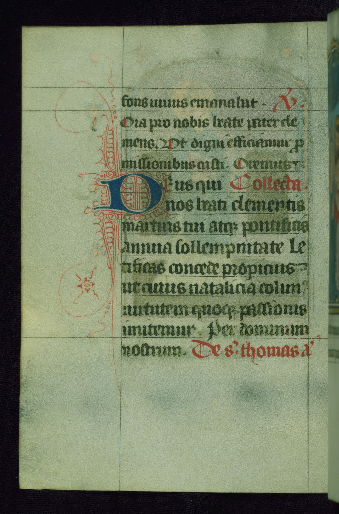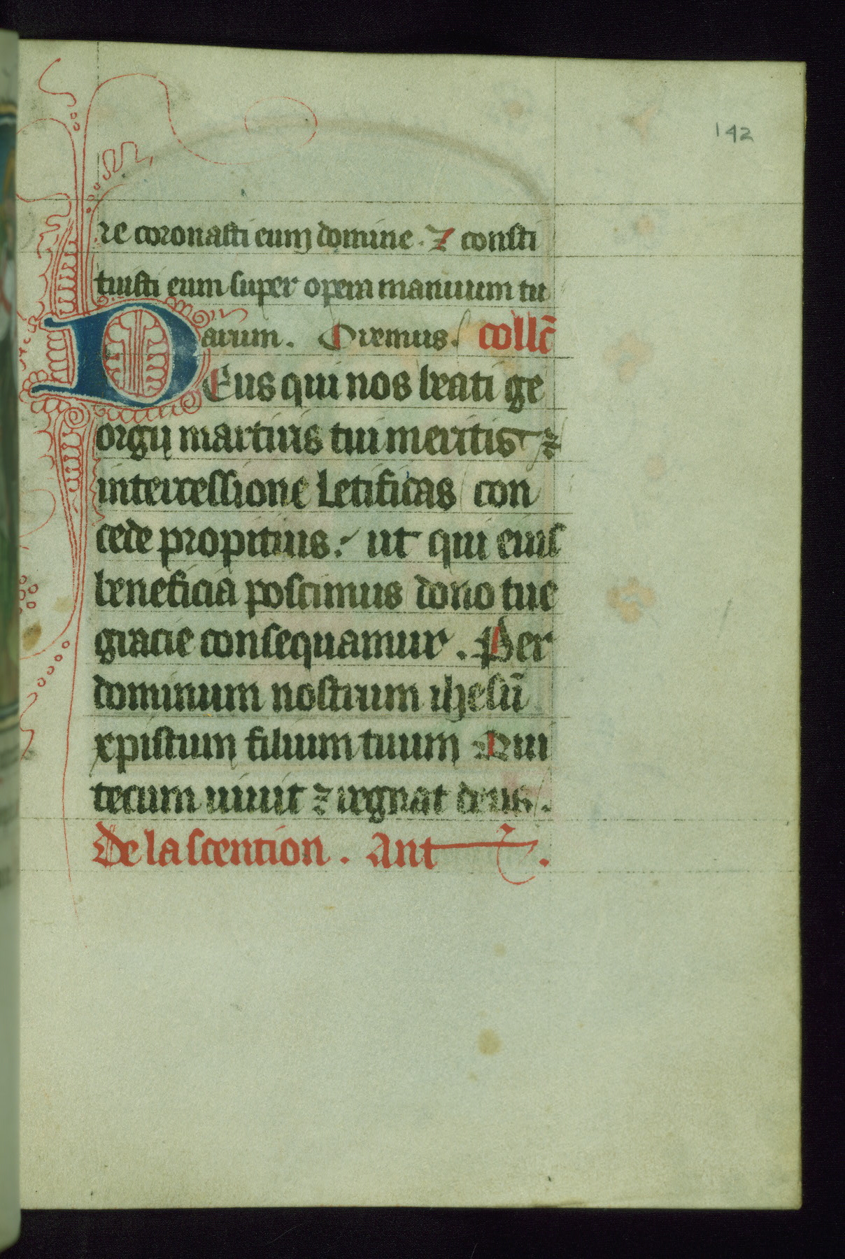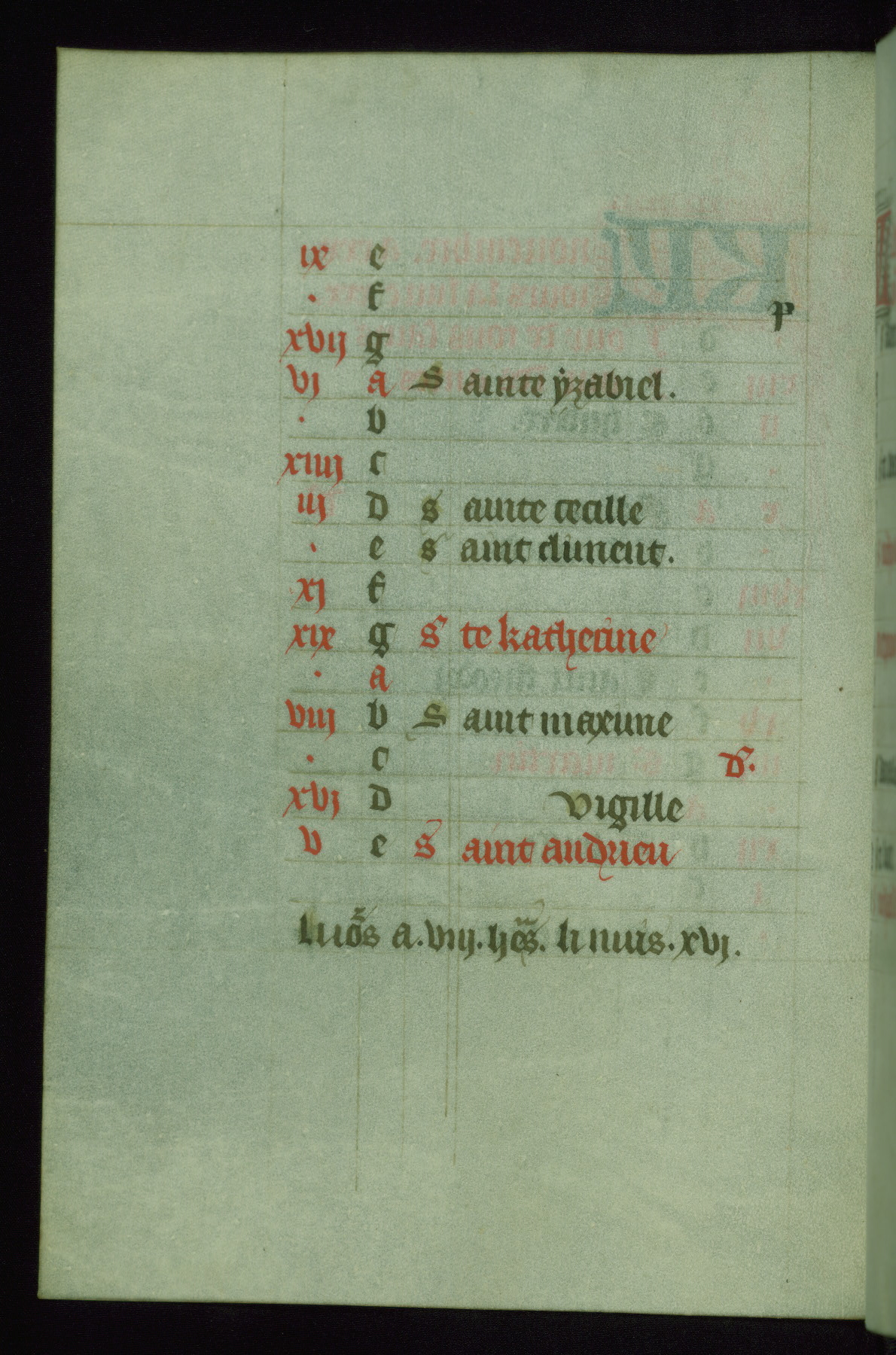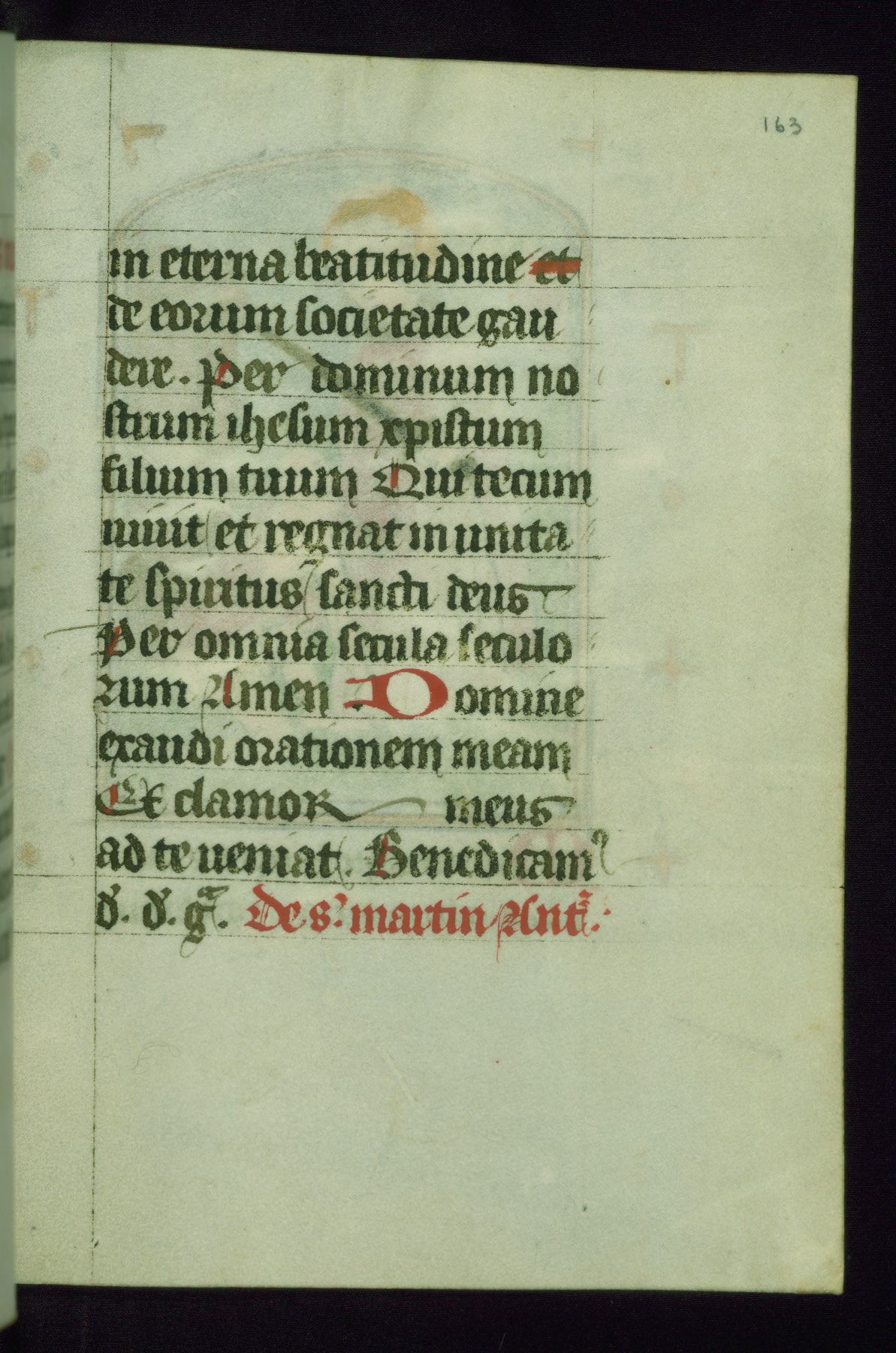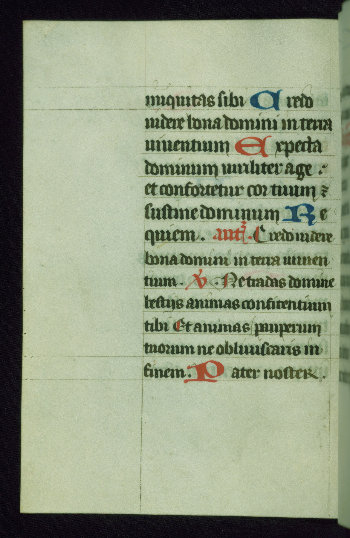 This prayer book was produced ca. 1430-40, likely in Brabant, but the contents of the calendar point to Tournai and Cambrai, and the Office of the Dead is for the use of Liège. North Netherlandish influence, possibly connected with works by the Masters of the Gold Scrolls, is suggested by the style and iconography of its images. The manuscript is notable for its large number of miniatures--forty-eight in total--as well as the sense of narrative within them, and the diversity of the suffrages they illustrate is striking. That the original owner had a strong interest in the Passion is evident in both the choice of texts and the images. The manuscript was well used, and accrued not only additional prayers and suffrages, but devotional objects as well: a pilgrim's badge was once attached to the corner of the image for the suffrage to relics on fol. 160r.