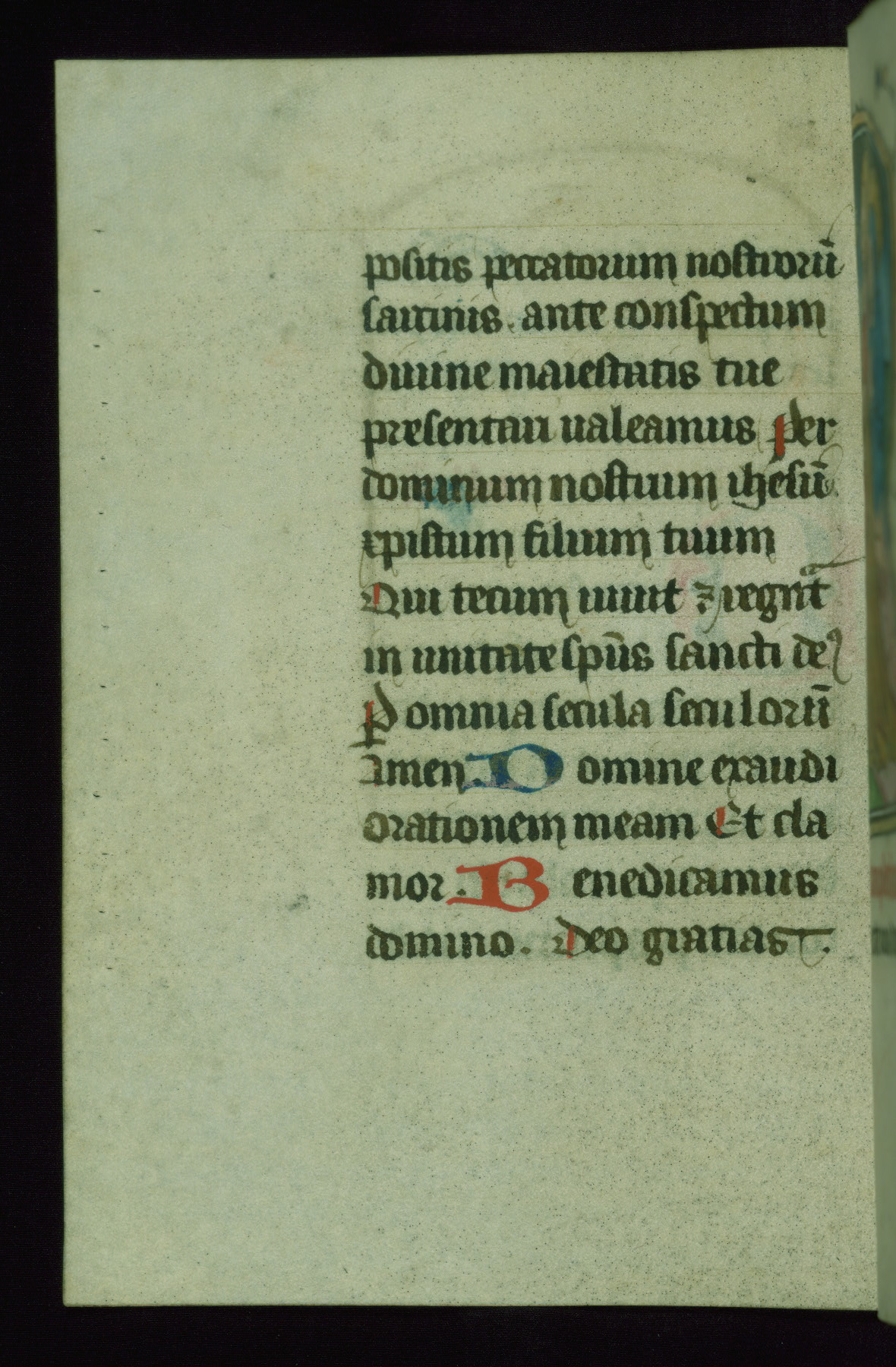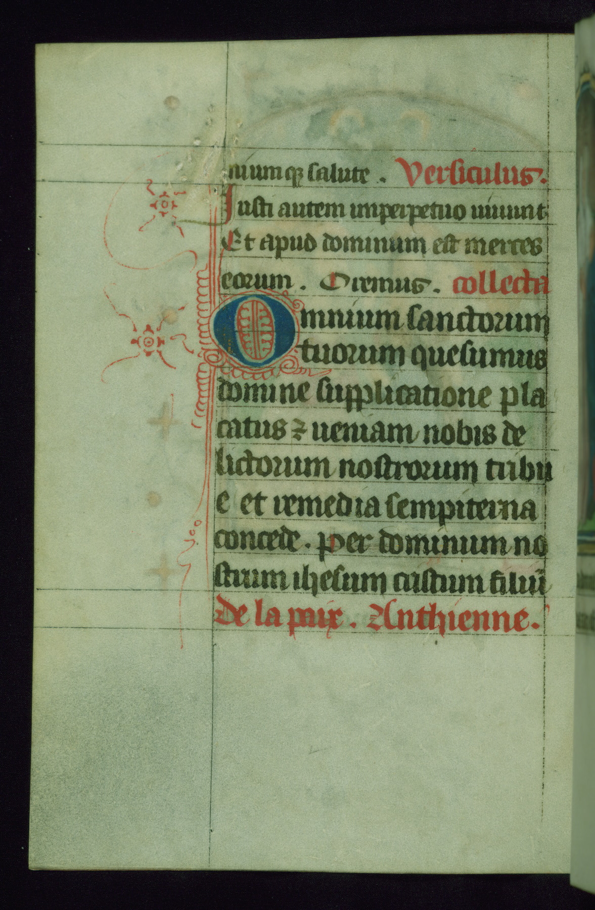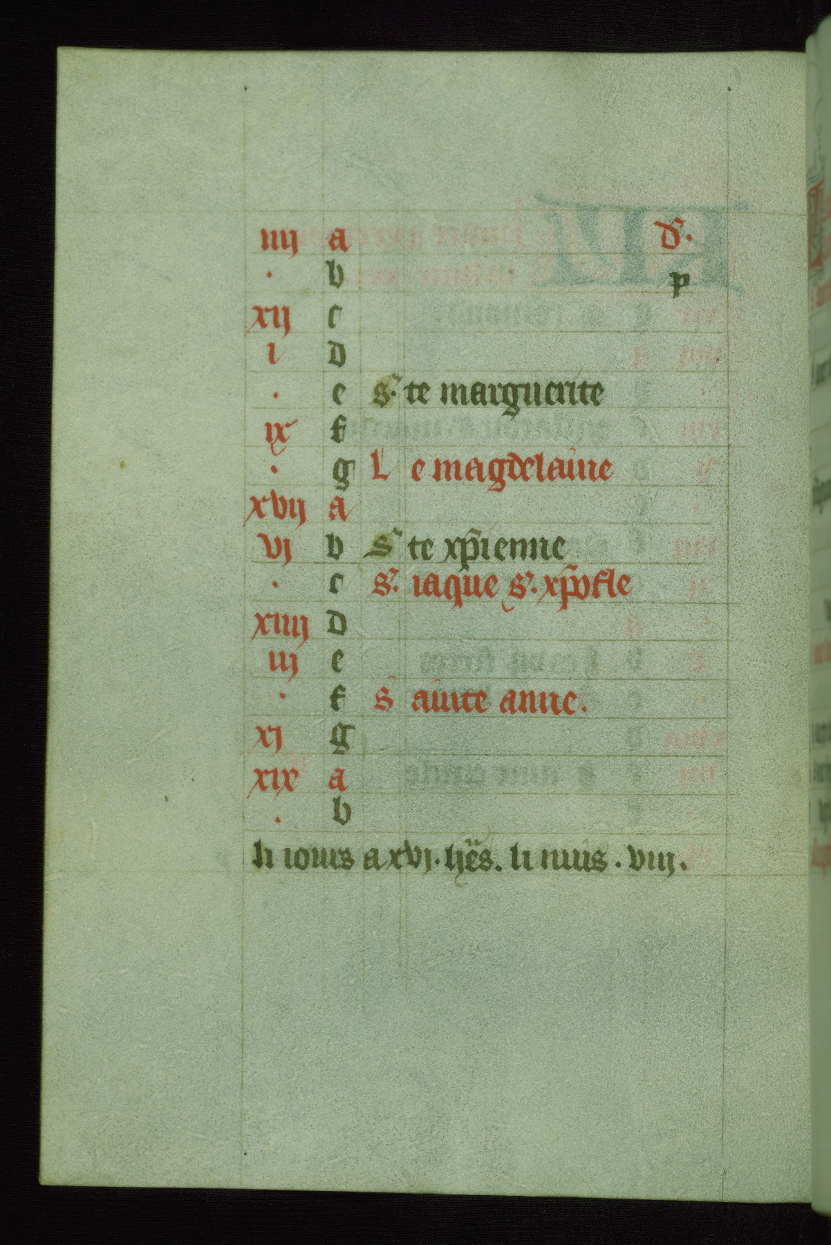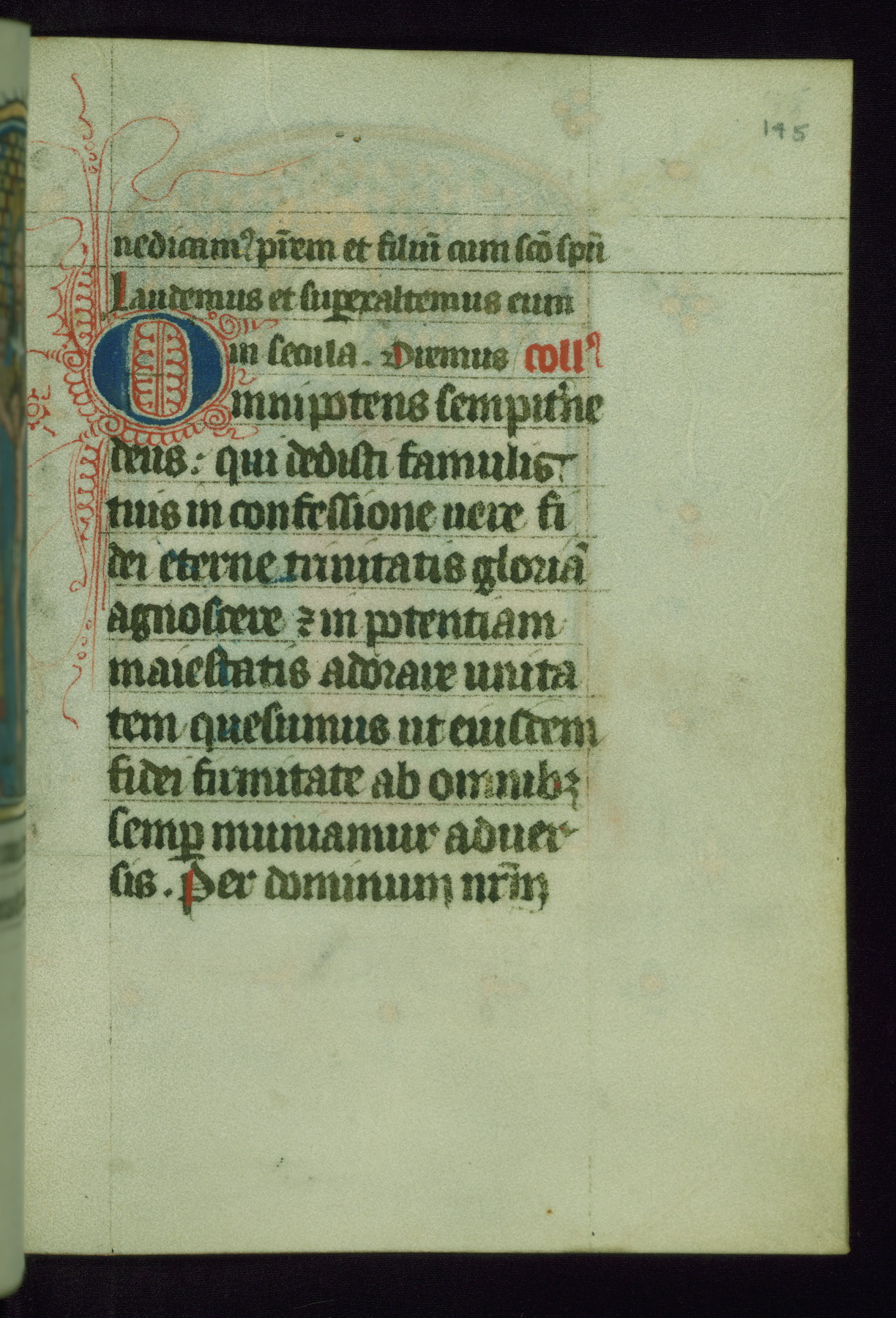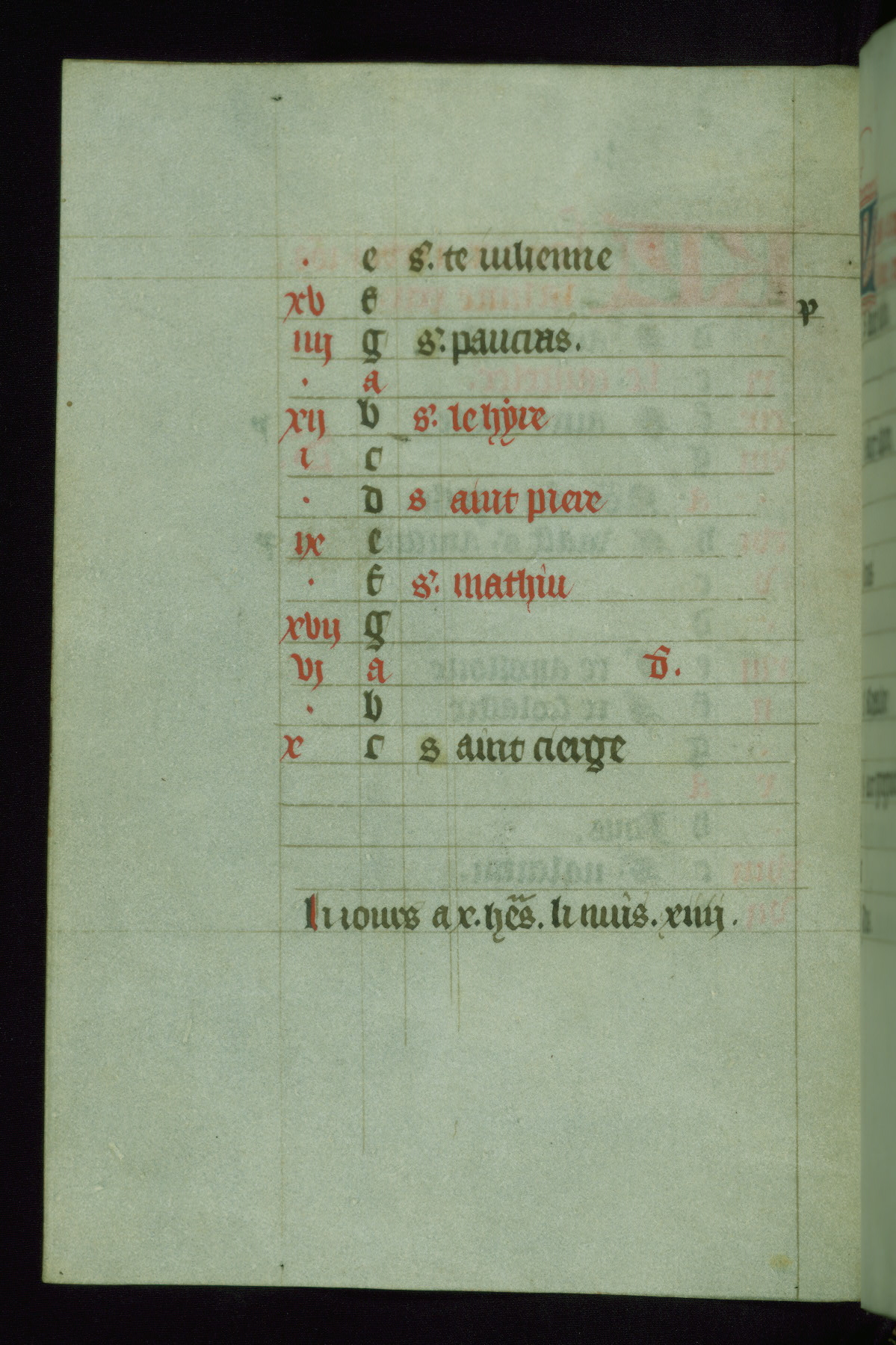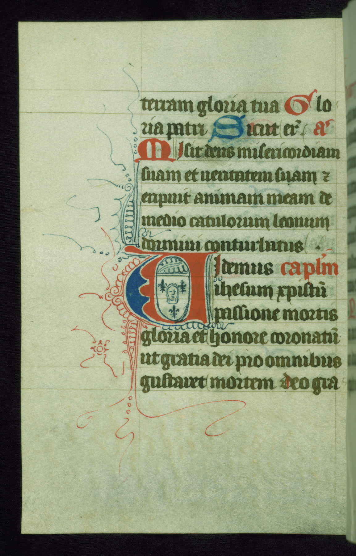 This prayer book was produced ca. 1430-40, likely in Brabant, but the contents of the calendar point to Tournai and Cambrai, and the Office of the Dead is for the use of Liège. North Netherlandish influence, possibly connected with works by the Masters of the Gold Scrolls, is suggested by the style and iconography of its images. The manuscript is notable for its large number of miniatures--forty-eight in total--as well as the sense of narrative within them, and the diversity of the suffrages they illustrate is striking. That the original owner had a strong interest in the Passion is evident in both the choice of texts and the images. The manuscript was well used, and accrued not only additional prayers and suffrages, but devotional objects as well: a pilgrim's badge was once attached to the corner of the image for the suffrage to relics on fol. 160r.