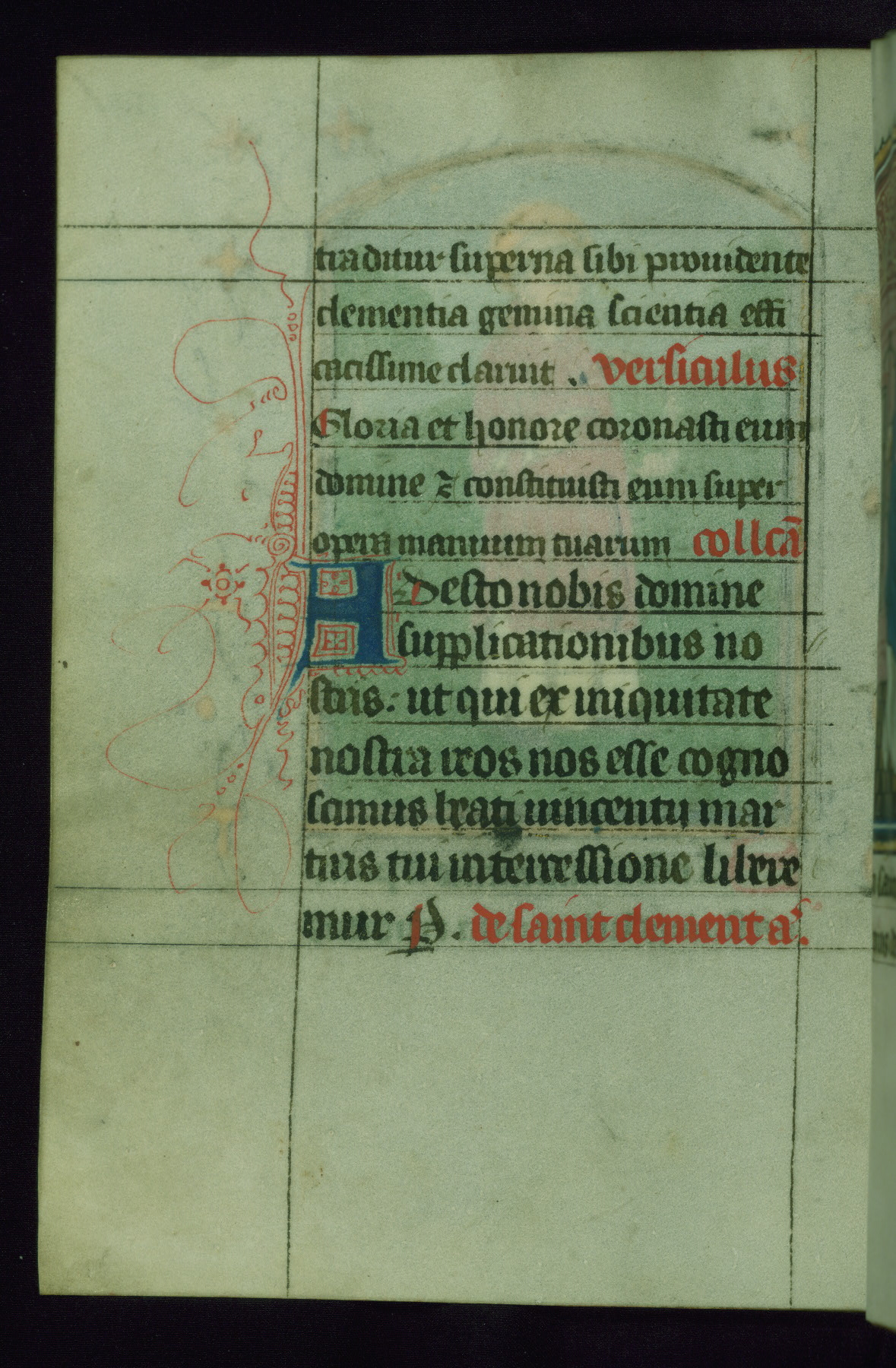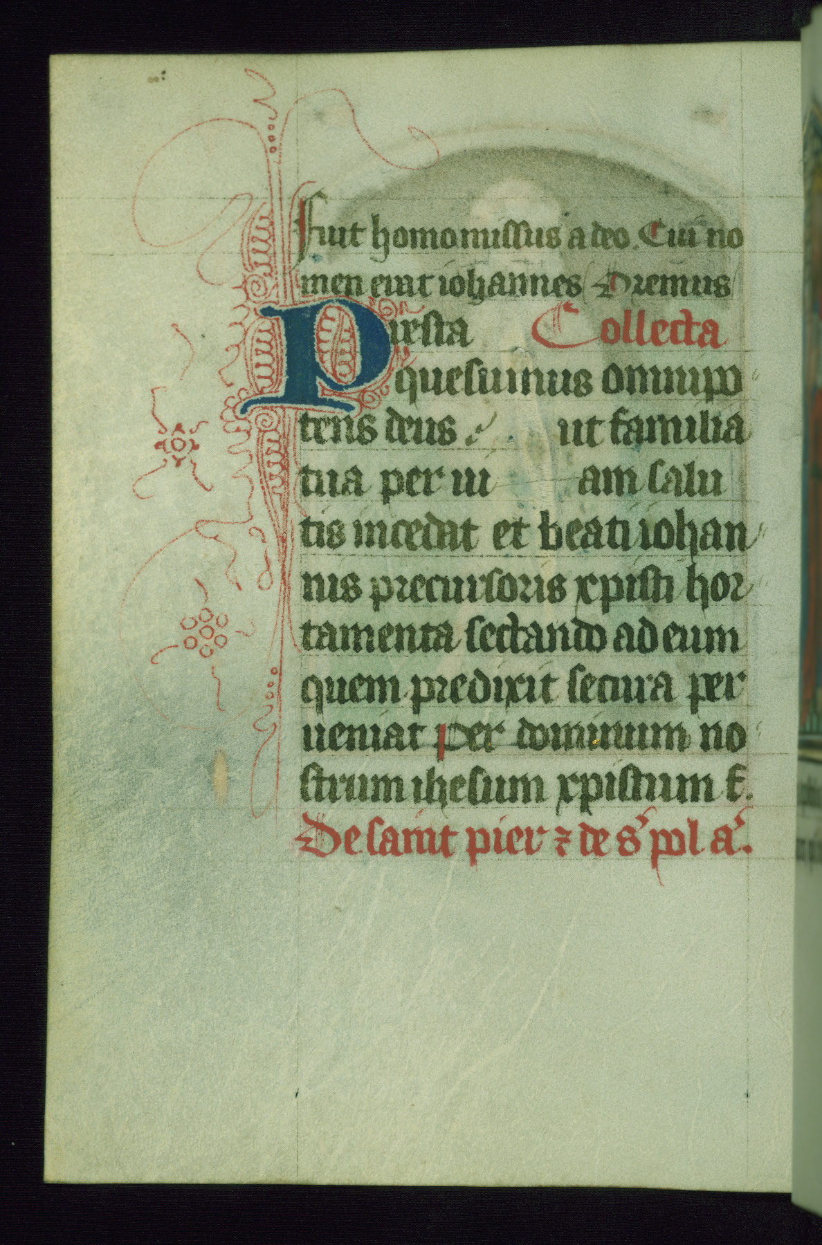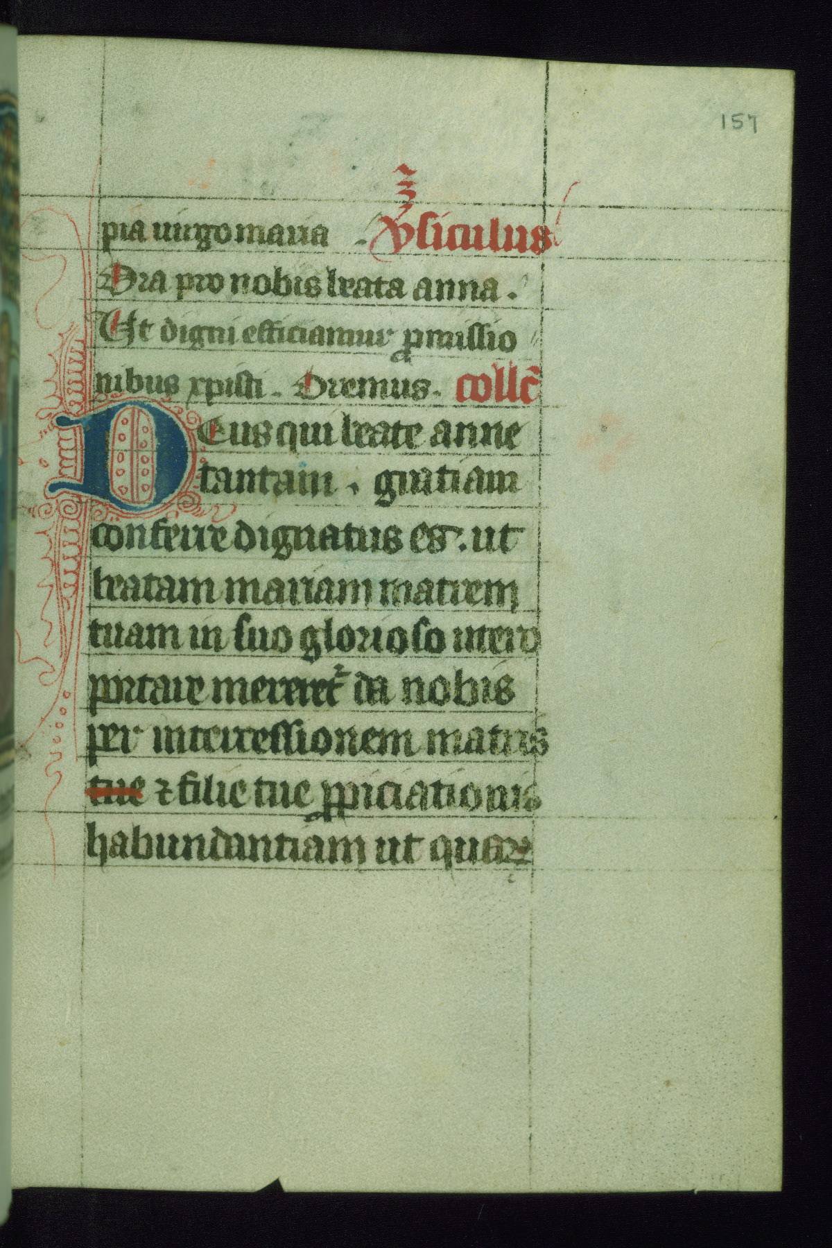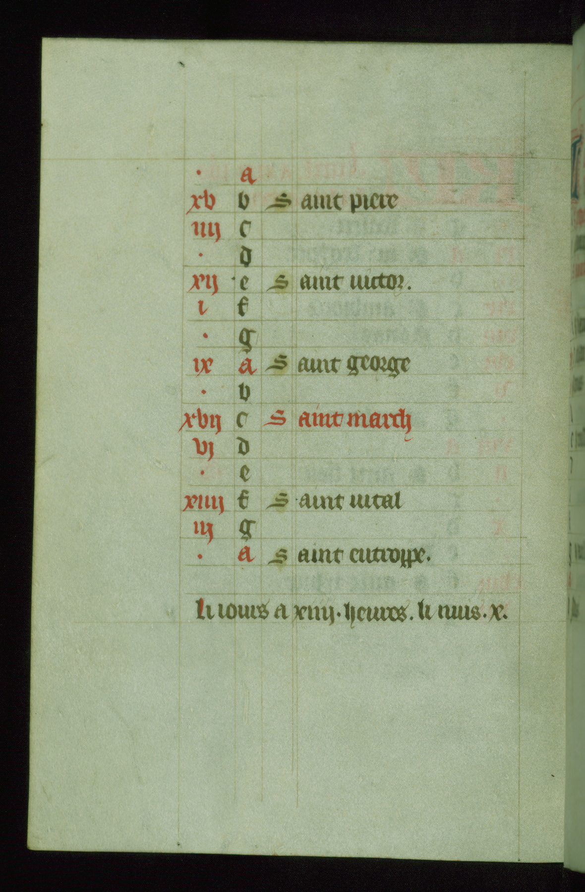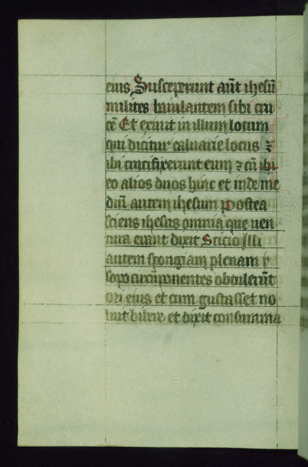 This prayer book was produced ca. 1430-40, likely in Brabant, but the contents of the calendar point to Tournai and Cambrai, and the Office of the Dead is for the use of Liège. North Netherlandish influence, possibly connected with works by the Masters of the Gold Scrolls, is suggested by the style and iconography of its images. The manuscript is notable for its large number of miniatures--forty-eight in total--as well as the sense of narrative within them, and the diversity of the suffrages they illustrate is striking. That the original owner had a strong interest in the Passion is evident in both the choice of texts and the images. The manuscript was well used, and accrued not only additional prayers and suffrages, but devotional objects as well: a pilgrim's badge was once attached to the corner of the image for the suffrage to relics on fol. 160r.