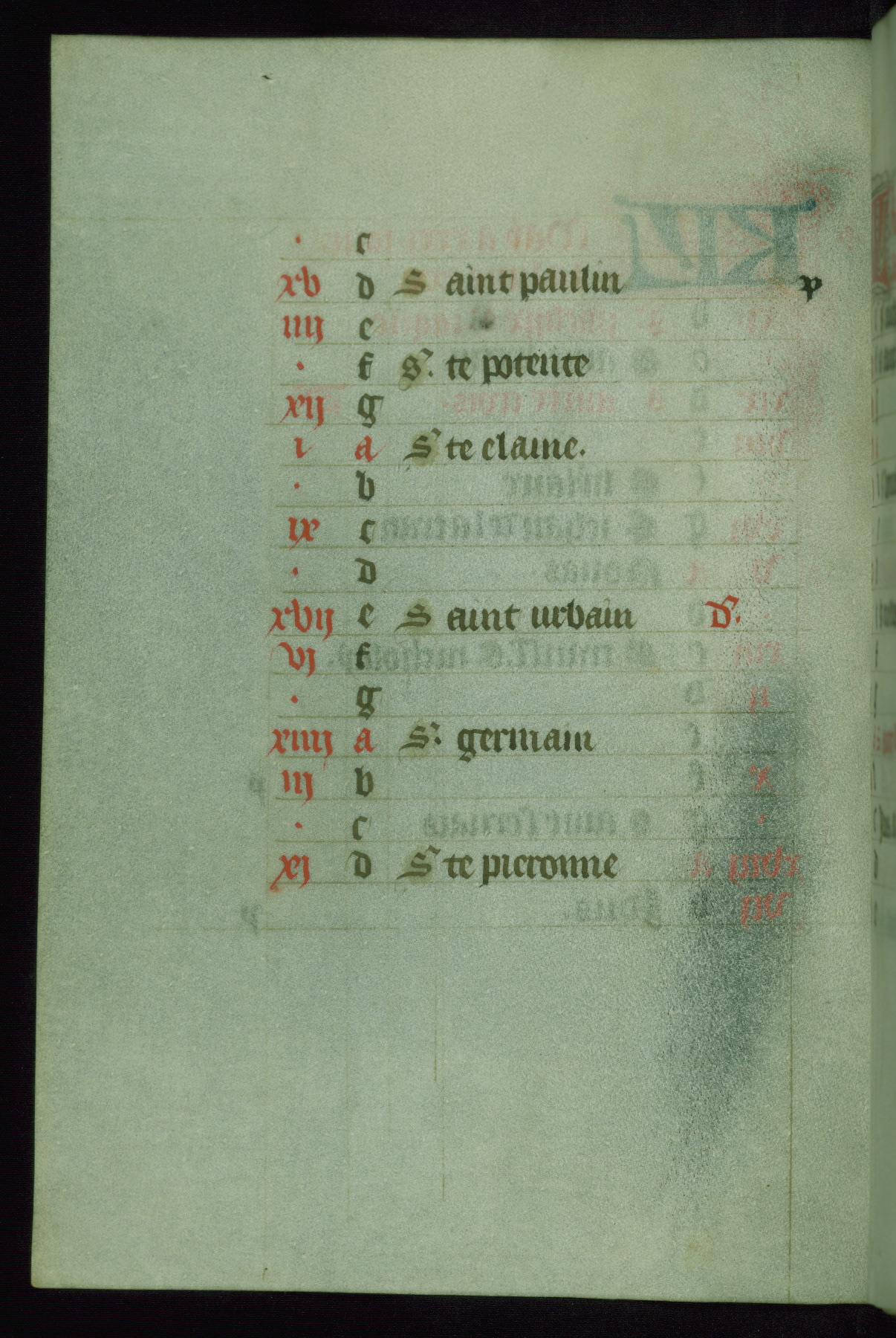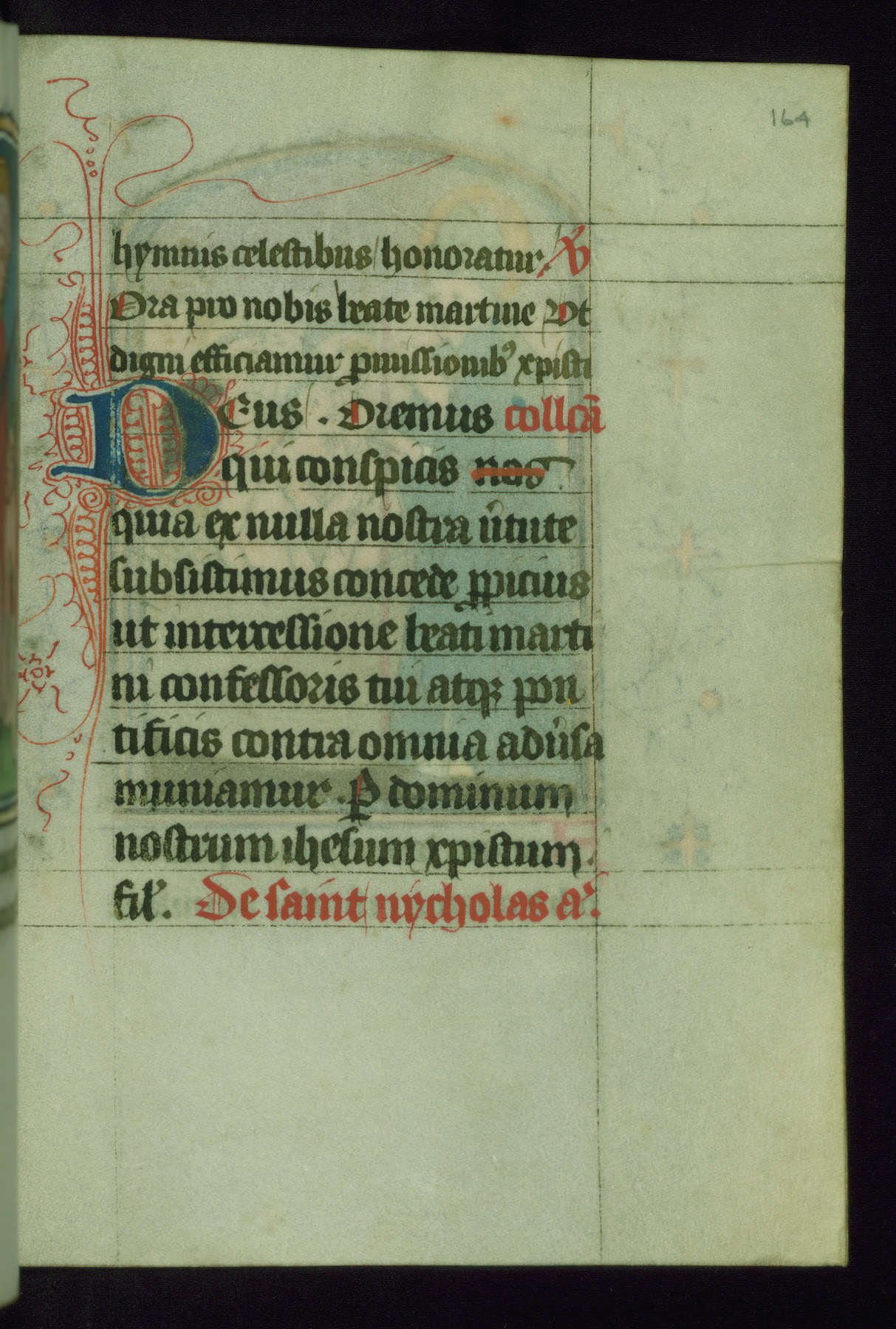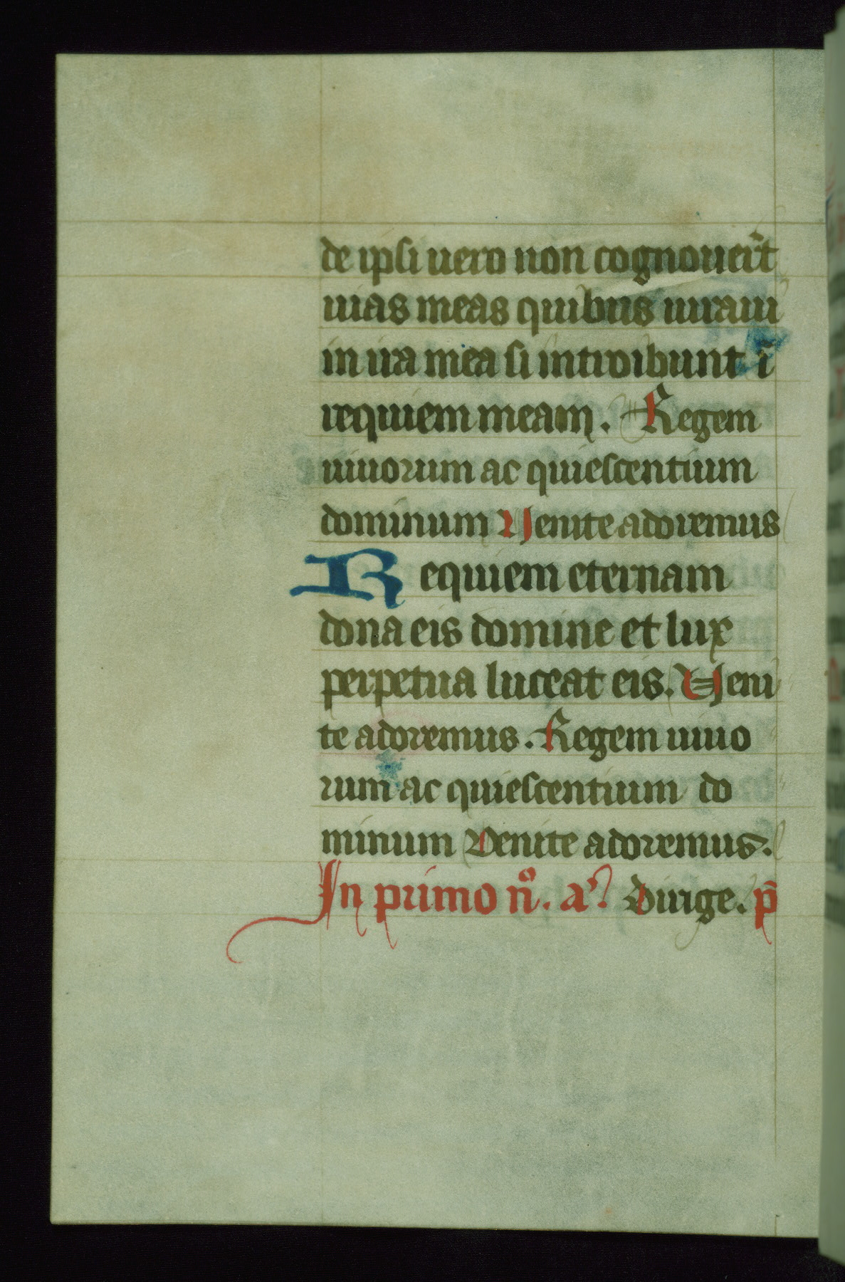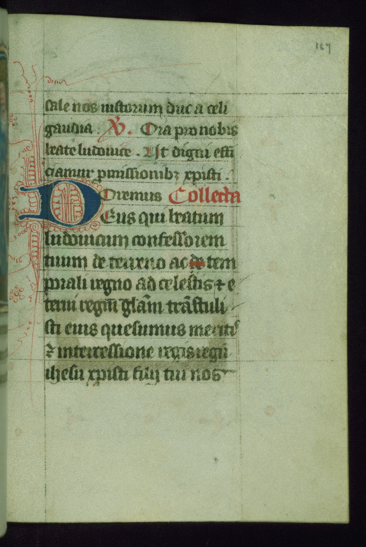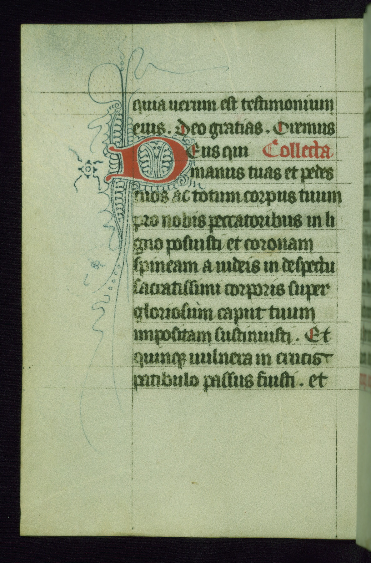 This prayer book was produced ca. 1430-40, likely in Brabant, but the contents of the calendar point to Tournai and Cambrai, and the Office of the Dead is for the use of Liège. North Netherlandish influence, possibly connected with works by the Masters of the Gold Scrolls, is suggested by the style and iconography of its images. The manuscript is notable for its large number of miniatures--forty-eight in total--as well as the sense of narrative within them, and the diversity of the suffrages they illustrate is striking. That the original owner had a strong interest in the Passion is evident in both the choice of texts and the images. The manuscript was well used, and accrued not only additional prayers and suffrages, but devotional objects as well: a pilgrim's badge was once attached to the corner of the image for the suffrage to relics on fol. 160r.